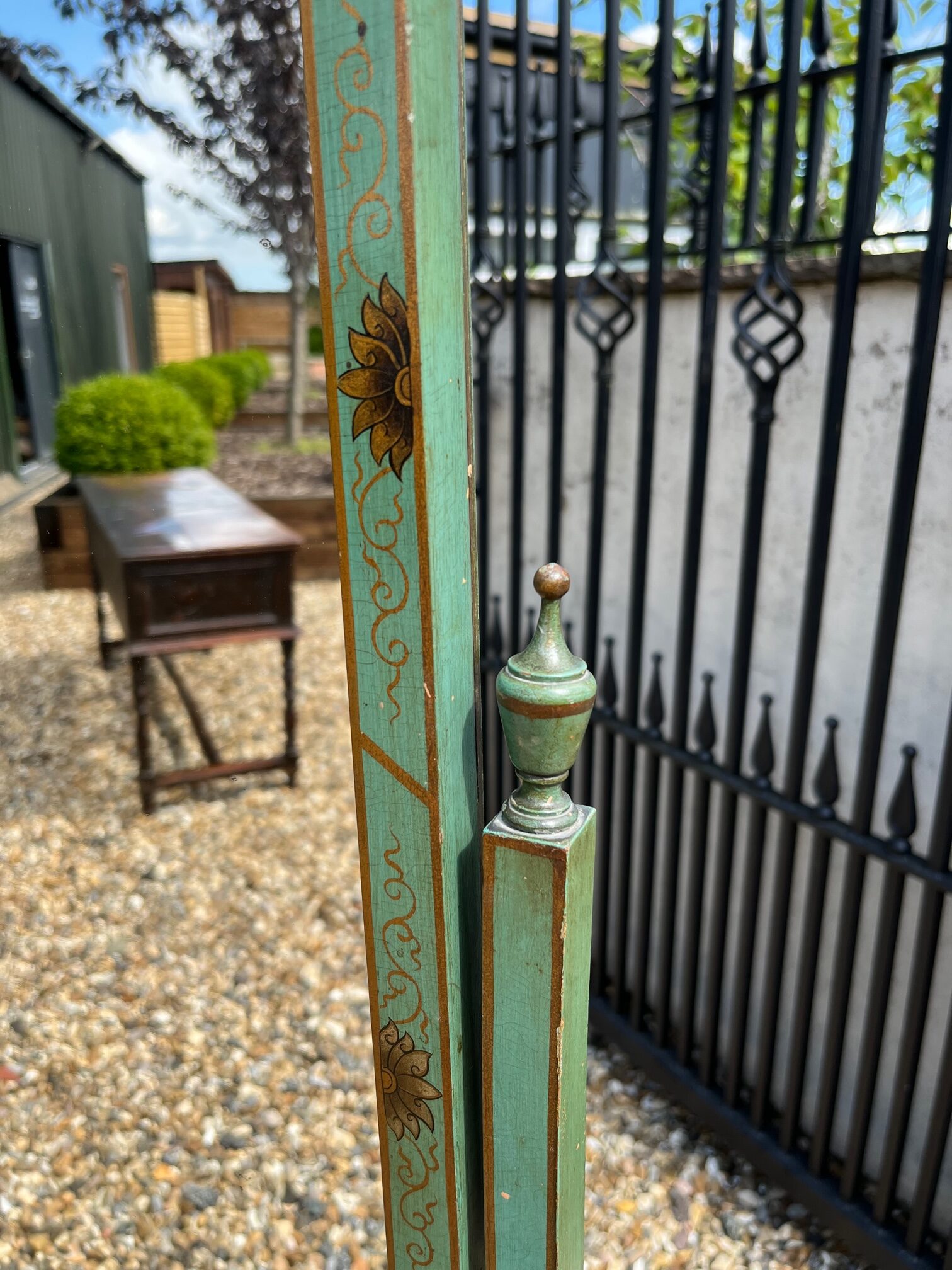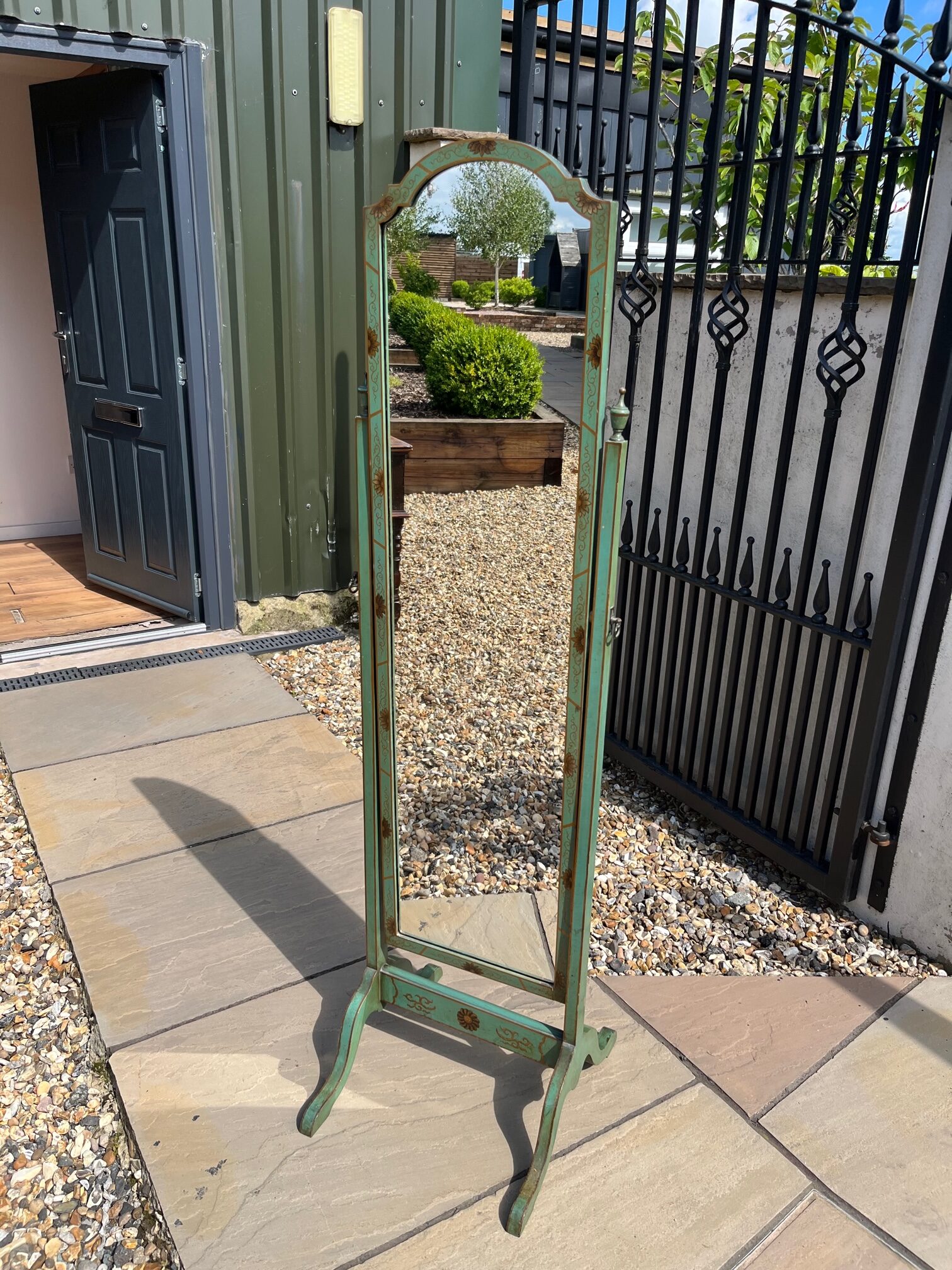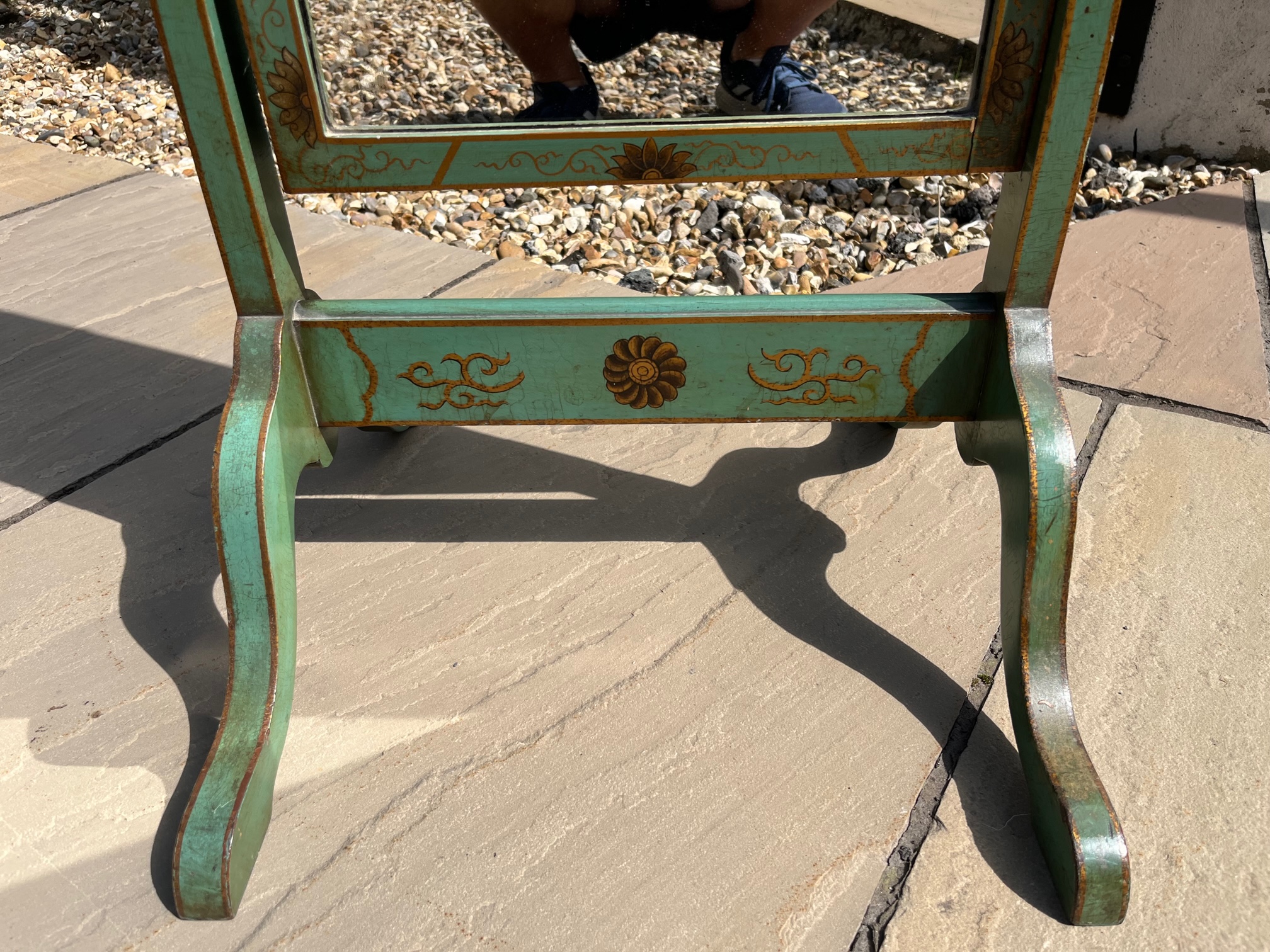 CompareA 1920s Period Chinoiserie dressing mirror. The frame decorated throughout in green and gilt chinoiserie detail, in lovely original condition. English circa 1920