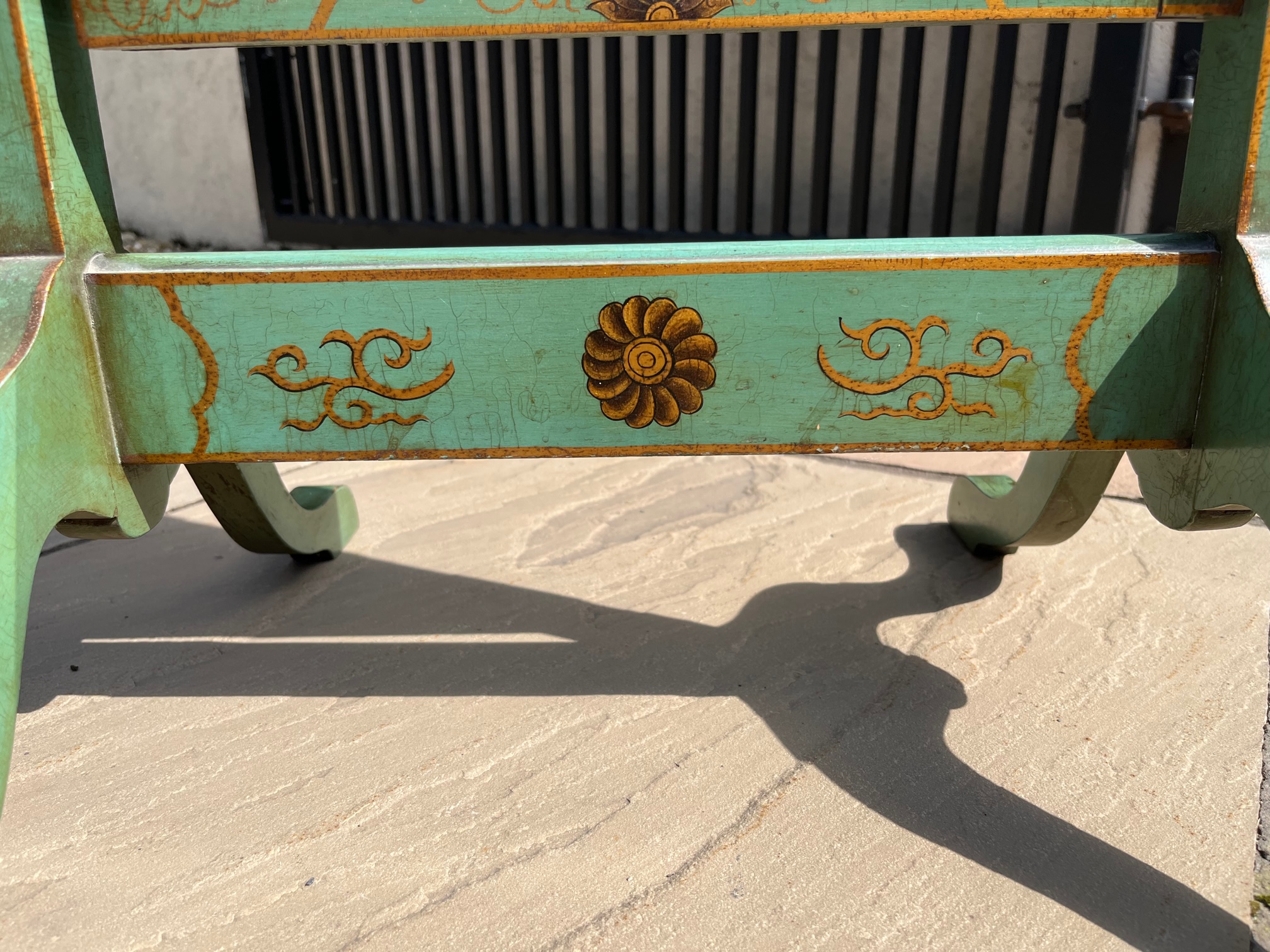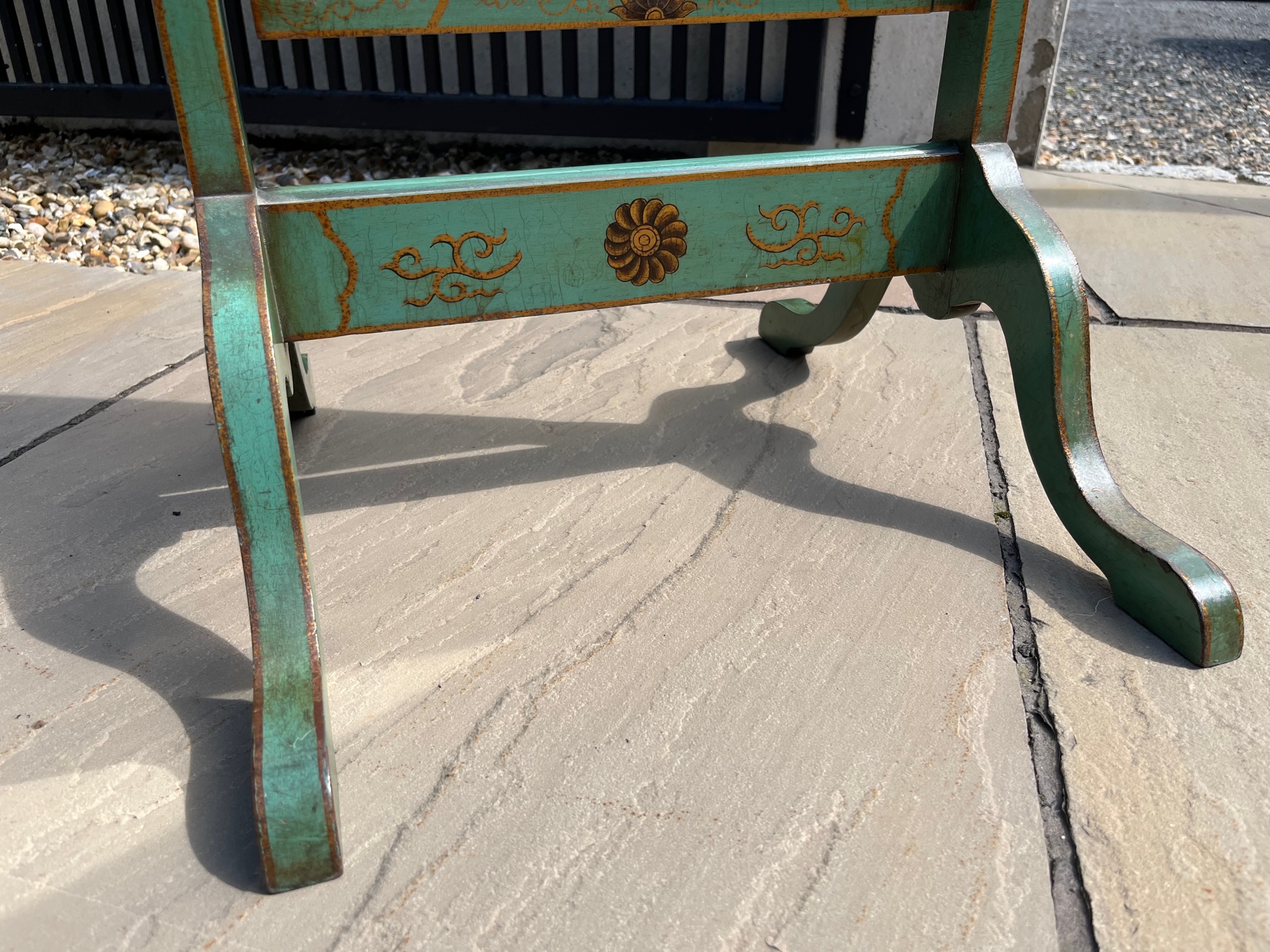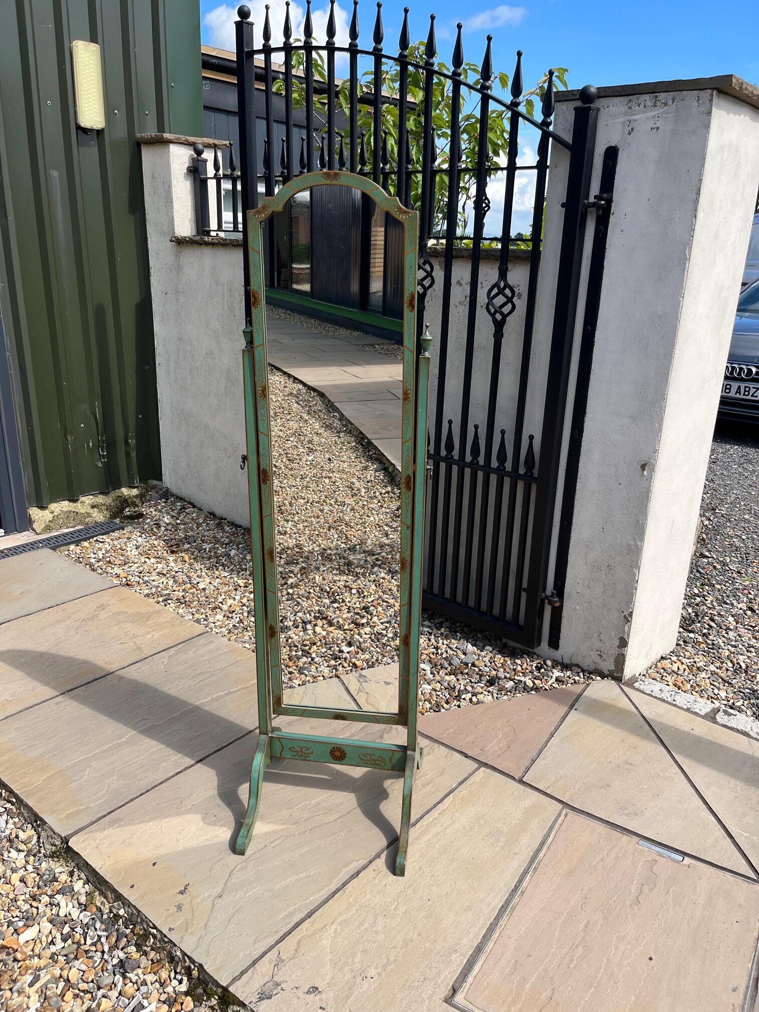 CompareA 1920s Period Chinoiserie dressing mirror. The frame decorated throughout in green and gilt chinoiserie detail, in lovely original condition. English circa 1920