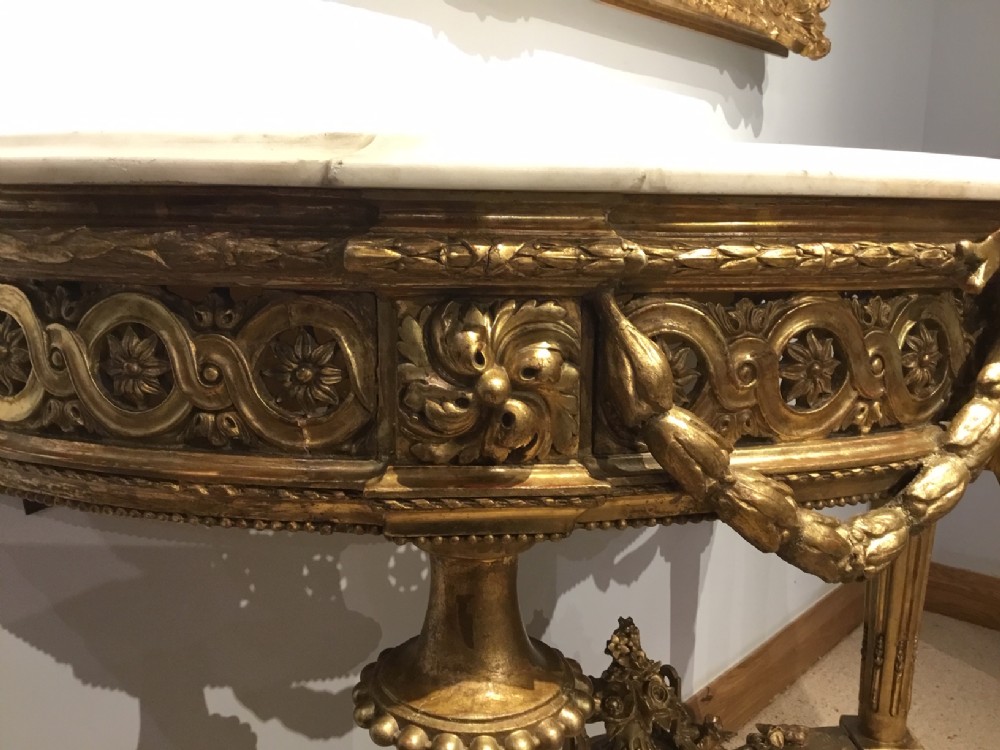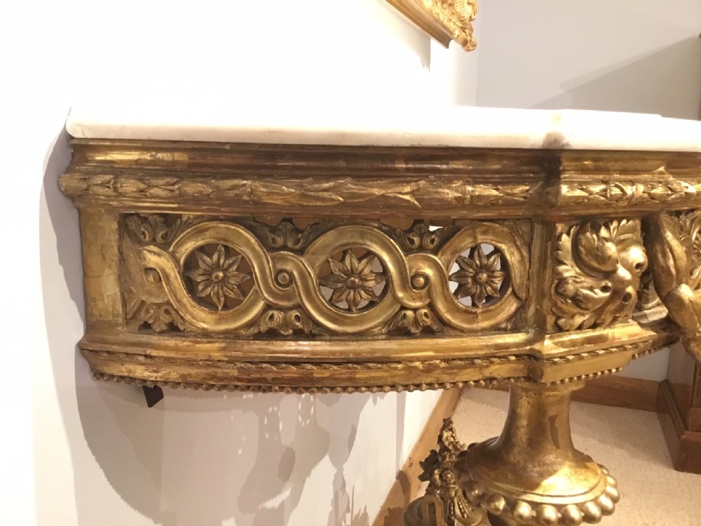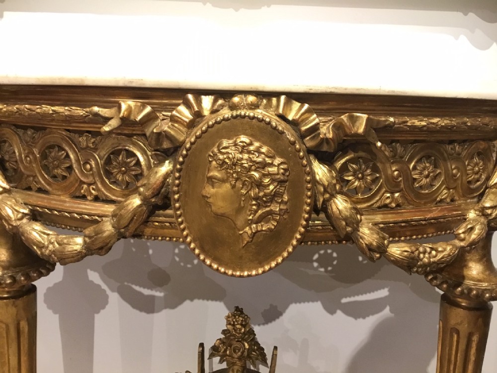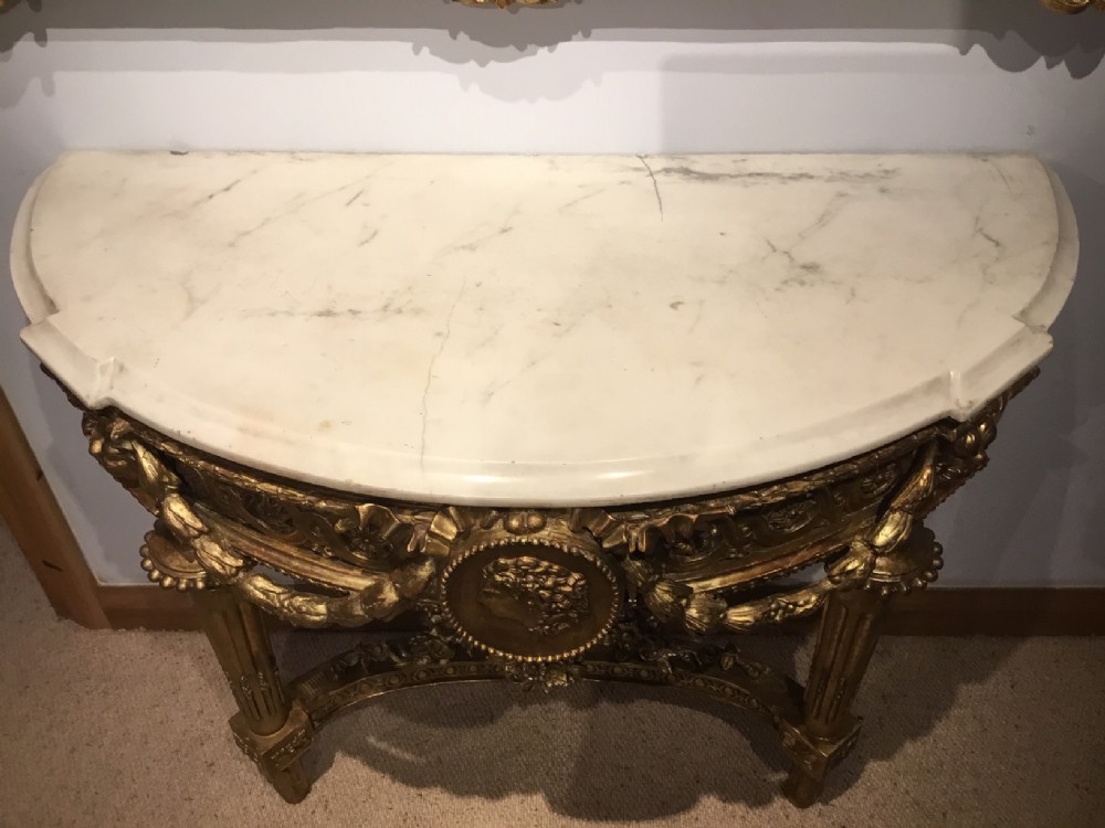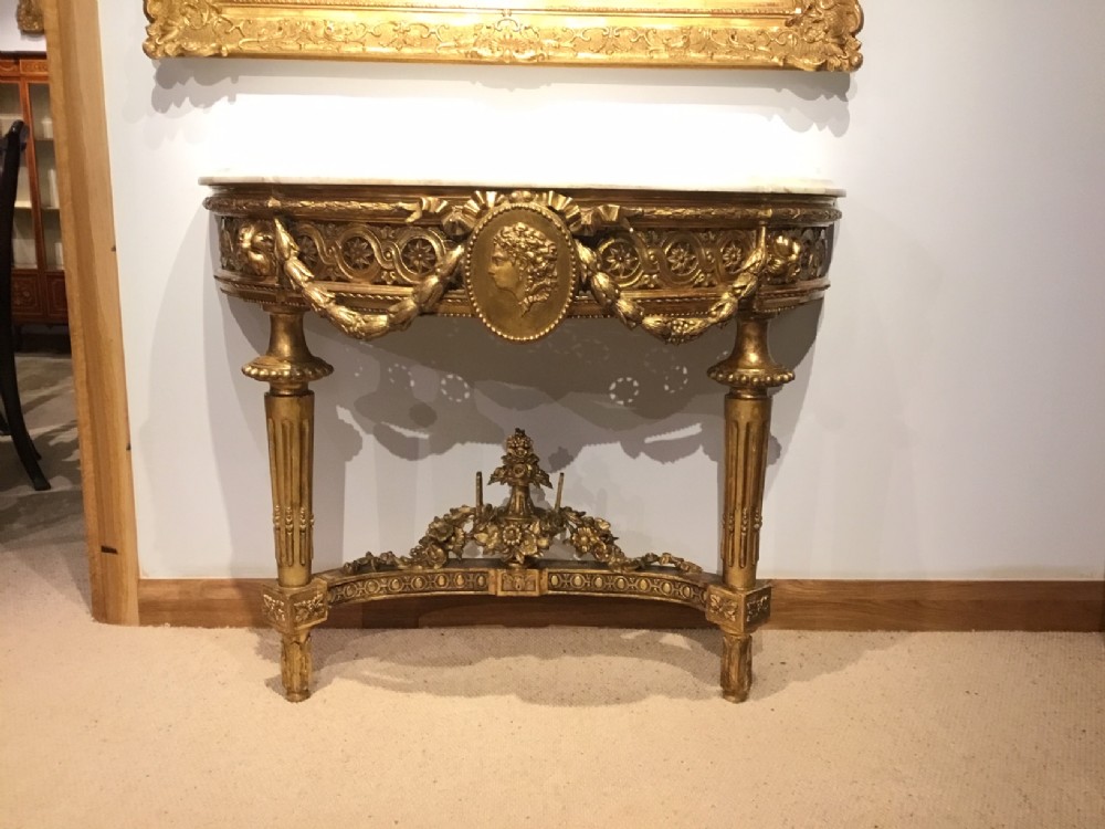 CompareA beautiful 19th Century French Carved Gilt Wood console table. The demi lune white and grey veined marble top above a pierced guilloche frieze with ribbon, harebell swags and a central medallion. Supported on turned and fluted front supports, a shaped under-tier with a central urn and floral garland. French circa 1880-1900, in stunning condition, one old repair to the marble