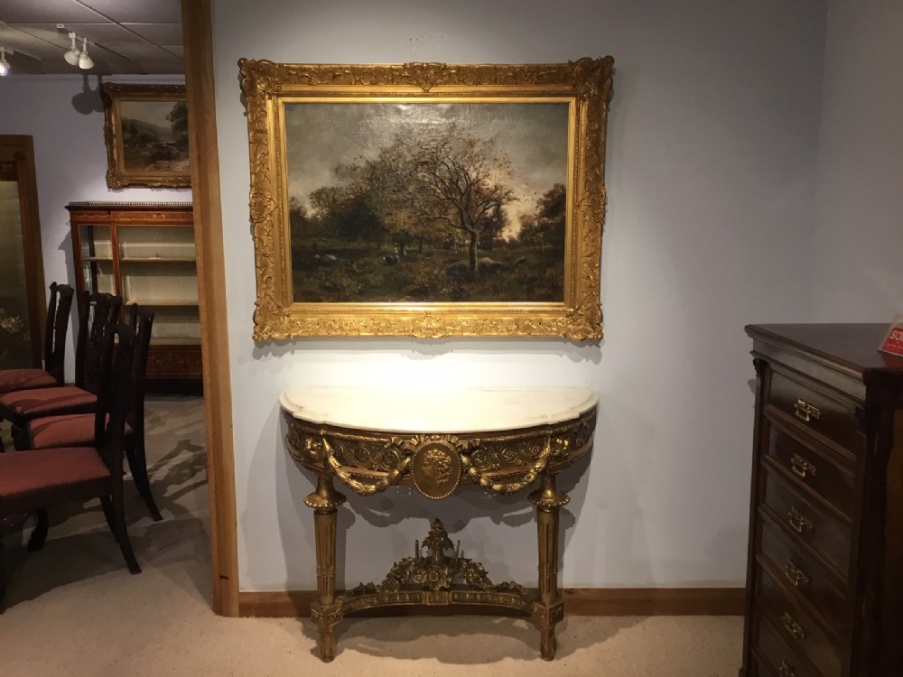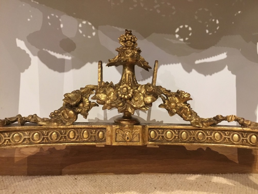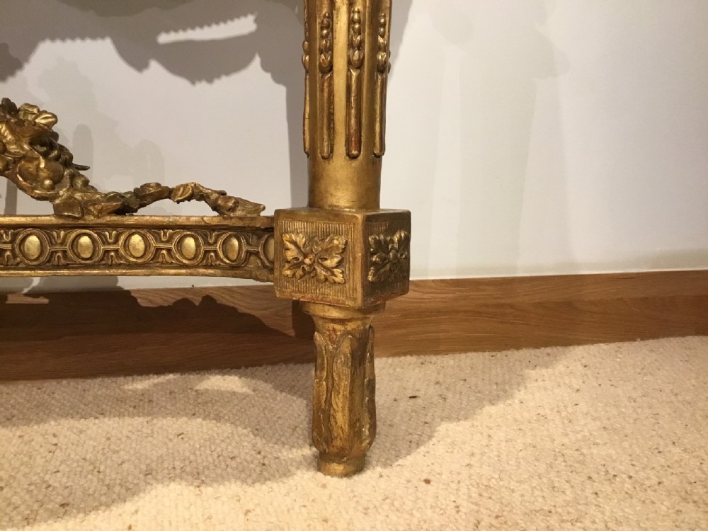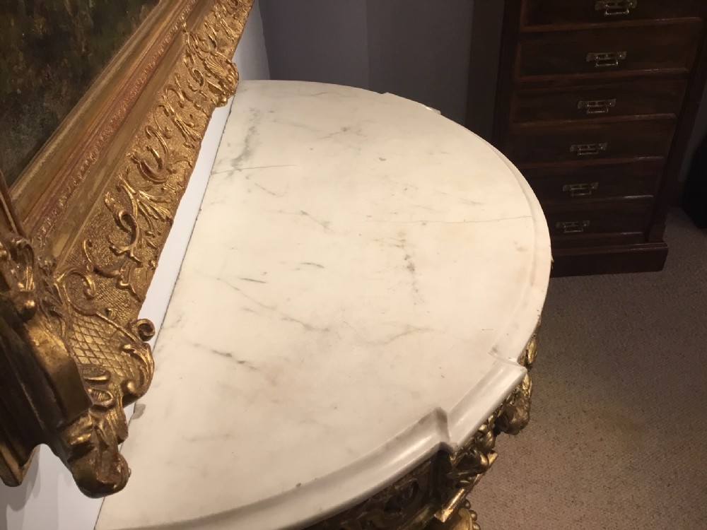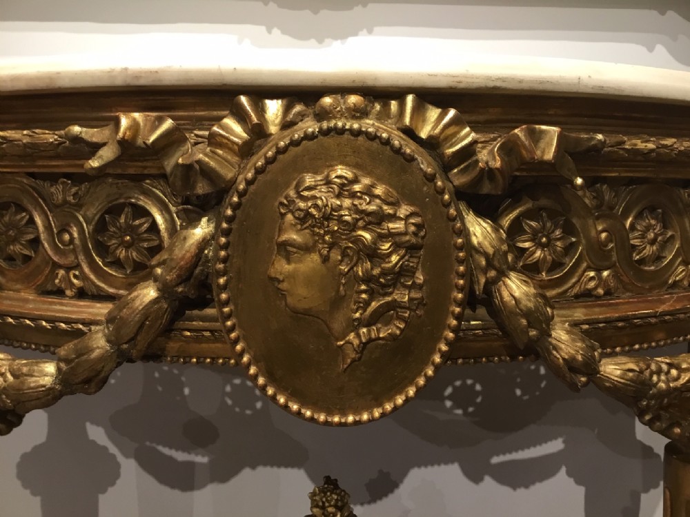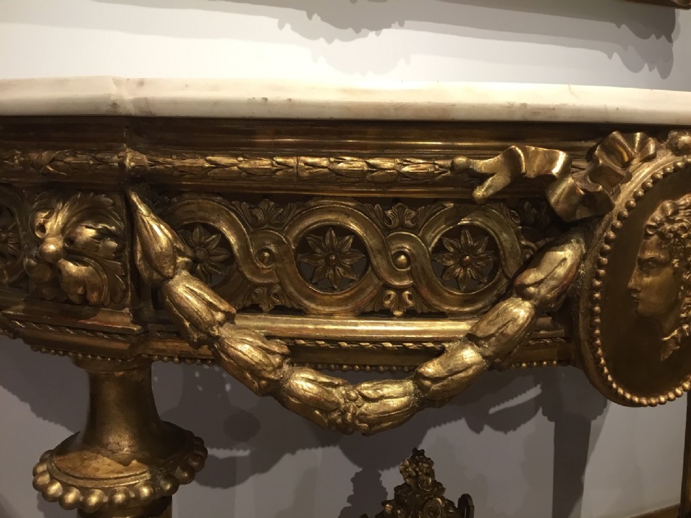 CompareA beautiful 19th Century French Carved Gilt Wood console table. The demi lune white and grey veined marble top above a pierced guilloche frieze with ribbon, harebell swags and a central medallion. Supported on turned and fluted front supports, a shaped under-tier with a central urn and floral garland. French circa 1880-1900, in stunning condition, one old repair to the marble