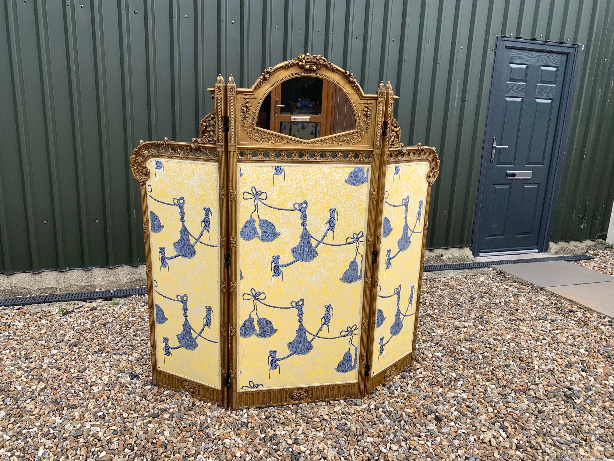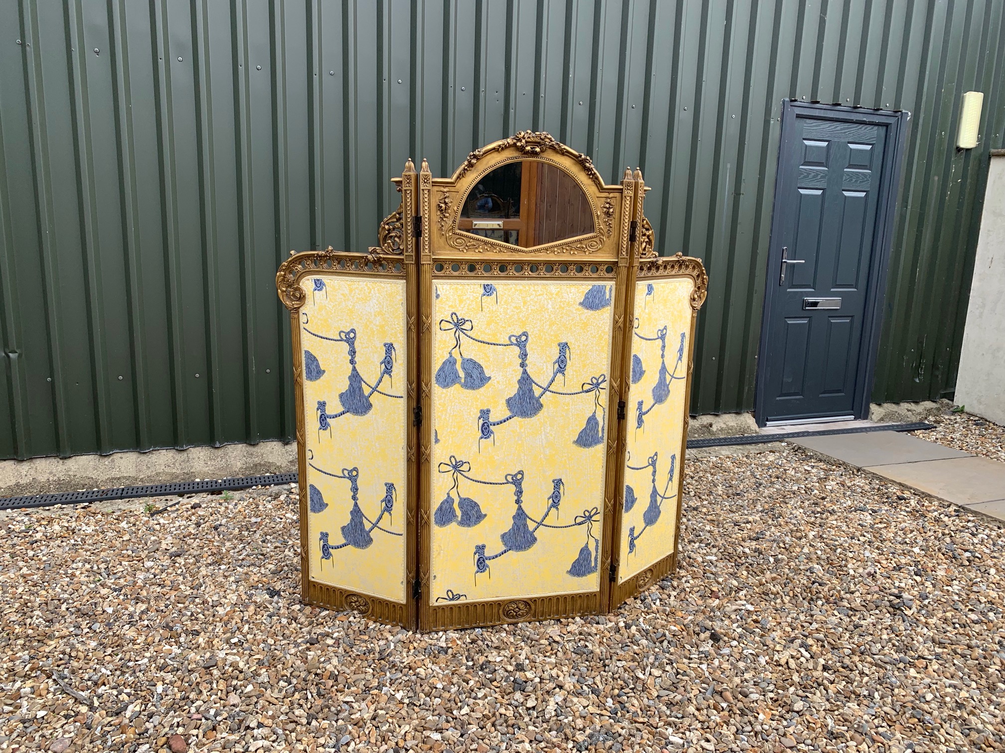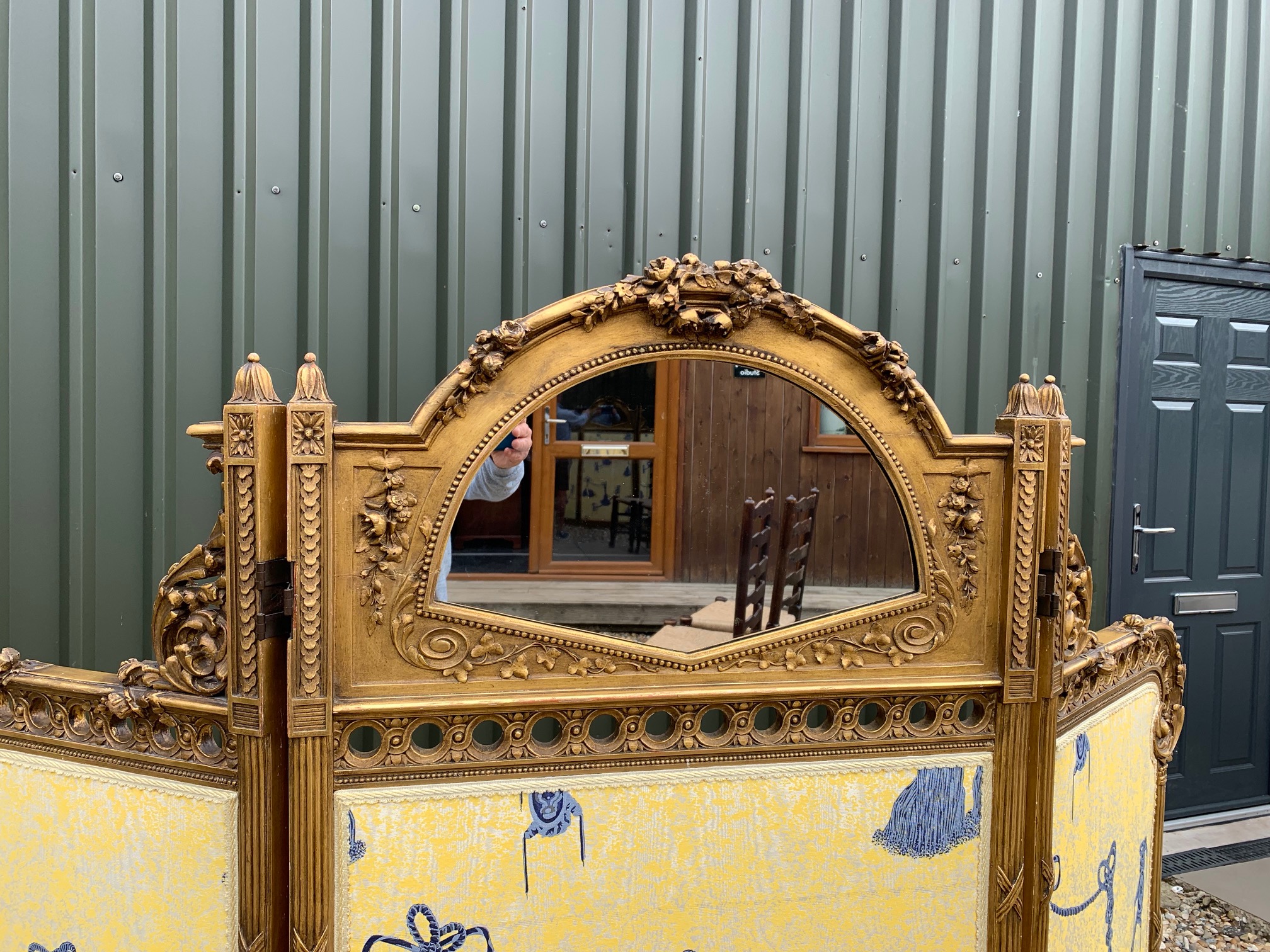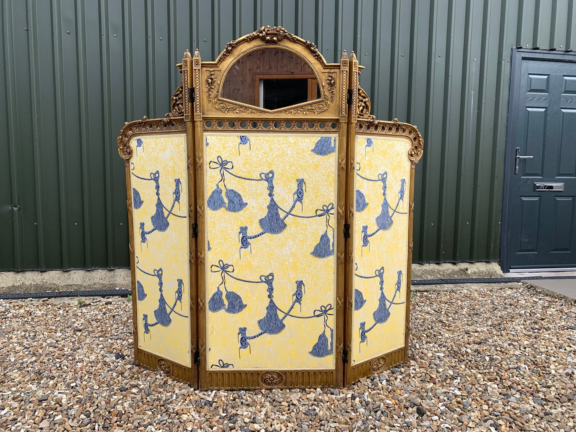 A beautiful French carved gilt wood three fold screen. The central section having a shaped mirror with a foliate carved cartouche and a pierced frieze. The hinged end sections with further finely carved gilt wood foliate detail, upholstered in a French inspired silk fabric. The reverse also upholstered in the same fabric, French circa 1900. There is one small tear as shown in the images.