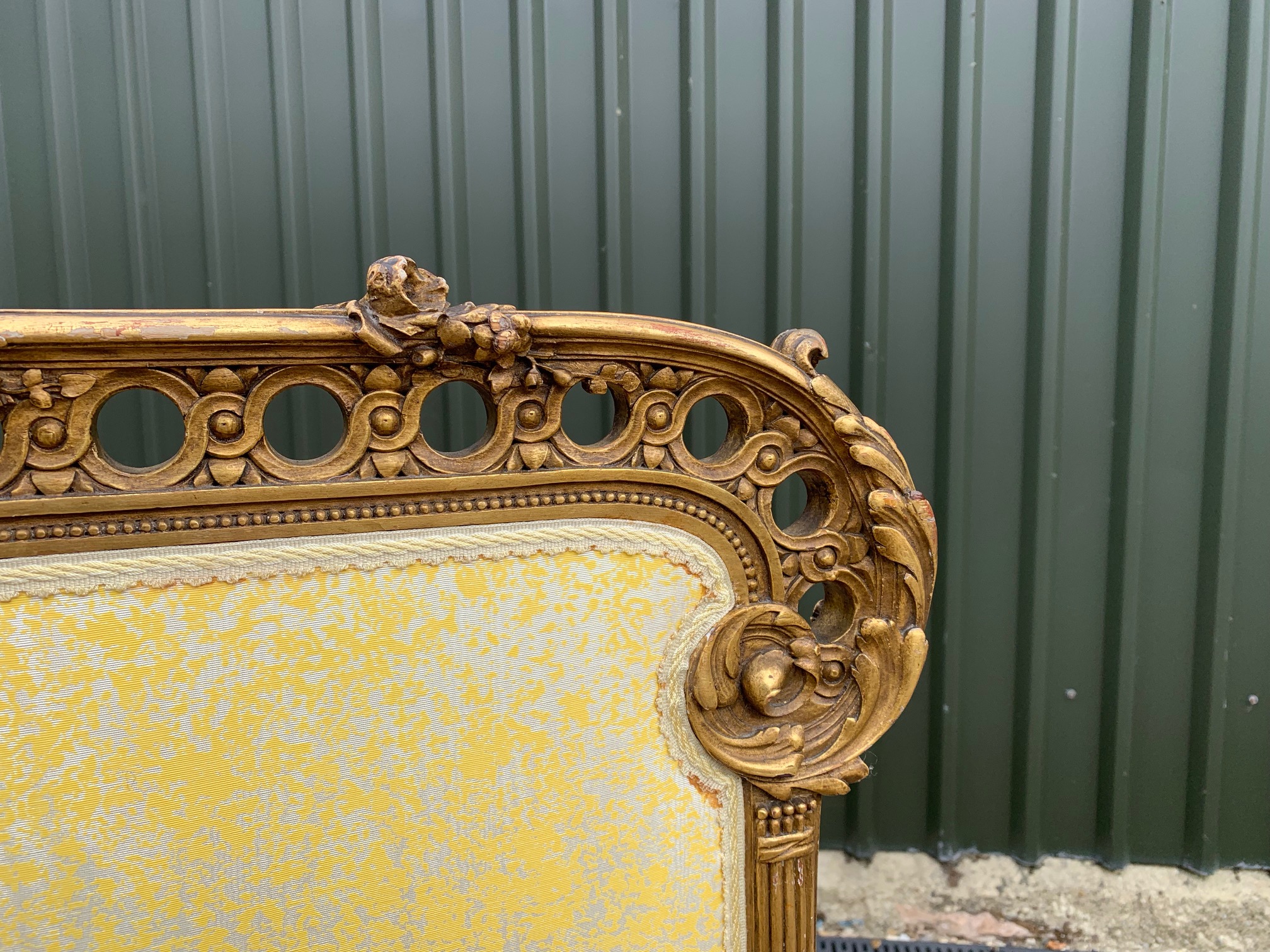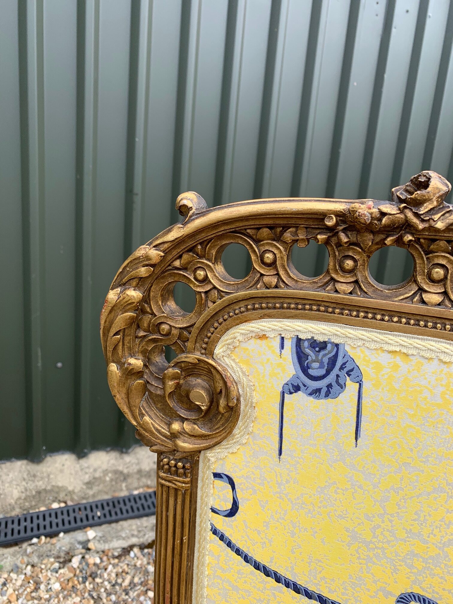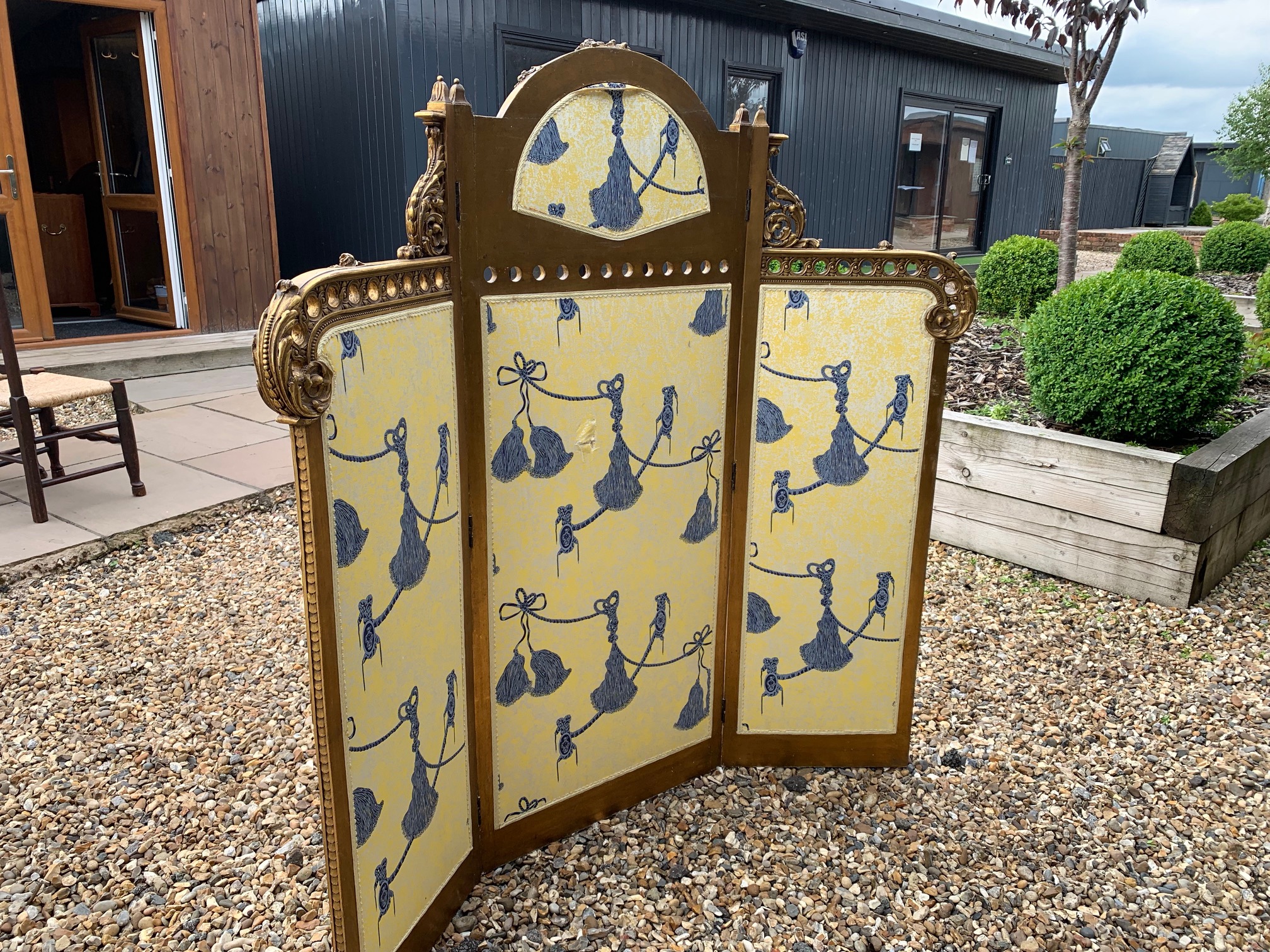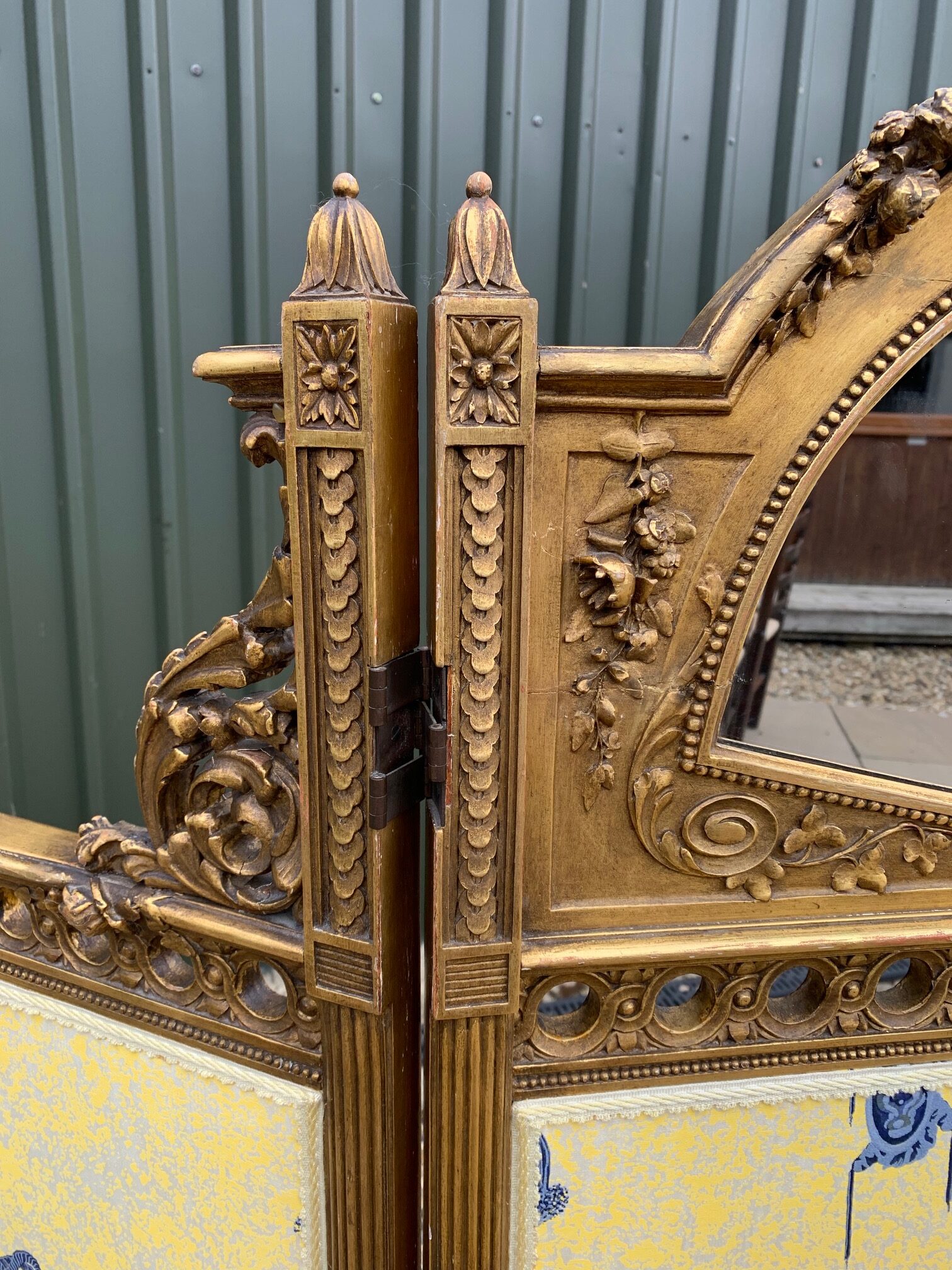 A beautiful French carved gilt wood three fold screen. The central section having a shaped mirror with a foliate carved cartouche and a pierced frieze. The hinged end sections with further finely carved gilt wood foliate detail, upholstered in a French inspired silk fabric. The reverse also upholstered in the same fabric, French circa 1900. There is one small tear as shown in the images.