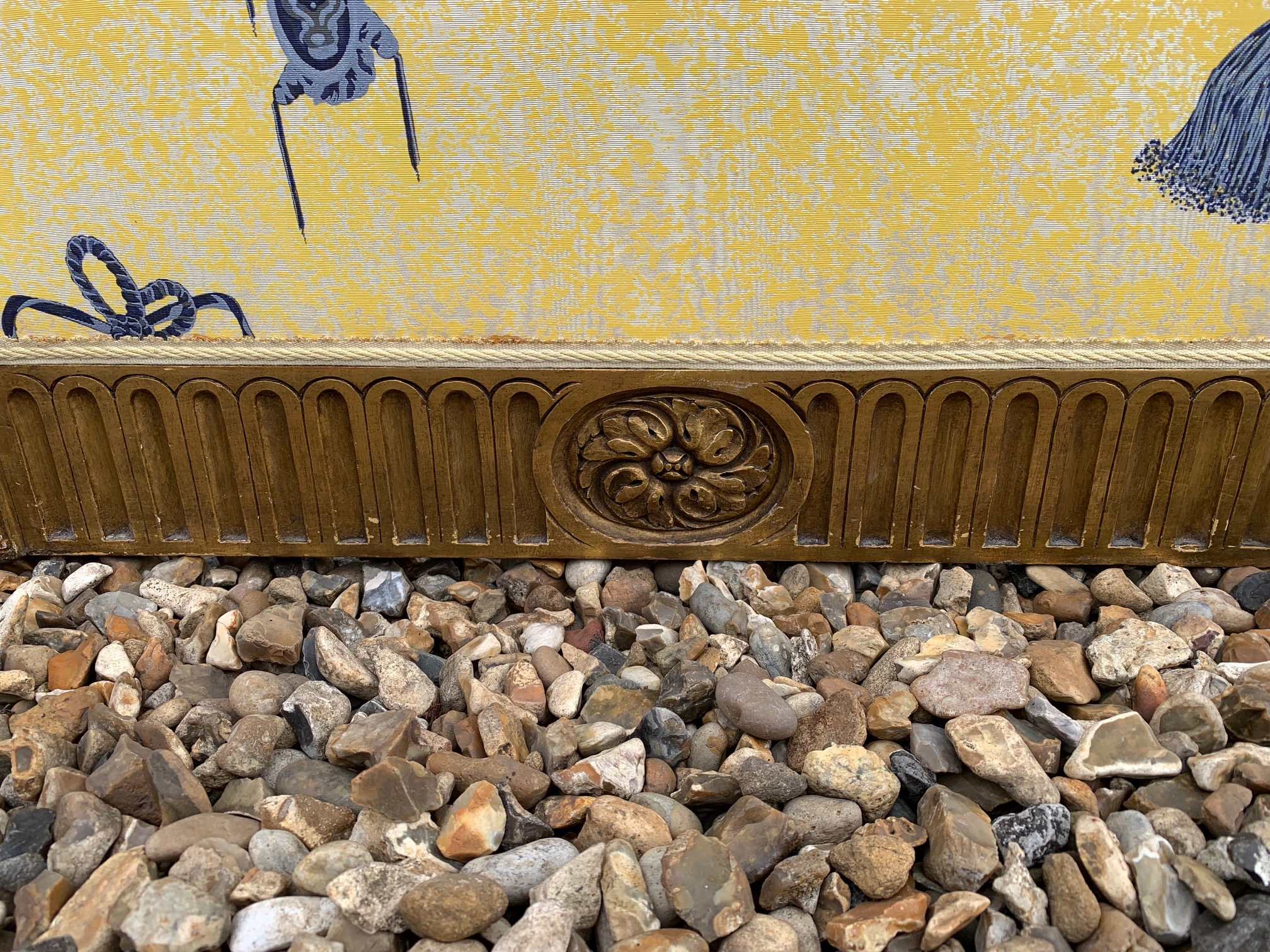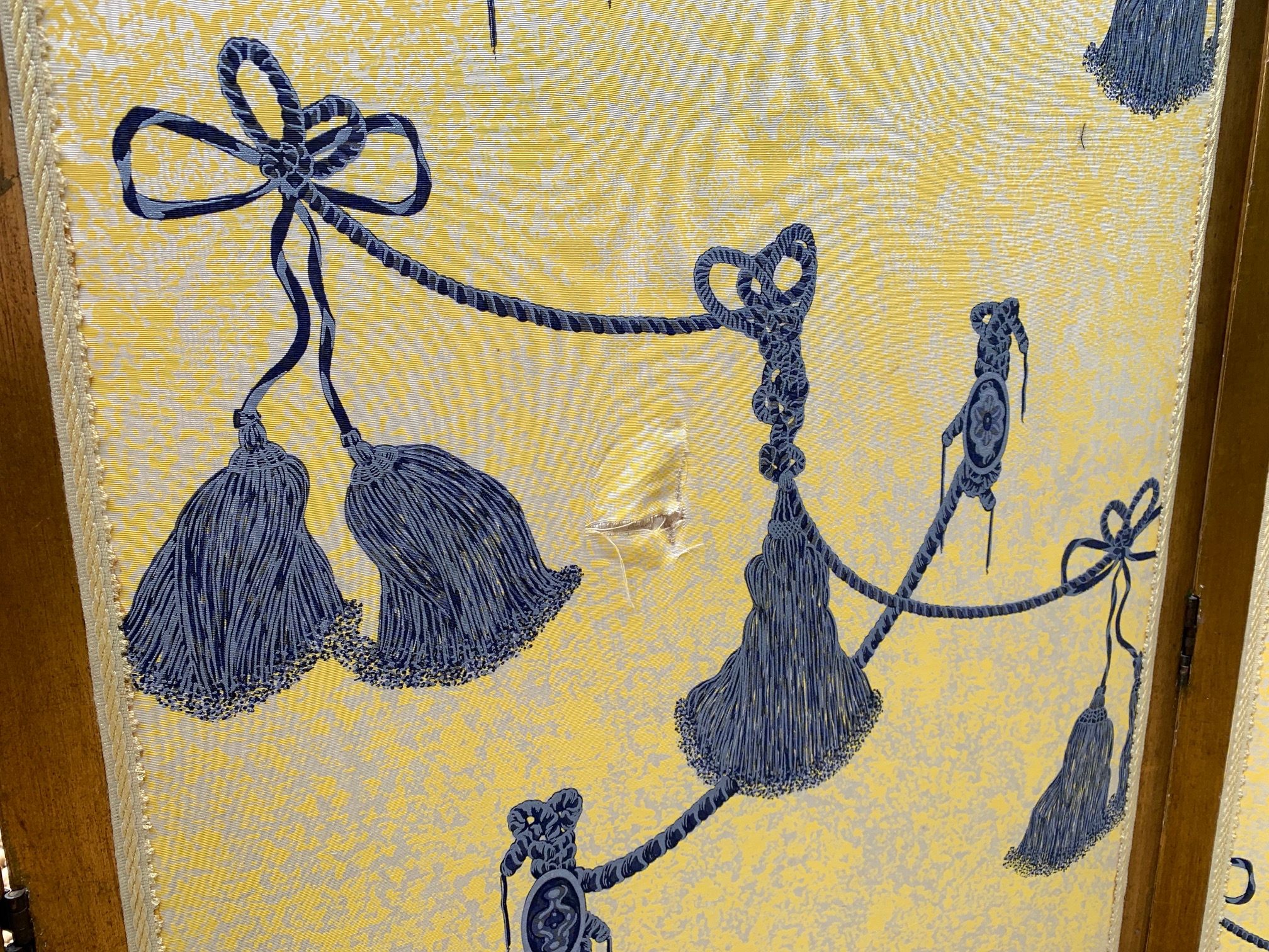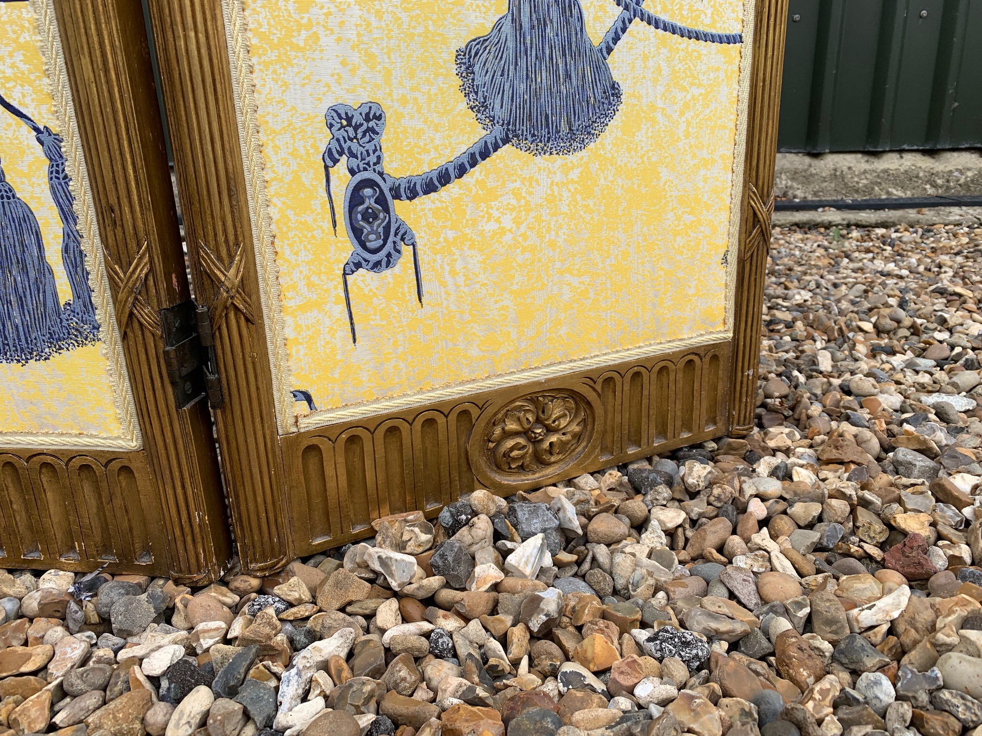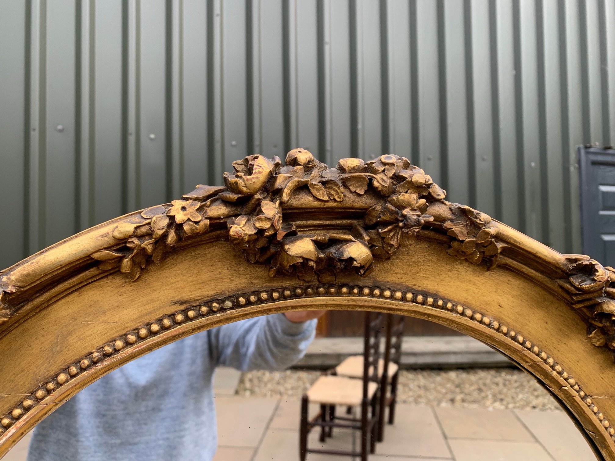 A beautiful French carved gilt wood three fold screen. The central section having a shaped mirror with a foliate carved cartouche and a pierced frieze. The hinged end sections with further finely carved gilt wood foliate detail, upholstered in a French inspired silk fabric. The reverse also upholstered in the same fabric, French circa 1900. There is one small tear as shown in the images.