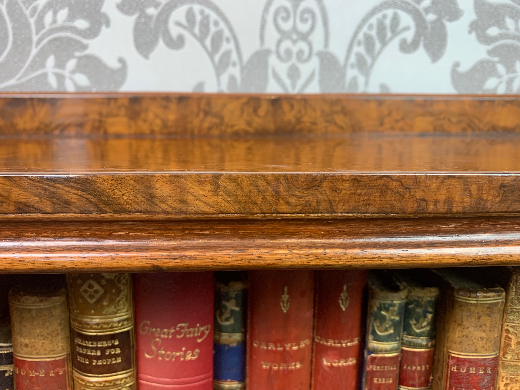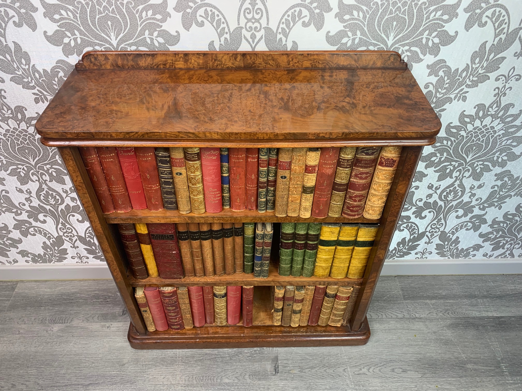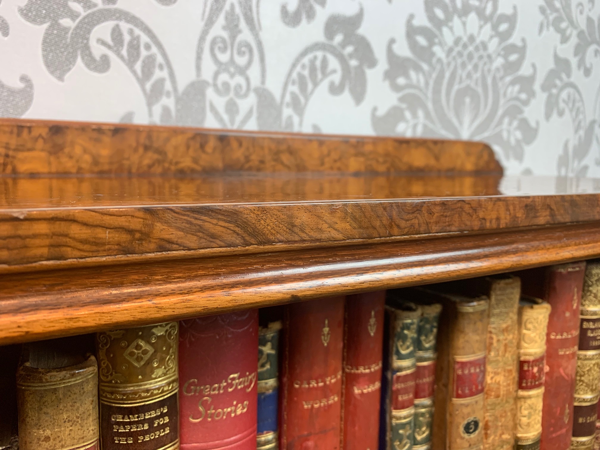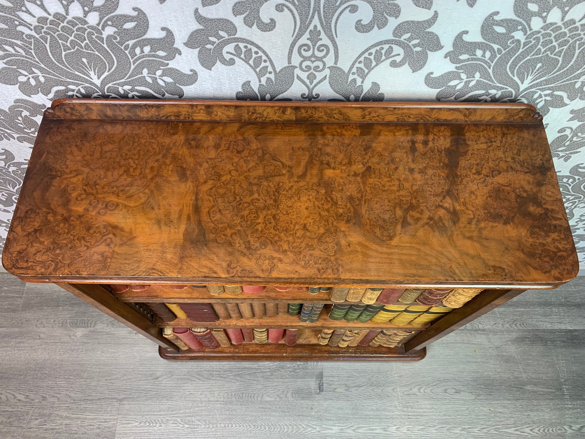 CompareA diminutive Victorian Period burr walnut open bookcase. The rectangular top and galley veneered in beautifully figured burr walnut and having three bookshelves, two of which are adjustable. Having burr walnut rounded corners with solid walnut ends and plinth. English circa 1860-1880, in superb condition cleaned and waxed. Please note this bookcase is quite small see dimensions below