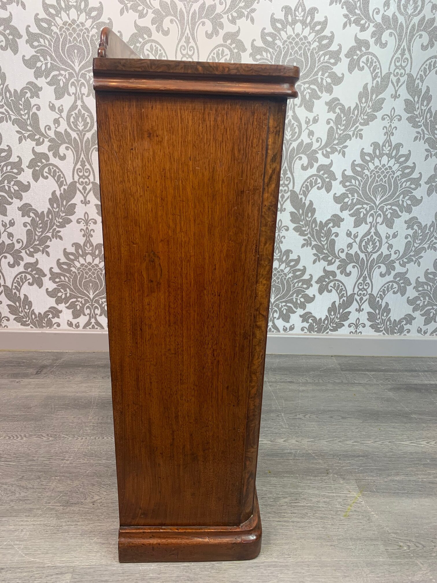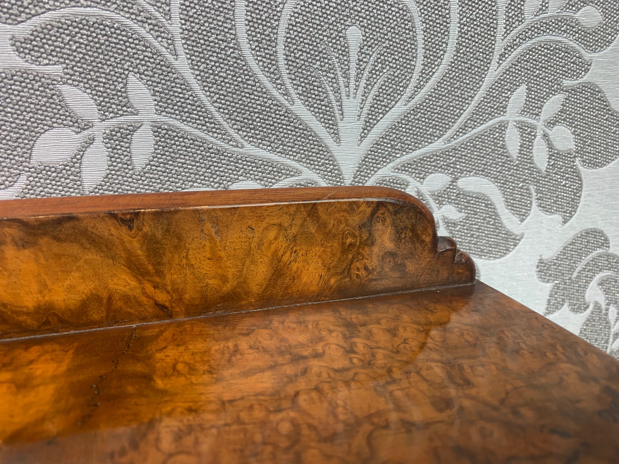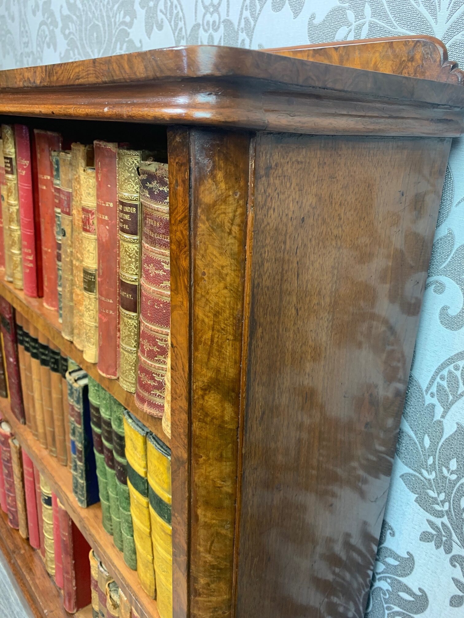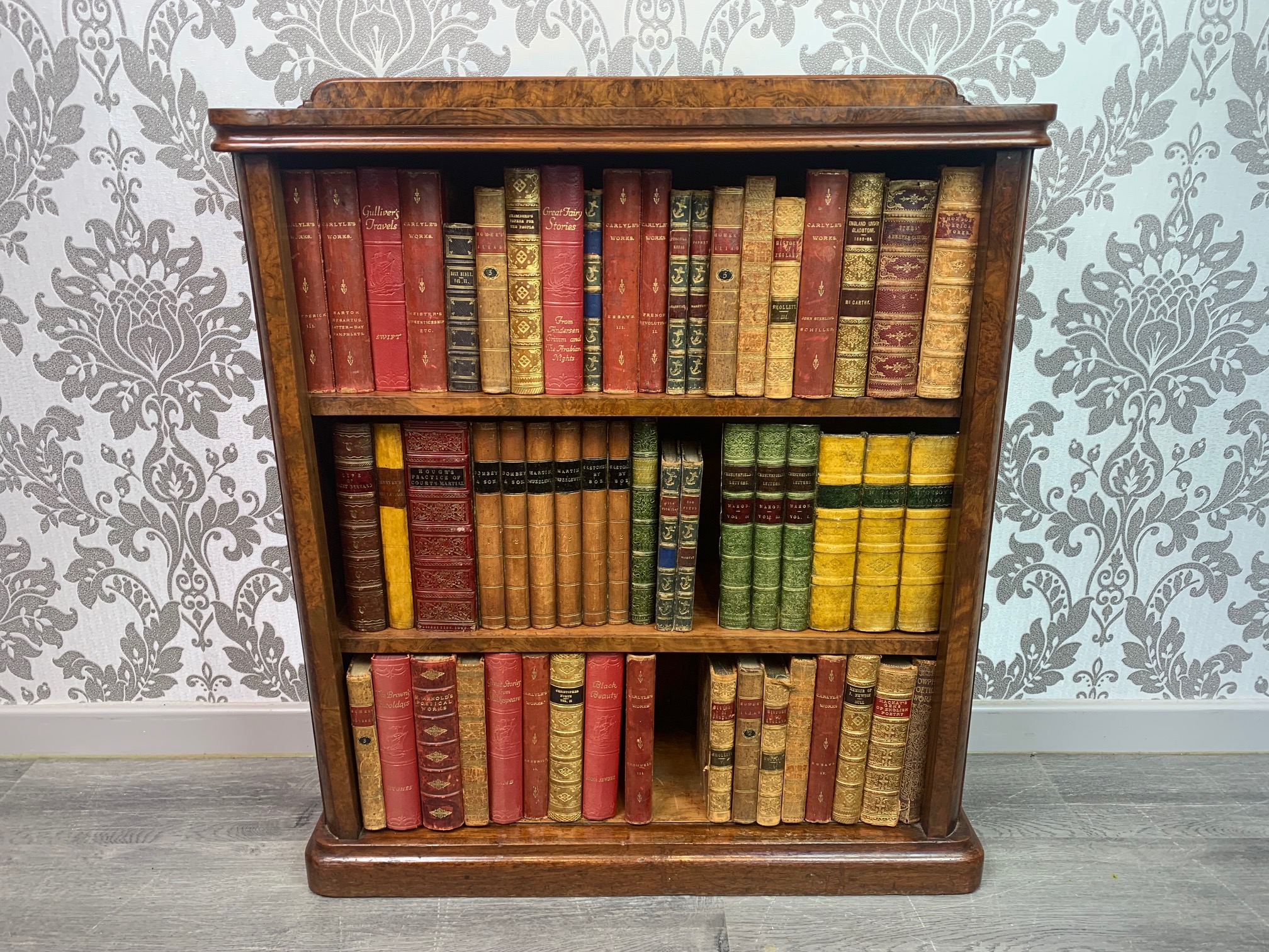 CompareA diminutive Victorian Period burr walnut open bookcase. The rectangular top and galley veneered in beautifully figured burr walnut and having three bookshelves, two of which are adjustable. Having burr walnut rounded corners with solid walnut ends and plinth. English circa 1860-1880, in superb condition cleaned and waxed. Please note this bookcase is quite small see dimensions below
