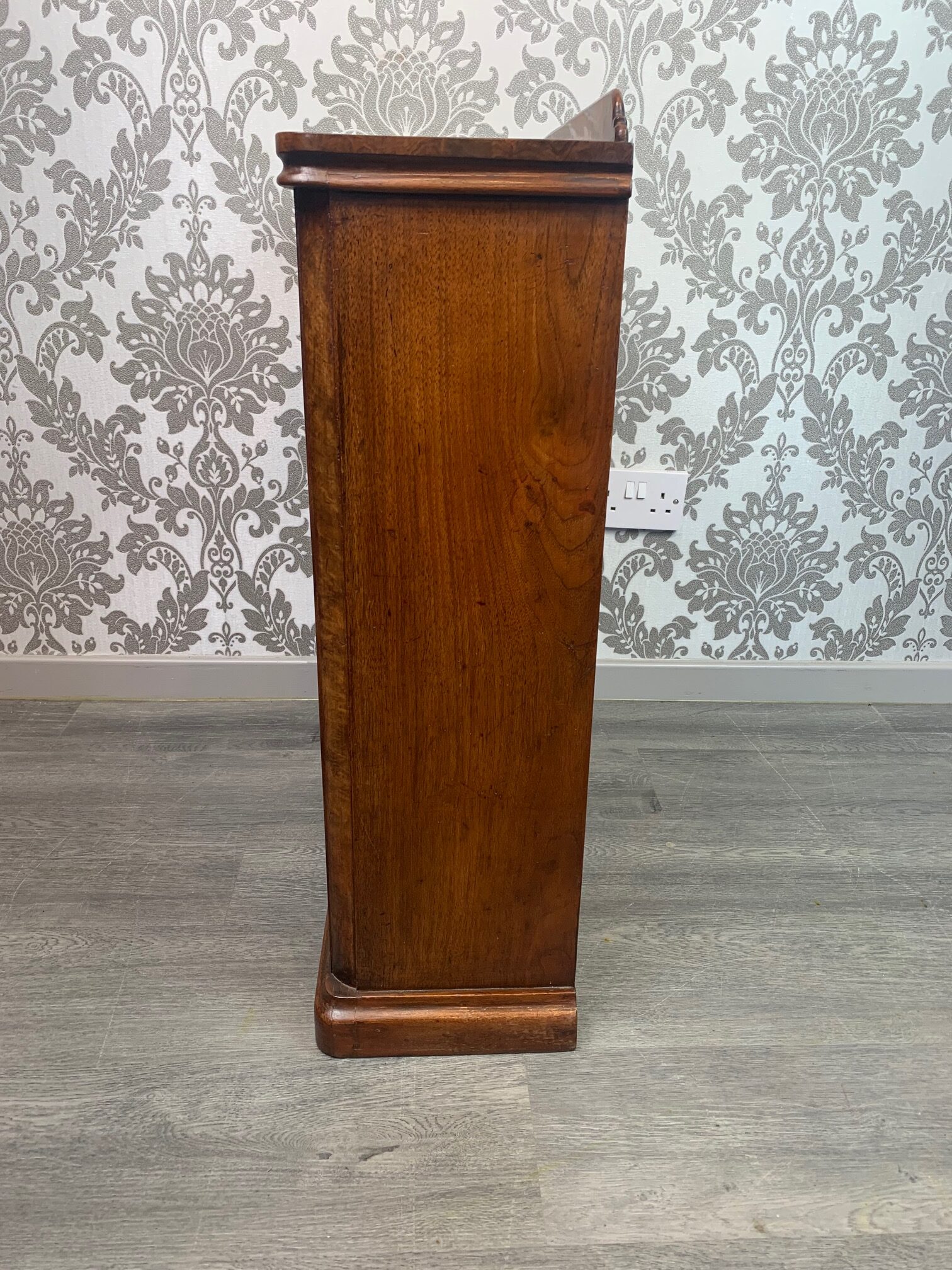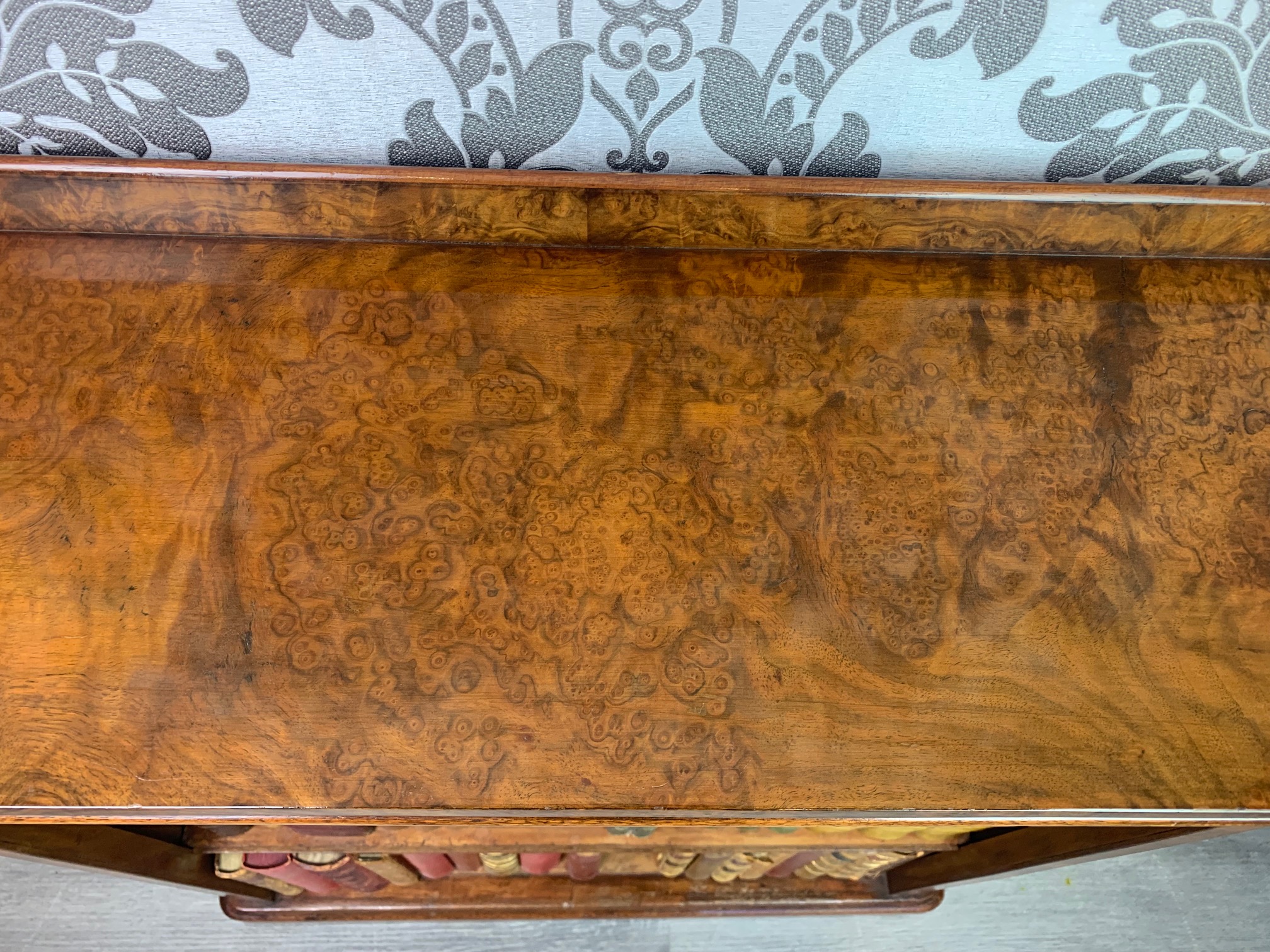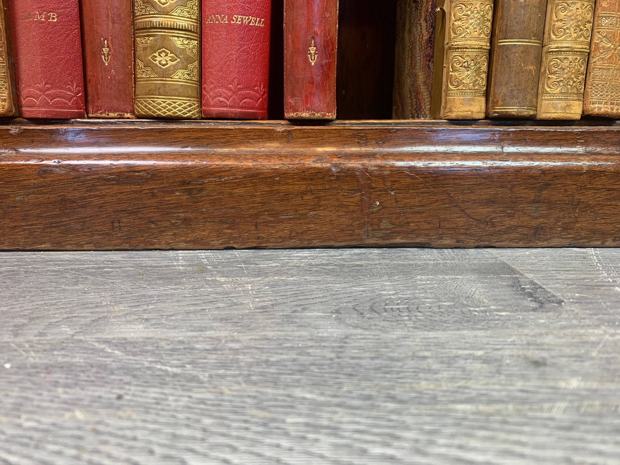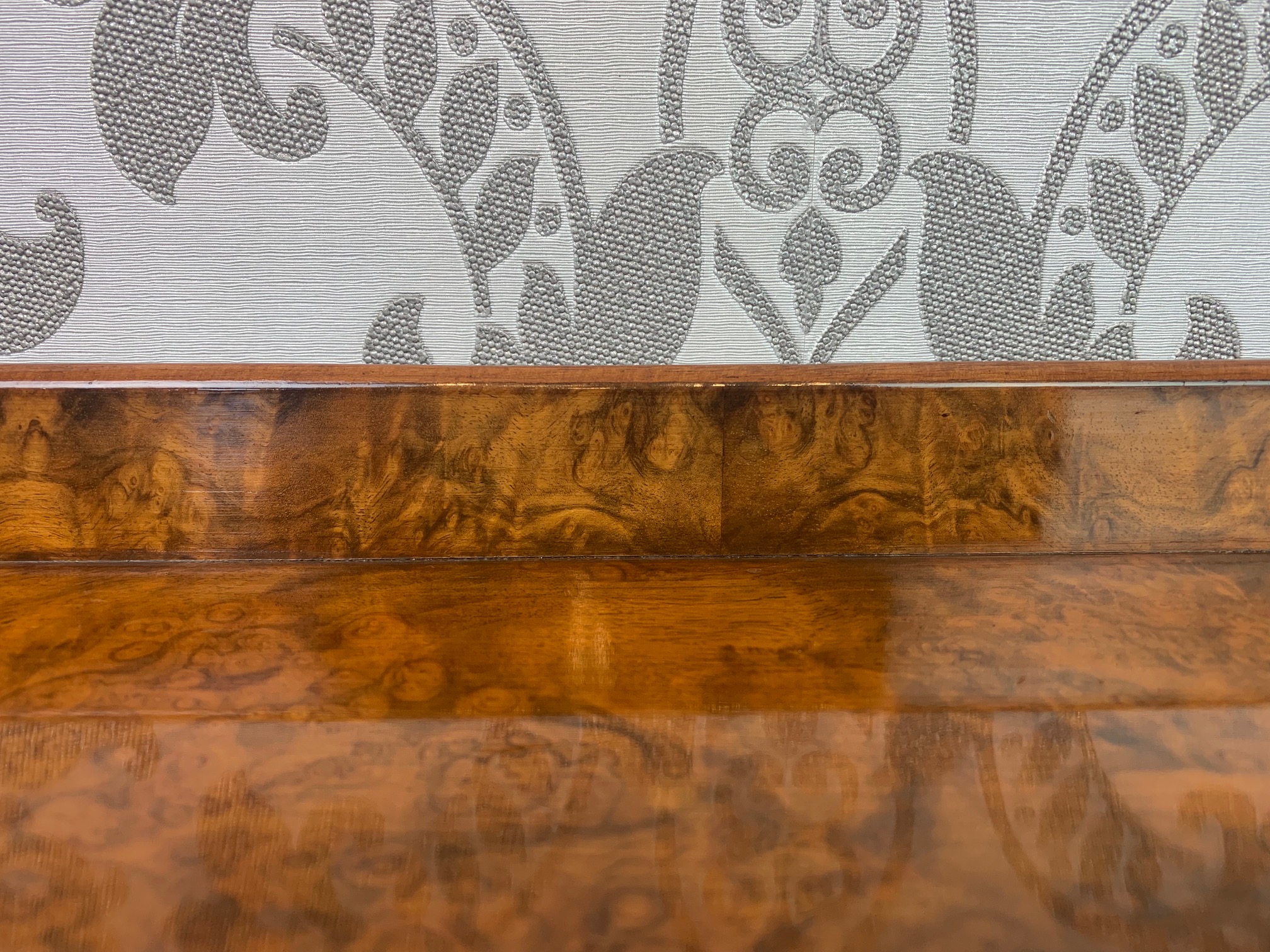 CompareA diminutive Victorian Period burr walnut open bookcase. The rectangular top and galley veneered in beautifully figured burr walnut and having three bookshelves, two of which are adjustable. Having burr walnut rounded corners with solid walnut ends and plinth. English circa 1860-1880, in superb condition cleaned and waxed. Please note this bookcase is quite small see dimensions below
