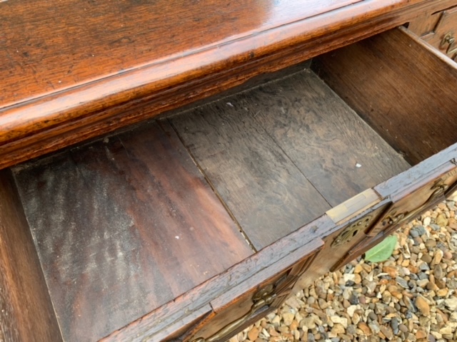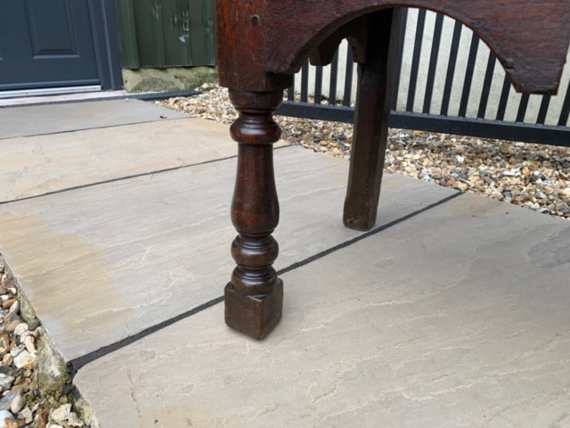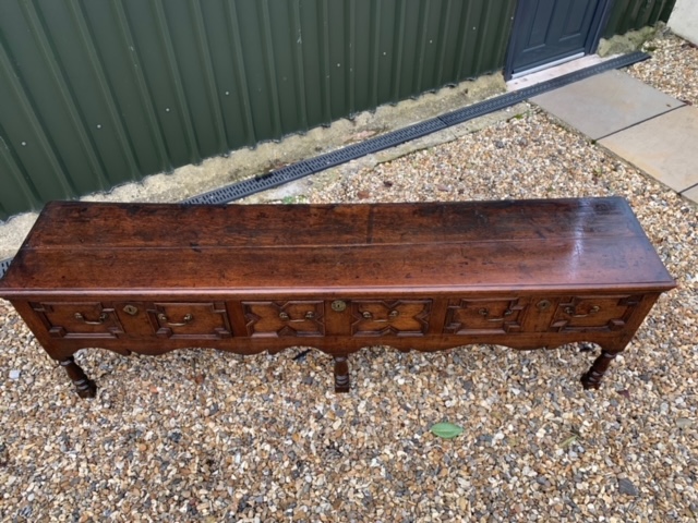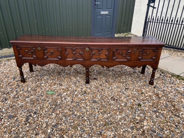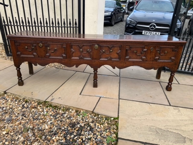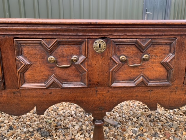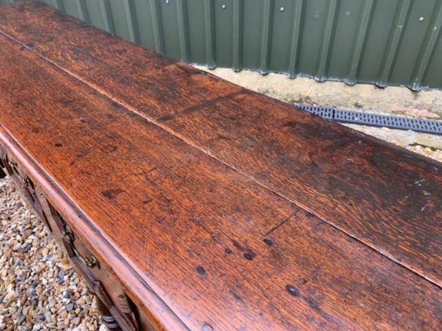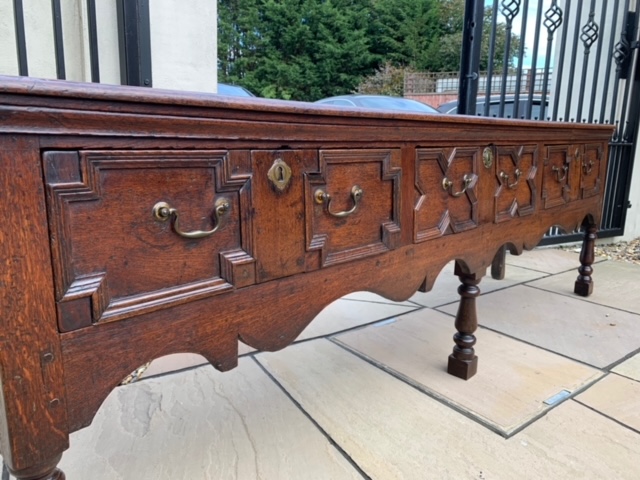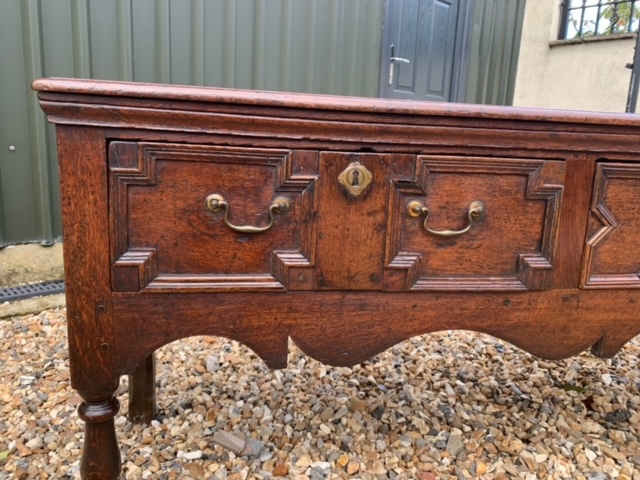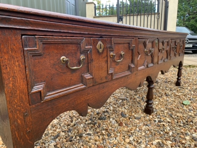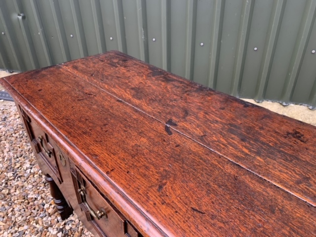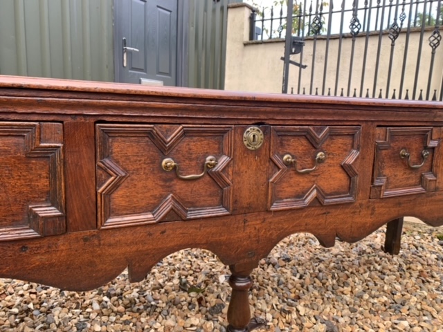 CompareA fantastic early 18th Century 7ft antique oak dresser base. The rectangular two plank top above three rectangular oak lined drawers with Geometric moulding and brass swan neck handles. Having a wavy frieze and raised on three baluster turned legs with rear stile supports. English 1700-1720, In excellent condition, cleaned and waxed, the handles are later. A fabulous colour and patination