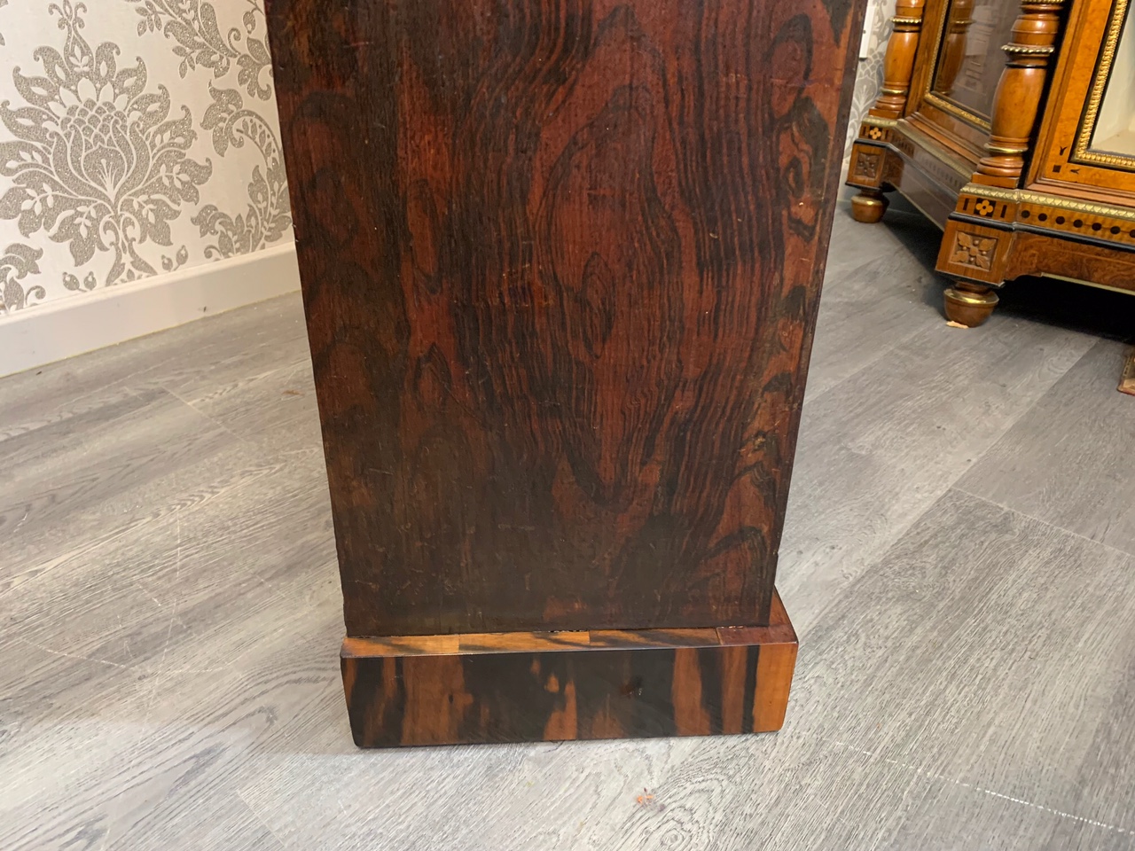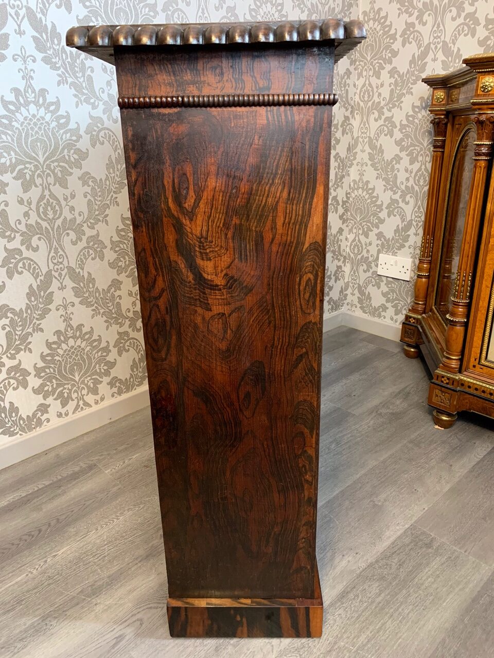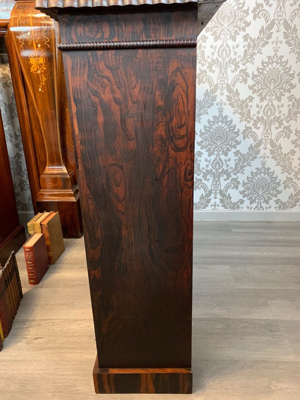 A fine quality Early Victorian Rosewood open bookcase. The rectangular top veneered in beautifully figured rosewood with  carved rosewood moulding and having two adjustable shelves with faux rosewood scumbling, which is repeated on the inside, back panel and ends. Raised on a Goncalo Alves veneered plinth. English circa 1850, super condition