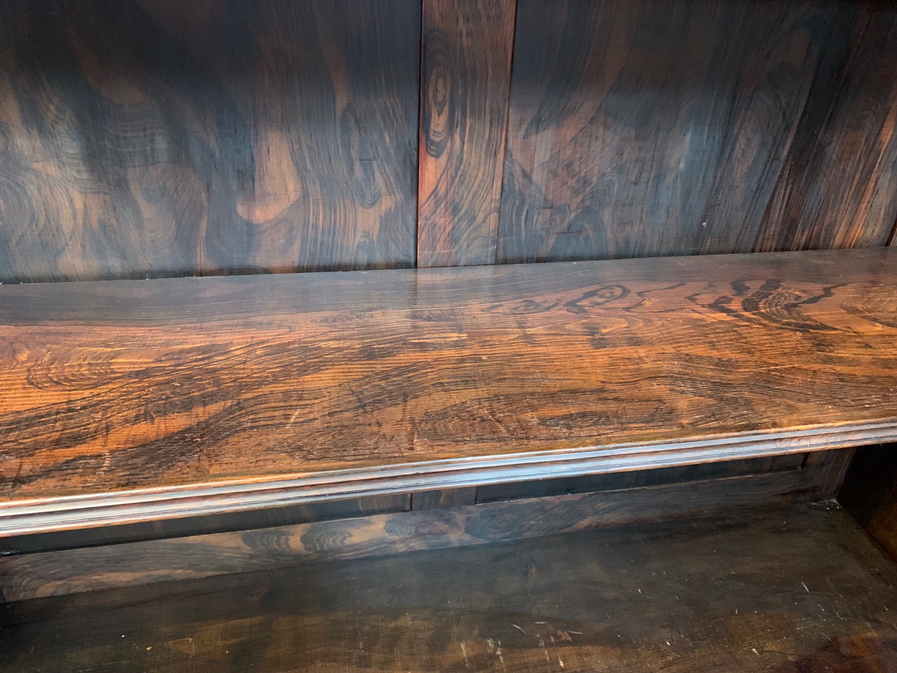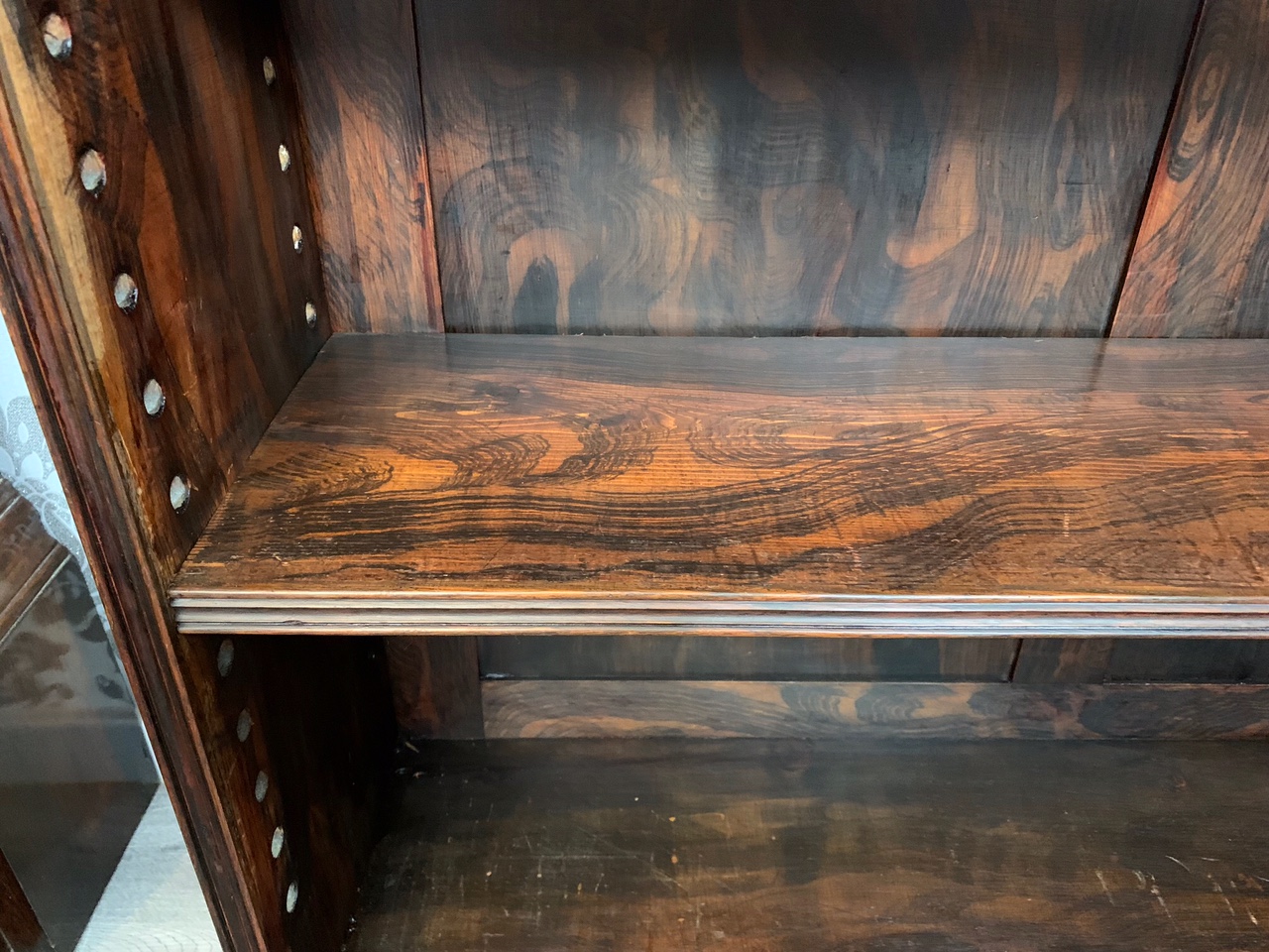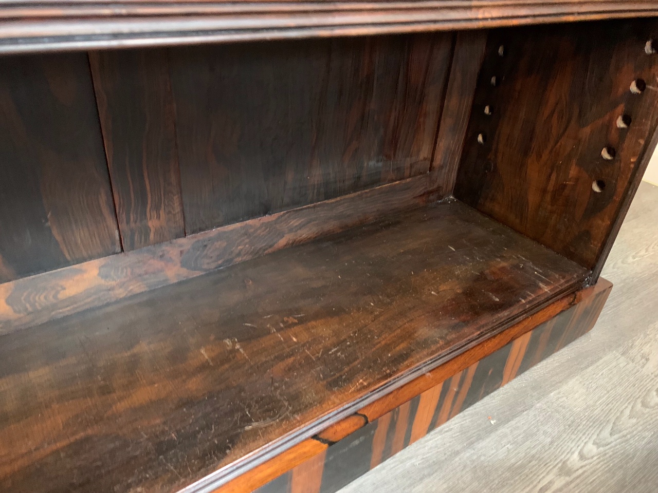 A fine quality Early Victorian Rosewood open bookcase. The rectangular top veneered in beautifully figured rosewood with  carved rosewood moulding and having two adjustable shelves with faux rosewood scumbling, which is repeated on the inside, back panel and ends. Raised on a Goncalo Alves veneered plinth. English circa 1850, super condition