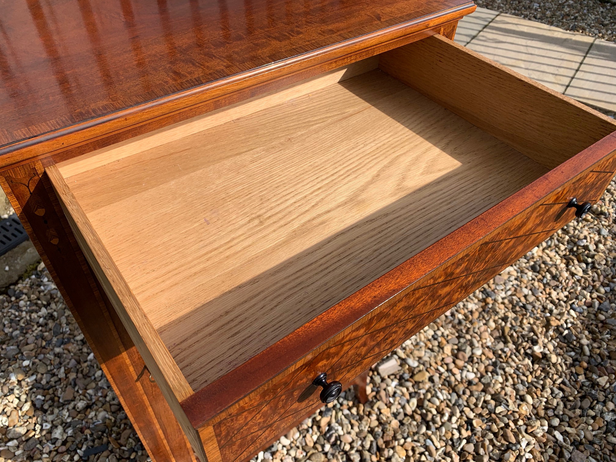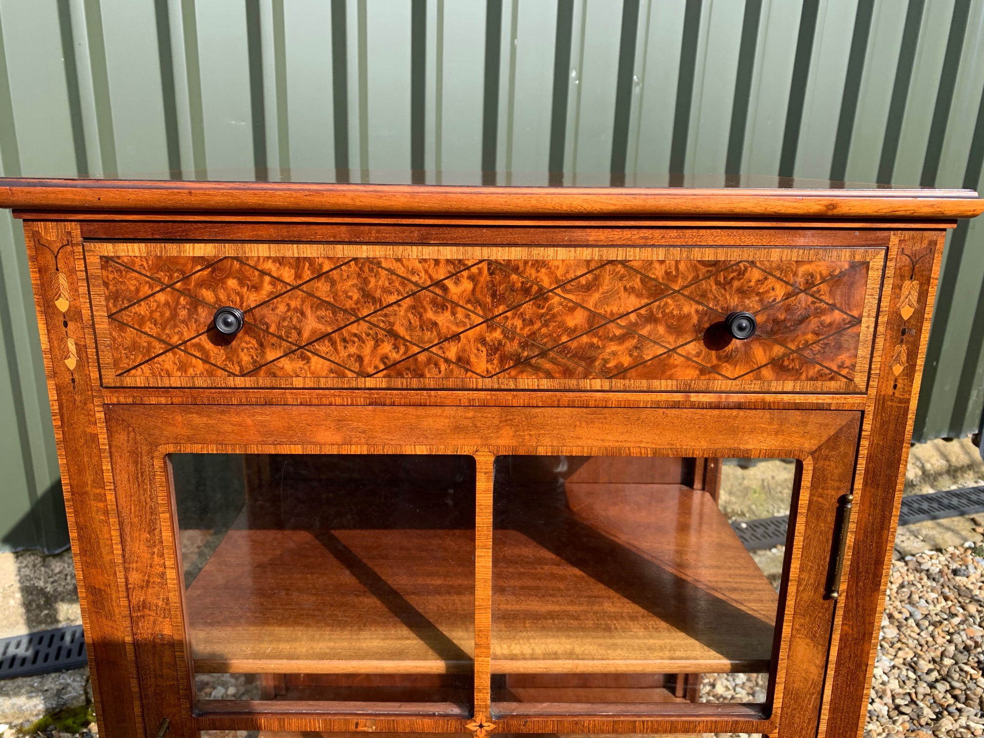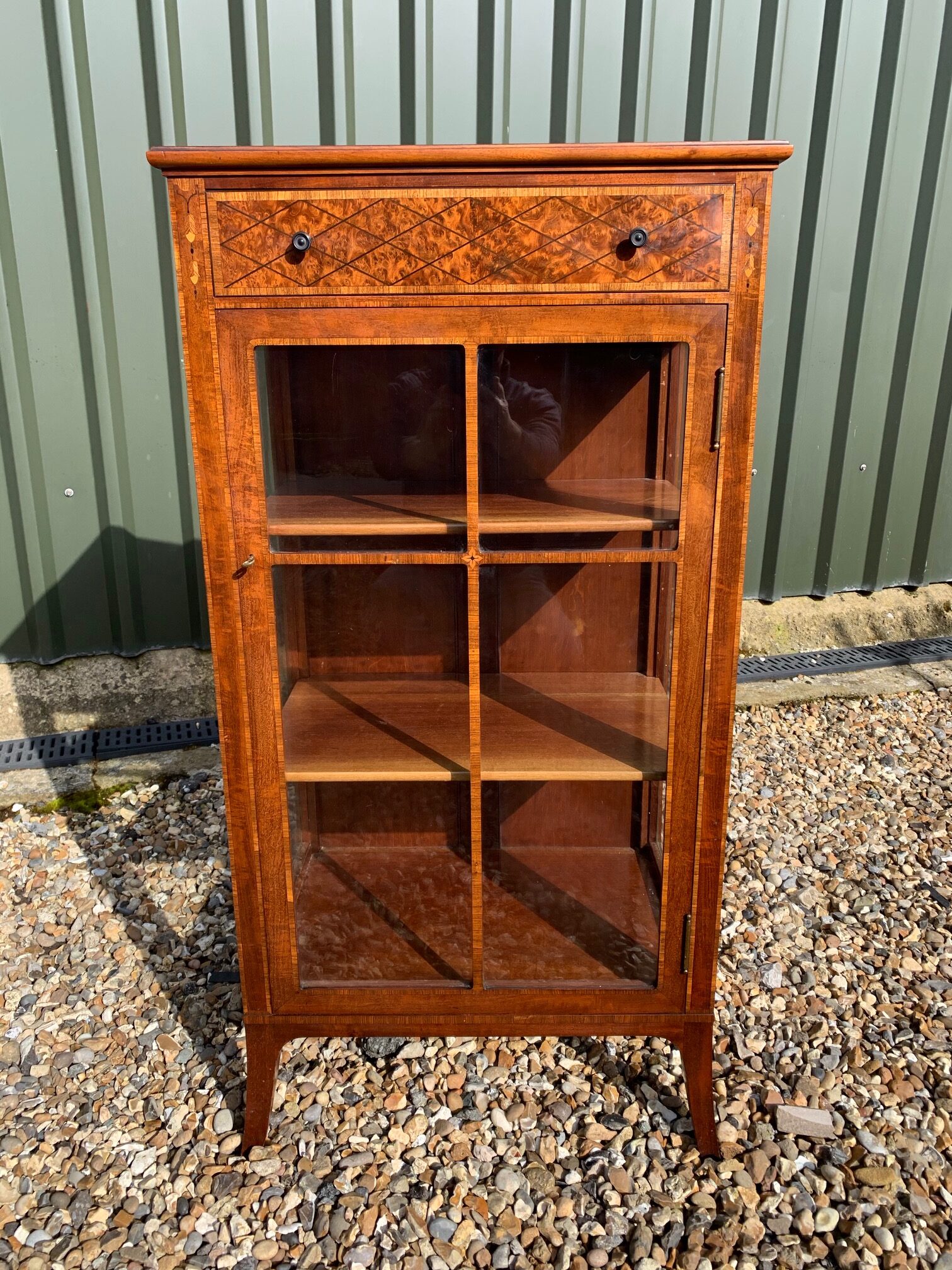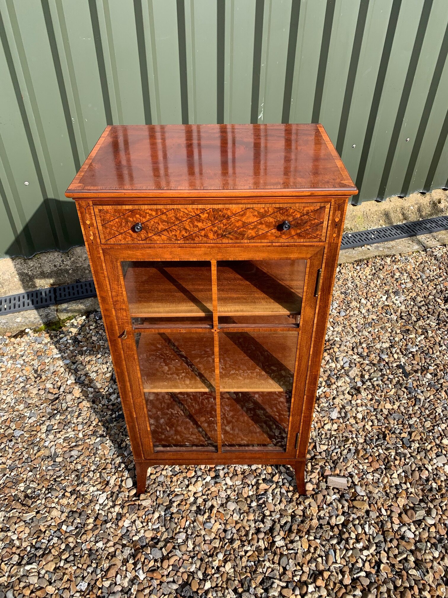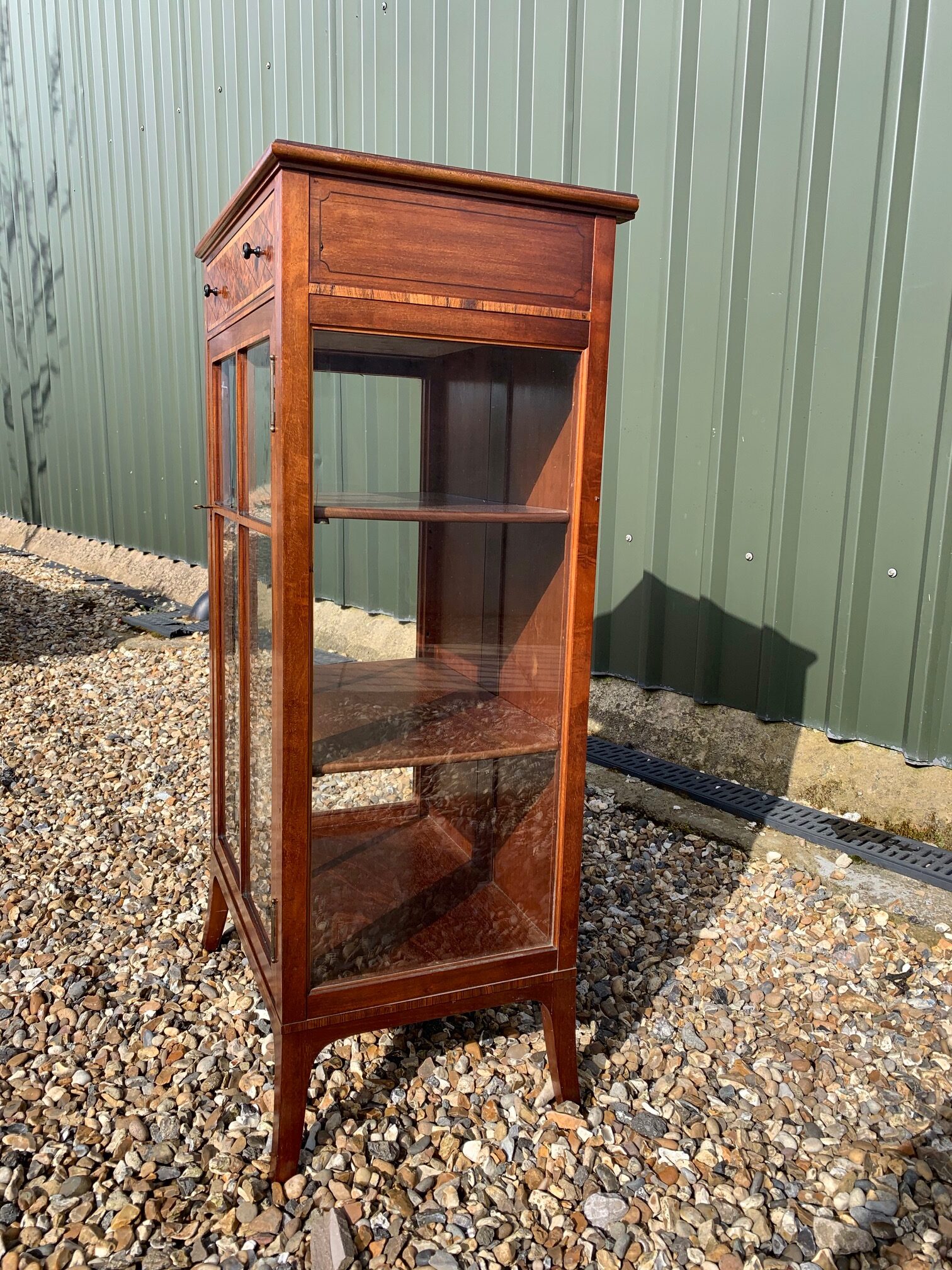 CompareA fine quality Edwardian Period mahogany, amboyna and kingwood banded display cabinet. The rectangular top in beautifully figured mahogany, banded in kingwood, above a rectangular oak lined drawer veneered in amboyna with turned ebony knobs and again banded in kingwood. Having fine inlaid detail to the pillars, a central glazed door enclosing two adjustable shelves with glazed ends and raised on splayed feet. English circa 1900-1910 superb original condition
