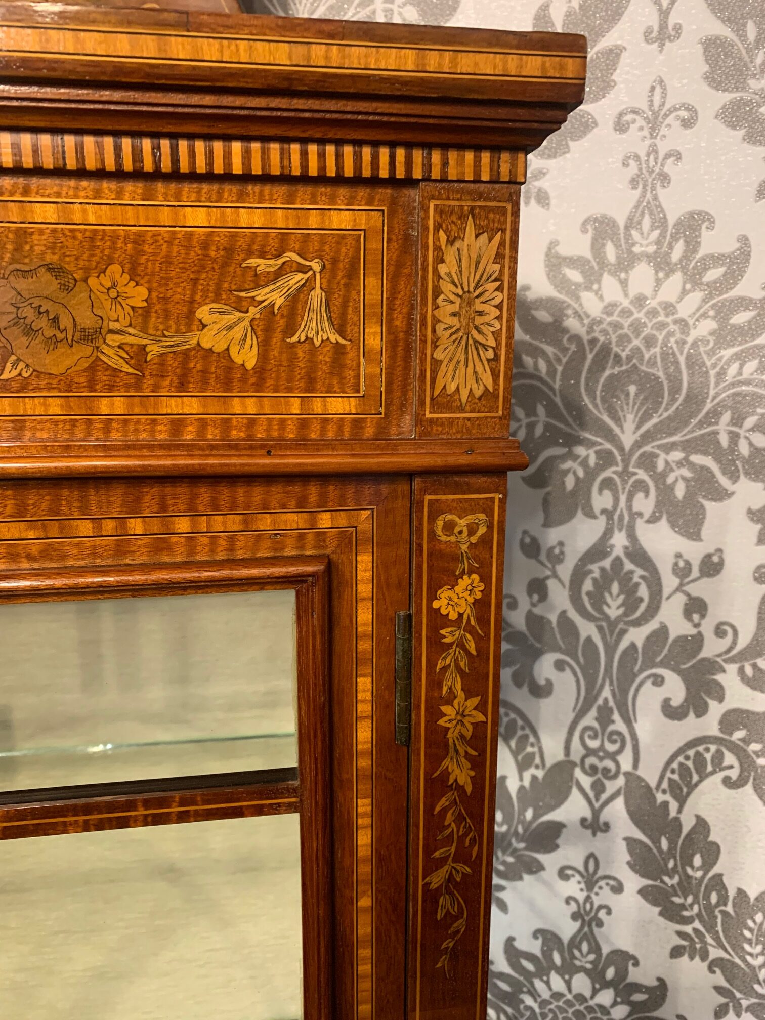 CompareA fine quality Edwardian Period mahogany and marquetry inlaid Display cabinet. The raised galleried back having cornucopia marquetry inlaid detail and satinwood cross banding. The mahogany cabinet profusely inlaid with floral marquetry garlands and again with satinwood banding. The central door opening to reveal two glass shelves and a silk lined interior, raised on square tapering supports and spade feet with boxwood line inlaid detail, the glazed ends also with satinwood banding and line inlay. English circa 1900-1900, in superb condition