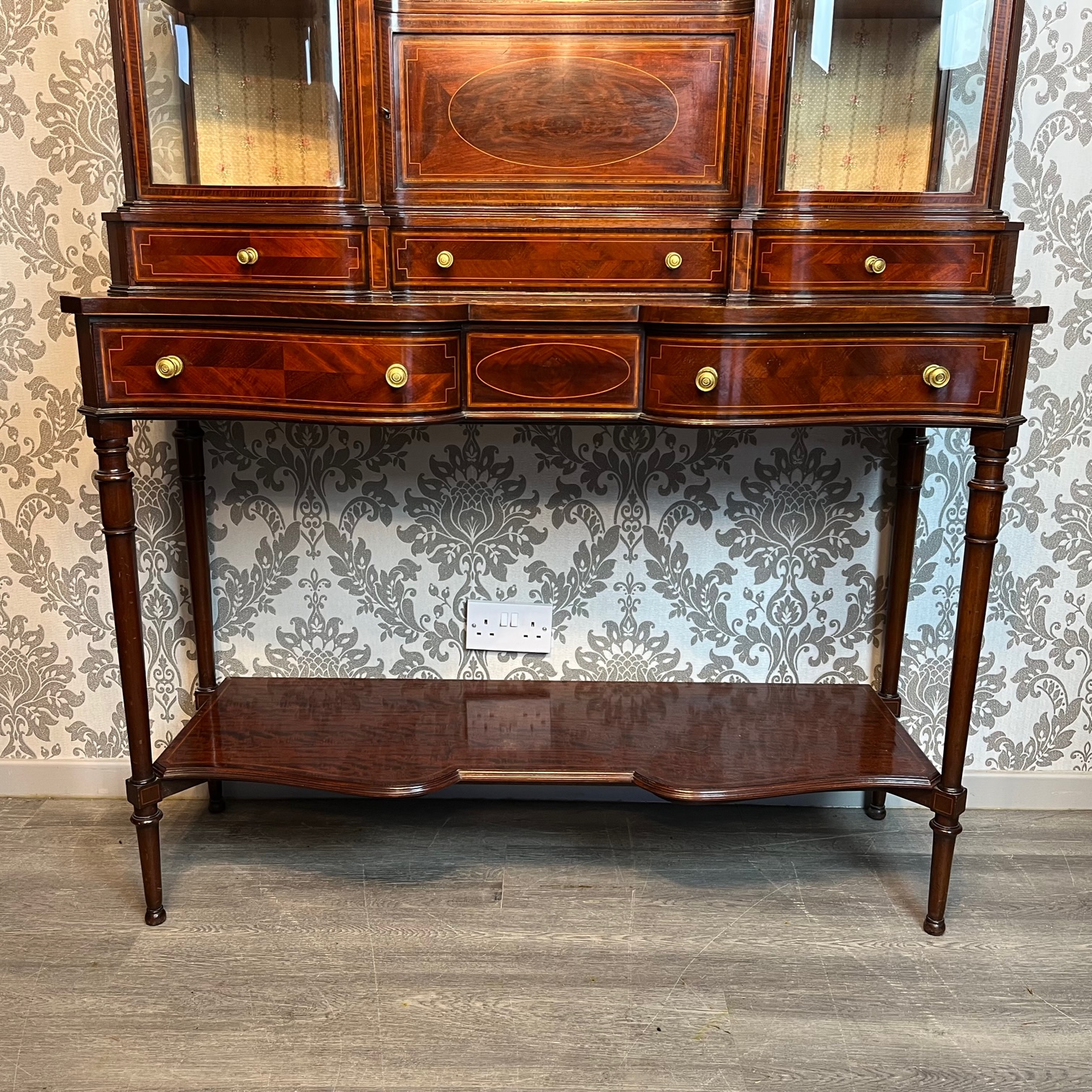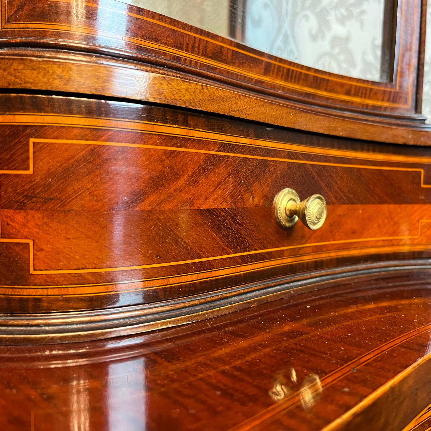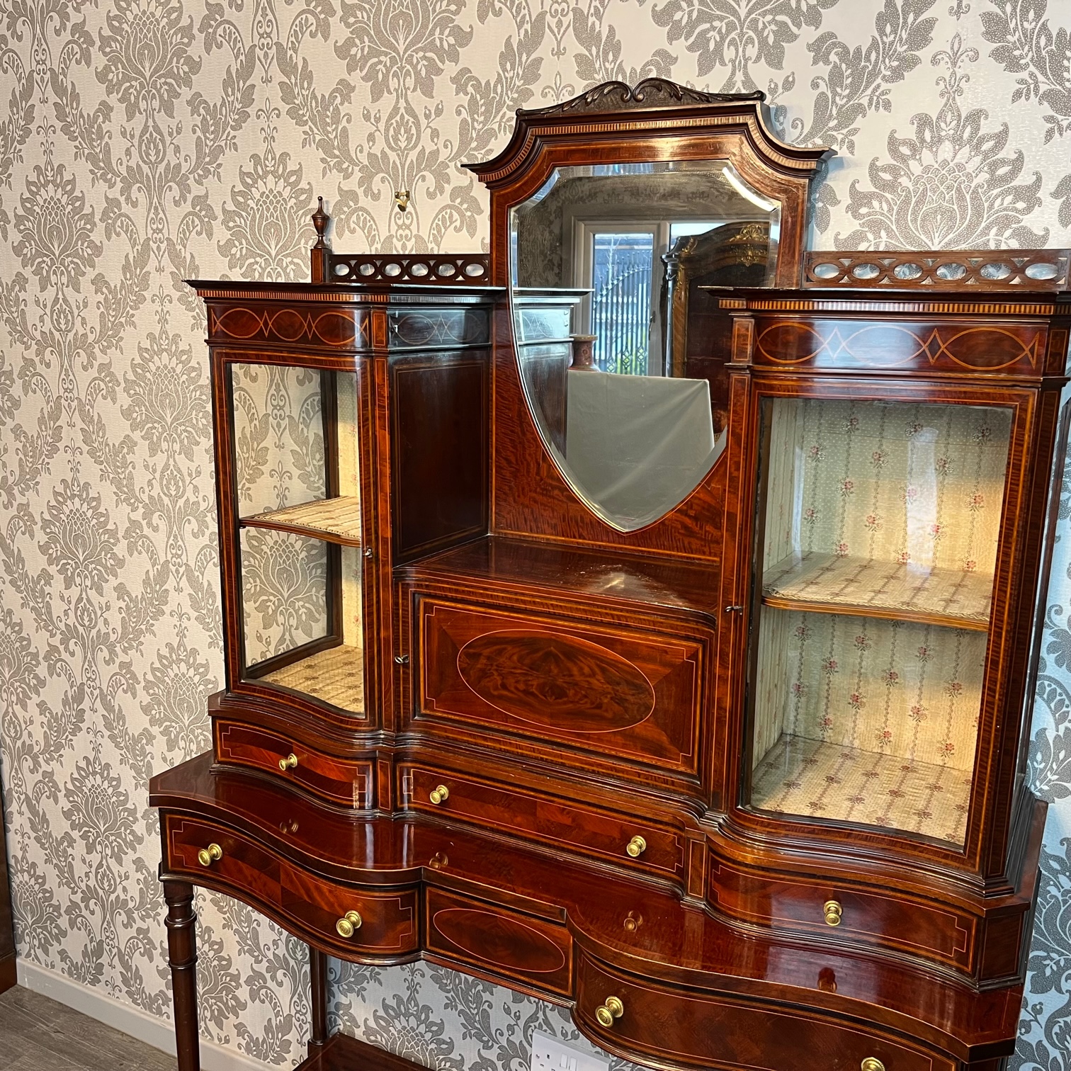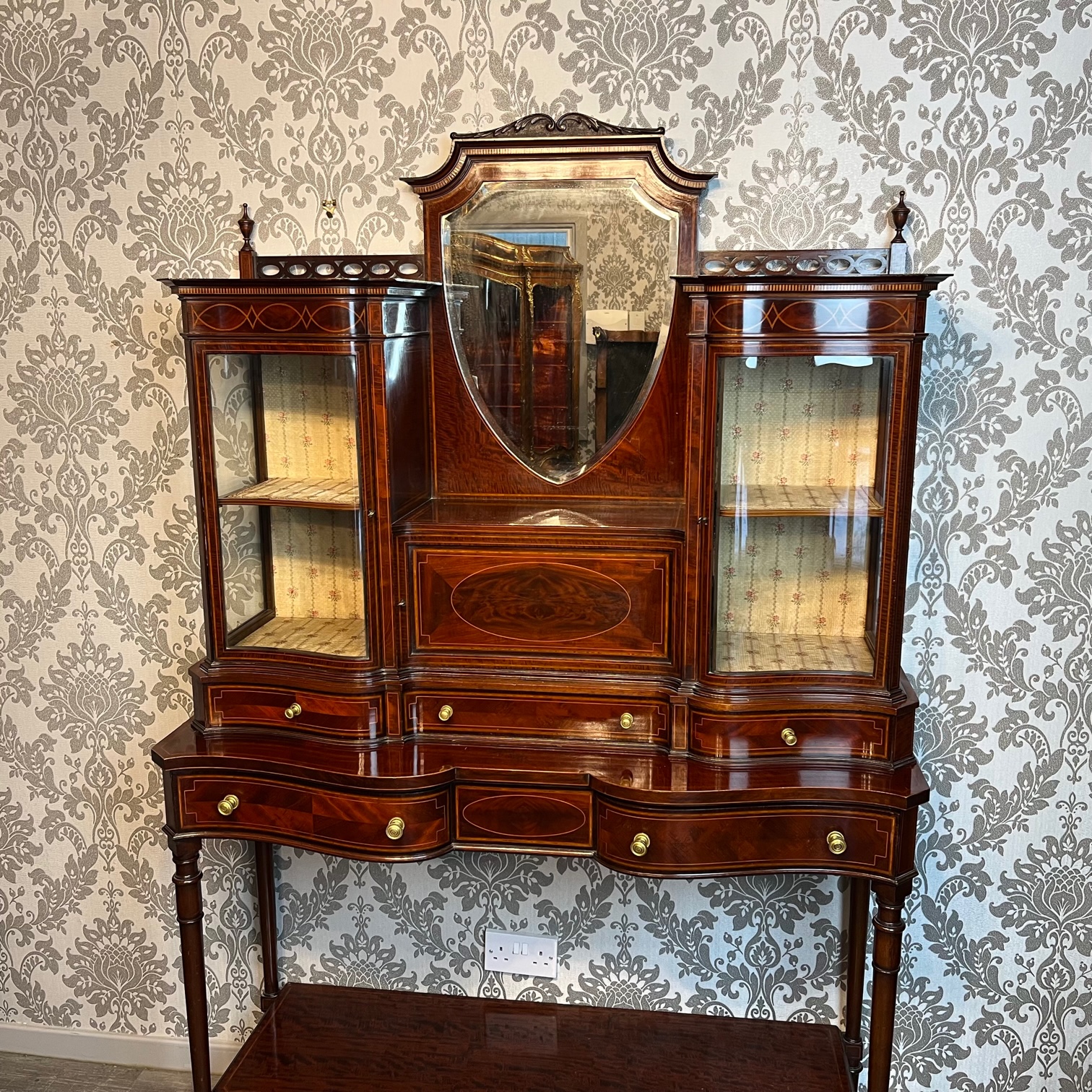 CompareA fine quality Edwardian Period mahogany antique display cabinet. The upper display section having a pierced galley, turned finials, carved crest and central oval bevelled mirror, flanked by serpentine glazed doors with silk lined interiors and shelves and three mahogany lined drawers. The lower stand section of serpentine outline with twin drawers with traditional brass knobs and the whole raised on elegant turned tapering supports, united by a shaped under tier. English circa 1900-1910 probably made by Maple & Co of London