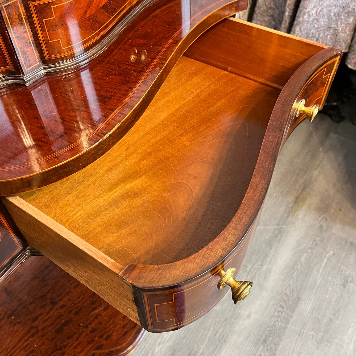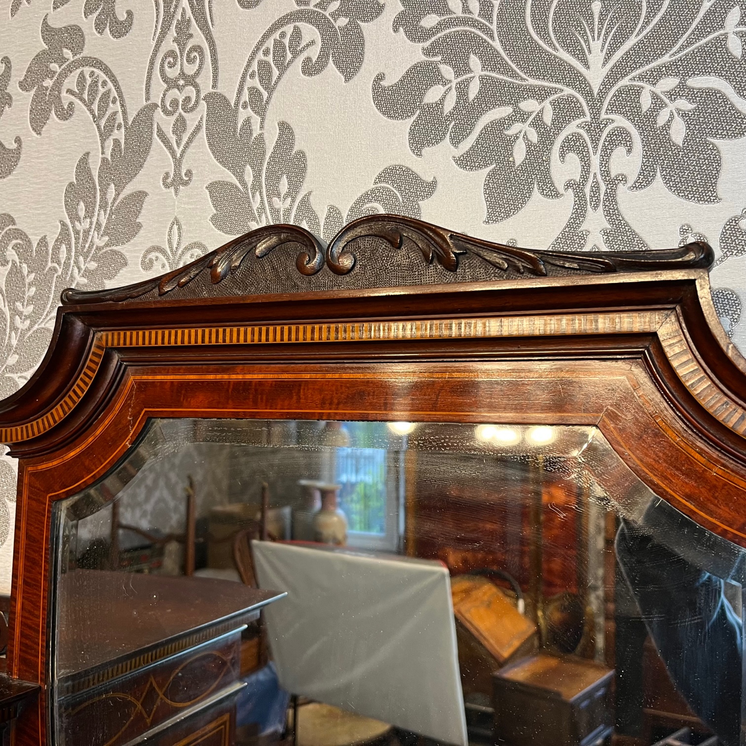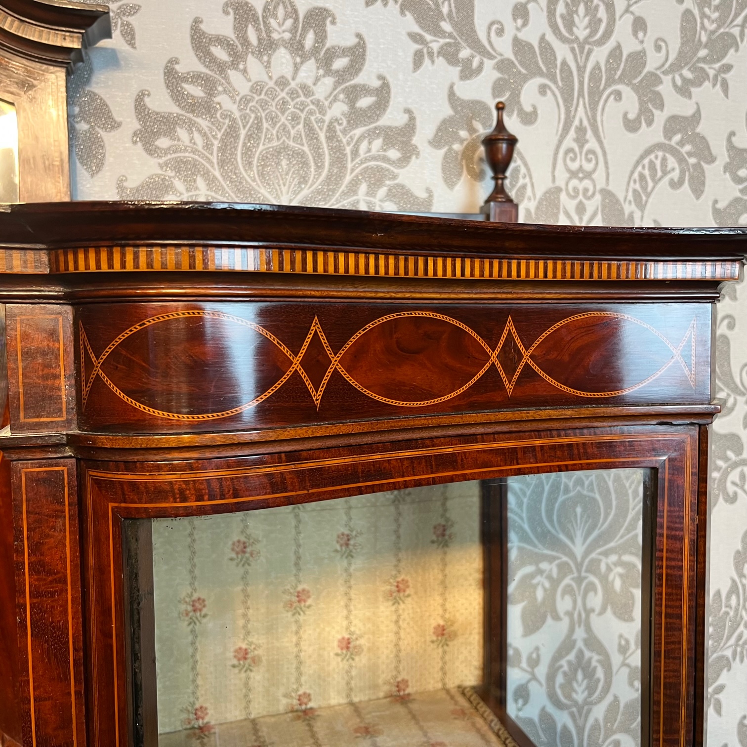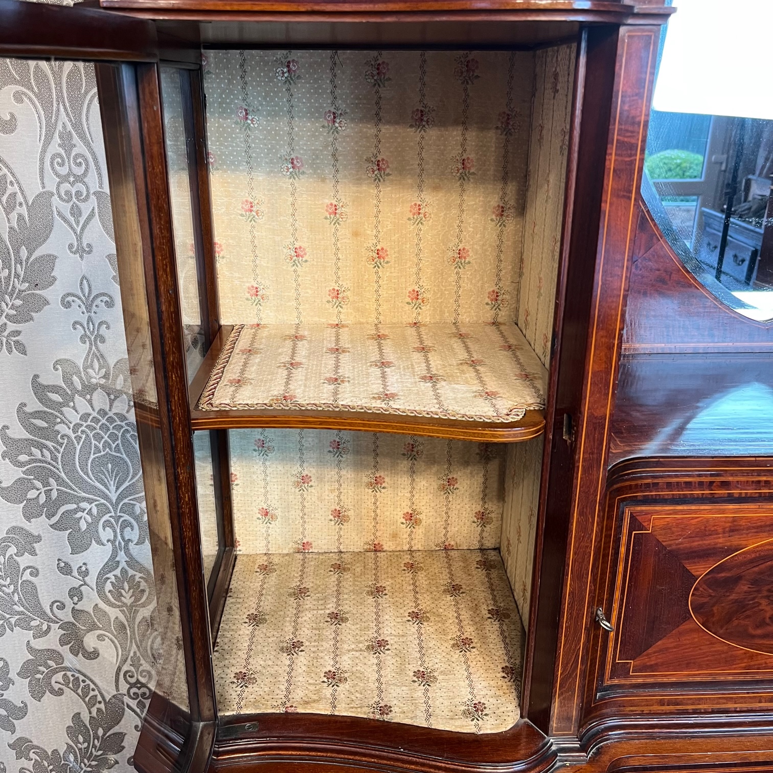 CompareA fine quality Edwardian Period mahogany antique display cabinet. The upper display section having a pierced galley, turned finials, carved crest and central oval bevelled mirror, flanked by serpentine glazed doors with silk lined interiors and shelves and three mahogany lined drawers. The lower stand section of serpentine outline with twin drawers with traditional brass knobs and the whole raised on elegant turned tapering supports, united by a shaped under tier. English circa 1900-1910 probably made by Maple & Co of London