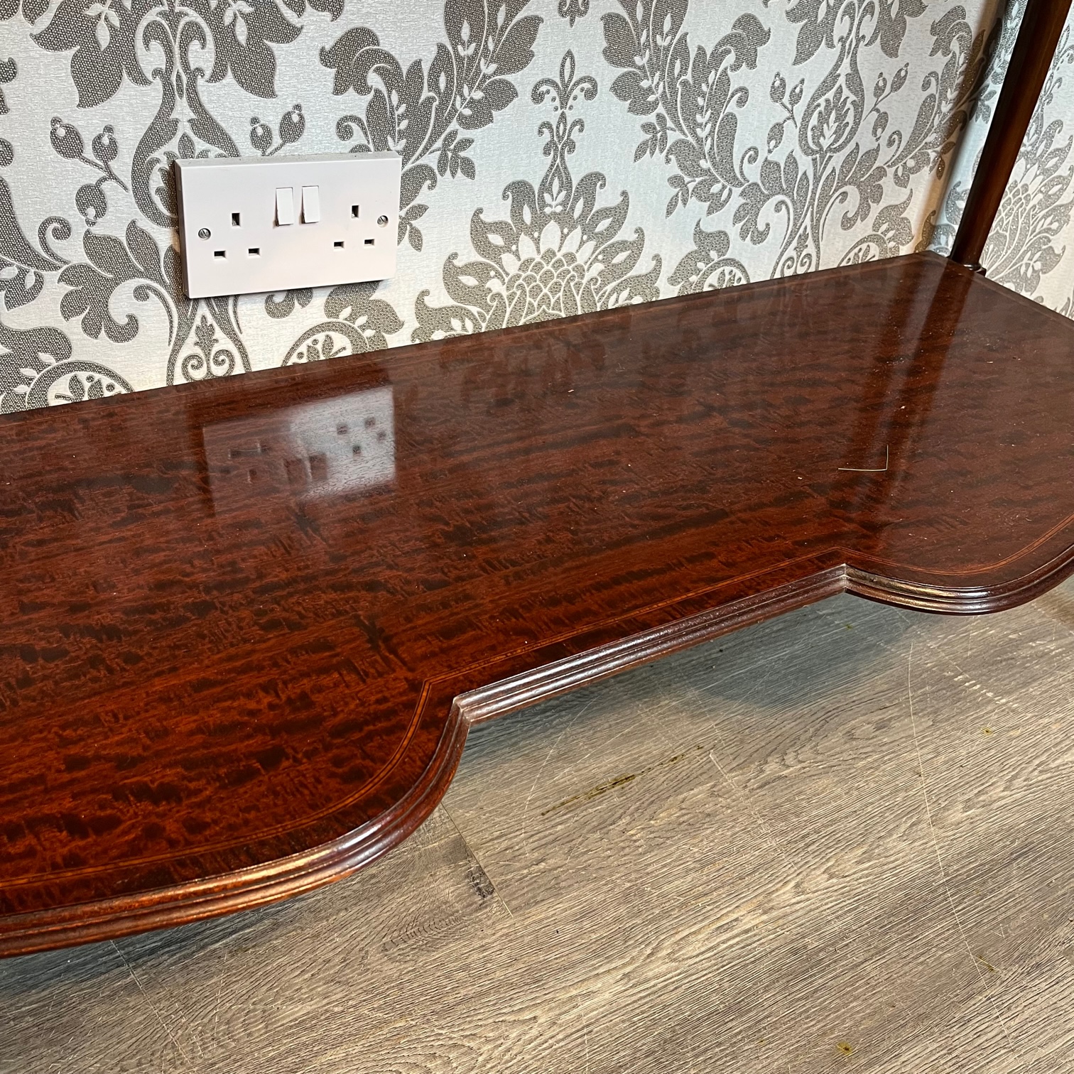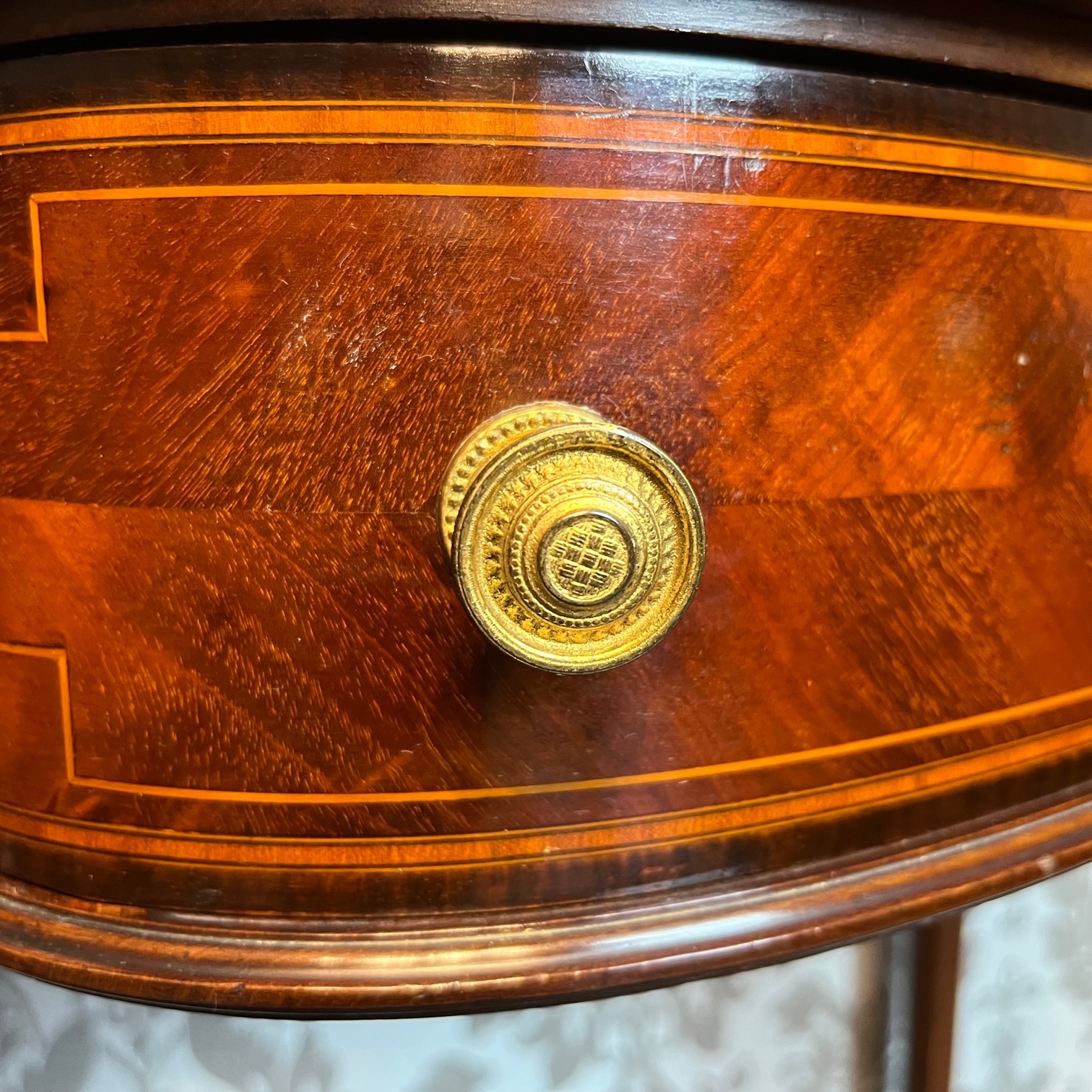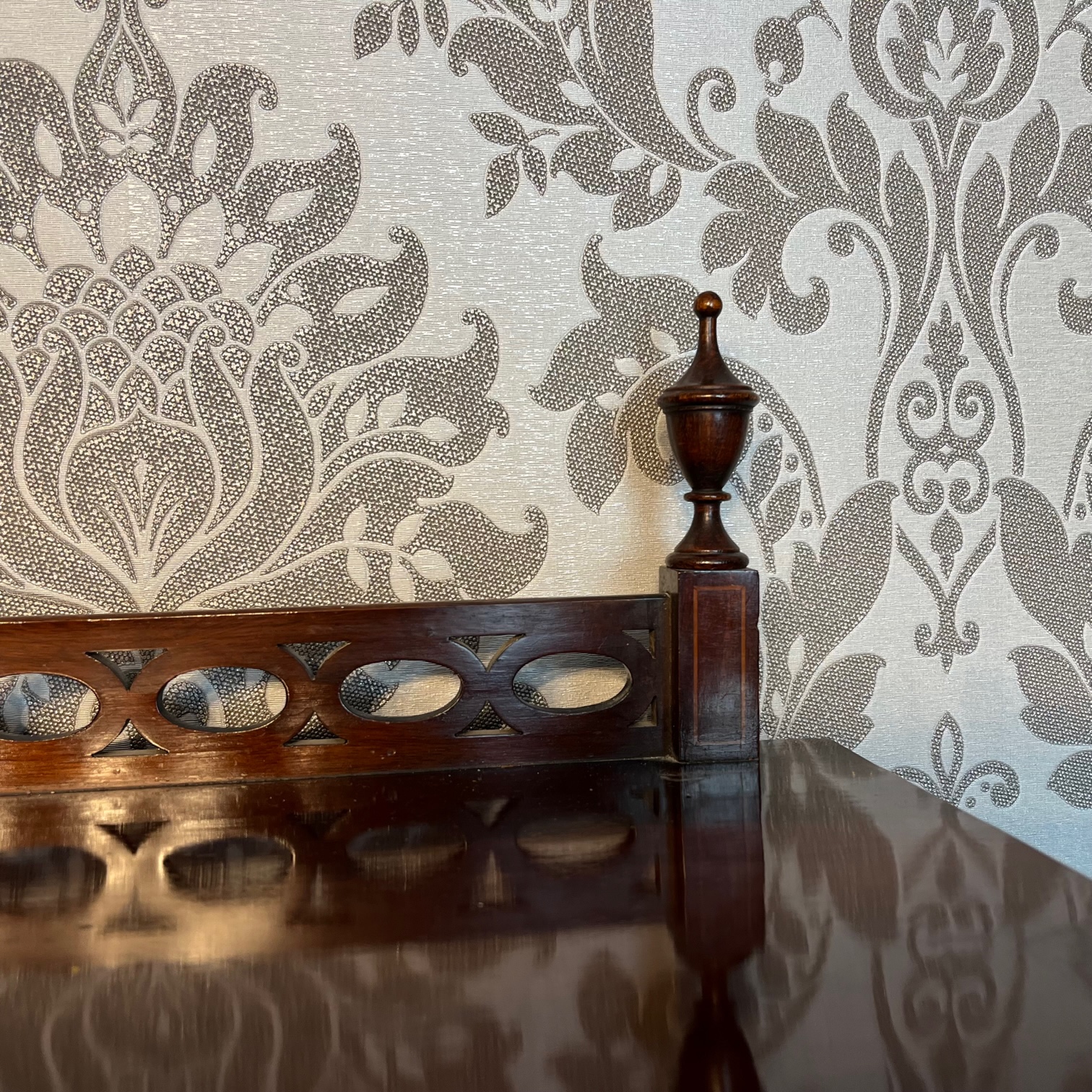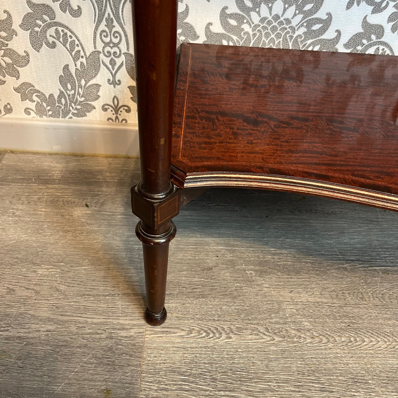 CompareA fine quality Edwardian Period mahogany antique display cabinet. The upper display section having a pierced galley, turned finials, carved crest and central oval bevelled mirror, flanked by serpentine glazed doors with silk lined interiors and shelves and three mahogany lined drawers. The lower stand section of serpentine outline with twin drawers with traditional brass knobs and the whole raised on elegant turned tapering supports, united by a shaped under tier. English circa 1900-1910 probably made by Maple & Co of London