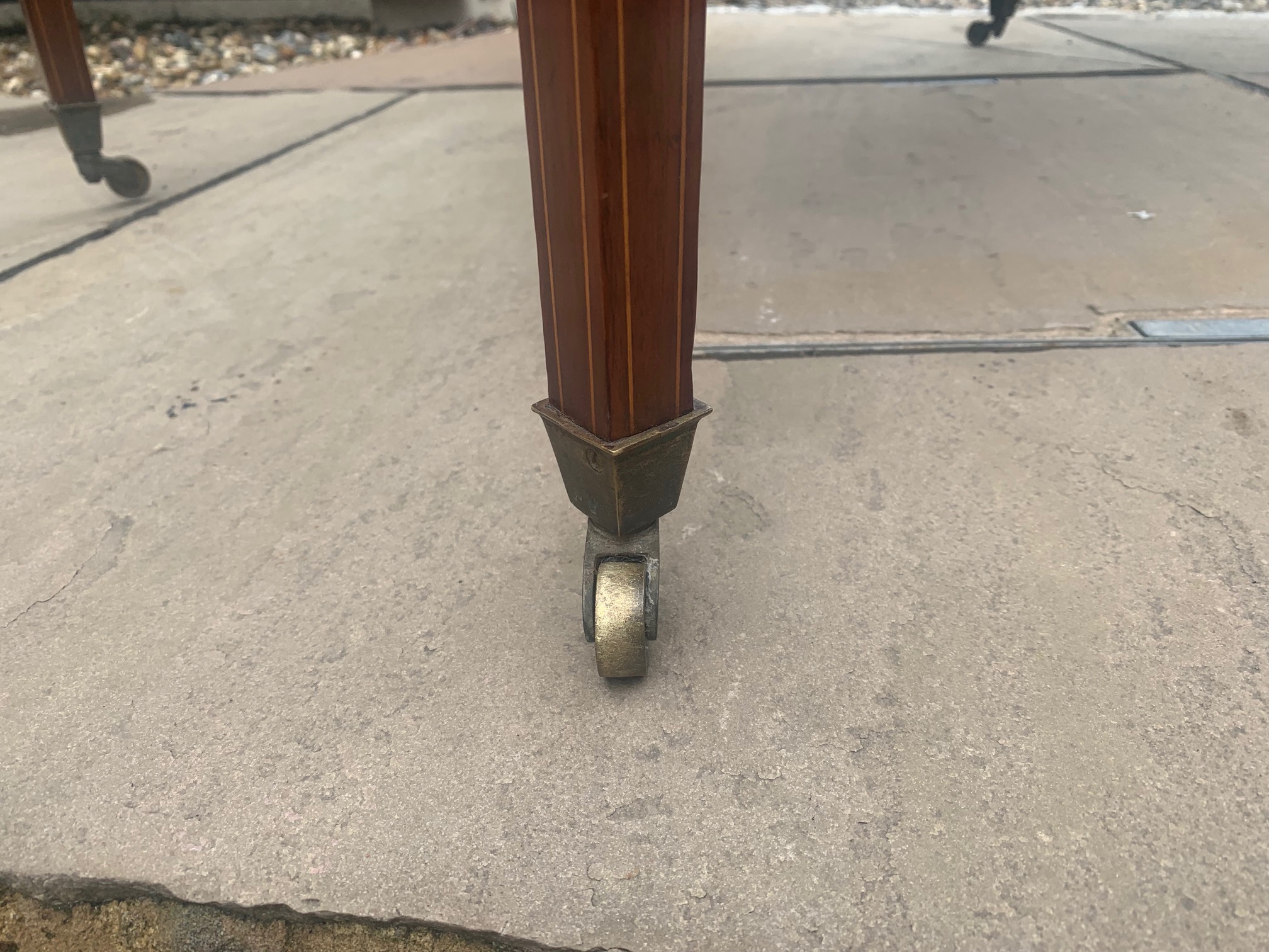 CompareA fine quality Edwardian Period mahogany inlaid writing table by Shoolbred of London. The solid mahogany rectangular top with satinwood cross banding and an inset green leather writing surface and having twin rectangular frieze drawers with fine marquetry inlaid detail with mahogany linings and brass turned drawer pulls. Raised on square tapering supports with brass cup castors. English circa 1900-1910, in excellent condition.