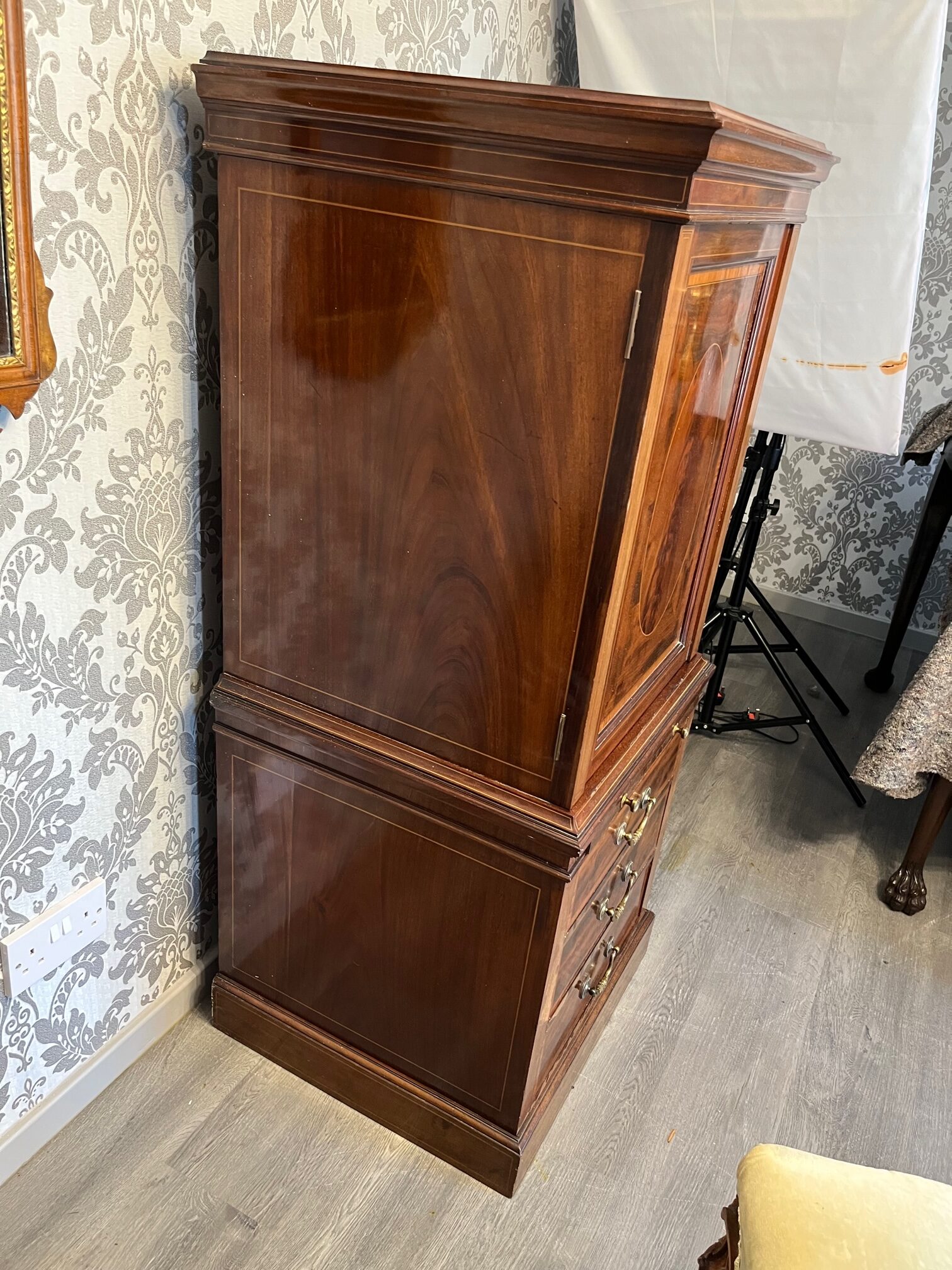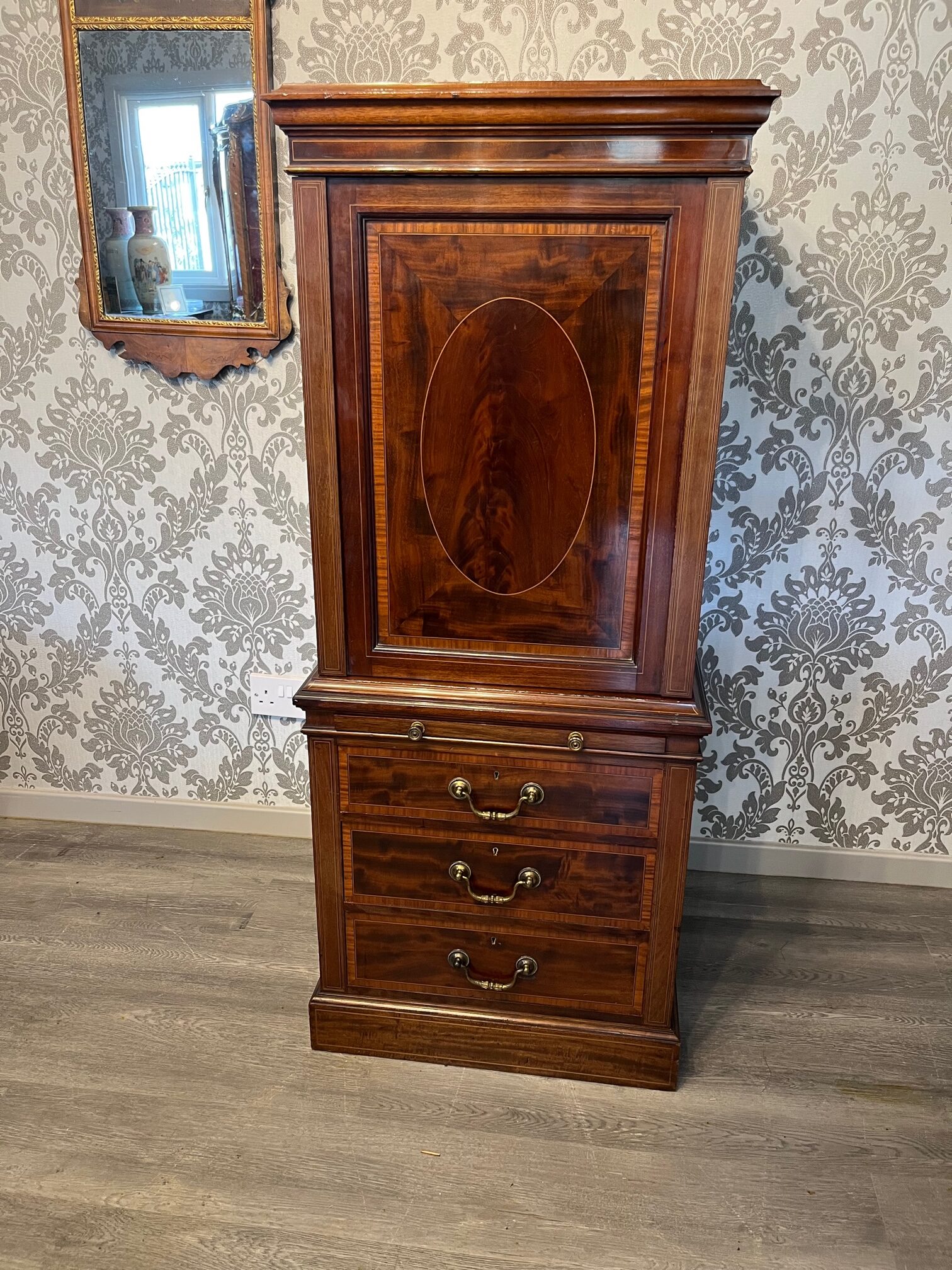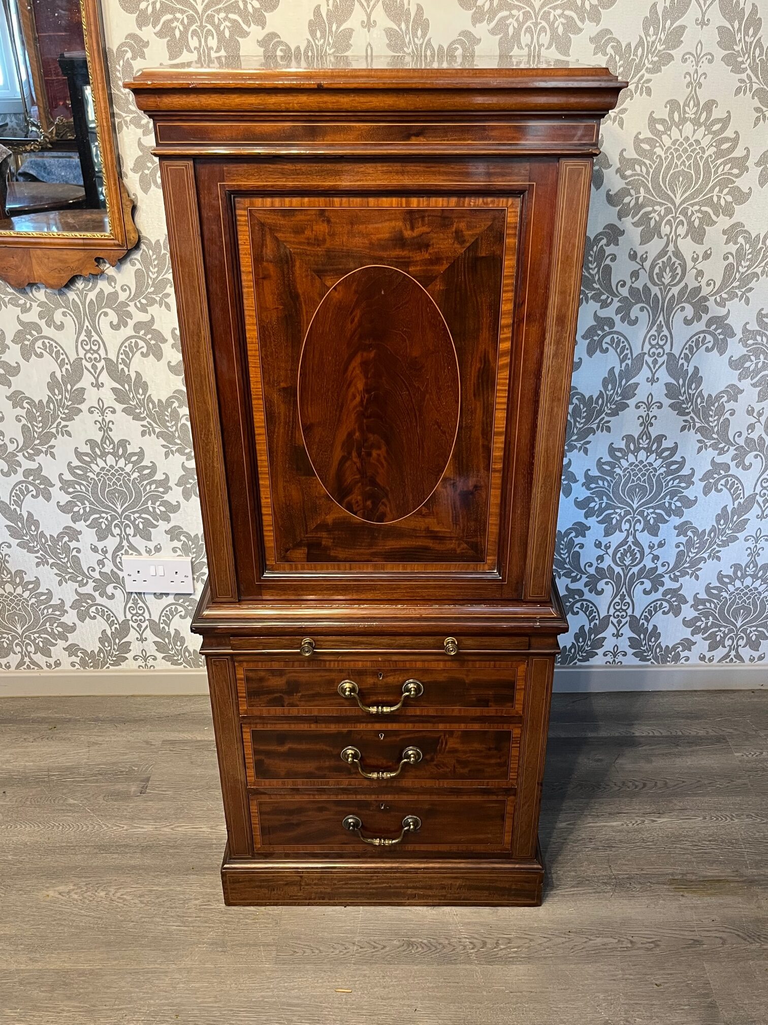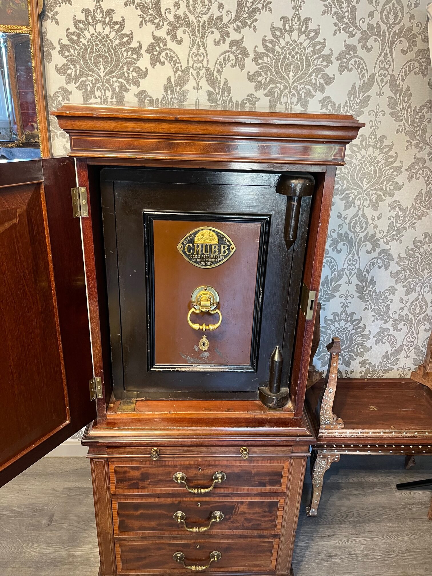 CompareA fine quality Edwardian Period mahogany safe cabinet. The cabinet constructed with the finest mahogany with line inlaid detail, satinwood cross banding and with use of flamed mahogany for the panels and drawer fronts. The central door opening to reveal a high quality integral chub cast iron safe with keys. The safe having a velvet lined jewellery compartment. English circa 1900-1910, in superb original condition. Please not this safe is extremely heavy and would require two man delivery which we can arrange. Please contact us with your postcode for a quote