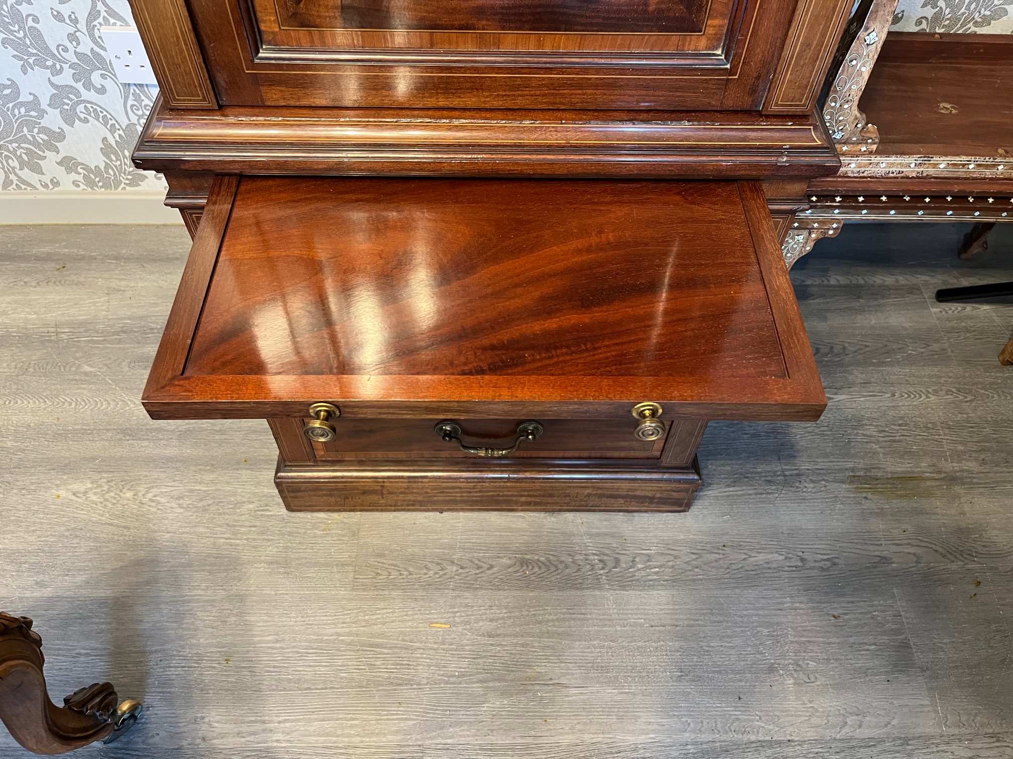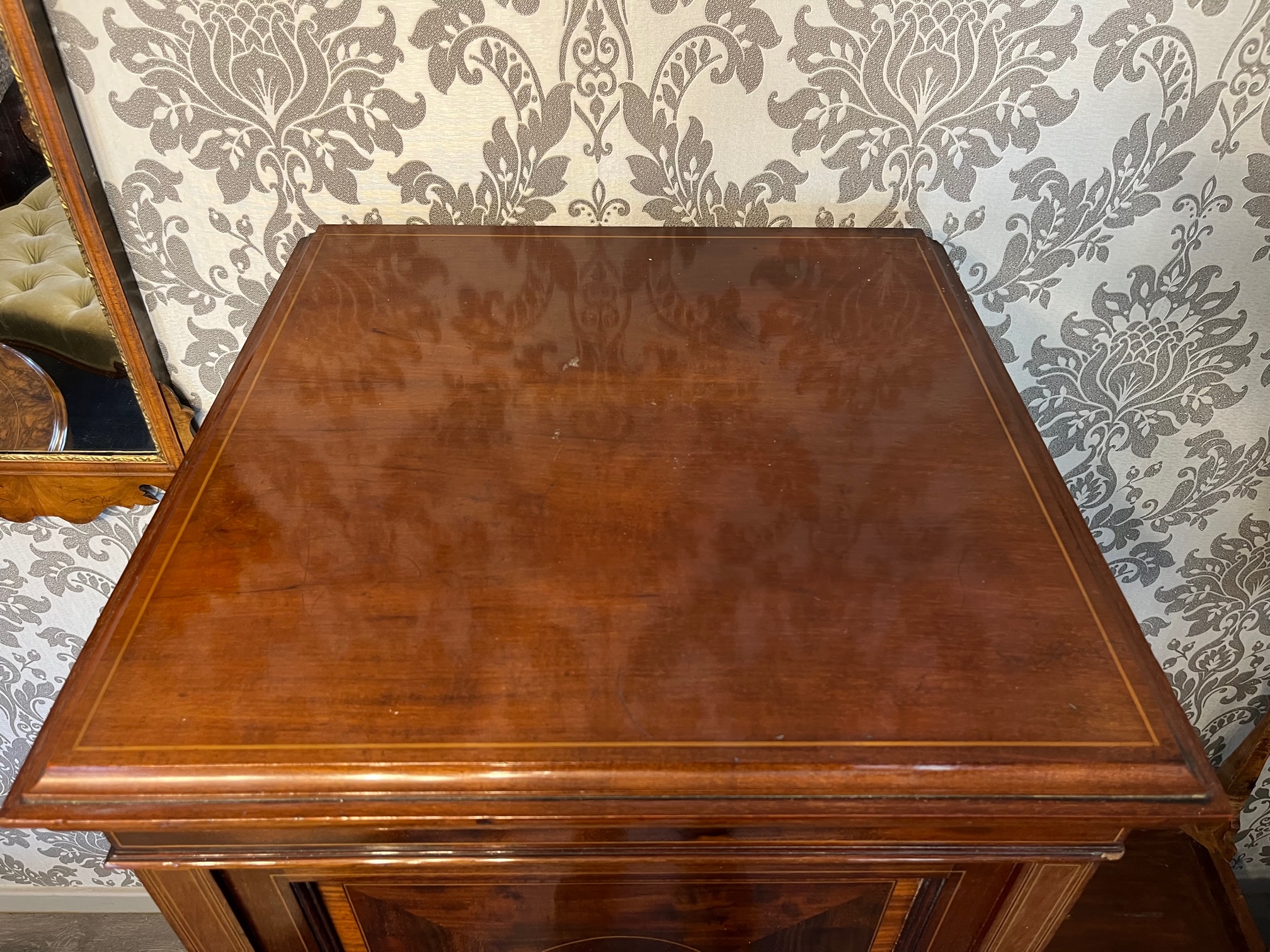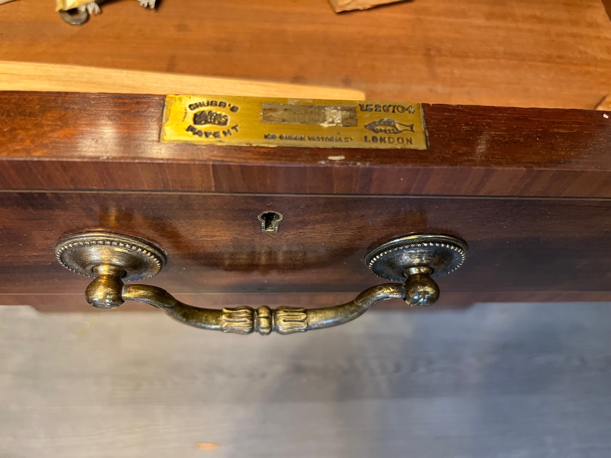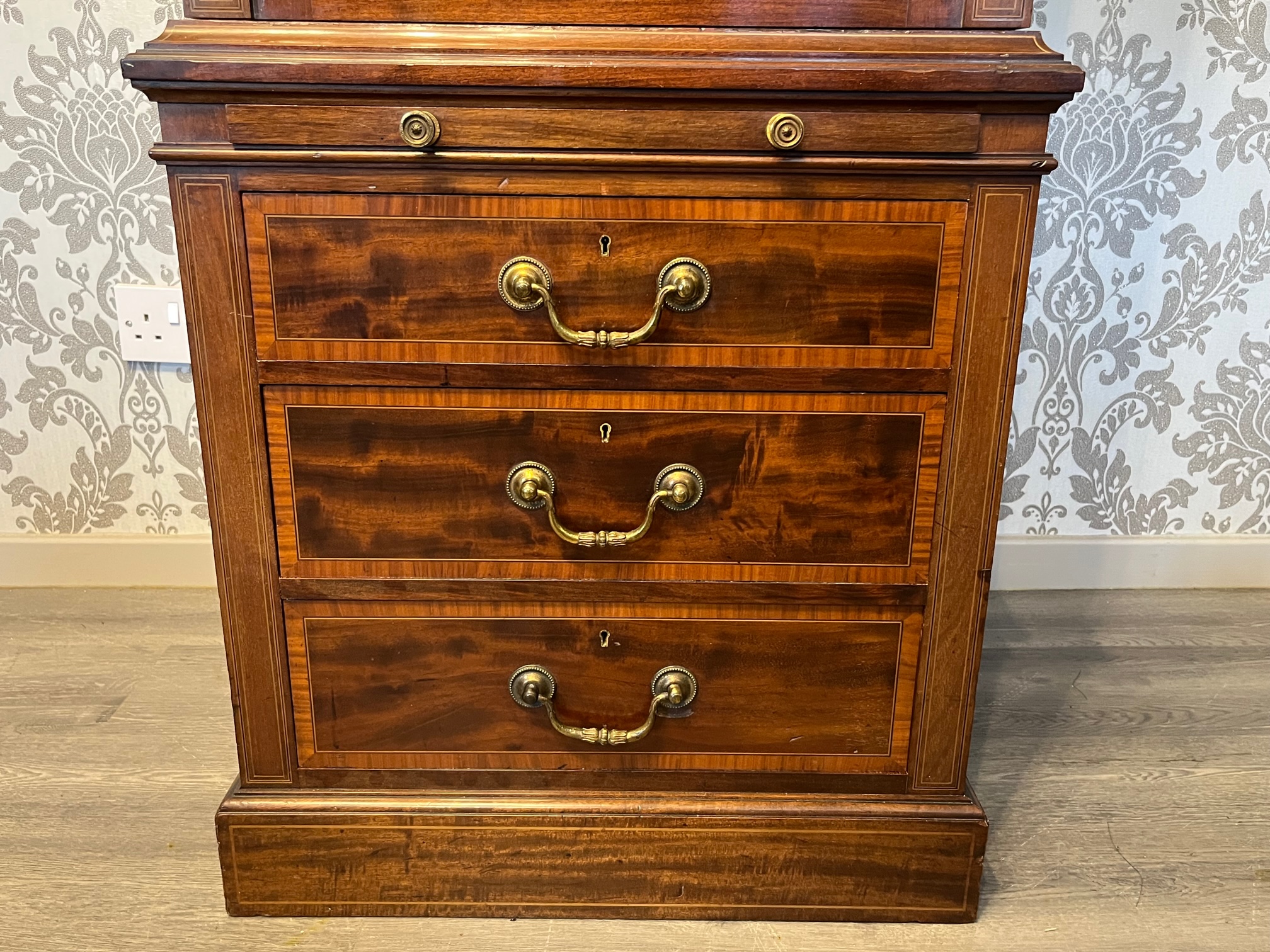 CompareA fine quality Edwardian Period mahogany safe cabinet. The cabinet constructed with the finest mahogany with line inlaid detail, satinwood cross banding and with use of flamed mahogany for the panels and drawer fronts. The central door opening to reveal a high quality integral chub cast iron safe with keys. The safe having a velvet lined jewellery compartment. English circa 1900-1910, in superb original condition. Please not this safe is extremely heavy and would require two man delivery which we can arrange. Please contact us with your postcode for a quote