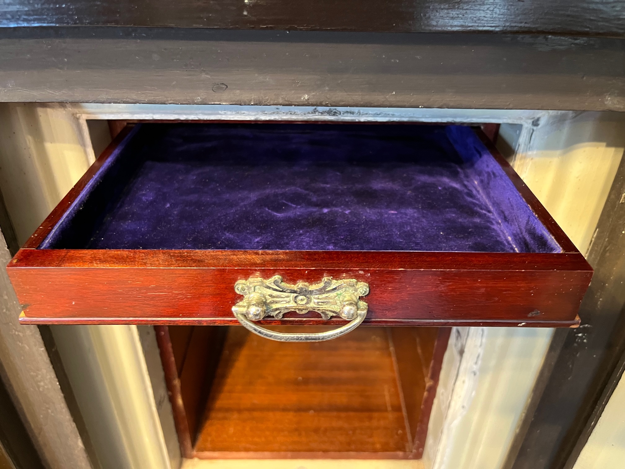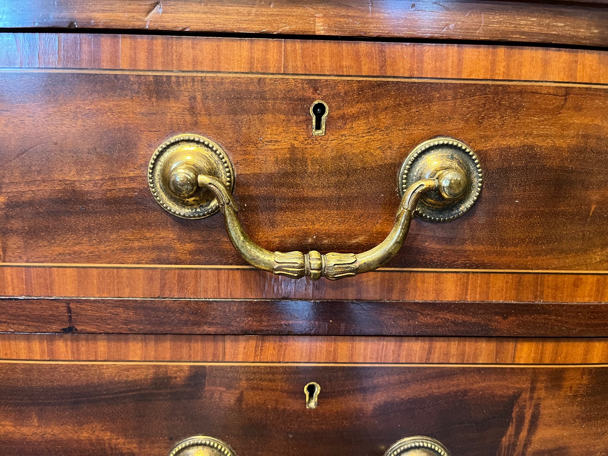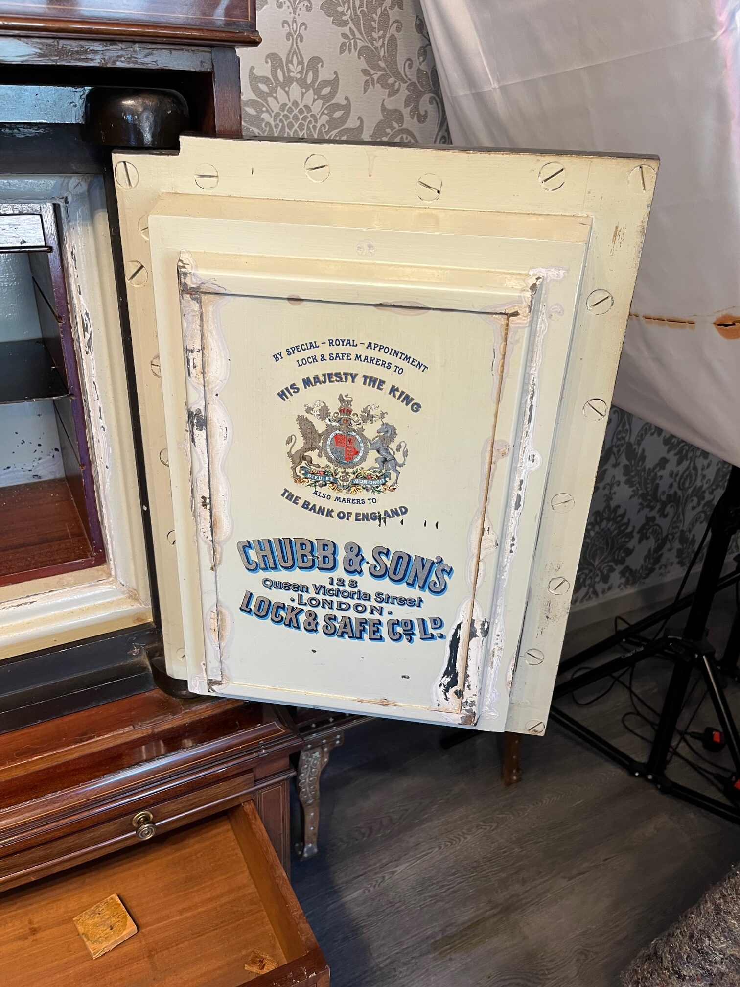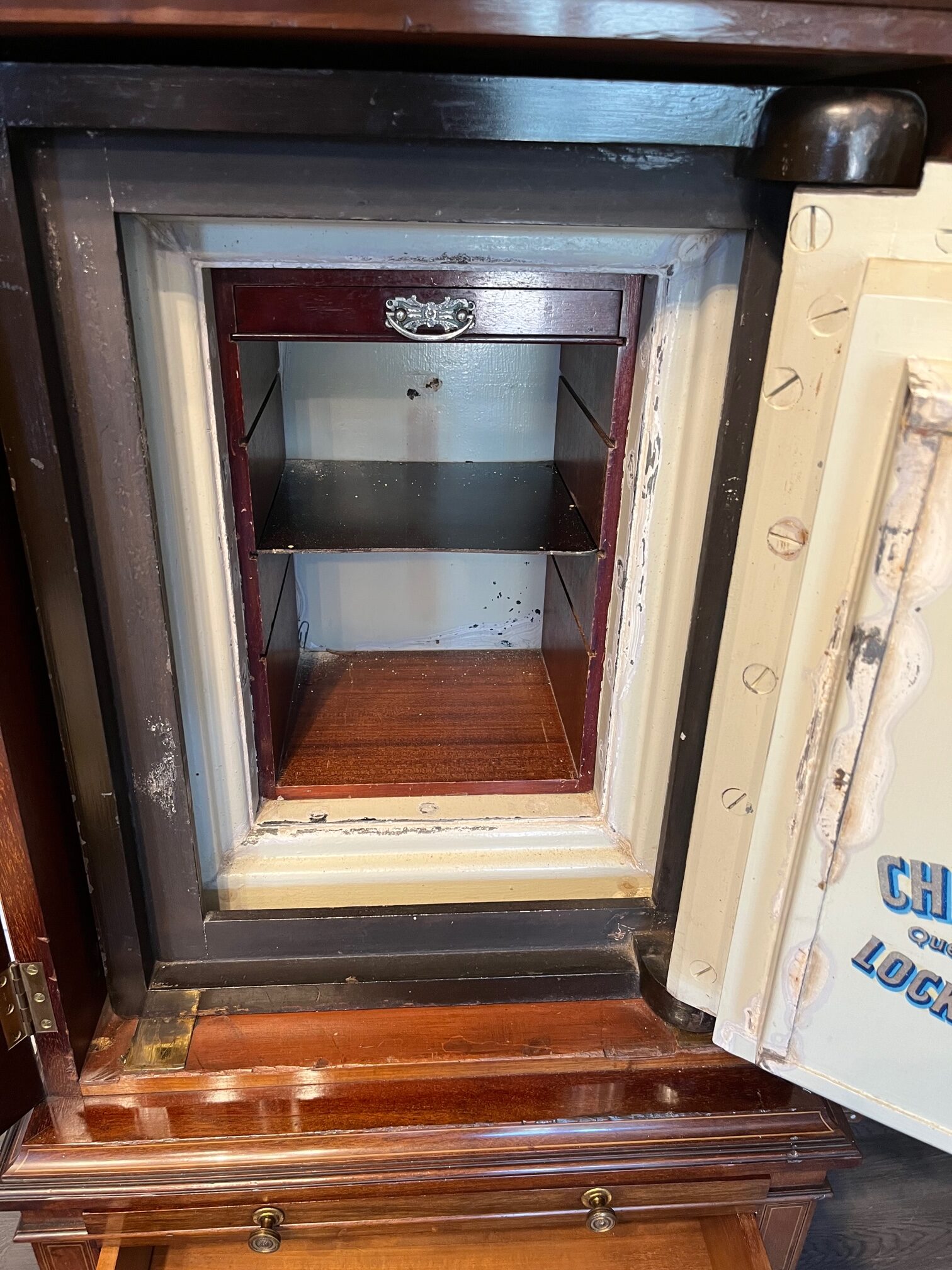 CompareA fine quality Edwardian Period mahogany safe cabinet. The cabinet constructed with the finest mahogany with line inlaid detail, satinwood cross banding and with use of flamed mahogany for the panels and drawer fronts. The central door opening to reveal a high quality integral chub cast iron safe with keys. The safe having a velvet lined jewellery compartment. English circa 1900-1910, in superb original condition. Please not this safe is extremely heavy and would require two man delivery which we can arrange. Please contact us with your postcode for a quote