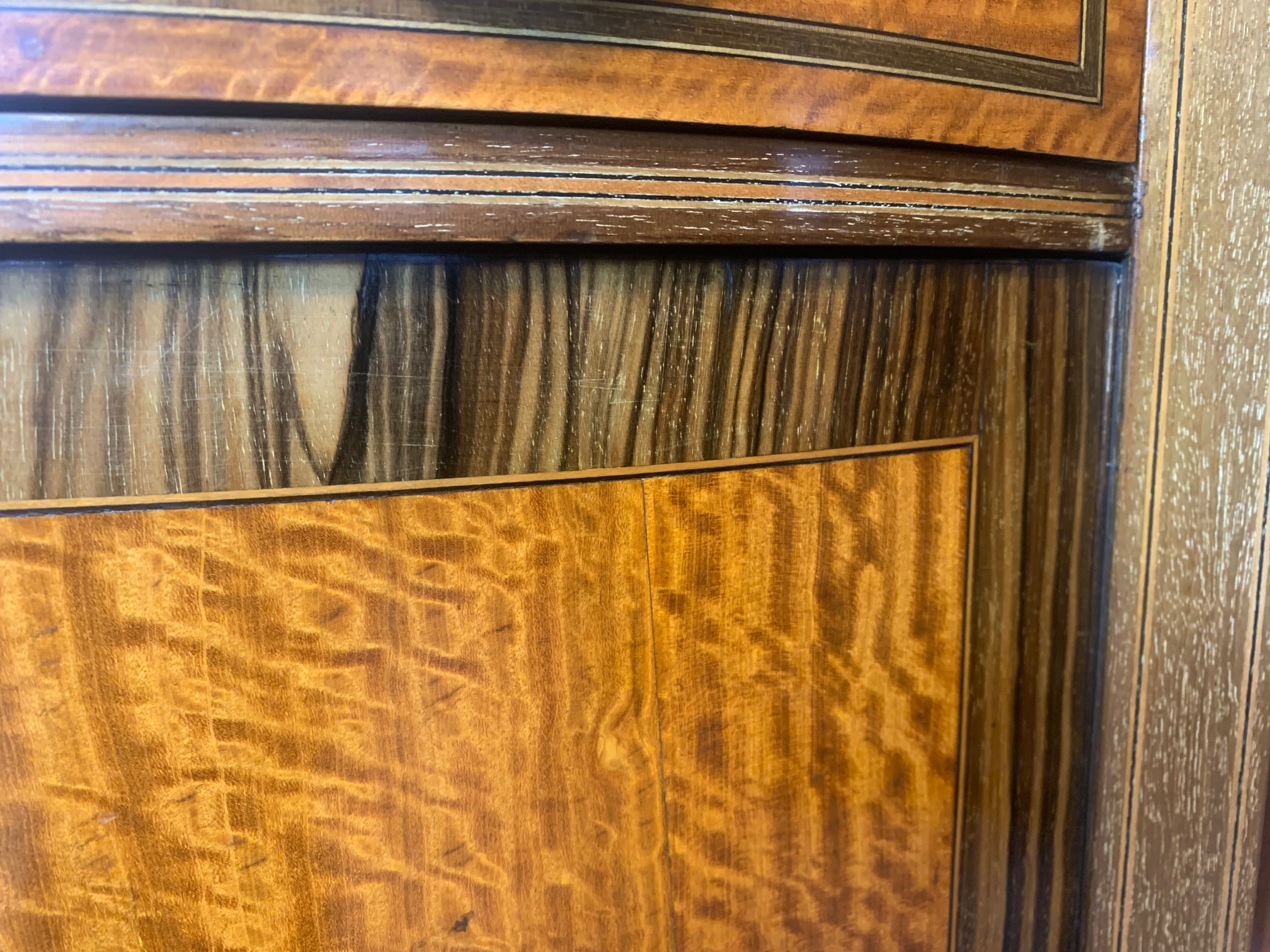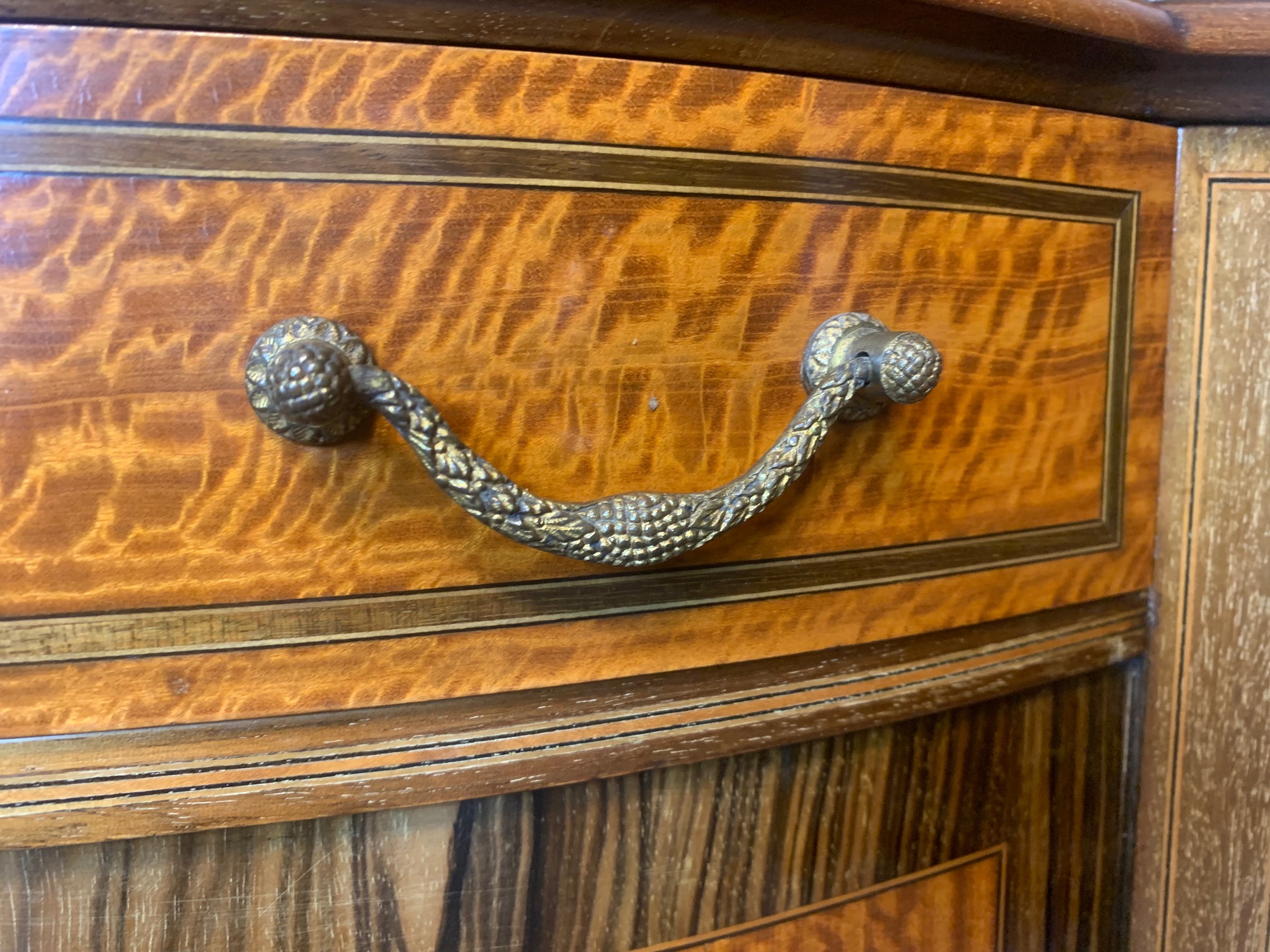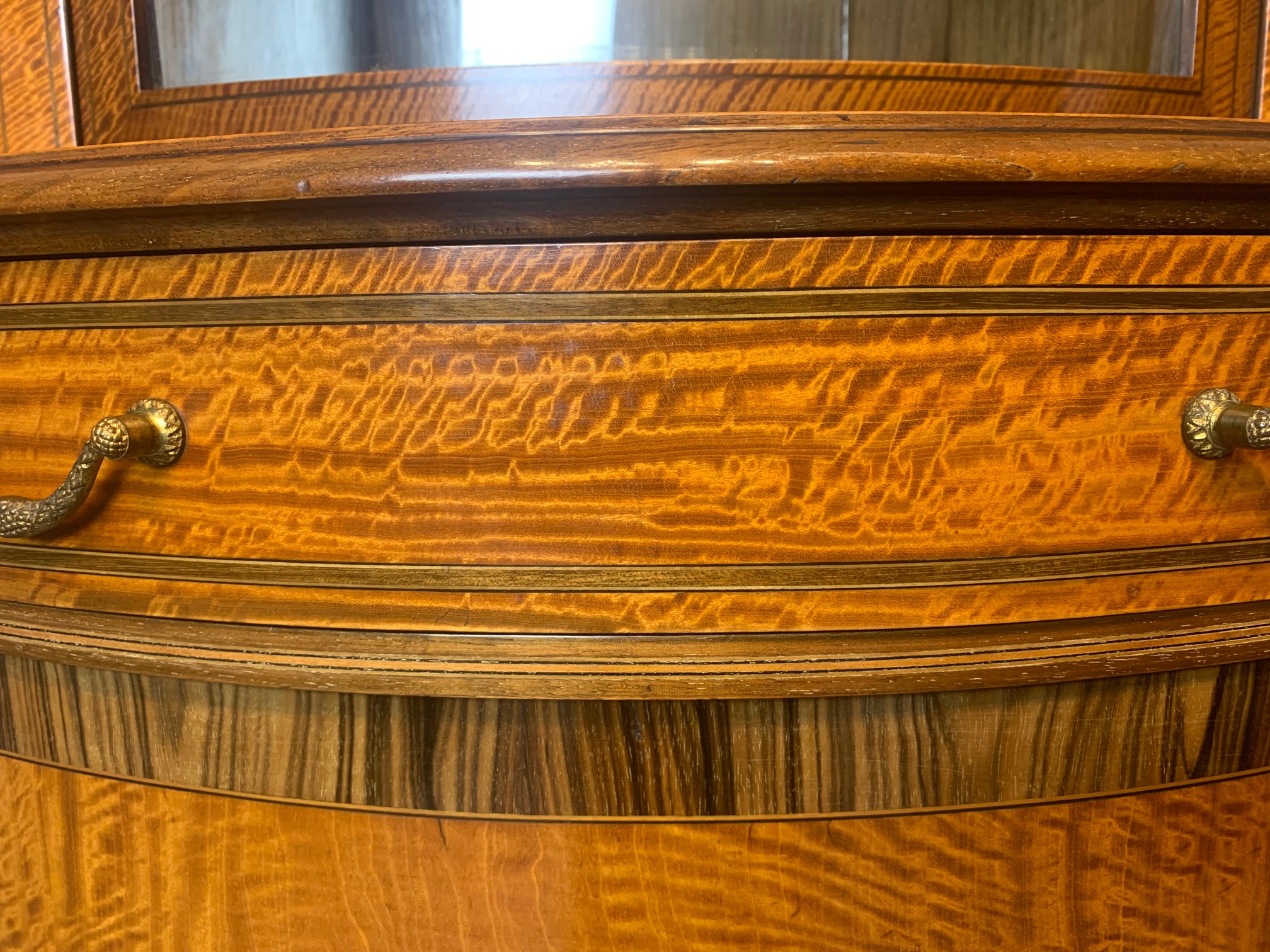 CompareA fine quality Edwardian Period satinwood serpentine display cabinet. The upper section of serpentine outline having a moulded cornice with dentil detail, above a central bow front glazed door enclosing two serpentine shelves with concave and glazed end panels.The lower section again of serpentine outline having a central mahogany lined drawer and cupboard with a plum pudding mahogany panel and banded in coromandel, with concave end panels. The whole raised on square tapering supports with spade feet. English circa 1900-1910, in superb original condition. Probably made by Edwards and Roberts or Maple & Co London