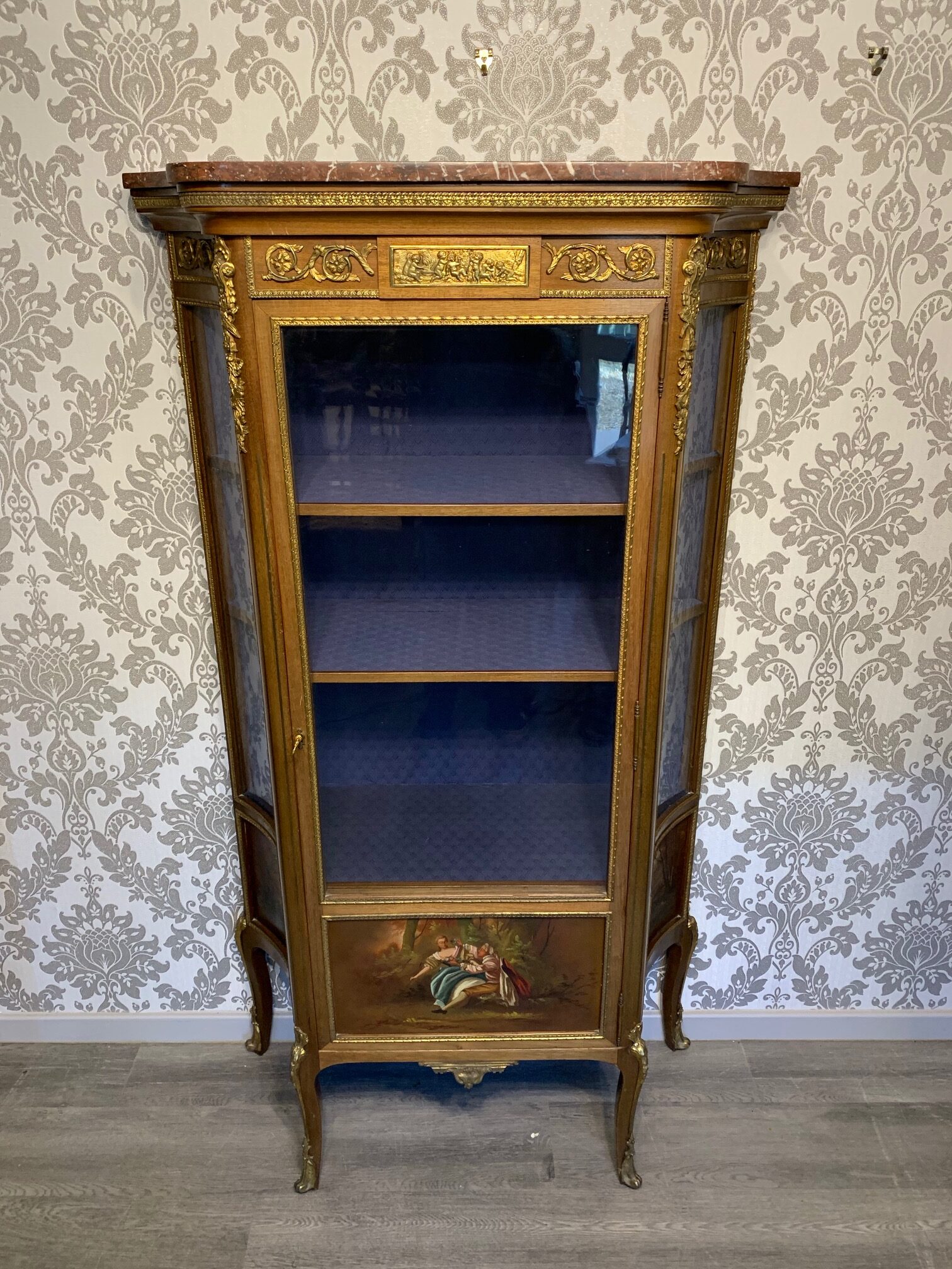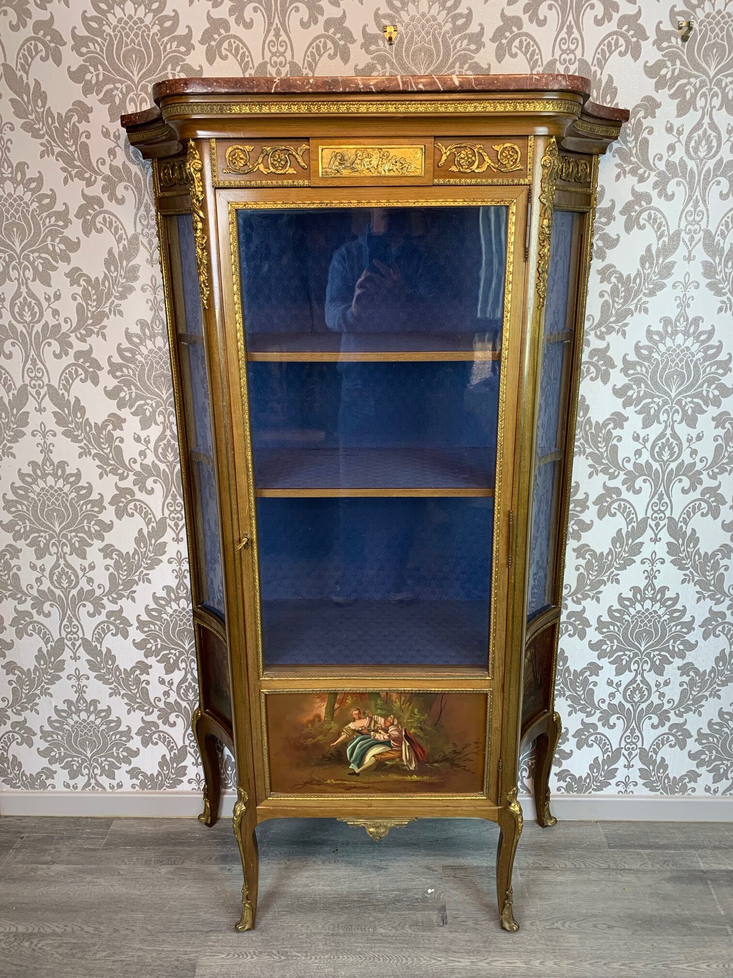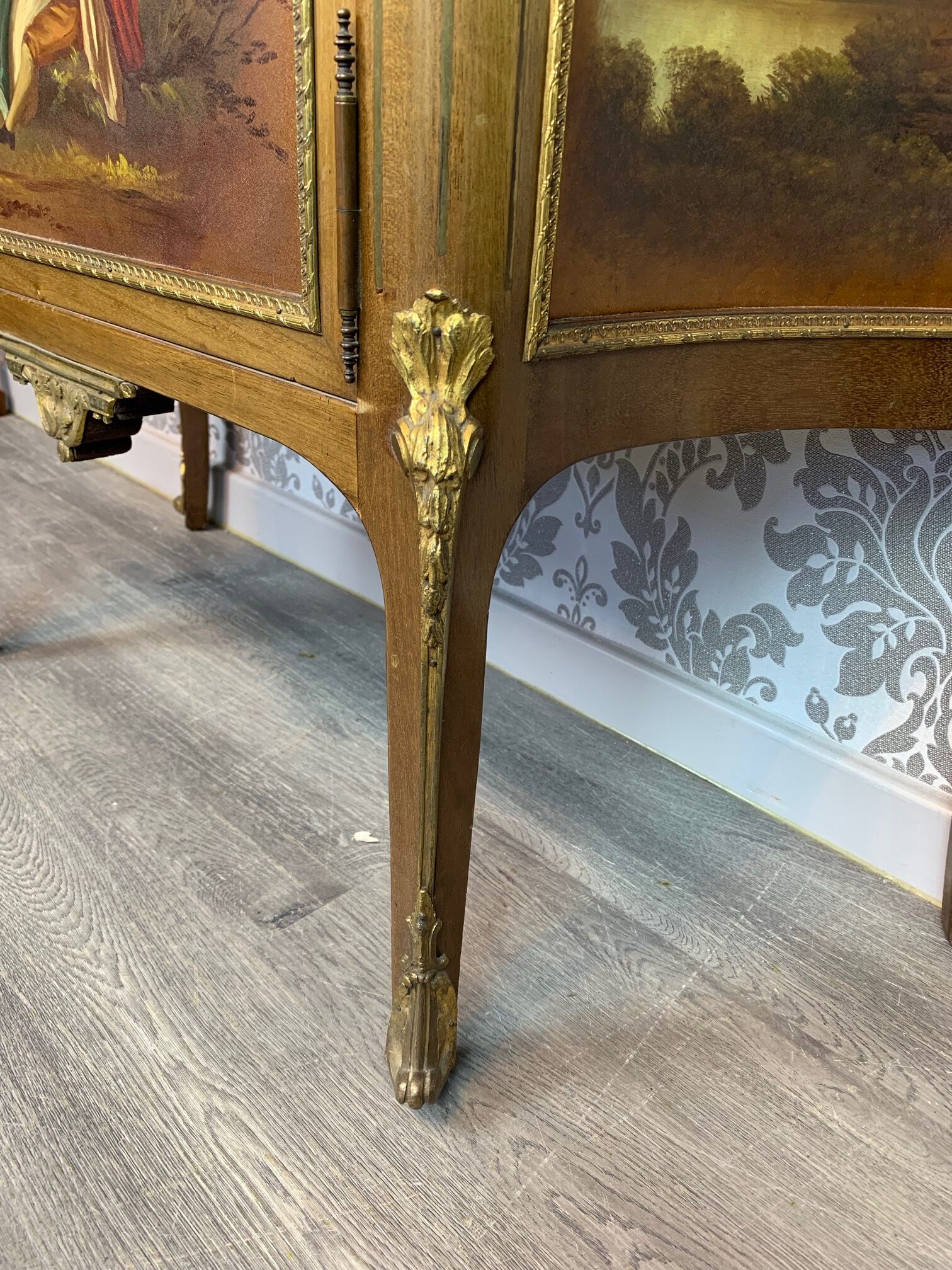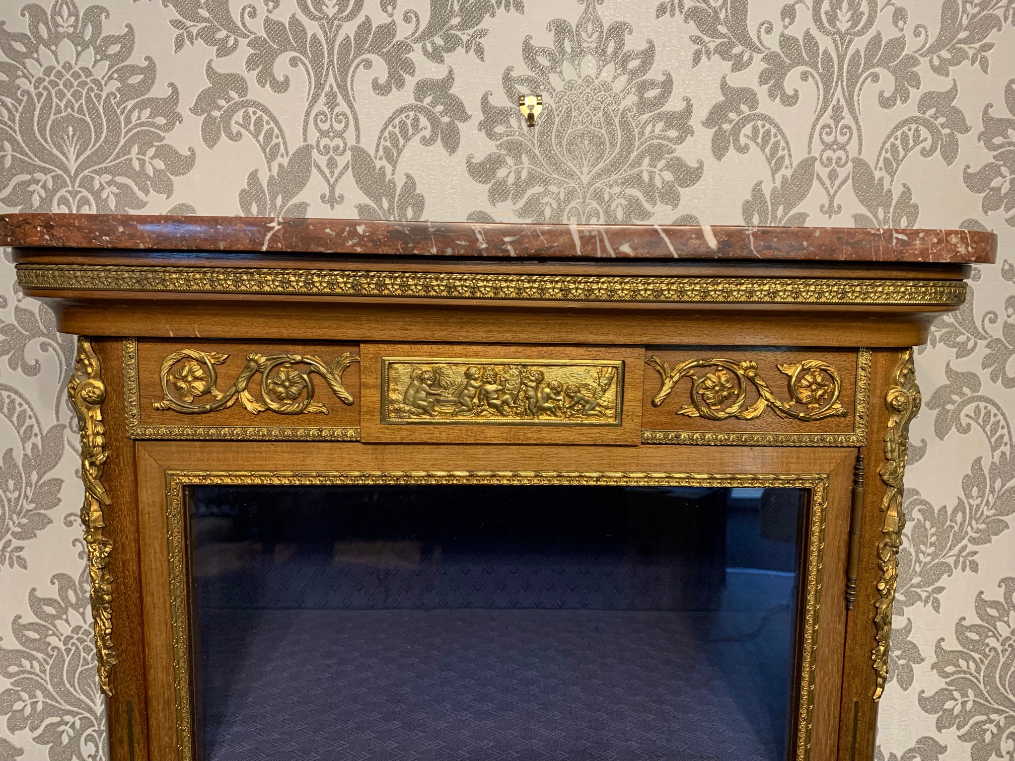 CompareA Fine quality French mahogany, ormolu mounted and brass inlaid vitrine. Having a rouge marble serpentine top above an ormolu mounted frieze, the central panel depicting cherubs at play. The central glazed door opening to reveal a silk lined and shelved interior. The cabinet having three well painted Vernis Martin panels and raised on elegant ormolu mounted cabriole supports. French circa 1900, in excellent Original condition
