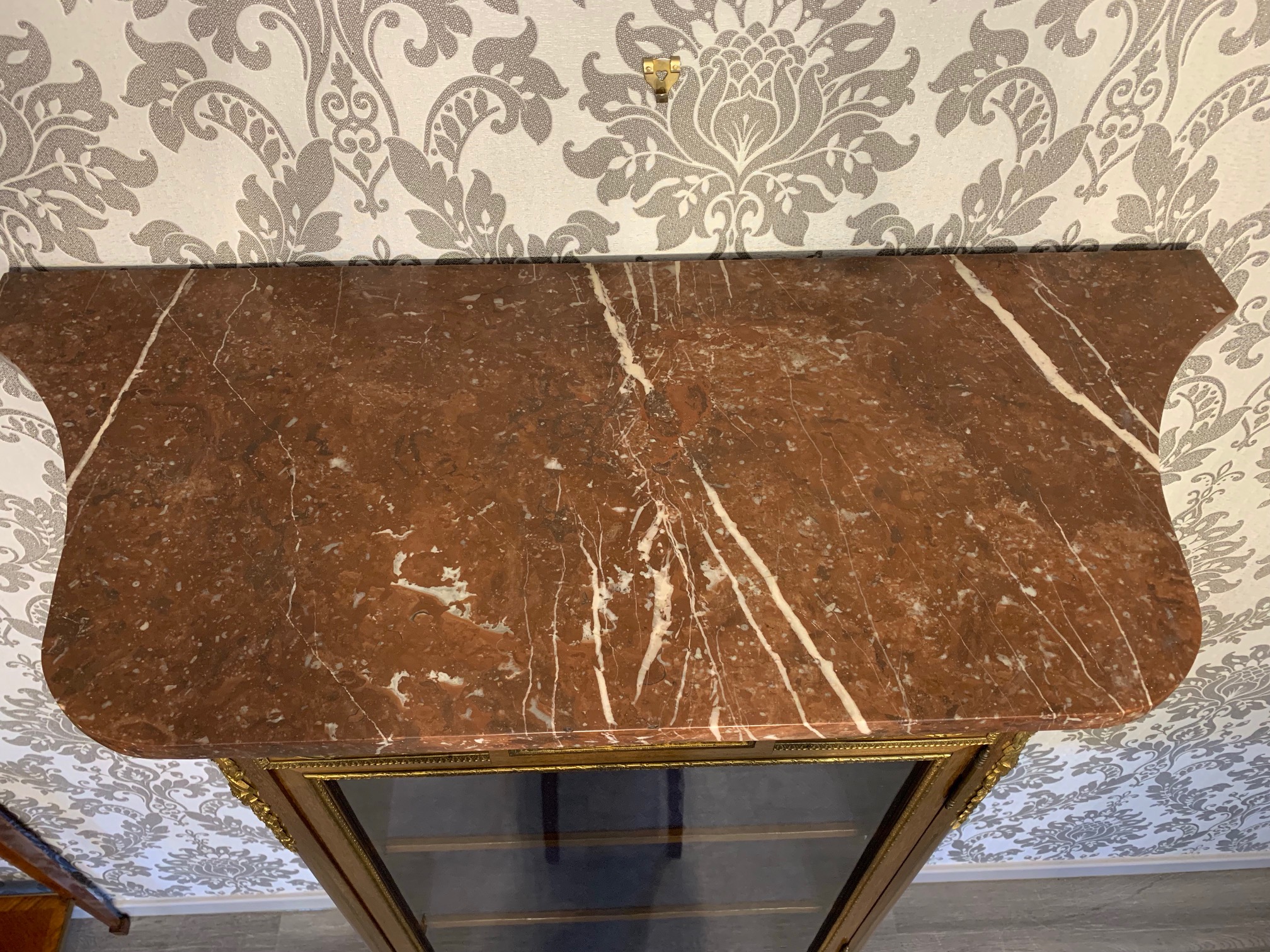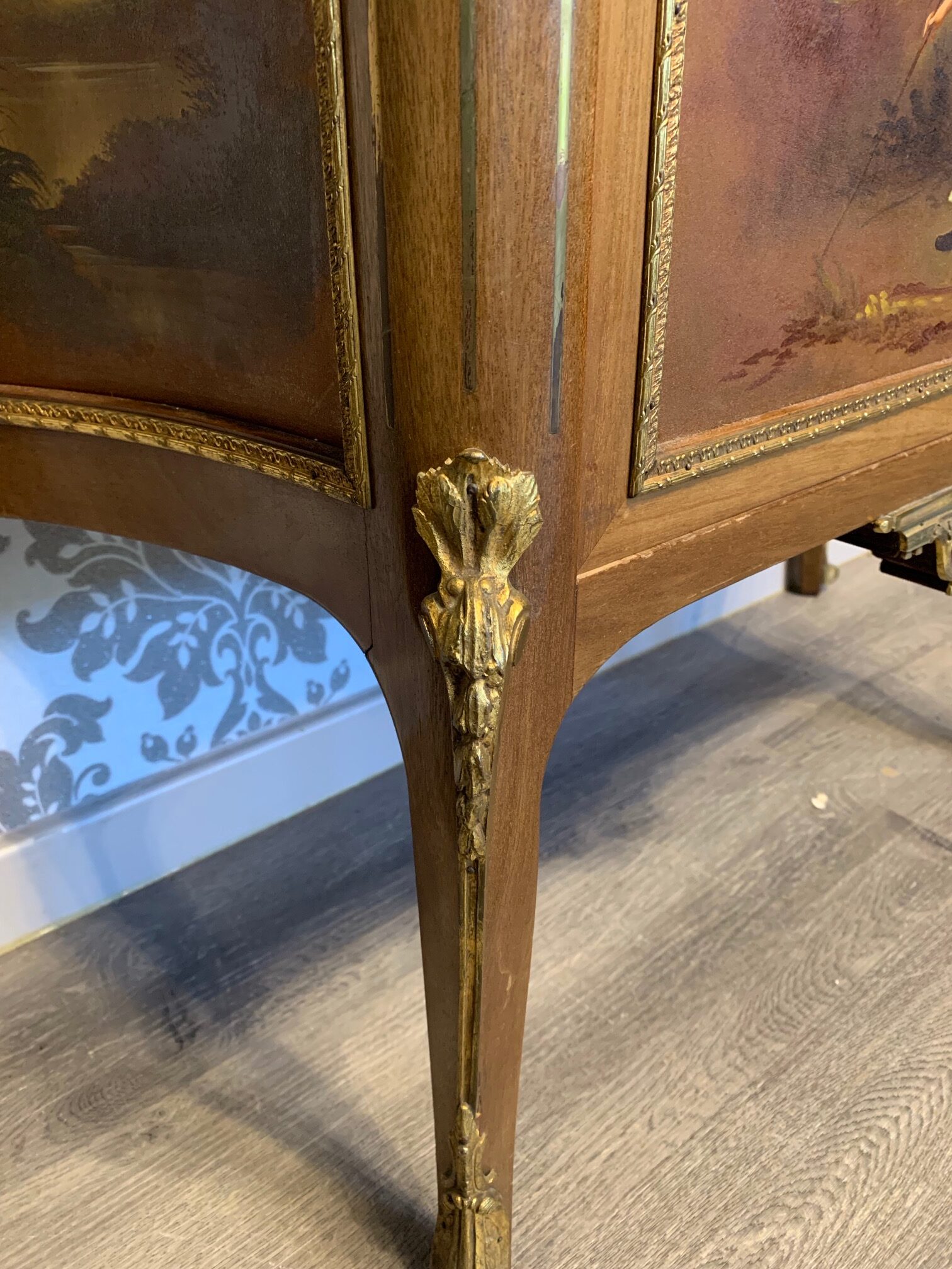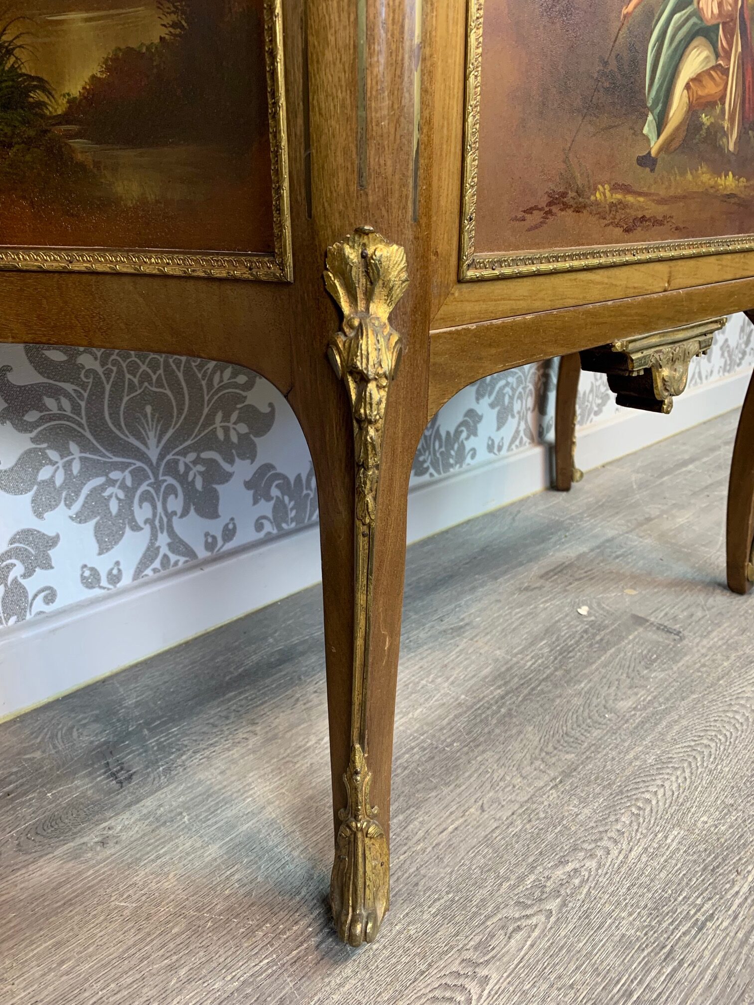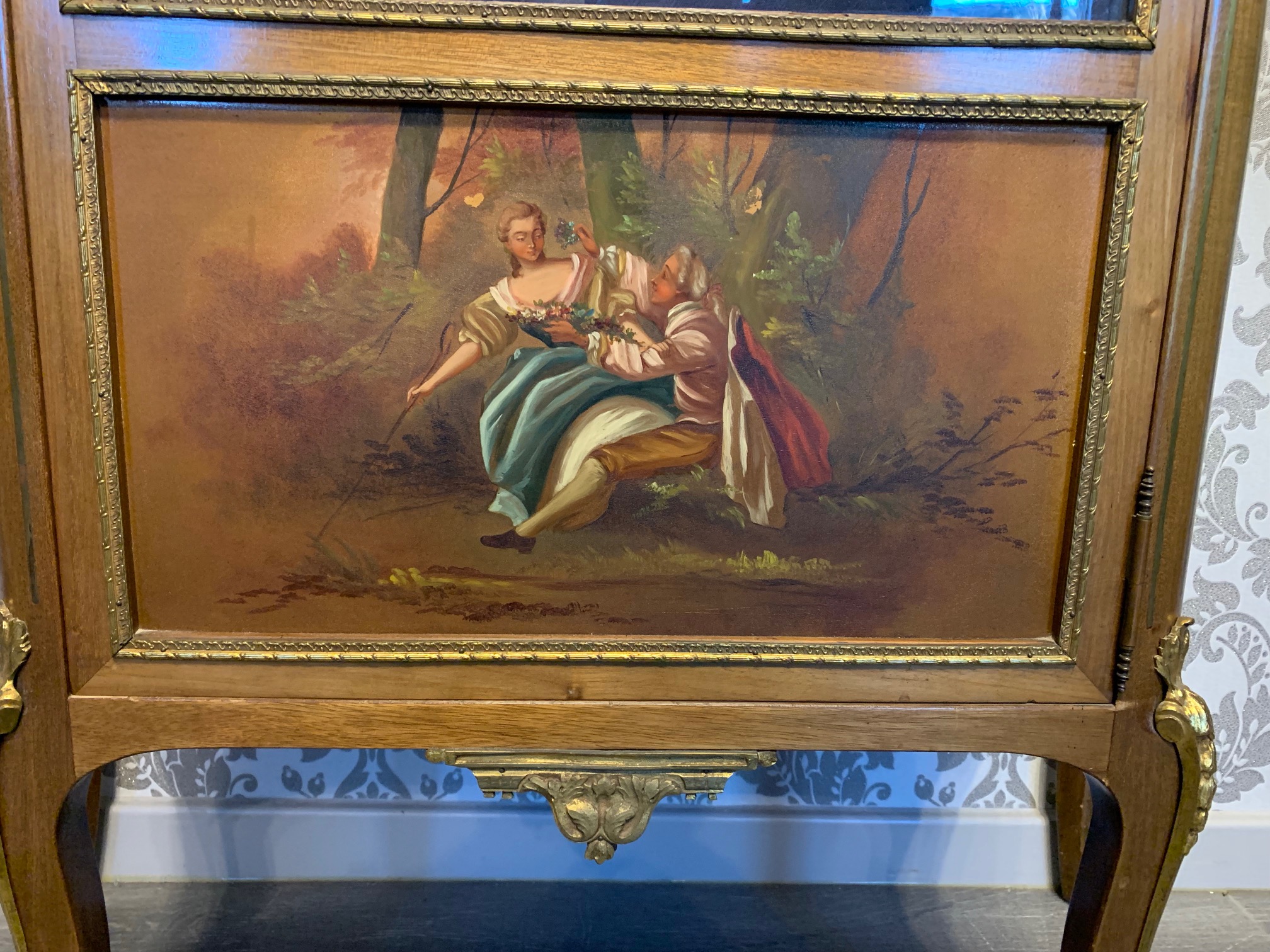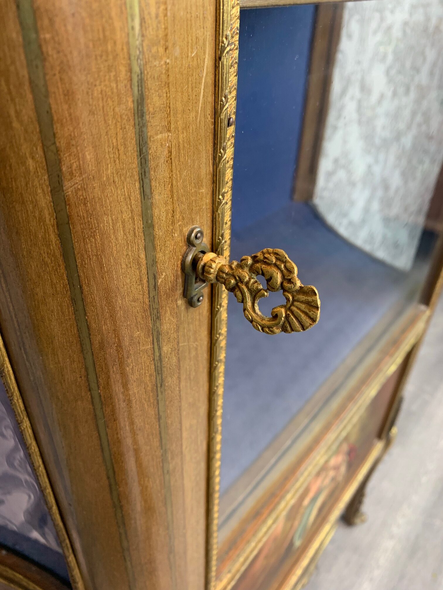CompareA Fine quality French mahogany, ormolu mounted and brass inlaid vitrine. Having a rouge marble serpentine top above an ormolu mounted frieze, the central panel depicting cherubs at play. The central glazed door opening to reveal a silk lined and shelved interior. The cabinet having three well painted Vernis Martin panels and raised on elegant ormolu mounted cabriole supports. French circa 1900, in excellent Original condition