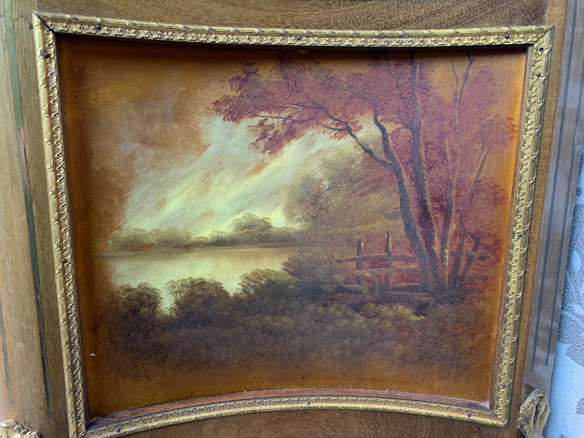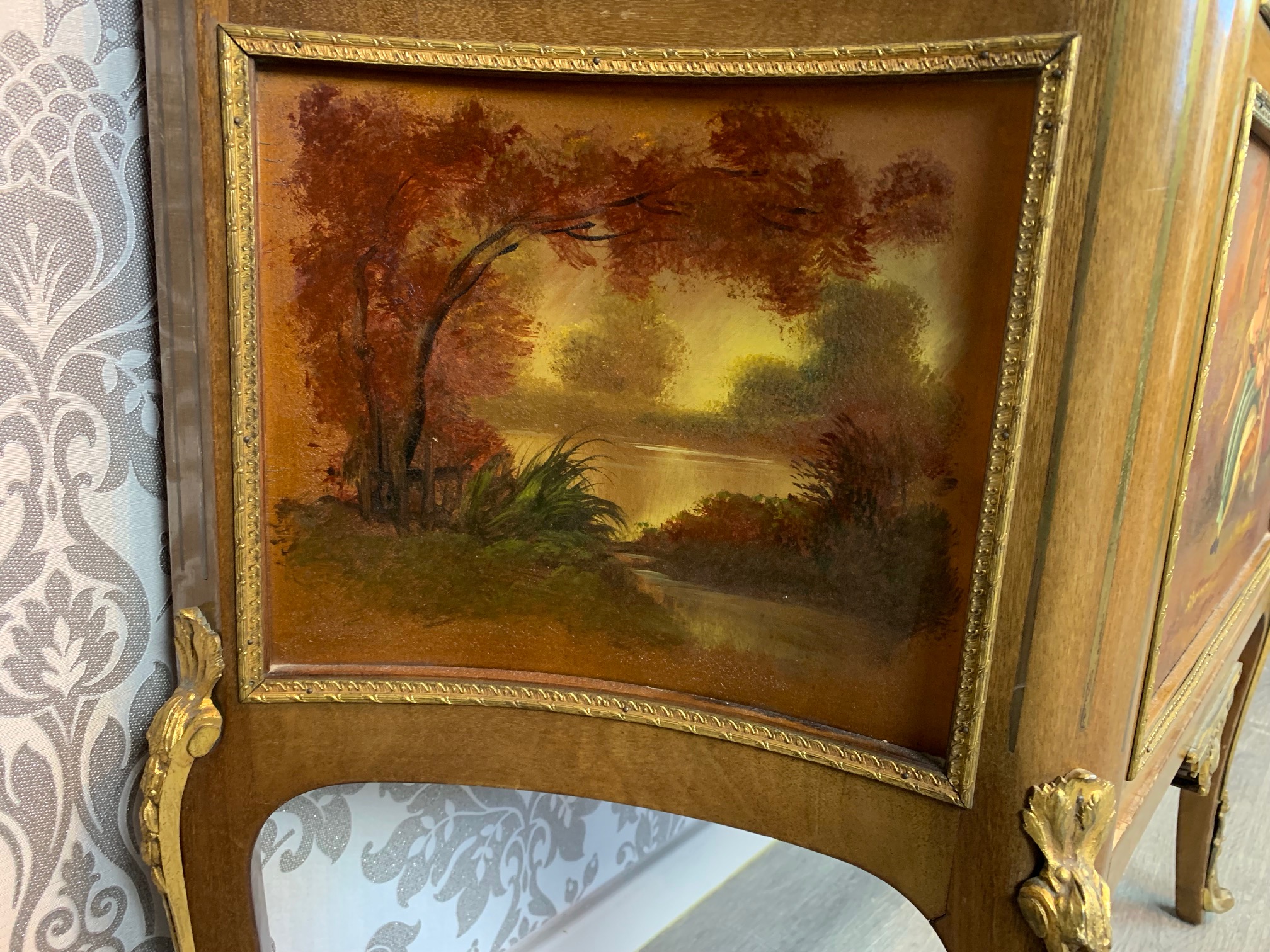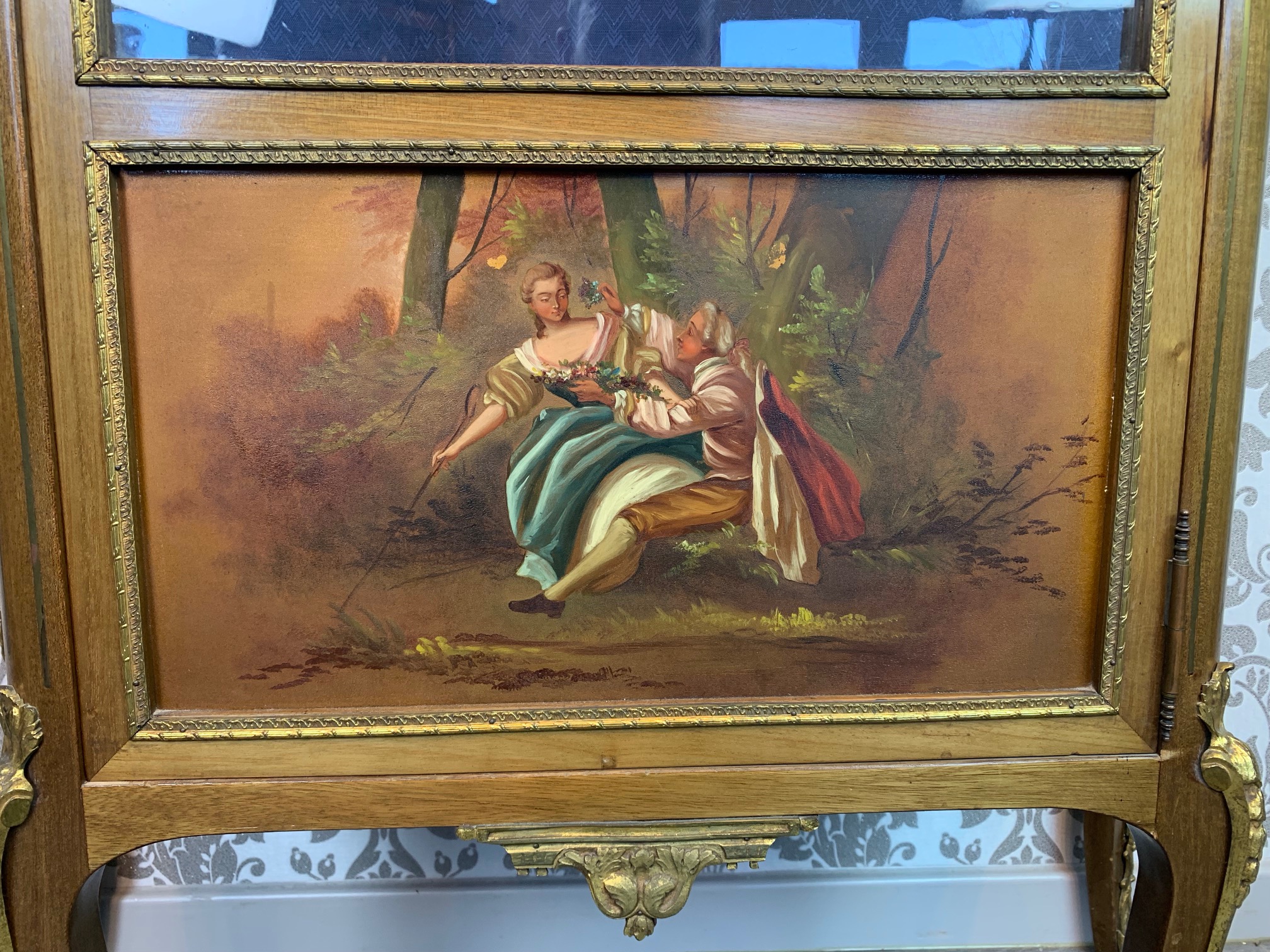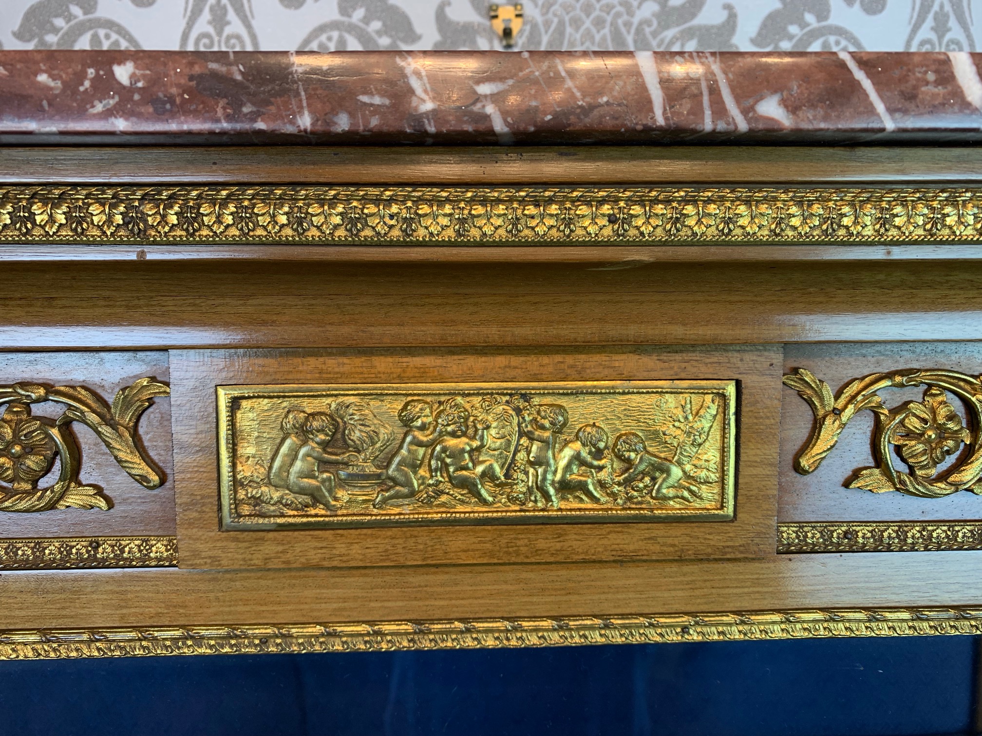 CompareA Fine quality French mahogany, ormolu mounted and brass inlaid vitrine. Having a rouge marble serpentine top above an ormolu mounted frieze, the central panel depicting cherubs at play. The central glazed door opening to reveal a silk lined and shelved interior. The cabinet having three well painted Vernis Martin panels and raised on elegant ormolu mounted cabriole supports. French circa 1900, in excellent Original condition