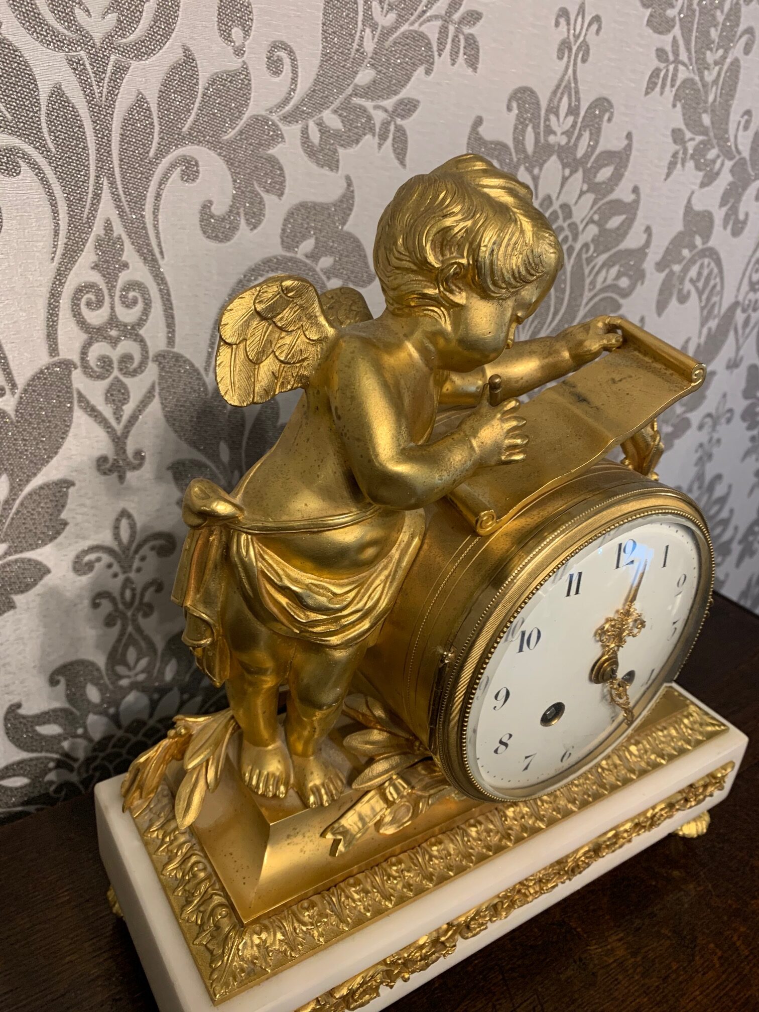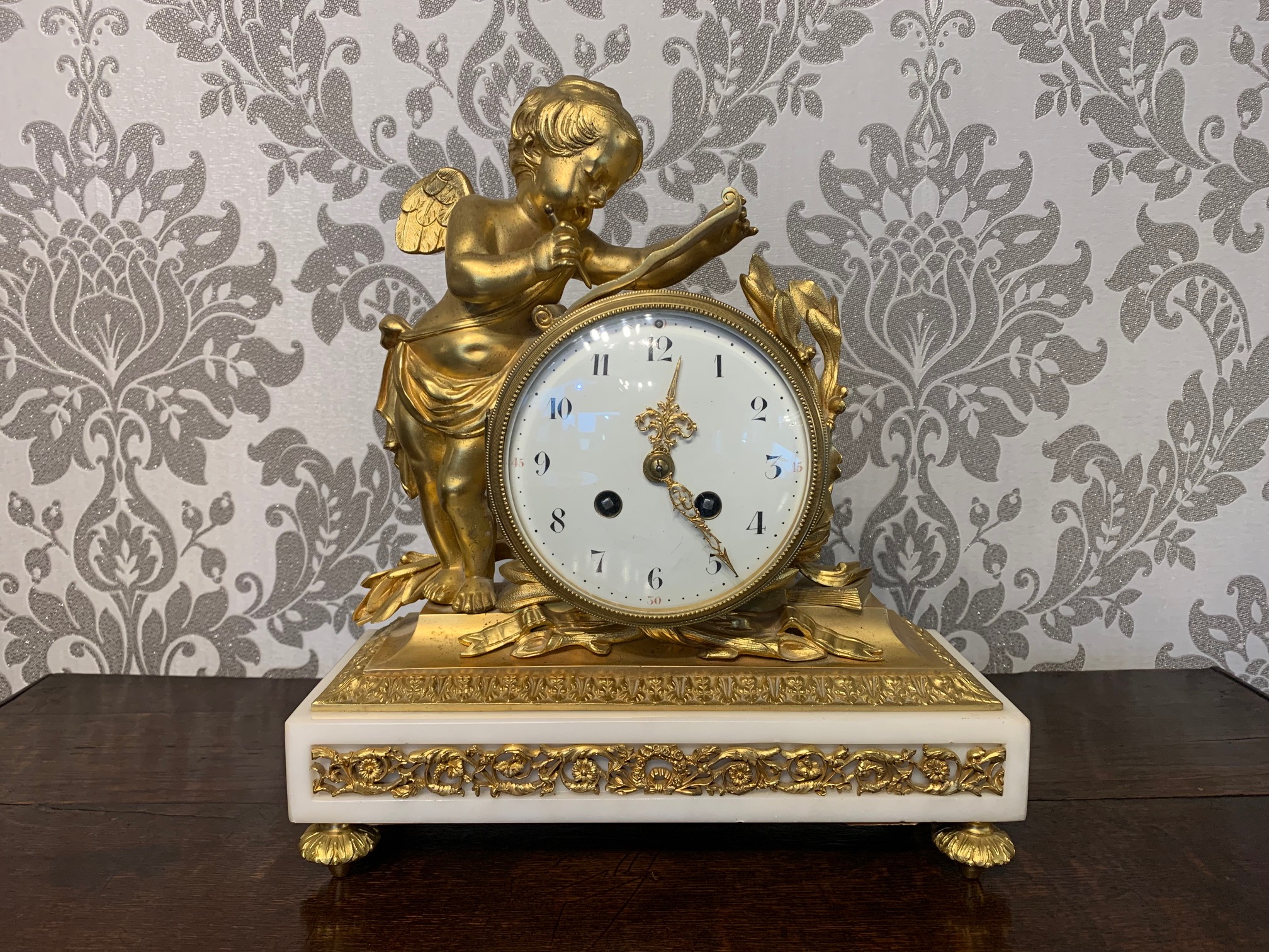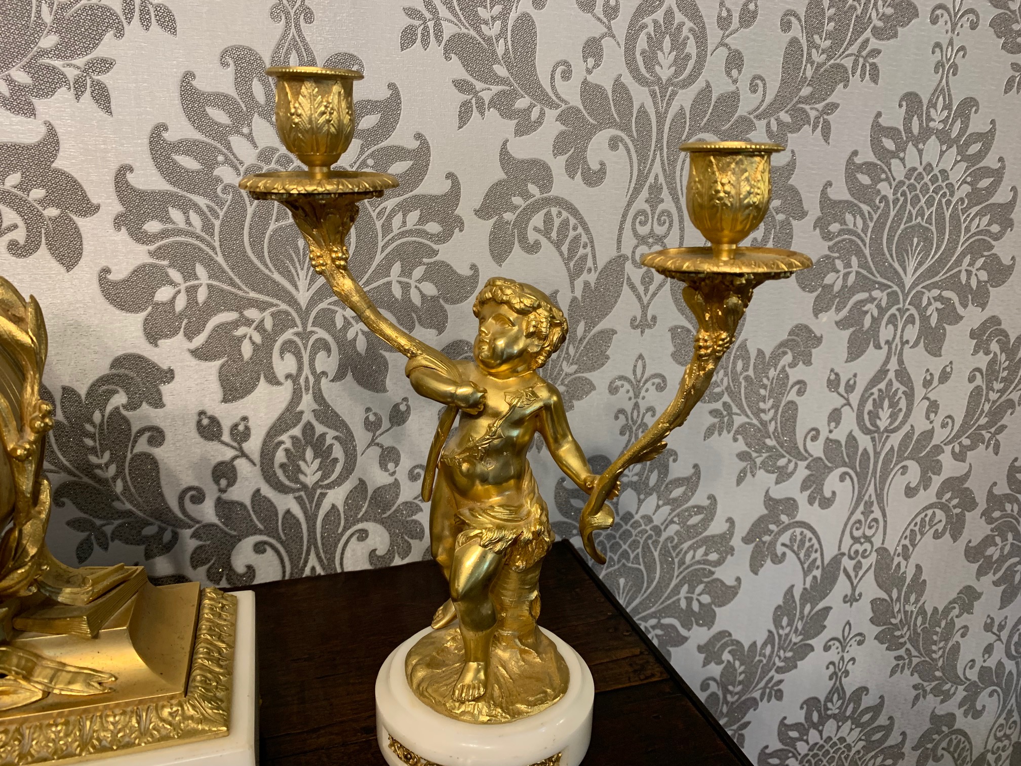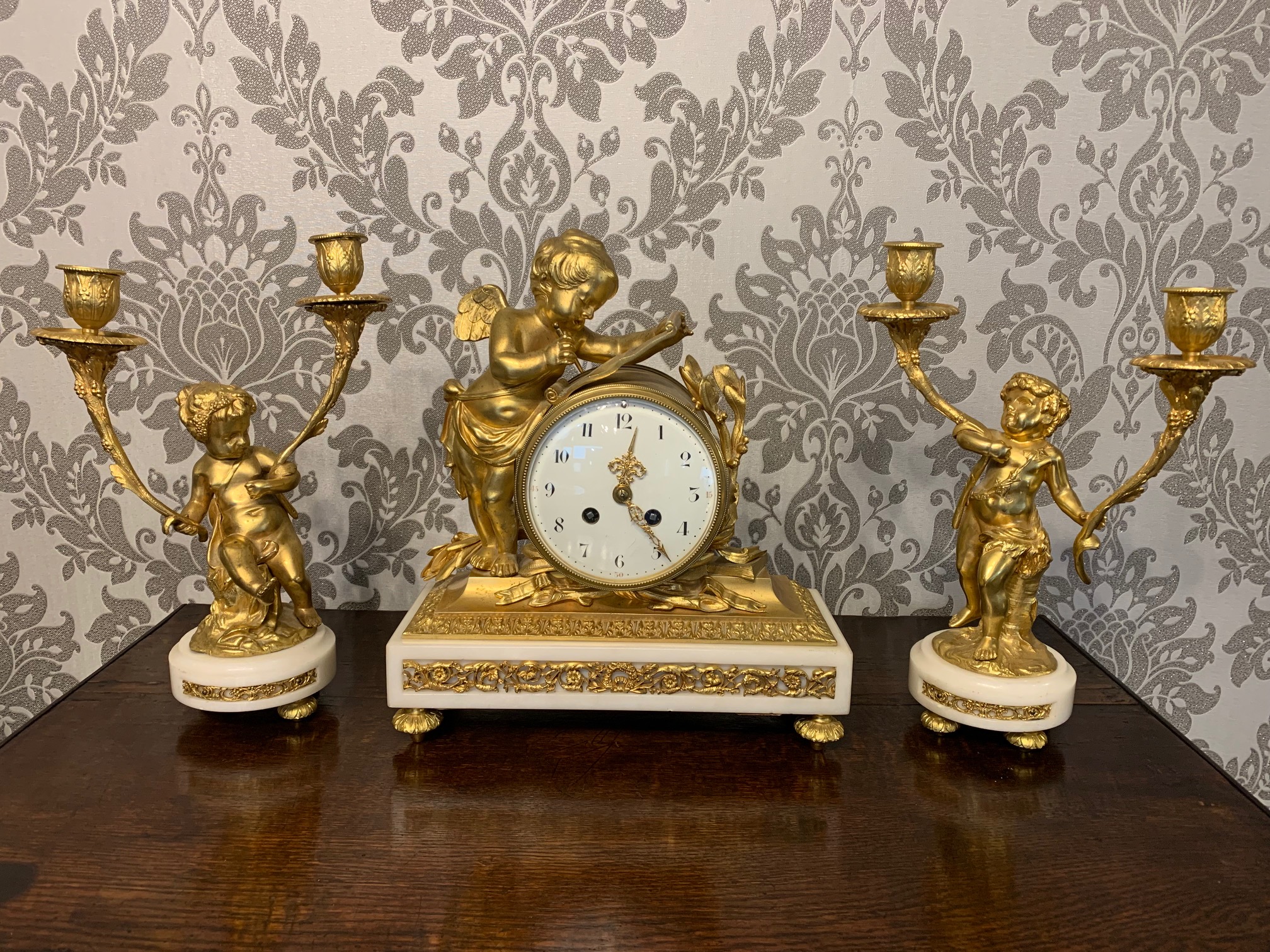 CompareA fine quality French ormolu and marble cherub clock garniture. The central ormolu mounted clock having an eight day movement and painted dial striking a bell on the quarter and hour. Having a pair of twin cherub candelabra with sconces, having the original invoice purchased from Harrods in London. French circa 1880, lovely working condition, one replace foot to one candelabra
