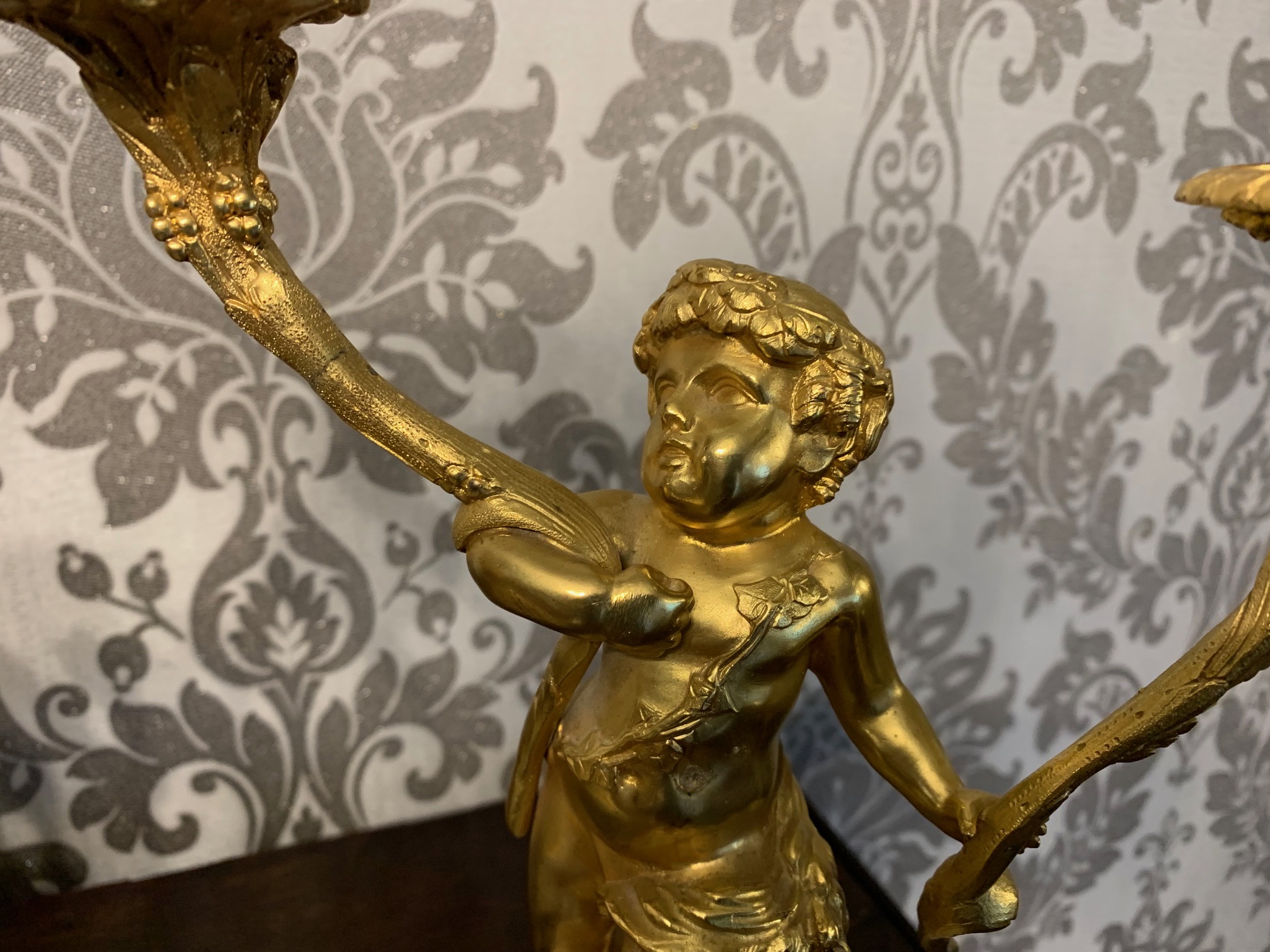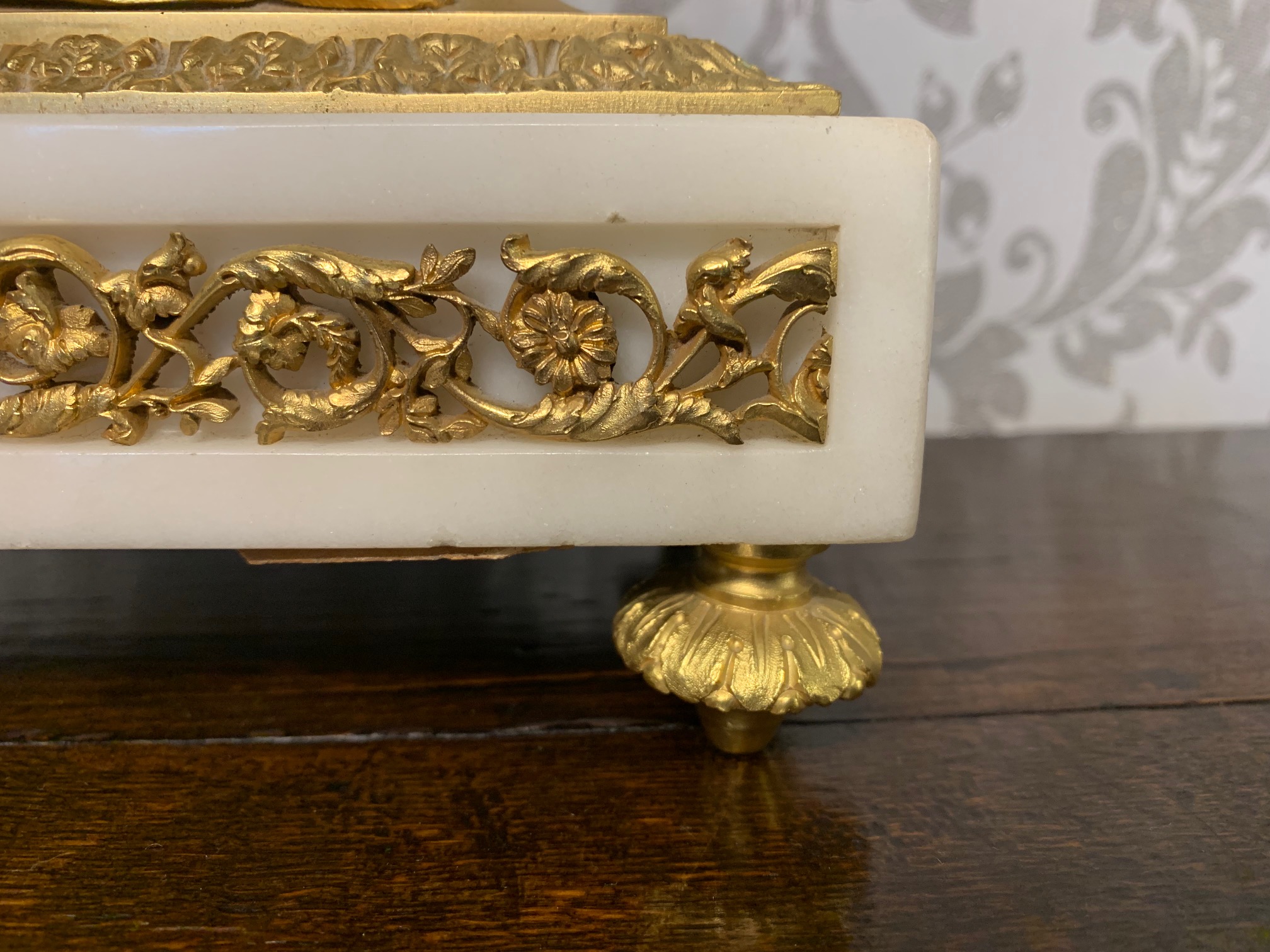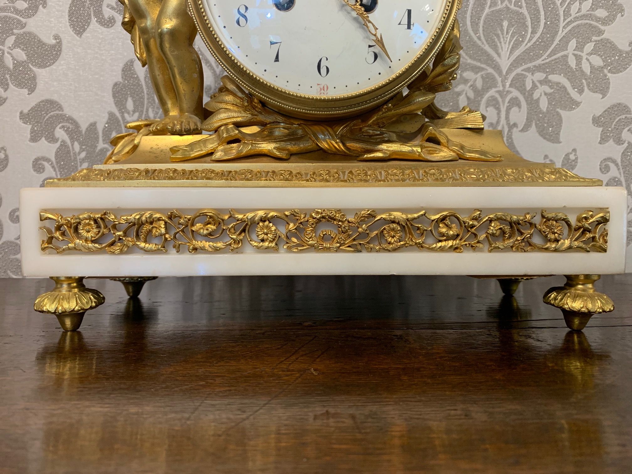 CompareA fine quality French ormolu and marble cherub clock garniture. The central ormolu mounted clock having an eight day movement and painted dial striking a bell on the quarter and hour. Having a pair of twin cherub candelabra with sconces, having the original invoice purchased from Harrods in London. French circa 1880, lovely working condition, one replace foot to one candelabra