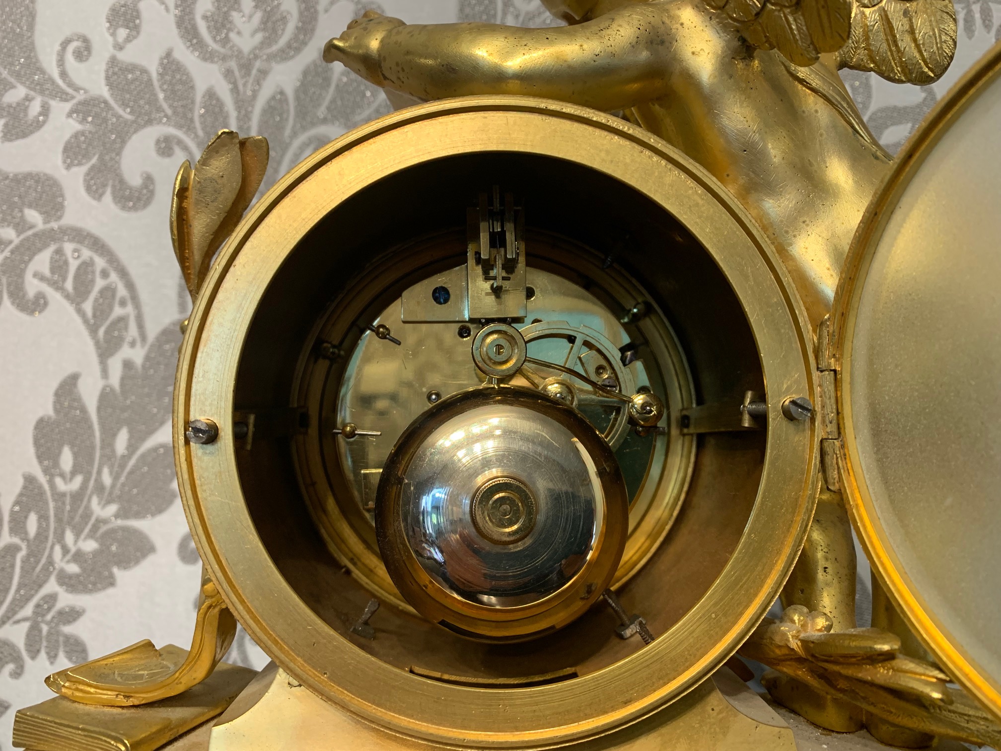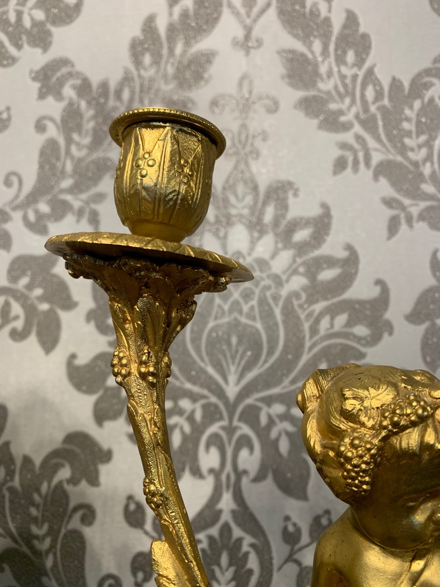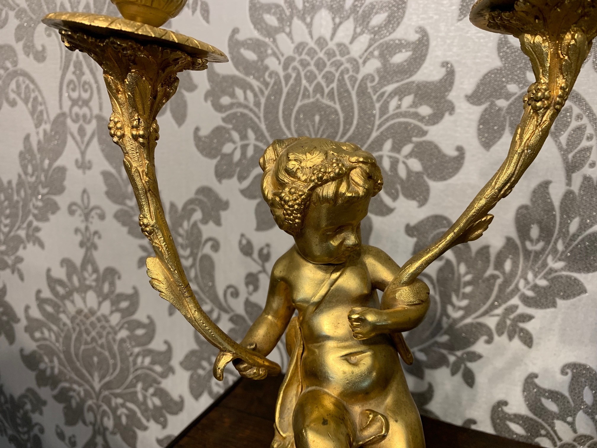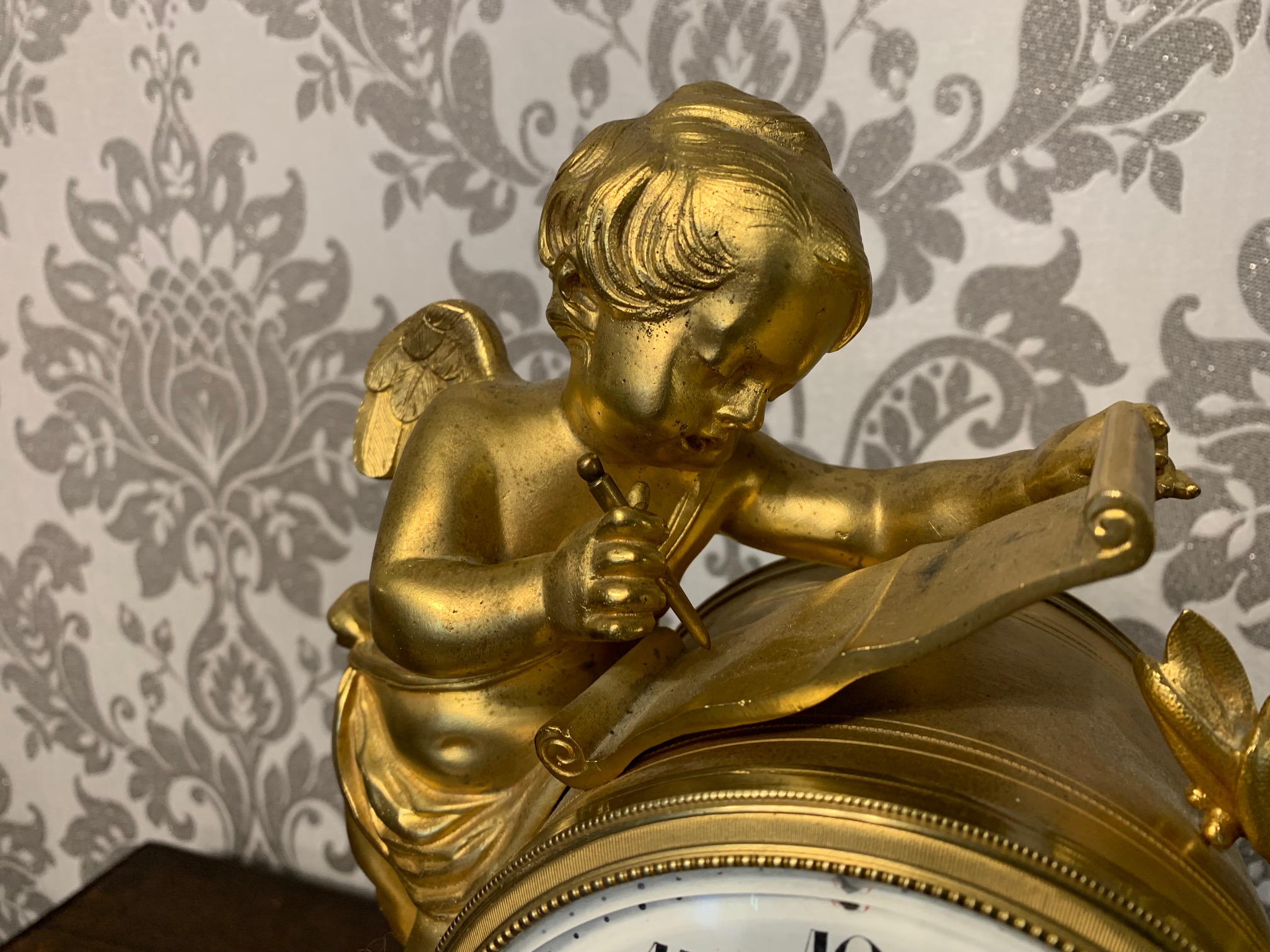 CompareA fine quality French ormolu and marble cherub clock garniture. The central ormolu mounted clock having an eight day movement and painted dial striking a bell on the quarter and hour. Having a pair of twin cherub candelabra with sconces, having the original invoice purchased from Harrods in London. French circa 1880, lovely working condition, one replace foot to one candelabra