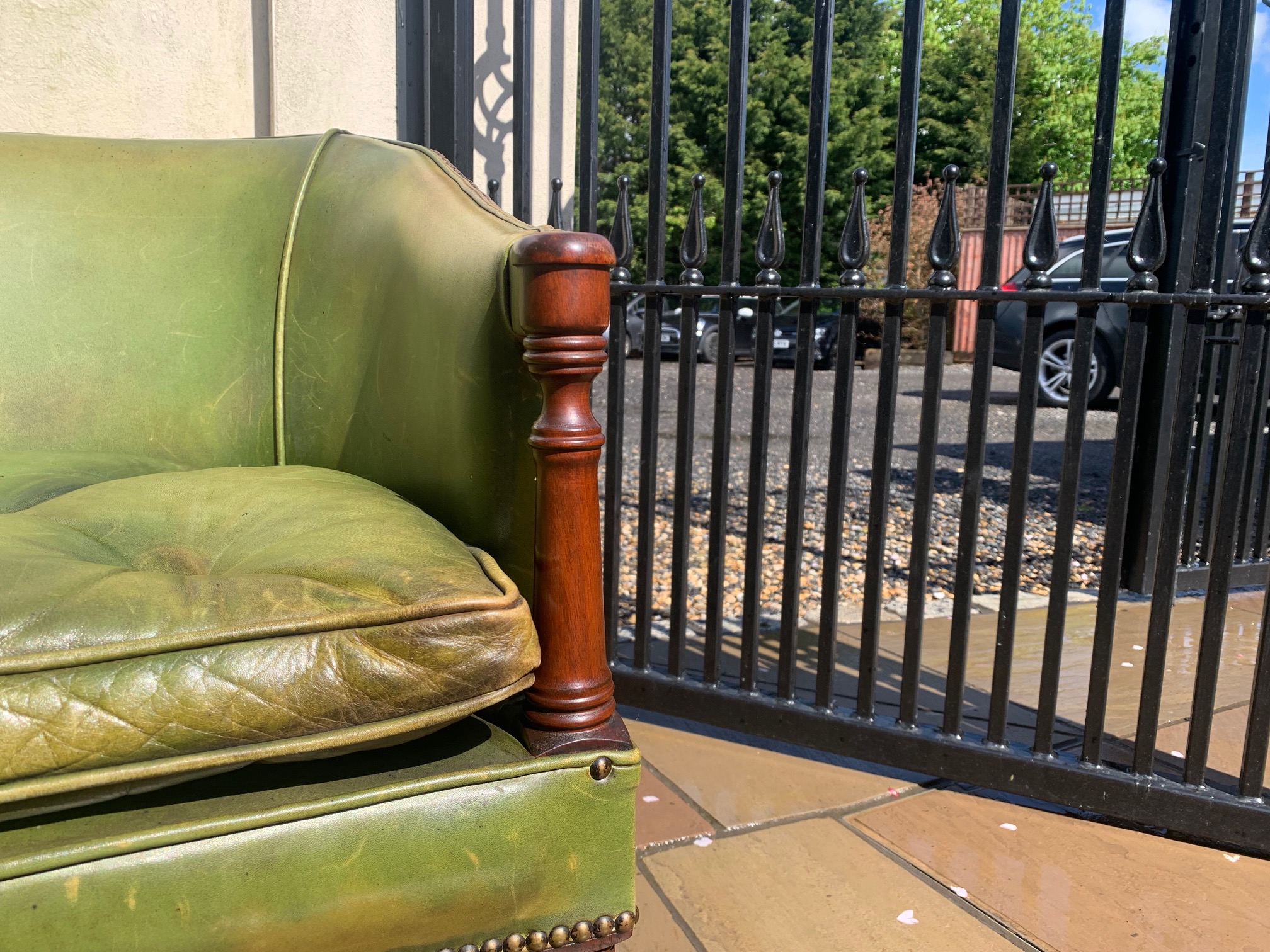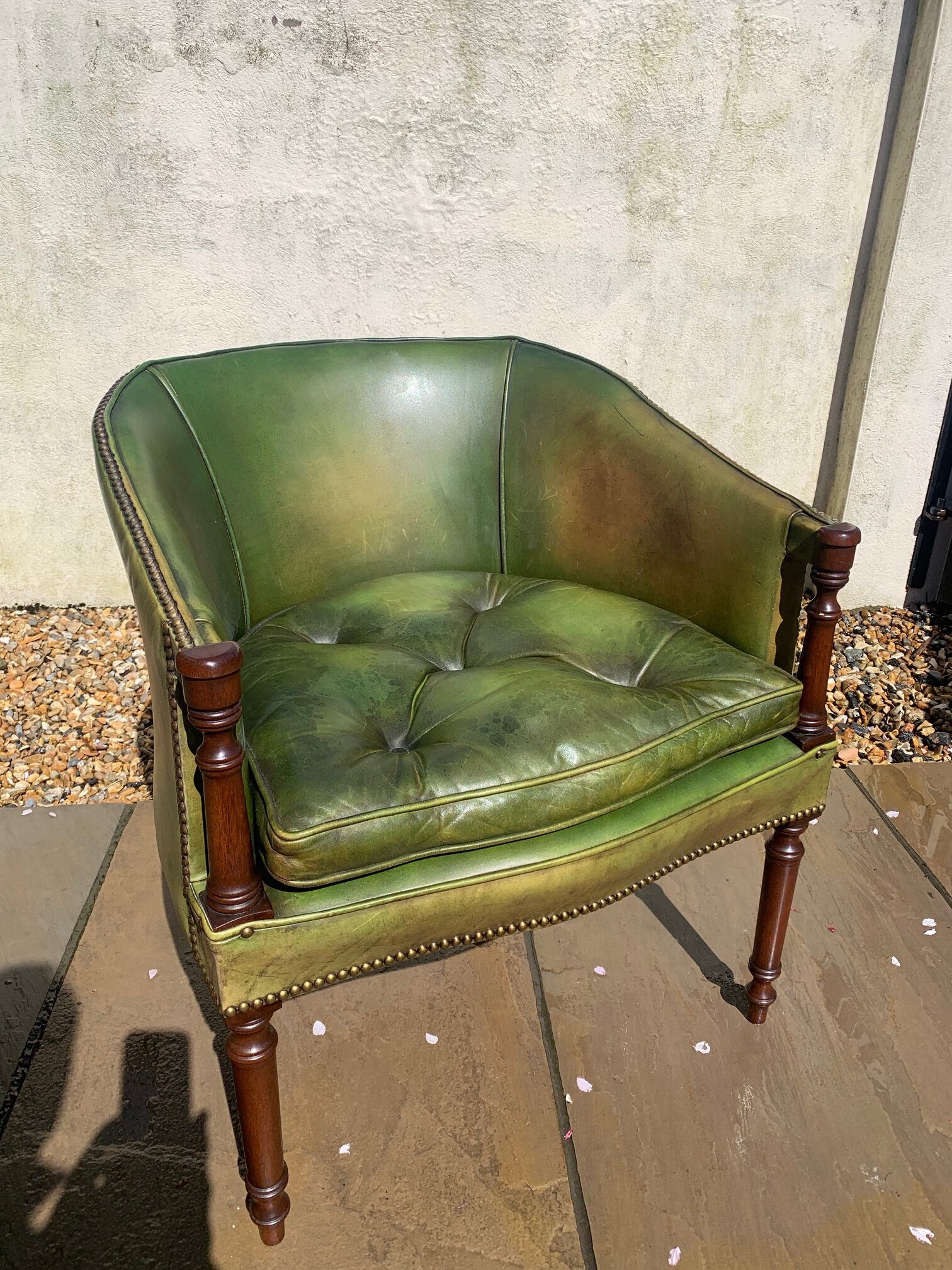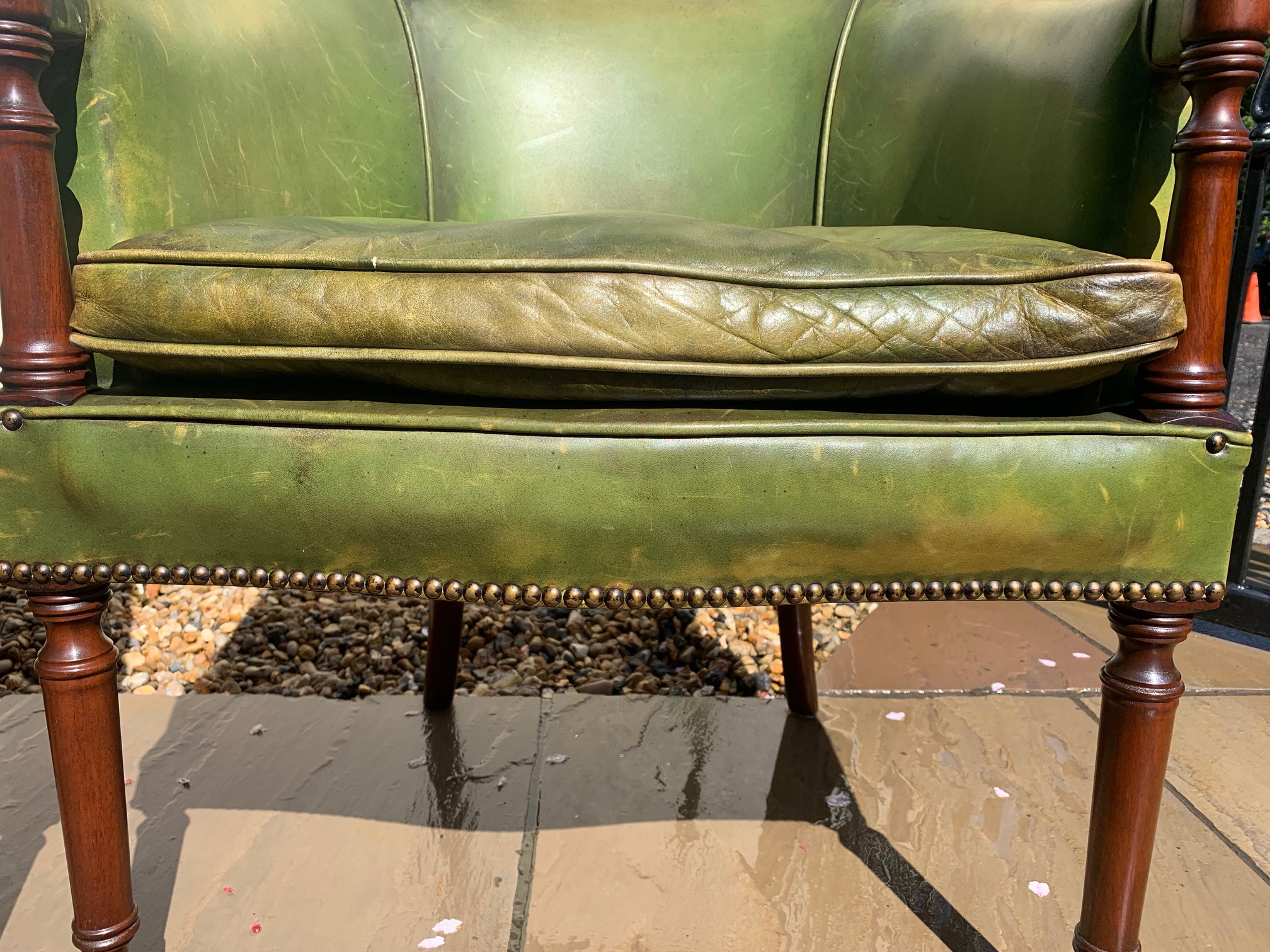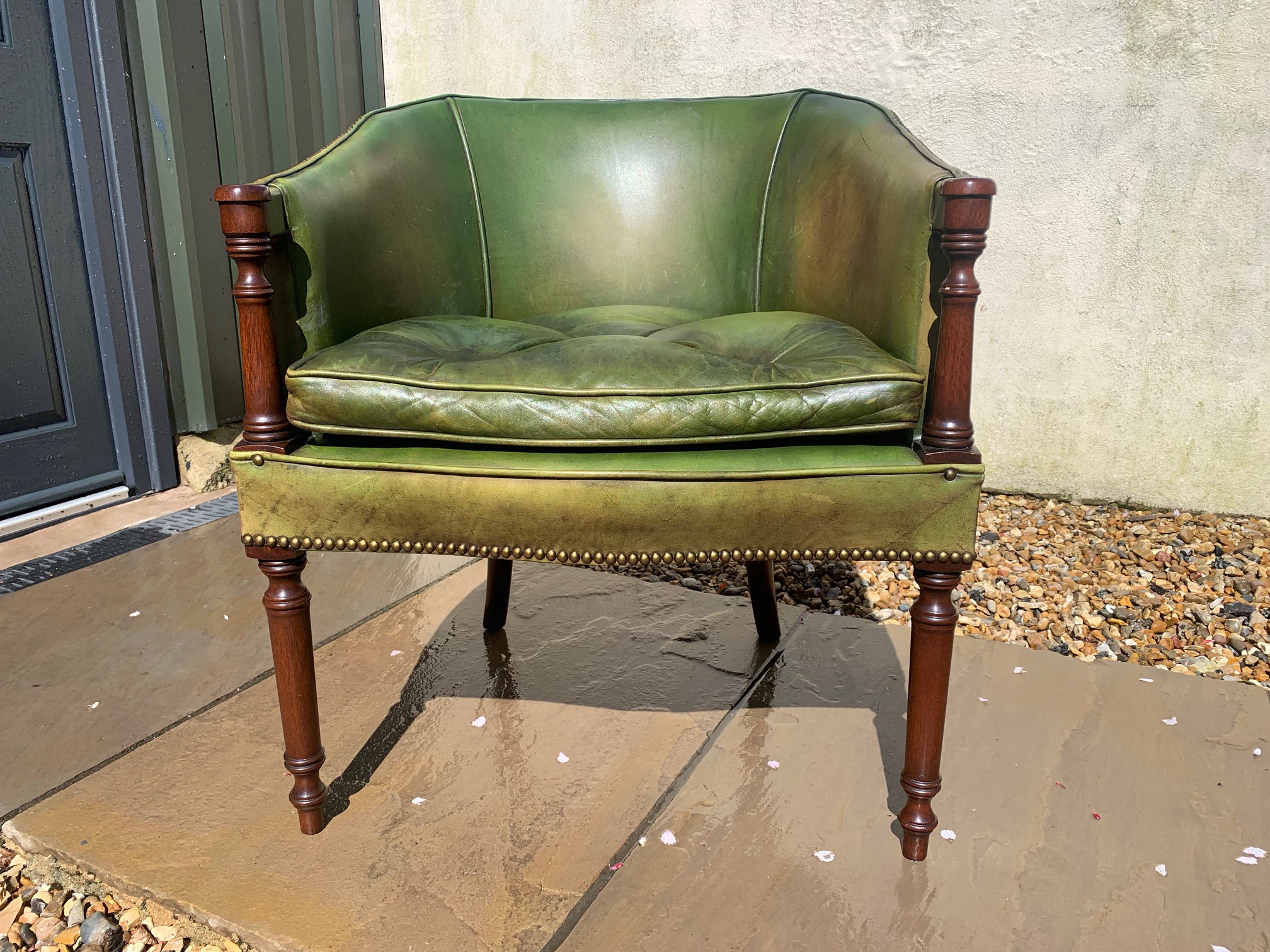 CompareA fine quality mahogany and green leather desk chair. Having a shaped back with a buttoned reversible cushion with fine quality mahogany arms and legs. English circa 1920-1930 in the Georgian Style, excellent original condition cleaned and waxed