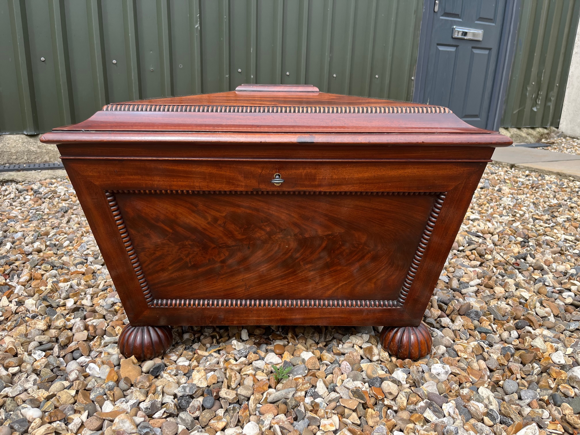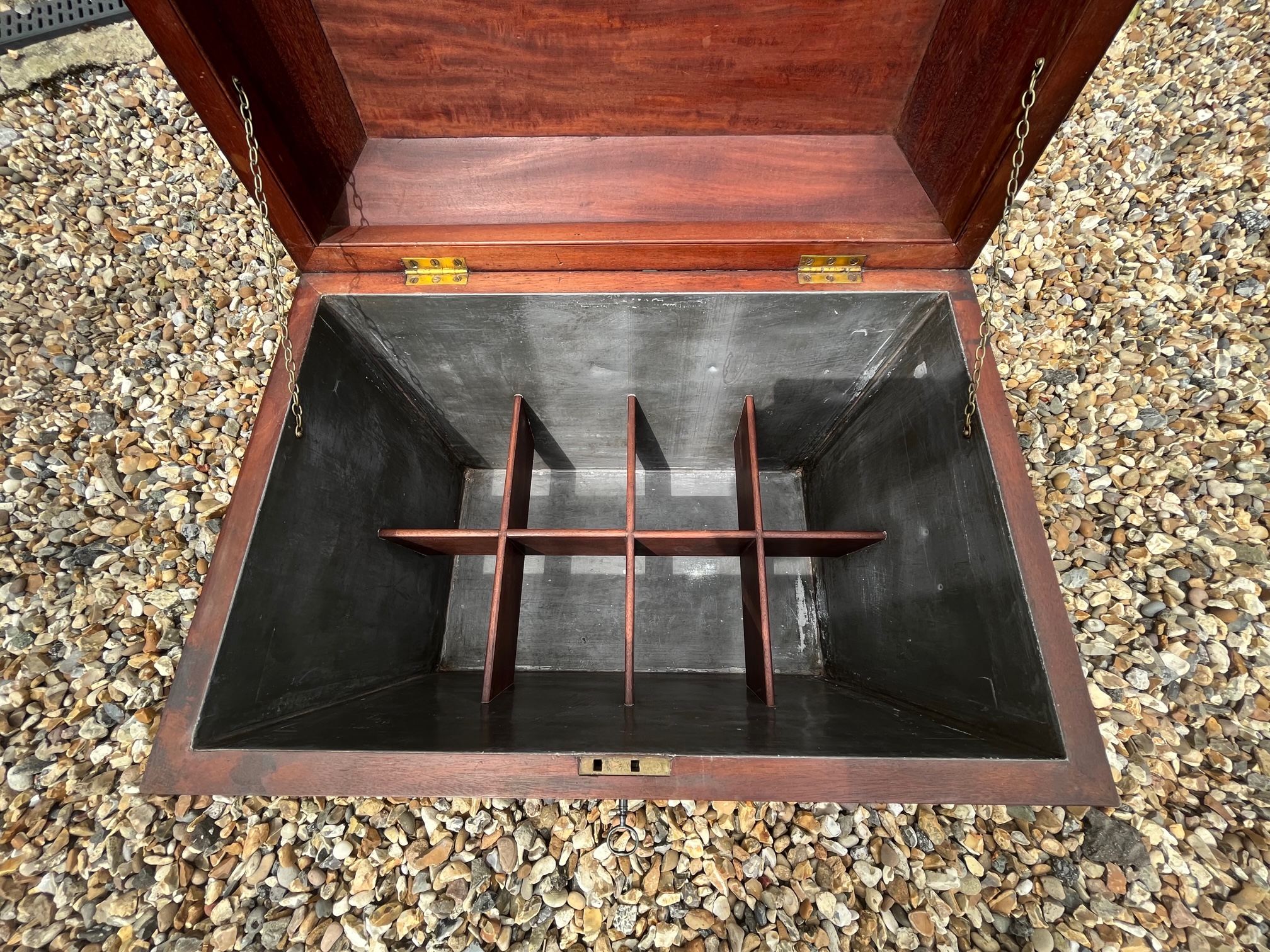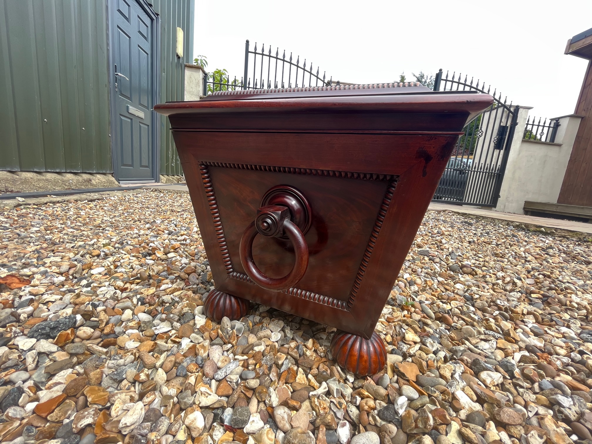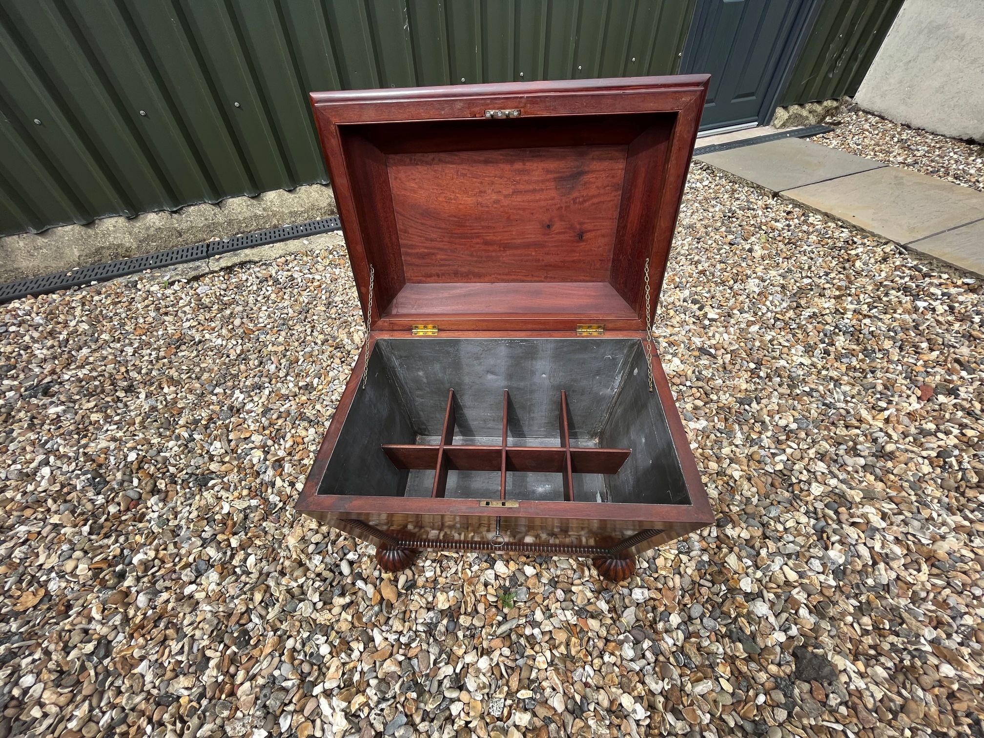 CompareA fine quality Regency Period mahogany wine cooler. The hinged rectangular top with faceted panels with fine quality mouldings and opening to reveal a lead lined interior with eight divisions for bottles. The front, sides and back in solid mahogany with flame mahogany veneered panels and moulded detail. Having turned mahogany handles and roundels to each side. Raised on carved melon feet with inset copes castors. Fantastic original condition throughout and of beautiful colour and patination. English circa 1820