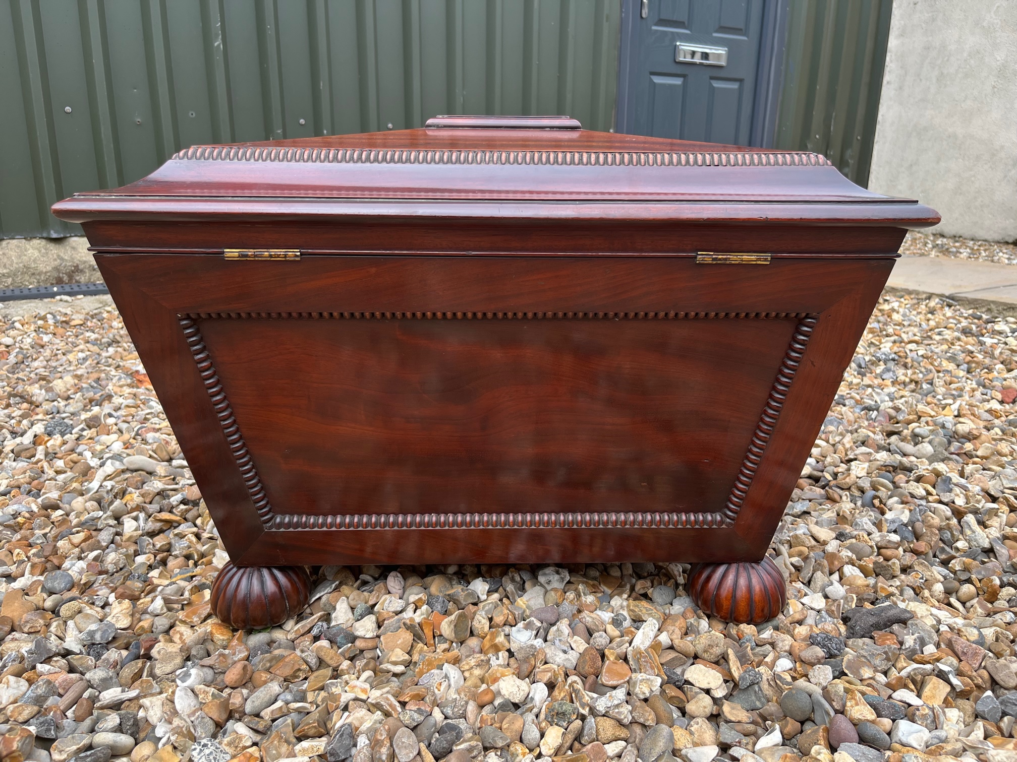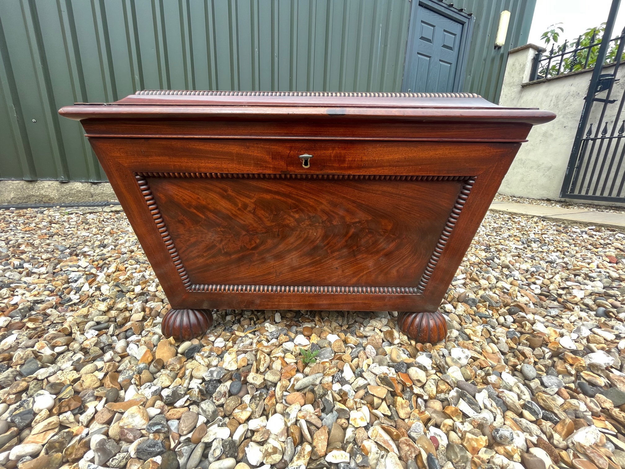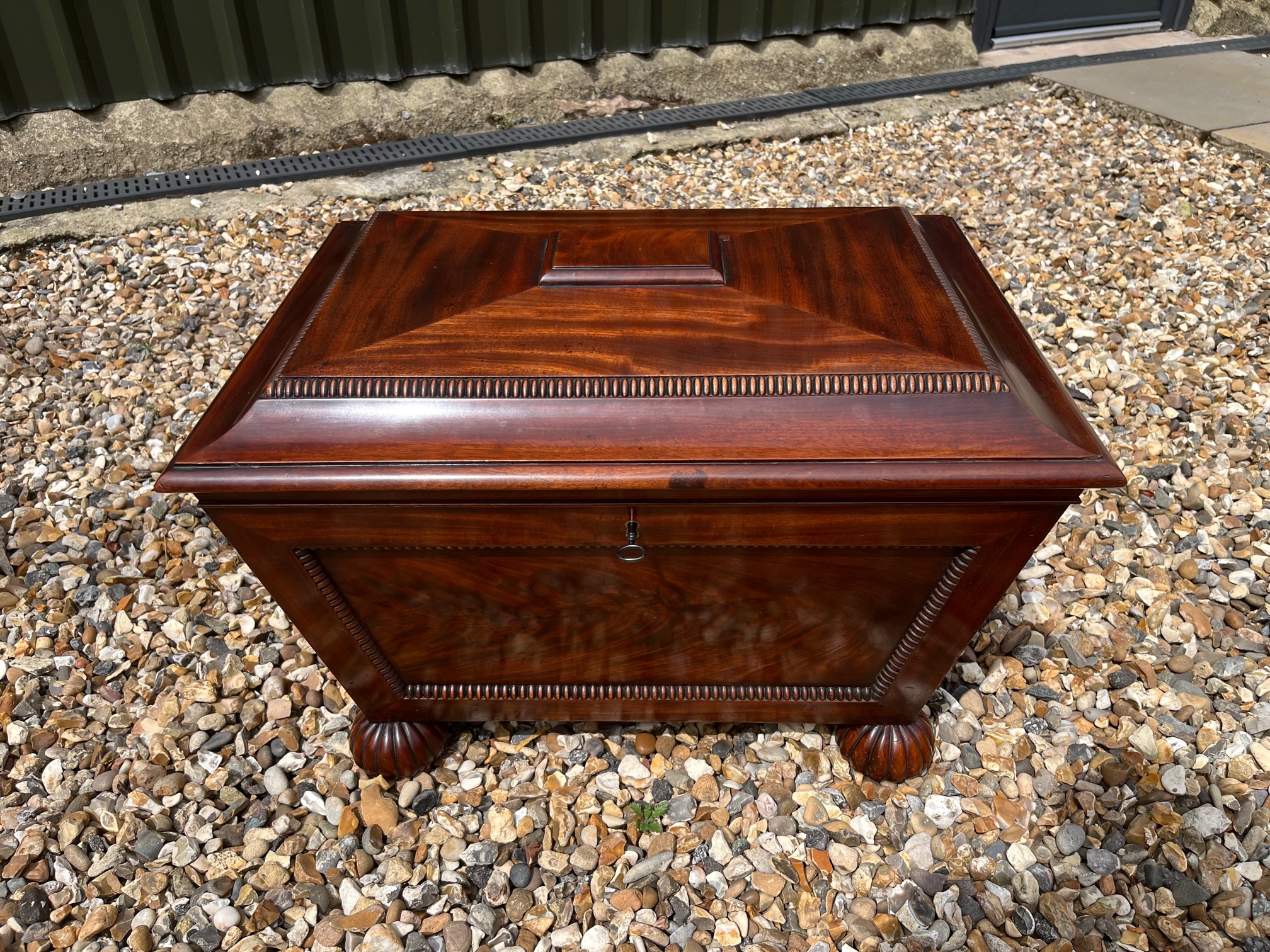 CompareA fine quality Regency Period mahogany wine cooler. The hinged rectangular top with faceted panels with fine quality mouldings and opening to reveal a lead lined interior with eight divisions for bottles. The front, sides and back in solid mahogany with flame mahogany veneered panels and moulded detail. Having turned mahogany handles and roundels to each side. Raised on carved melon feet with inset copes castors. Fantastic original condition throughout and of beautiful colour and patination. English circa 1820