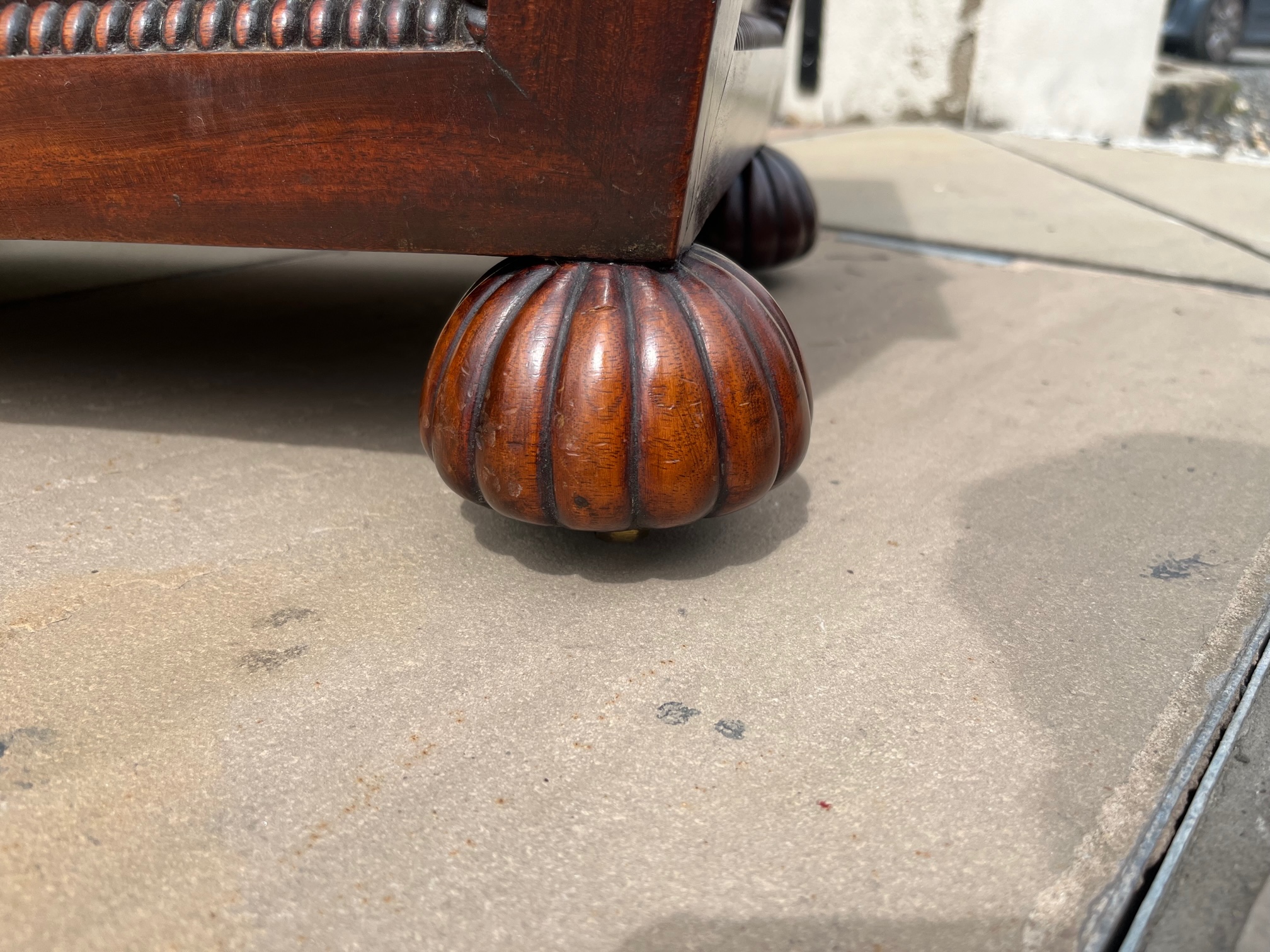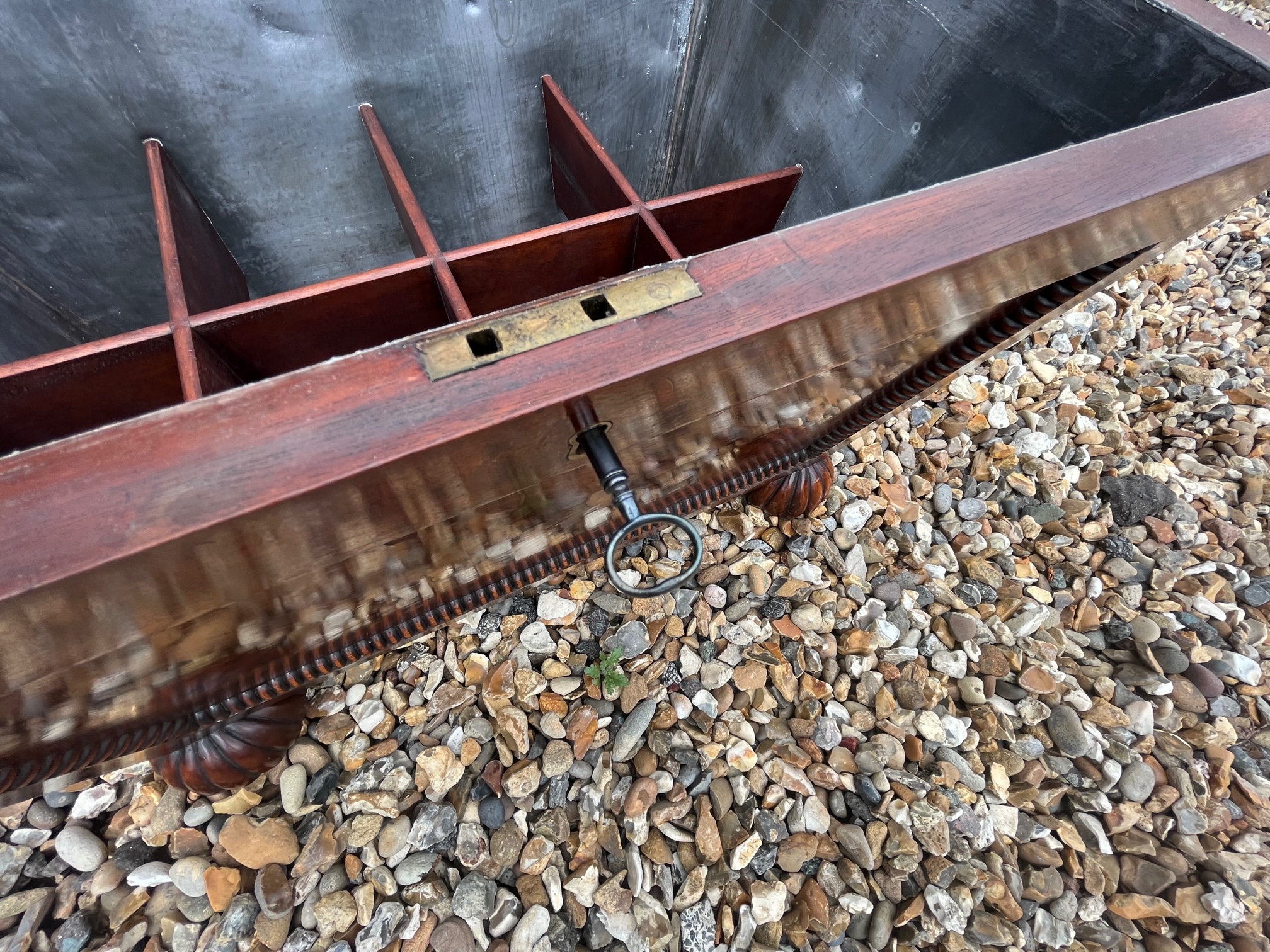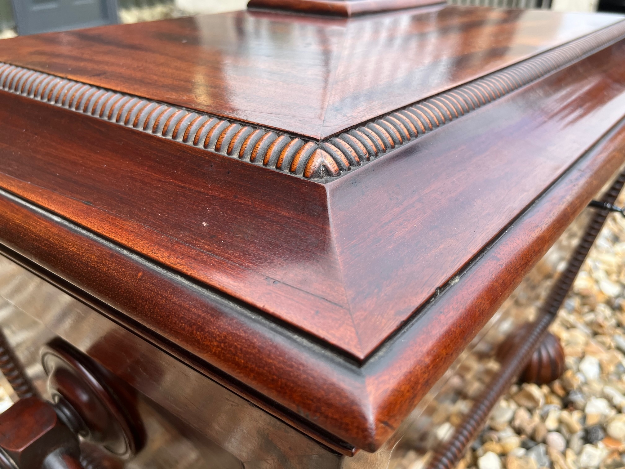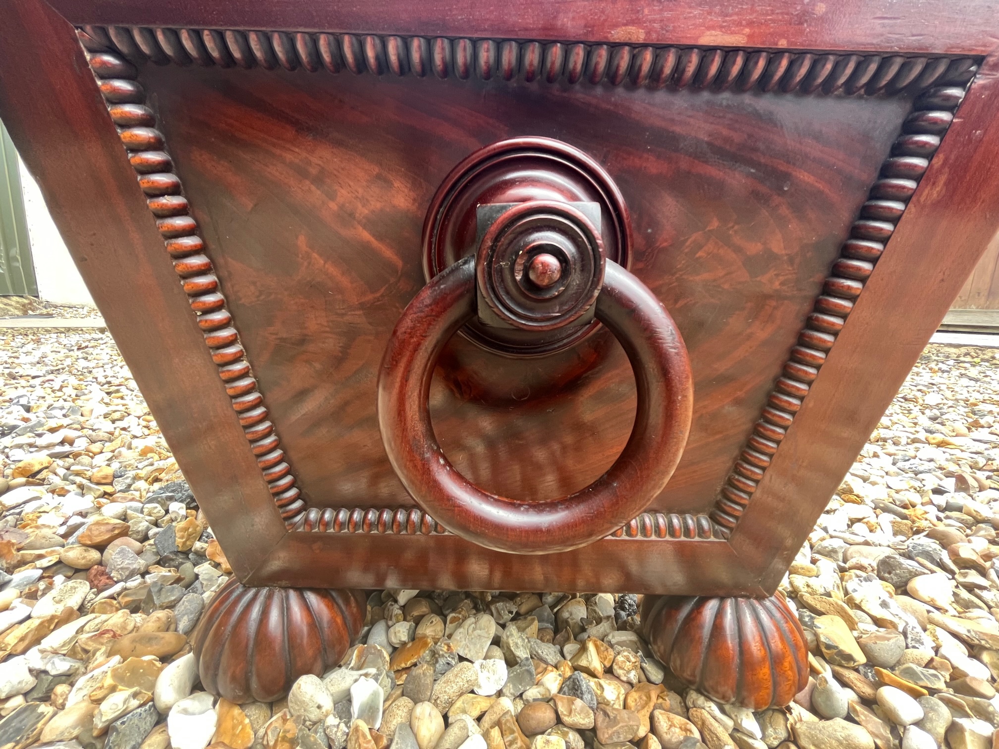 CompareA fine quality Regency Period mahogany wine cooler. The hinged rectangular top with faceted panels with fine quality mouldings and opening to reveal a lead lined interior with eight divisions for bottles. The front, sides and back in solid mahogany with flame mahogany veneered panels and moulded detail. Having turned mahogany handles and roundels to each side. Raised on carved melon feet with inset copes castors. Fantastic original condition throughout and of beautiful colour and patination. English circa 1820