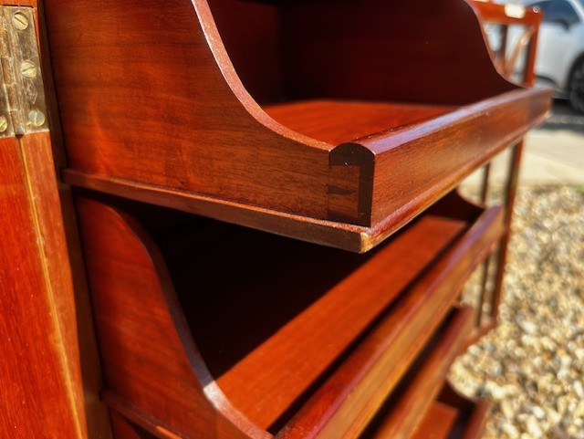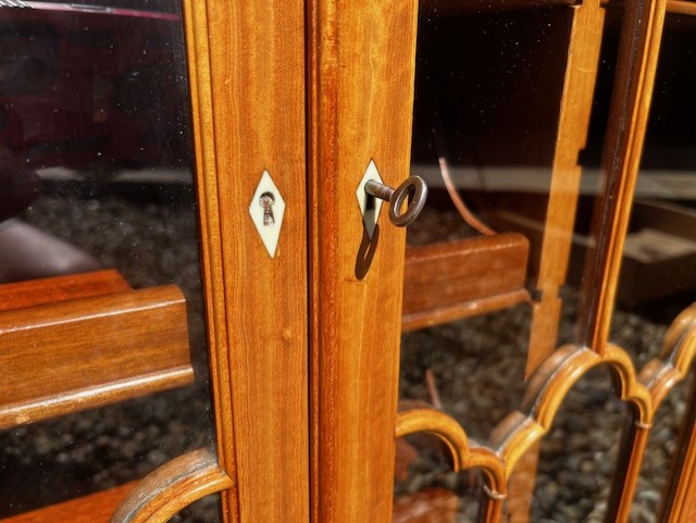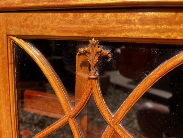 A Fine Quality Small Scale Late Victorian Satinwood & Marquetry Inlaid Collectors Cabinet. The rectangular top veneered in satinwood with Harewood and satinwood cross banded detail. The front having two glazed doors with Price of Wales Feathers carved detail and opening to reveal five mahogany sliding trays for use as a collector, with a single shelf to the right hand side. The frieze having beautiful marquetry harebell and floral inlaid detail which is repeated on the sides and ends and raised on splayed feet with inset brass castors. Bearing a plaque from the Lady Ludlow Collection who was a prominent collector of antiques especially porcelain. Superb condition throughout. English Circa 1890-1900