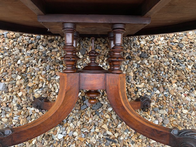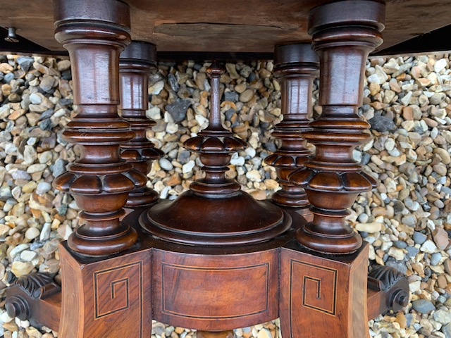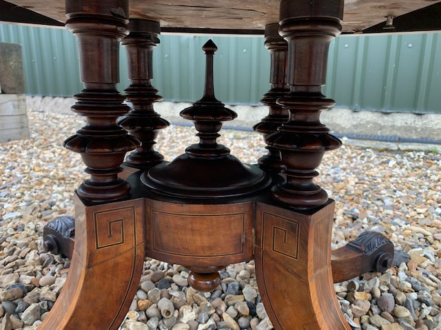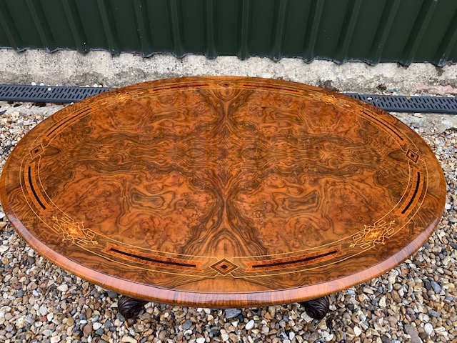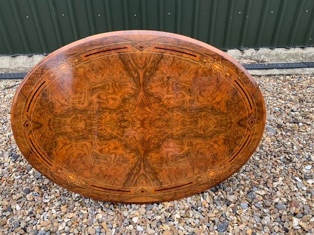 A fine quality Victorian Period burr walnut and marquetry inlaid oval antique coffee table