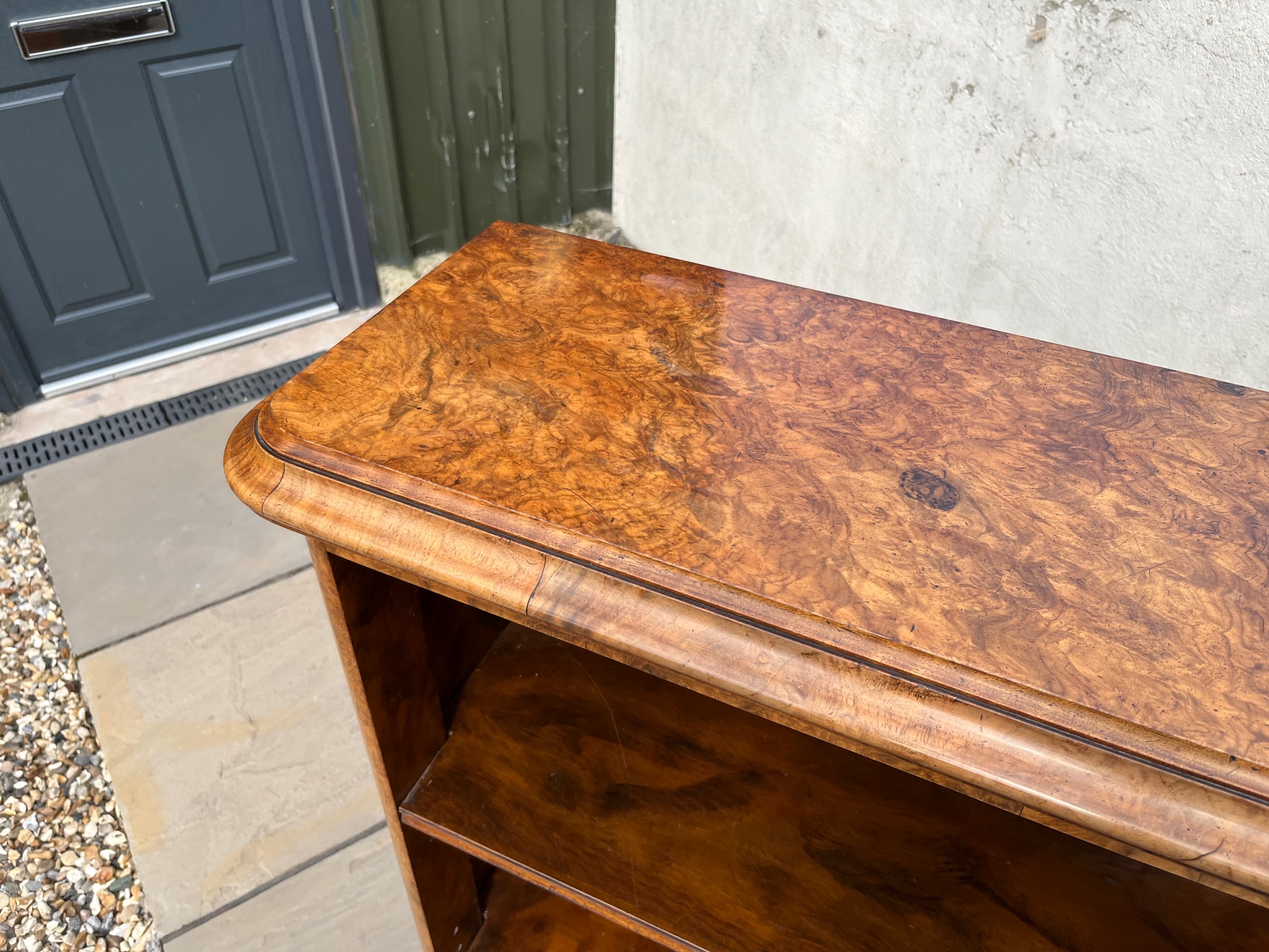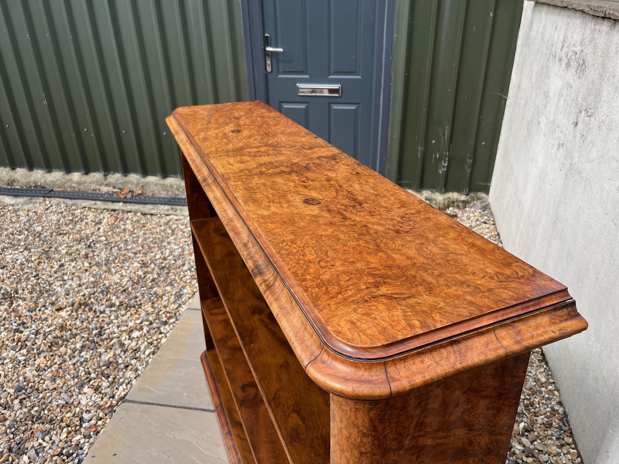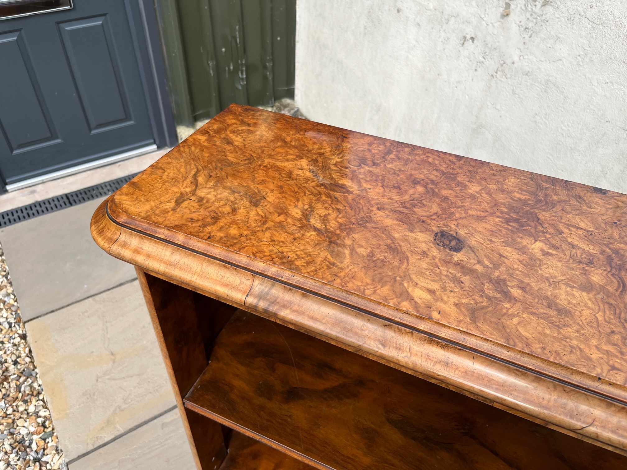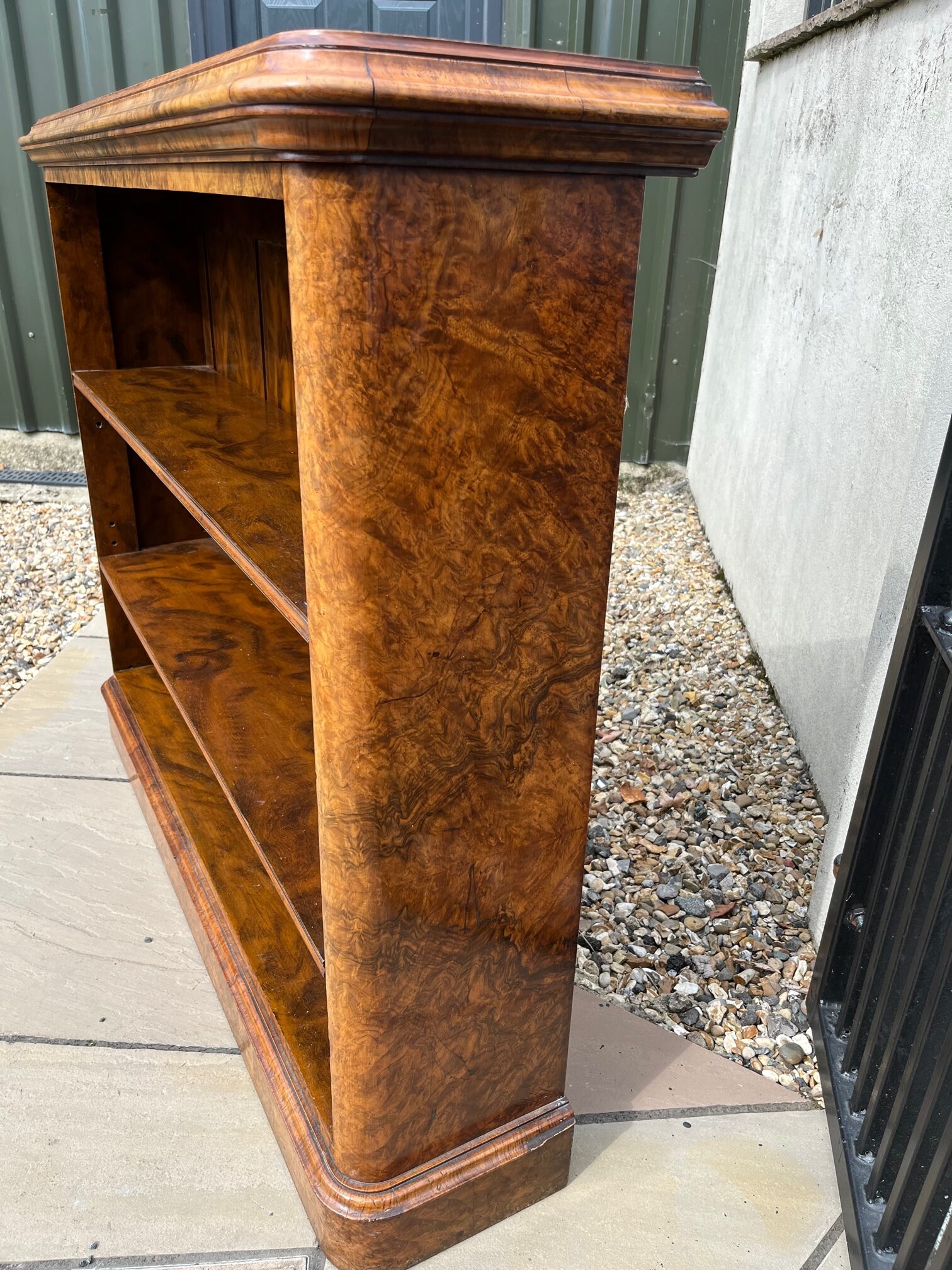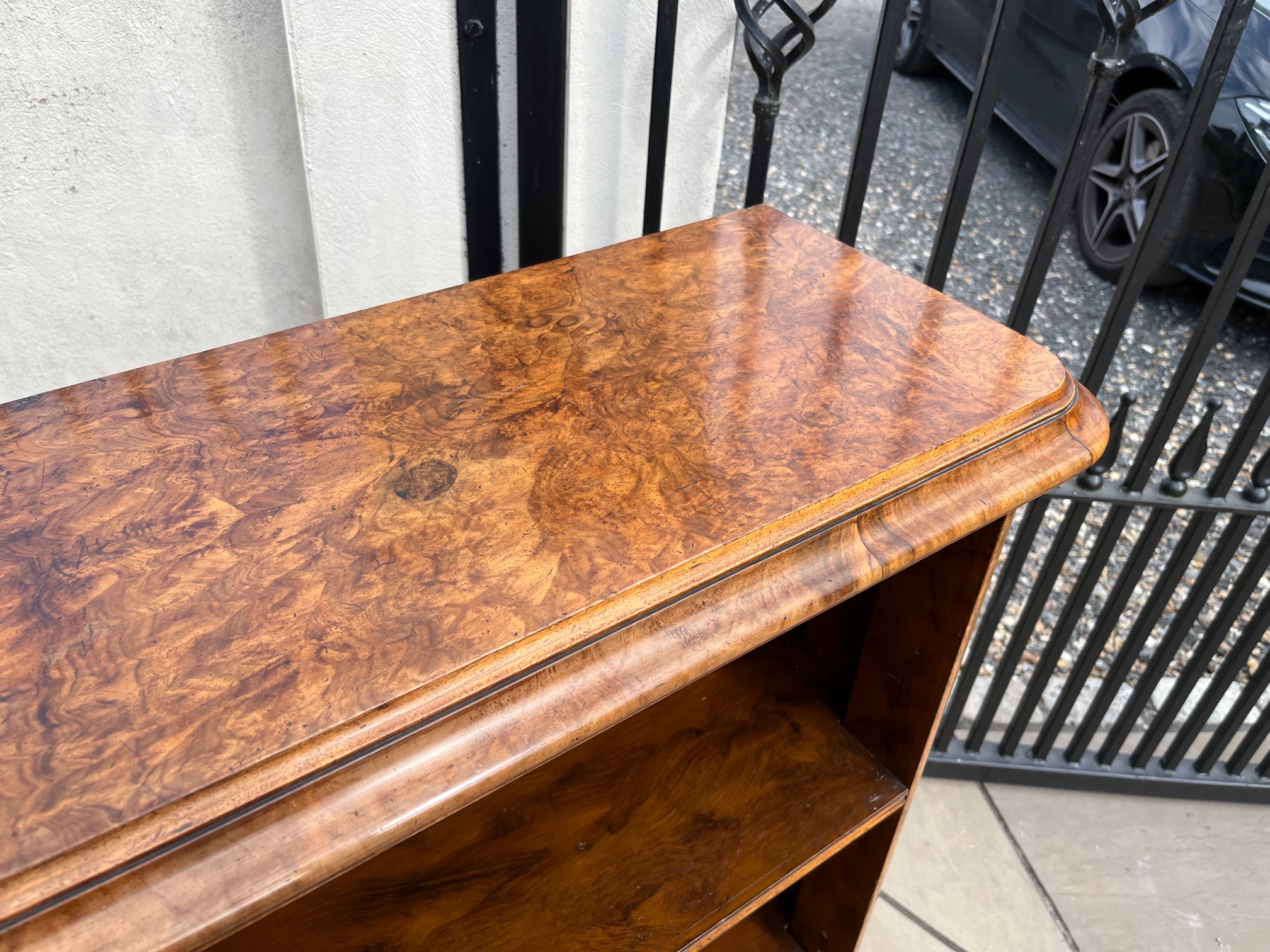 A fine quality Victorian Period burr walnut antique open bookcase.