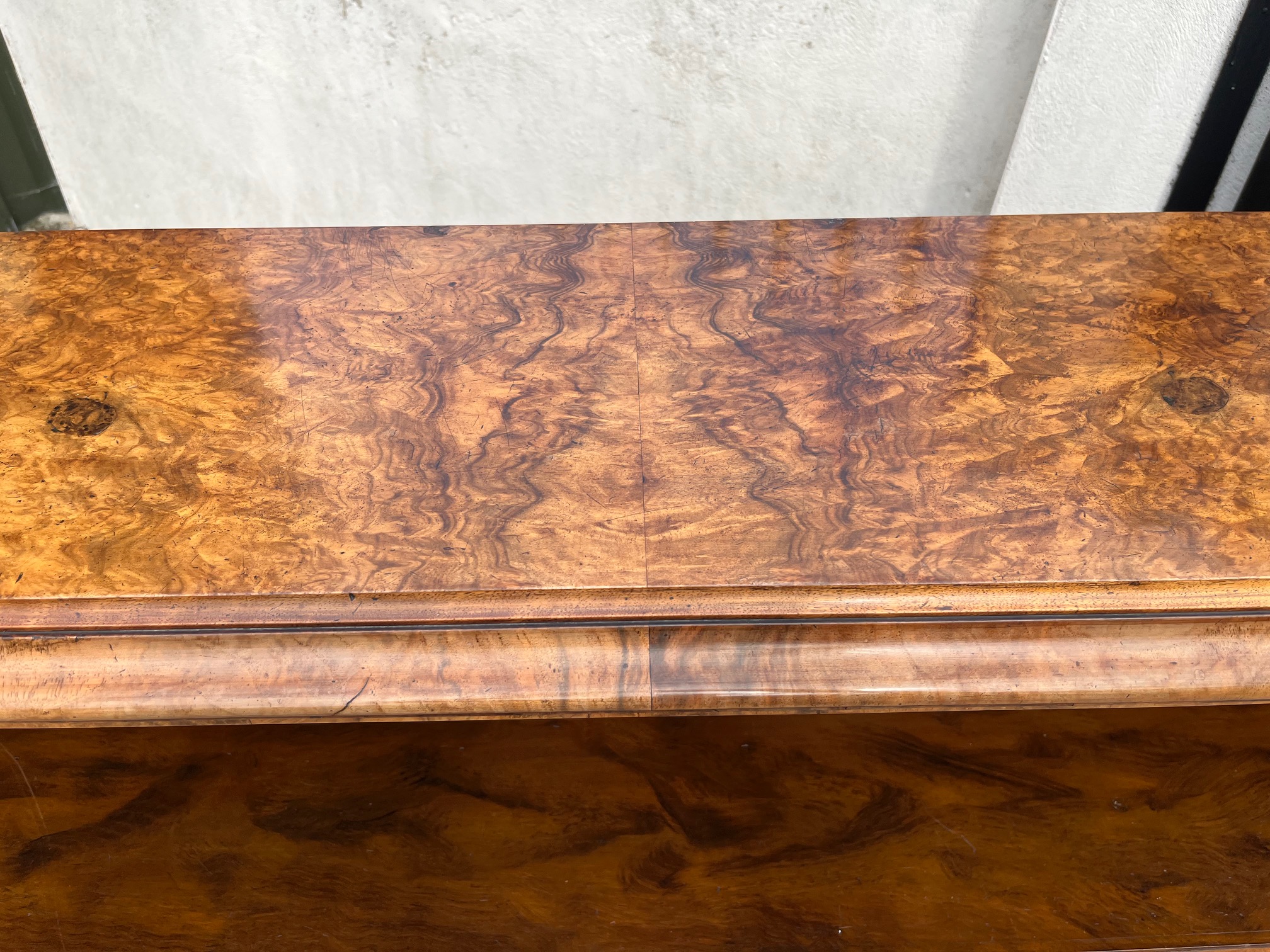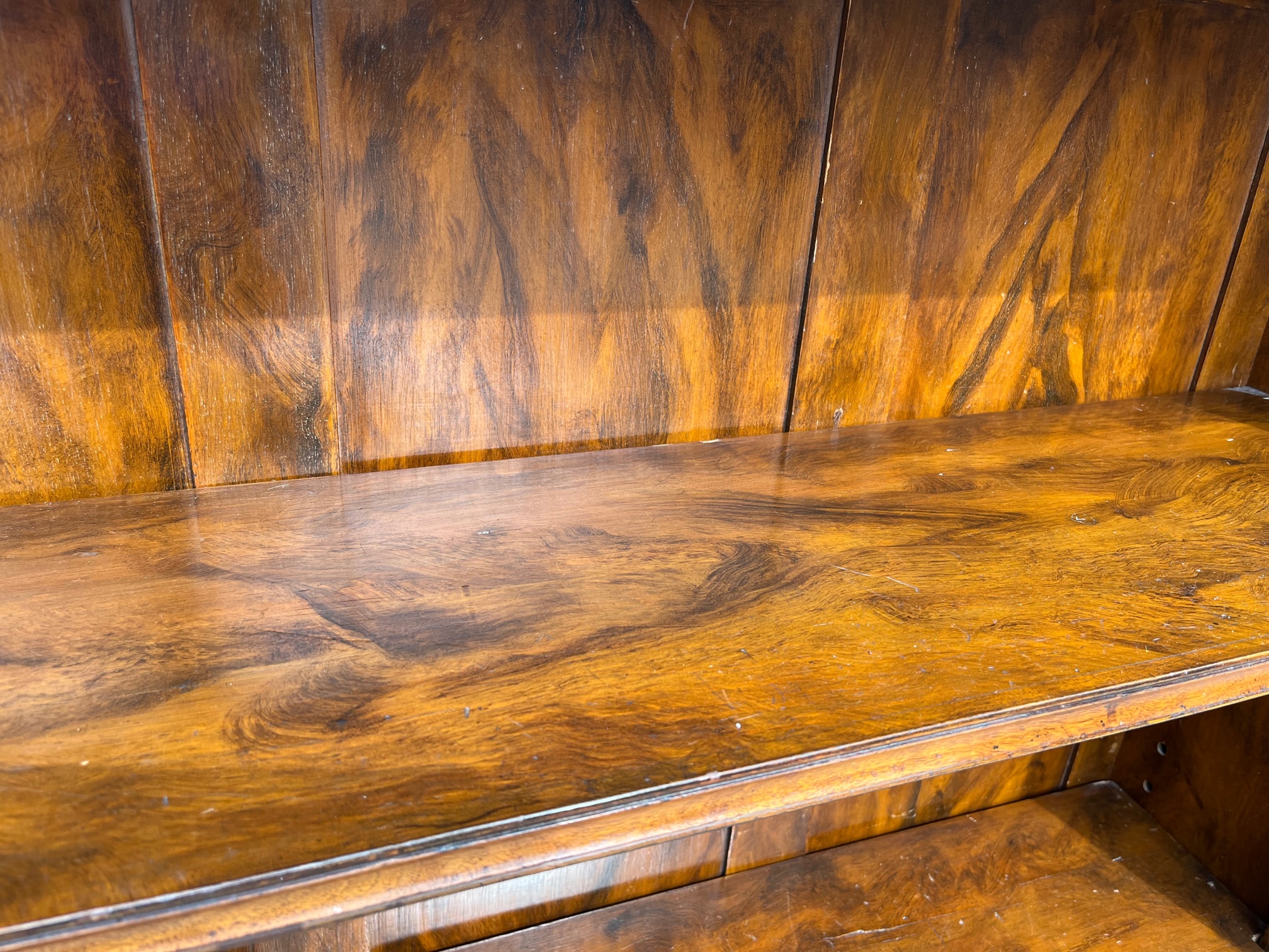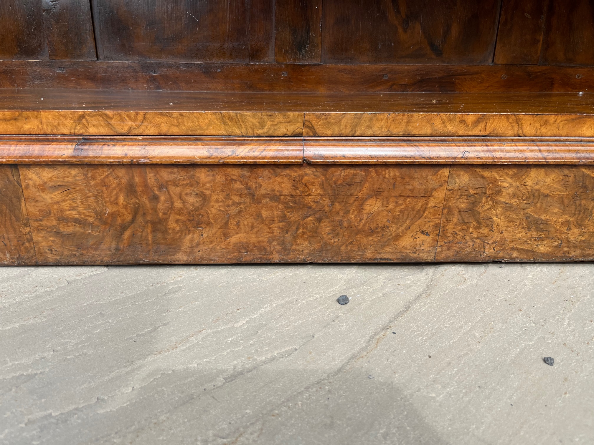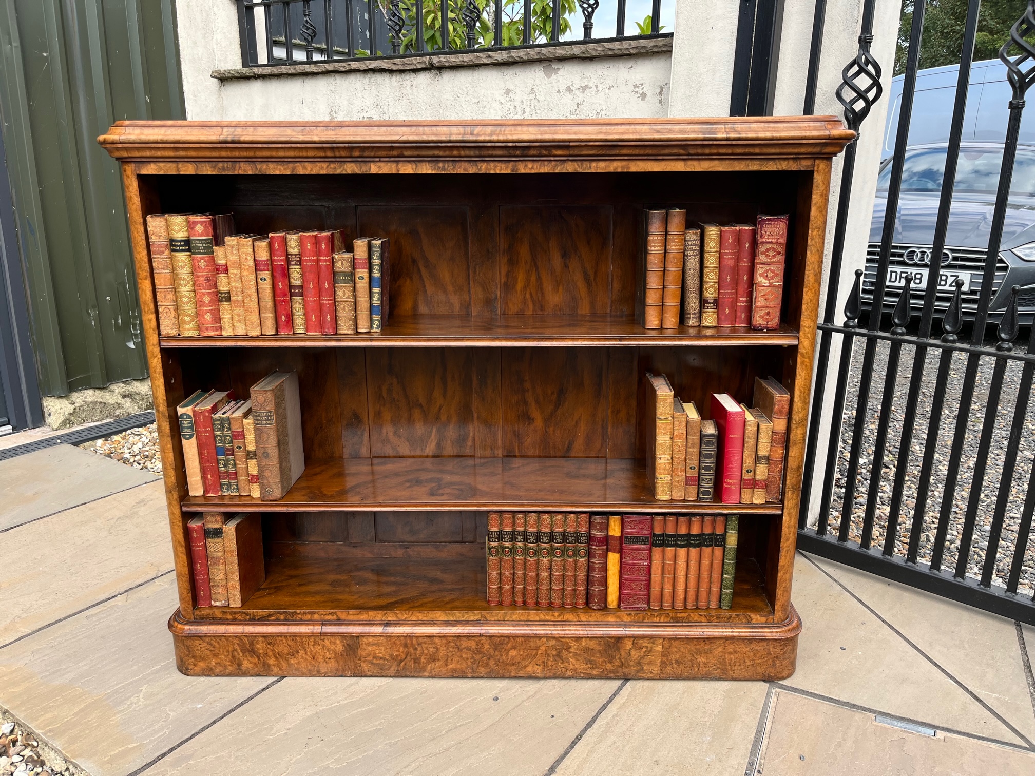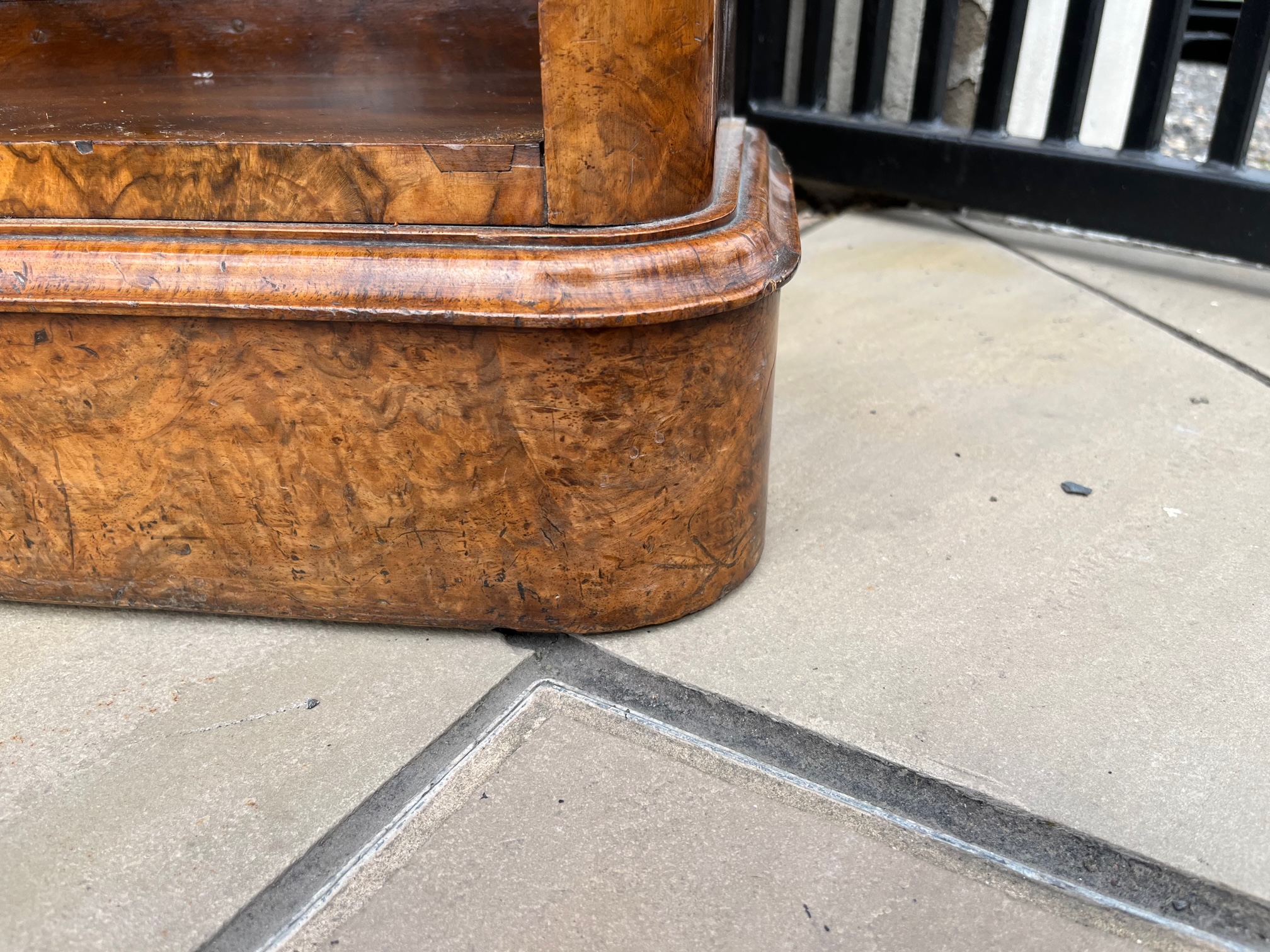 CompareA fine quality Victorian Period burr walnut antique open bookcase. The rounded cornered top veneered in beautifully burr walnut which is repeated on the ends and plinth. Having two adjustable shelves and the interior and shelves retaining their original scumbled finish to resemble figured walnut. English circa 1870, excellent original condition, colour and patination. Waxed in our workshops