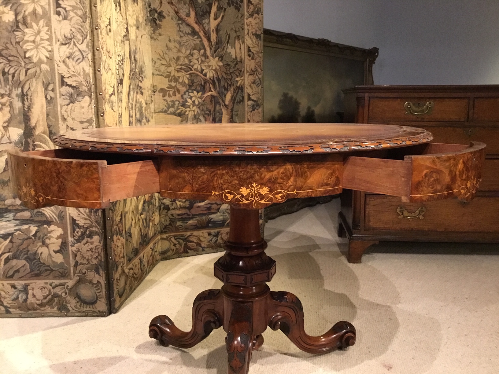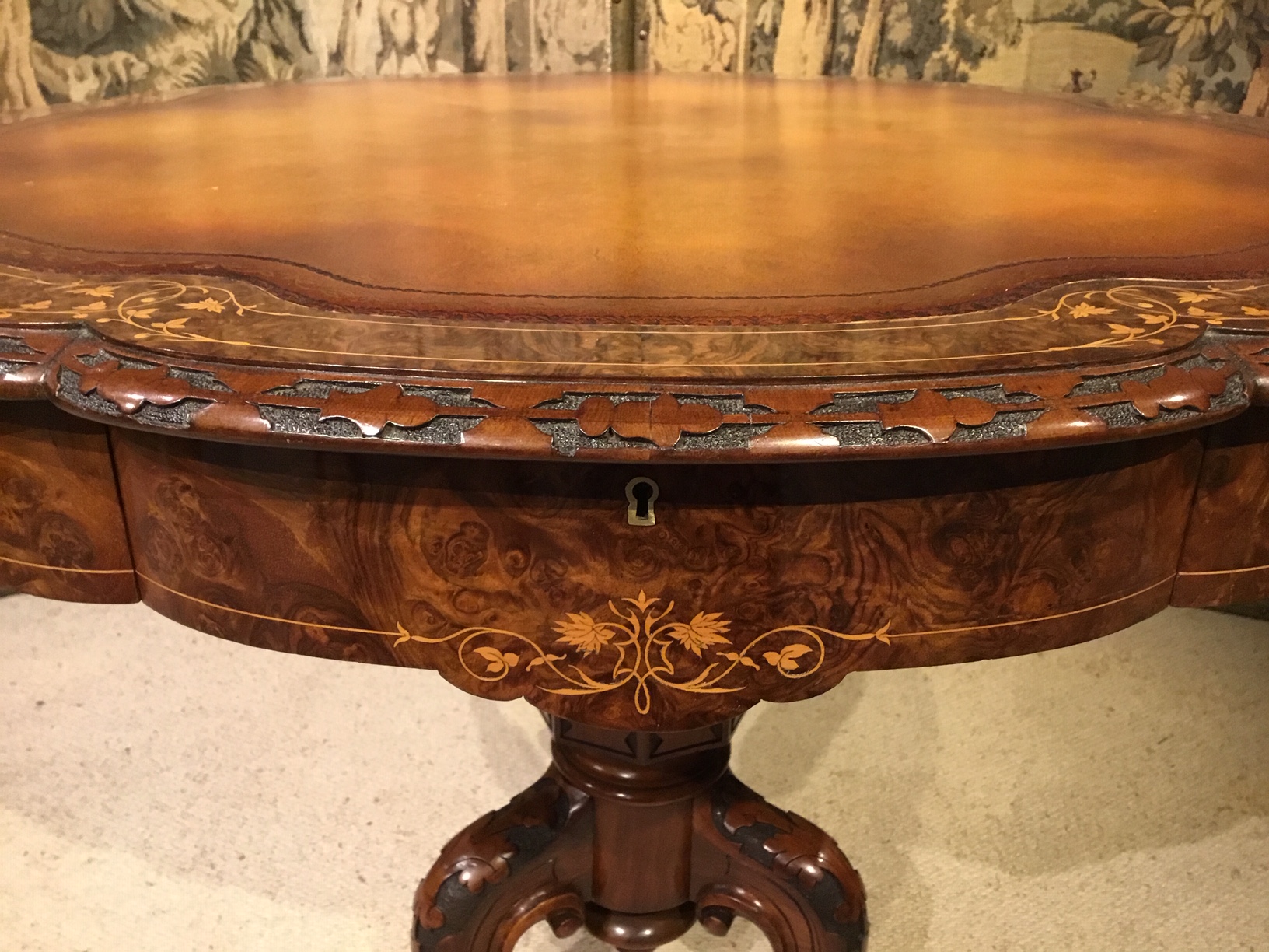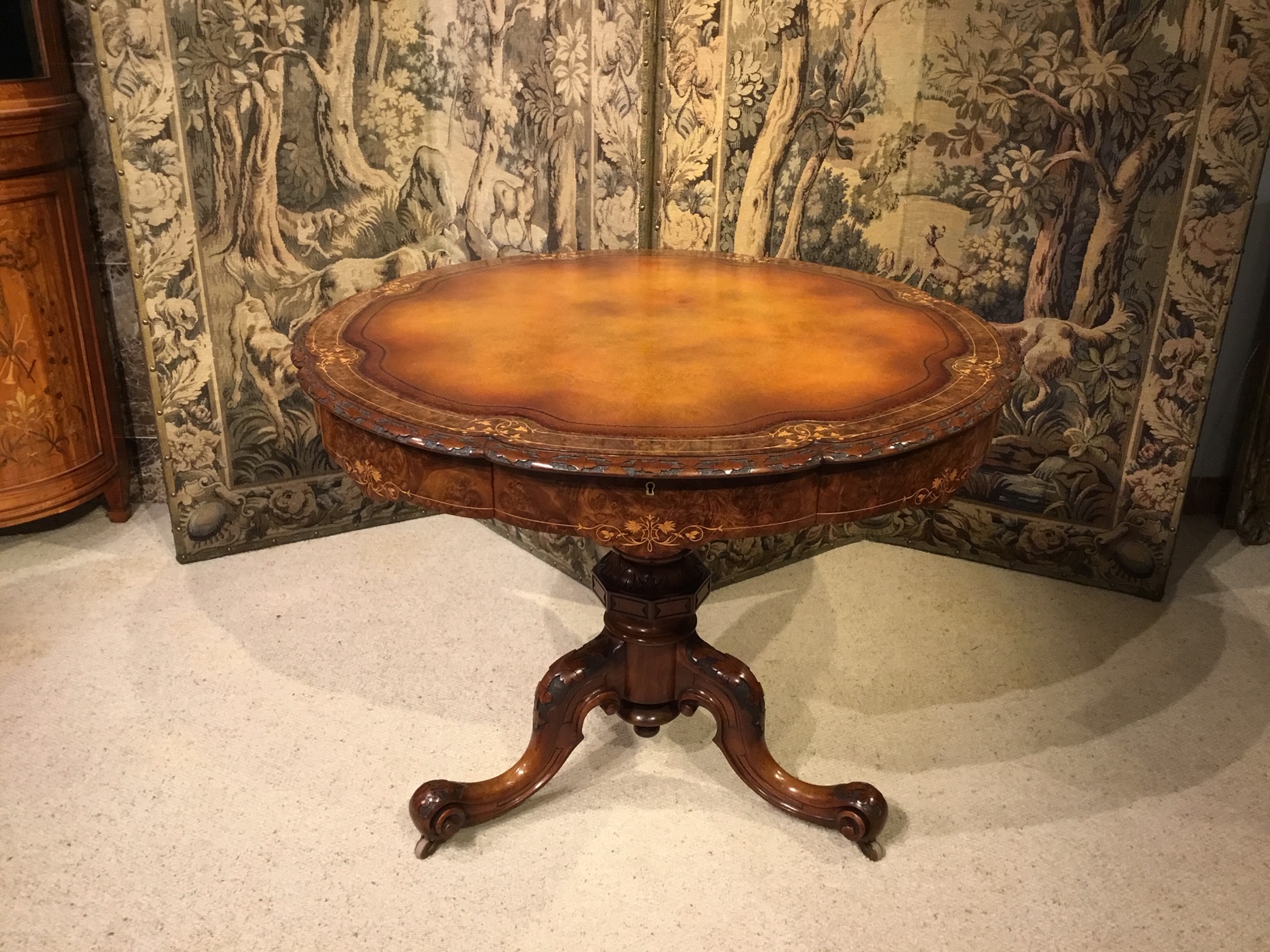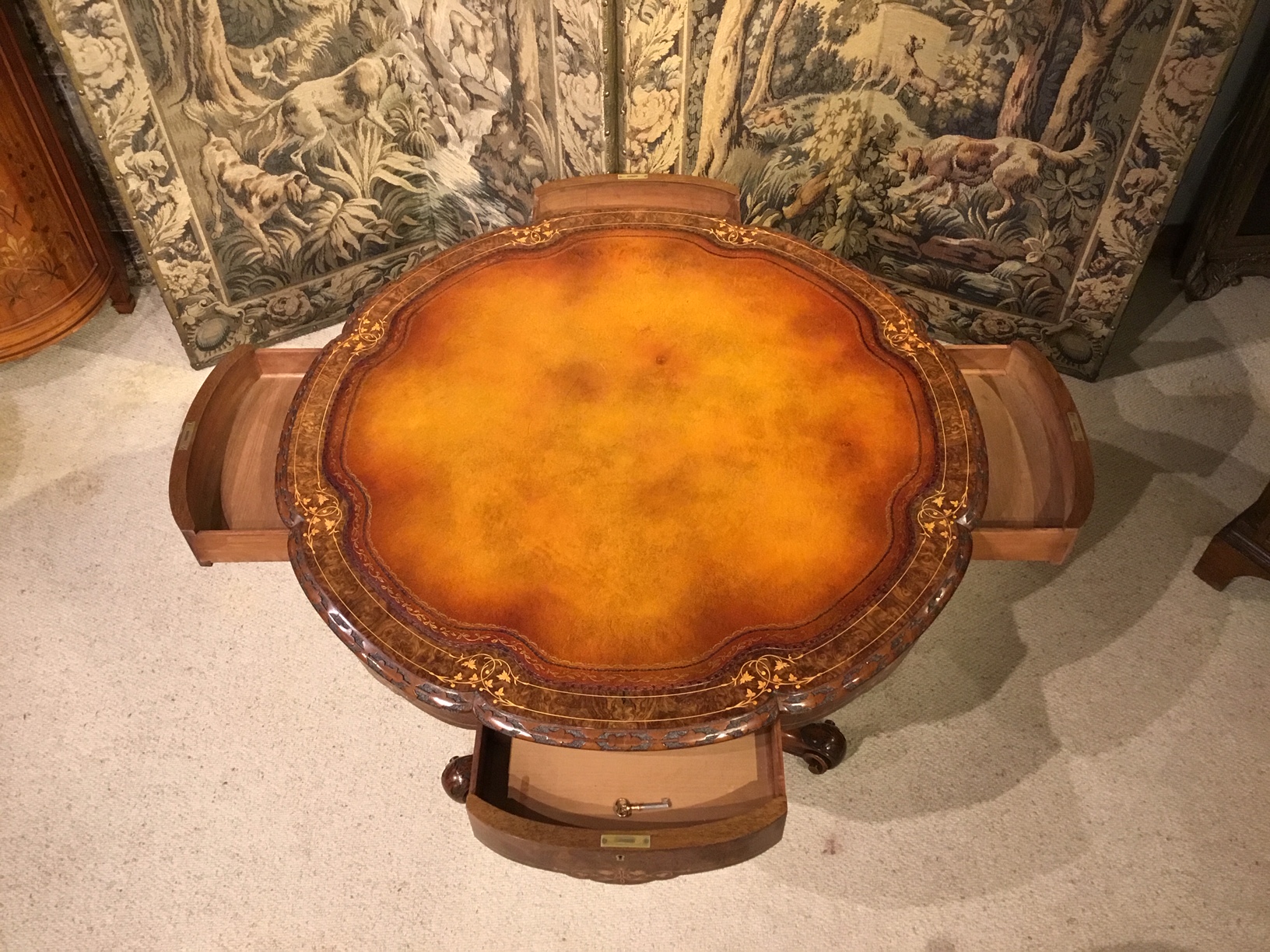 CompareA Fine Quality Victorian Period burr walnut & marquetry inlaid drum table. The scalloped shaped top having an inset tan leather with gilt and blind tooled detail, with boxwood foliate marquetry inlay to the burr walnut border and finely moulded edge. The frieze having four mahogany lined drawers with further foliate marquetry inlaid detail. Supported on a turned and carved octagonal column with finely carved cabriole supports and brass and porcelain castors. English circa 1860-1870, in superb condition, newly replaced leather insert