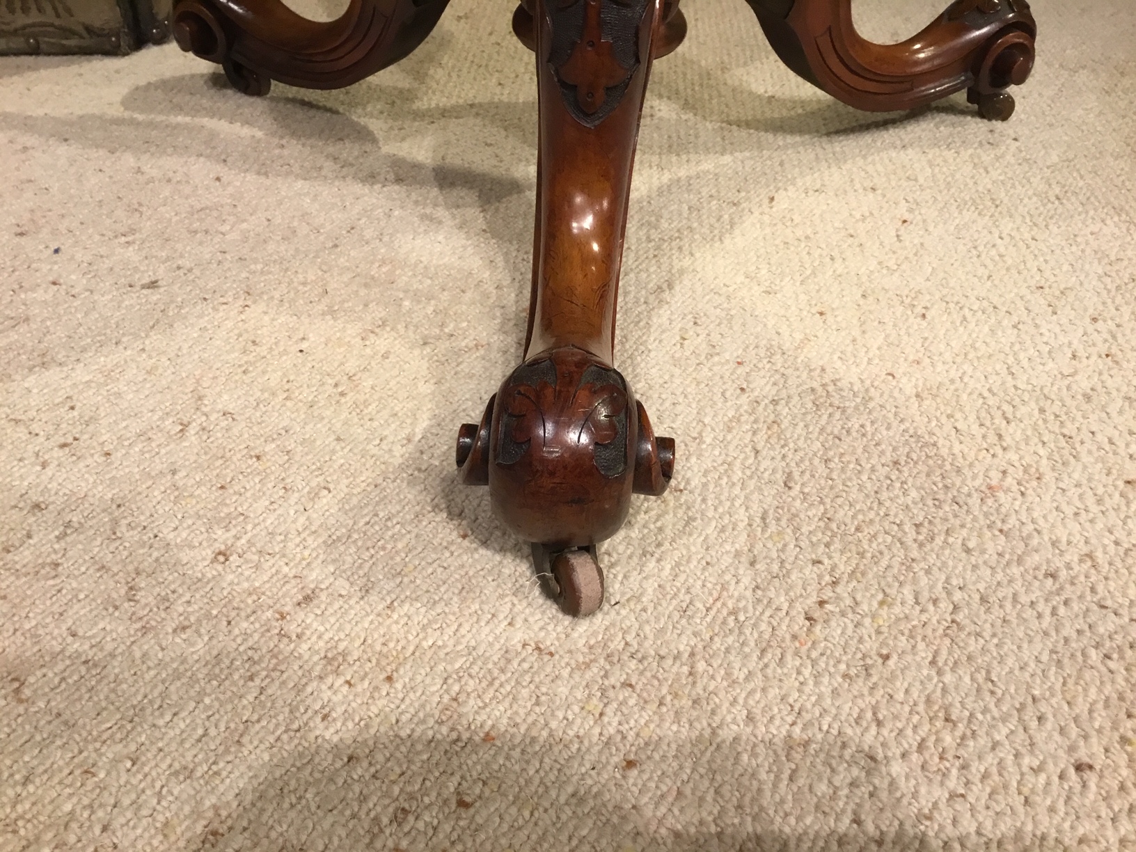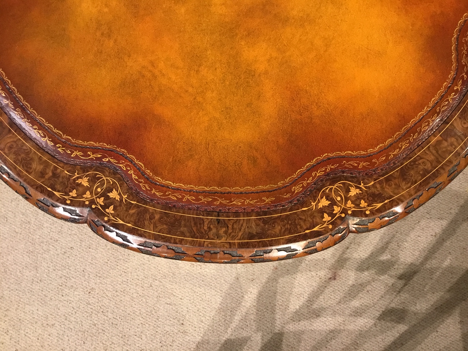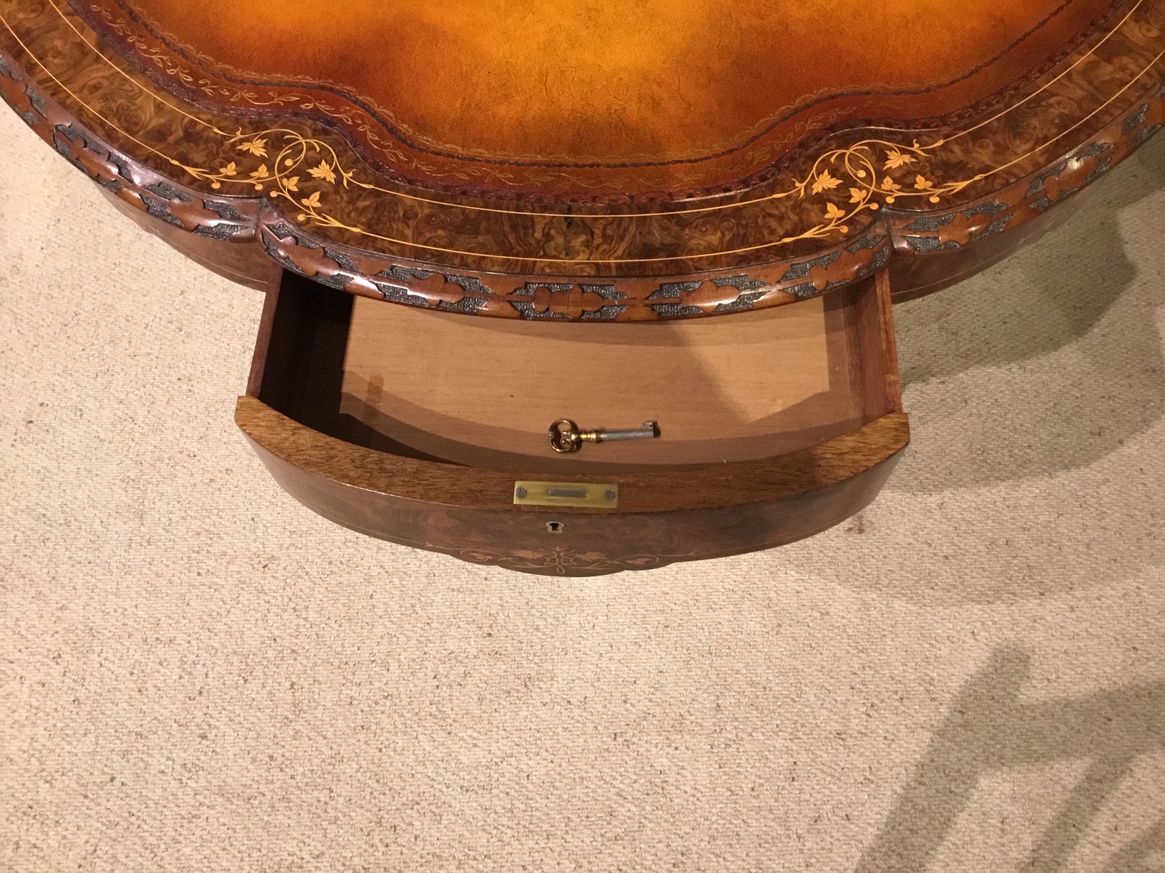 CompareA Fine Quality Victorian Period burr walnut & marquetry inlaid drum table. The scalloped shaped top having an inset tan leather with gilt and blind tooled detail, with boxwood foliate marquetry inlay to the burr walnut border and finely moulded edge. The frieze having four mahogany lined drawers with further foliate marquetry inlaid detail. Supported on a turned and carved octagonal column with finely carved cabriole supports and brass and porcelain castors. English circa 1860-1870, in superb condition, newly replaced leather insert