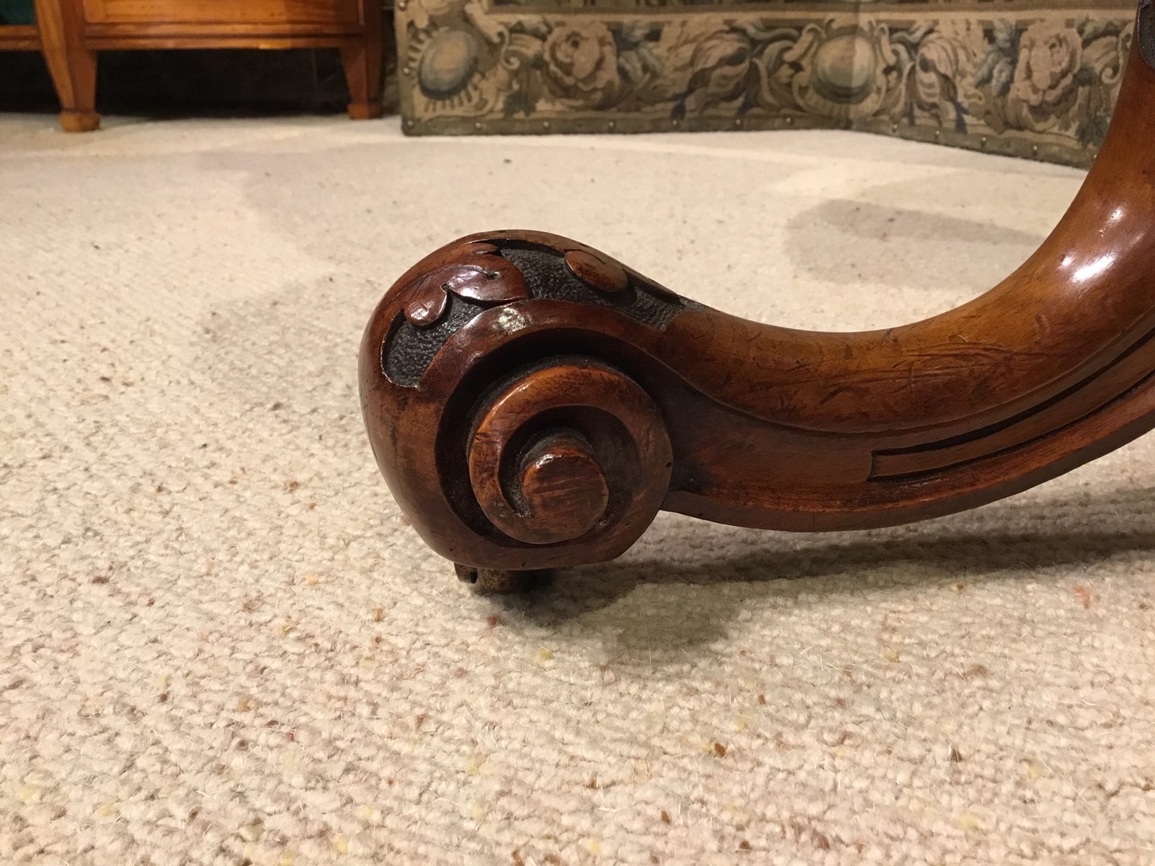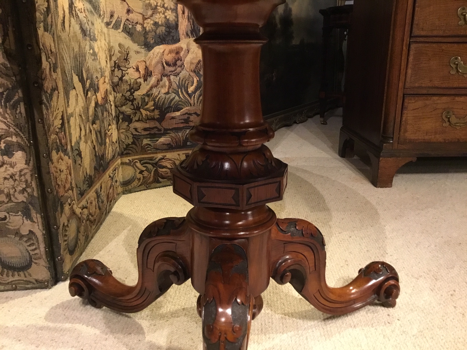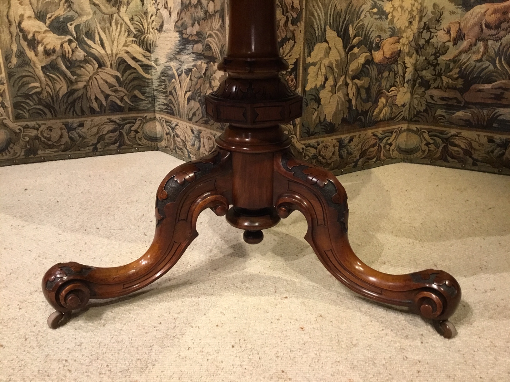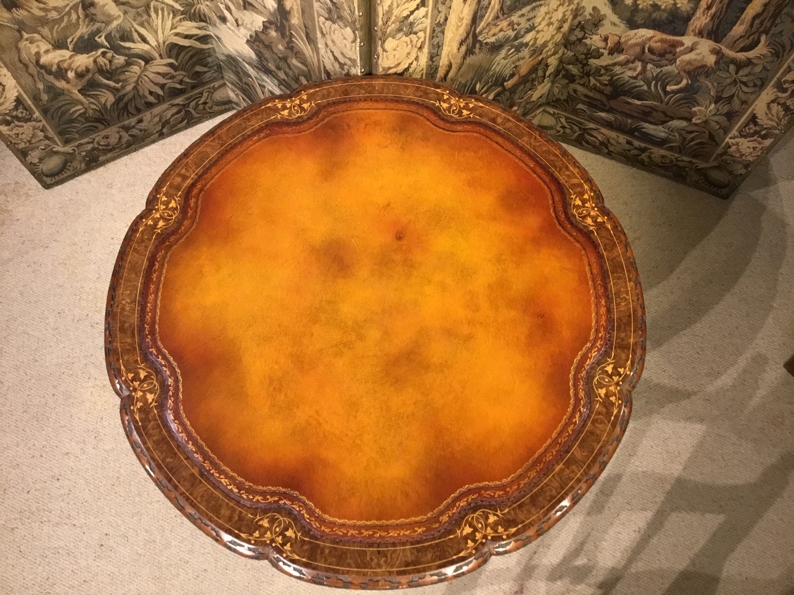 CompareA Fine Quality Victorian Period burr walnut & marquetry inlaid drum table. The scalloped shaped top having an inset tan leather with gilt and blind tooled detail, with boxwood foliate marquetry inlay to the burr walnut border and finely moulded edge. The frieze having four mahogany lined drawers with further foliate marquetry inlaid detail. Supported on a turned and carved octagonal column with finely carved cabriole supports and brass and porcelain castors. English circa 1860-1870, in superb condition, newly replaced leather insert