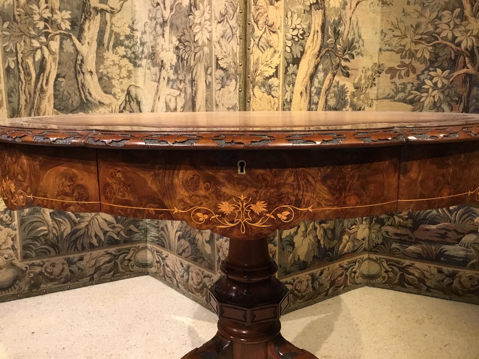 A Fine Quality Victorian Period burr walnut & marquetry inlaid drum table