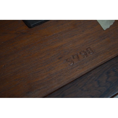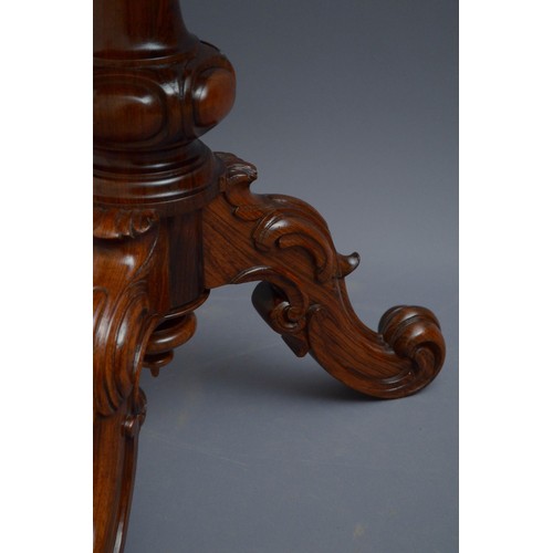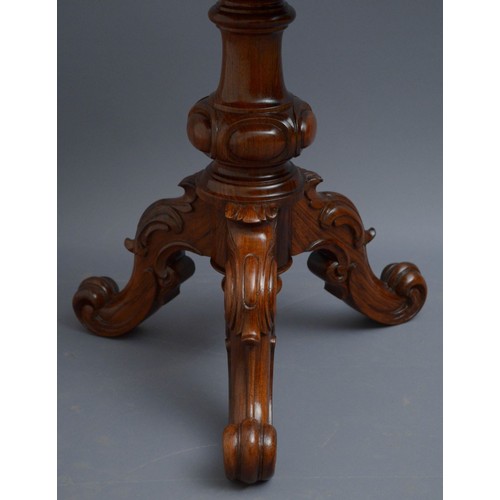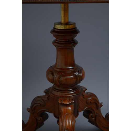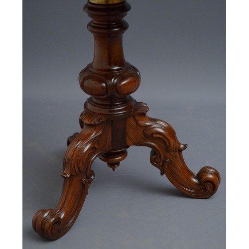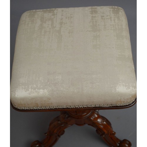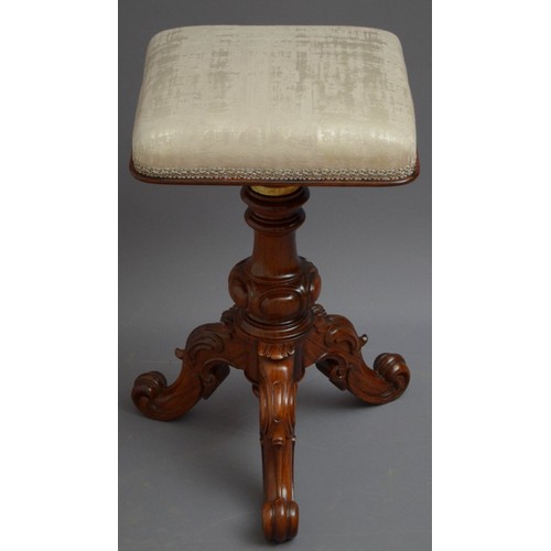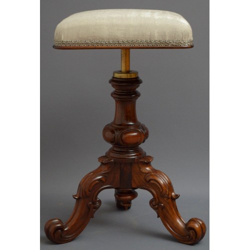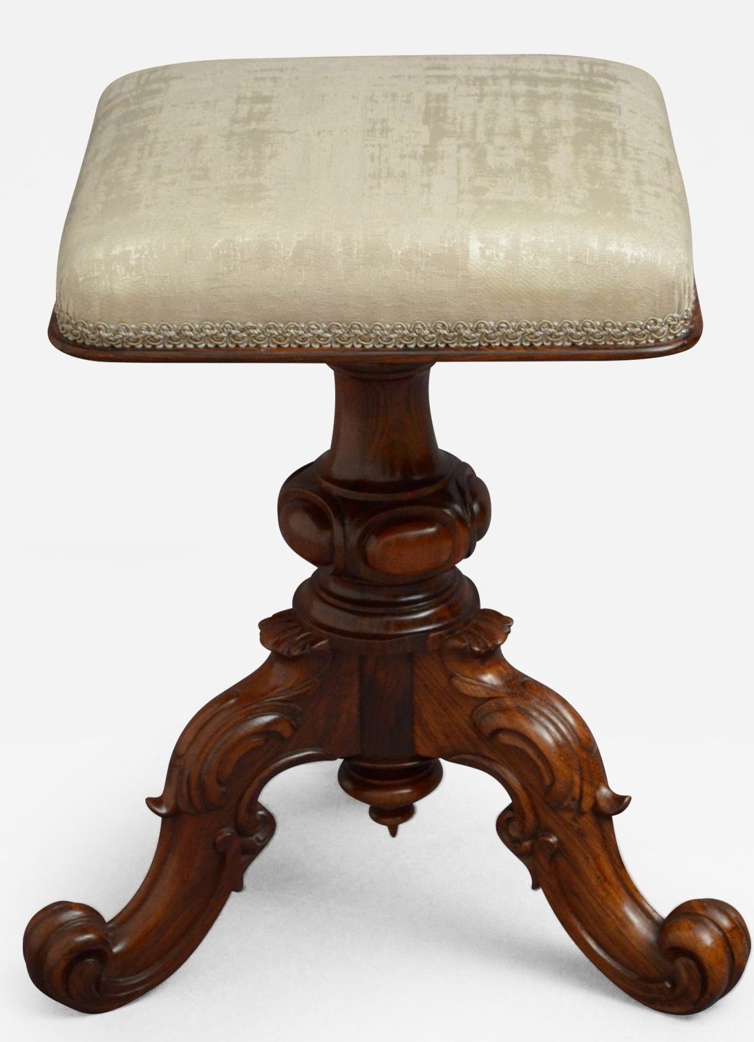 A Fine quality Victorian Period rosewood antique piano stool. Having a height adjustable seat and carved column terminating in three finely carved cabriole legs. The stool bears makers label and serial number stamp. In superb condition. Newly re-upholstered. English Circa 1850