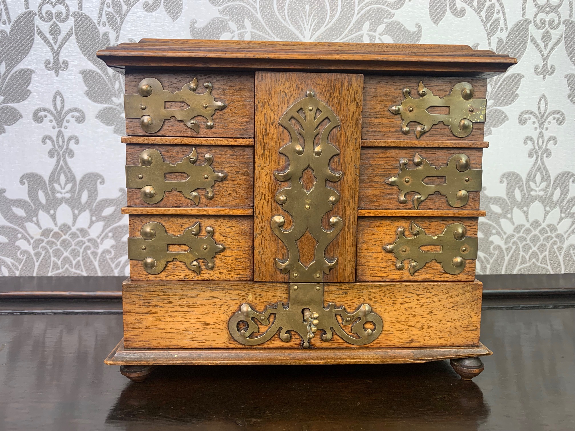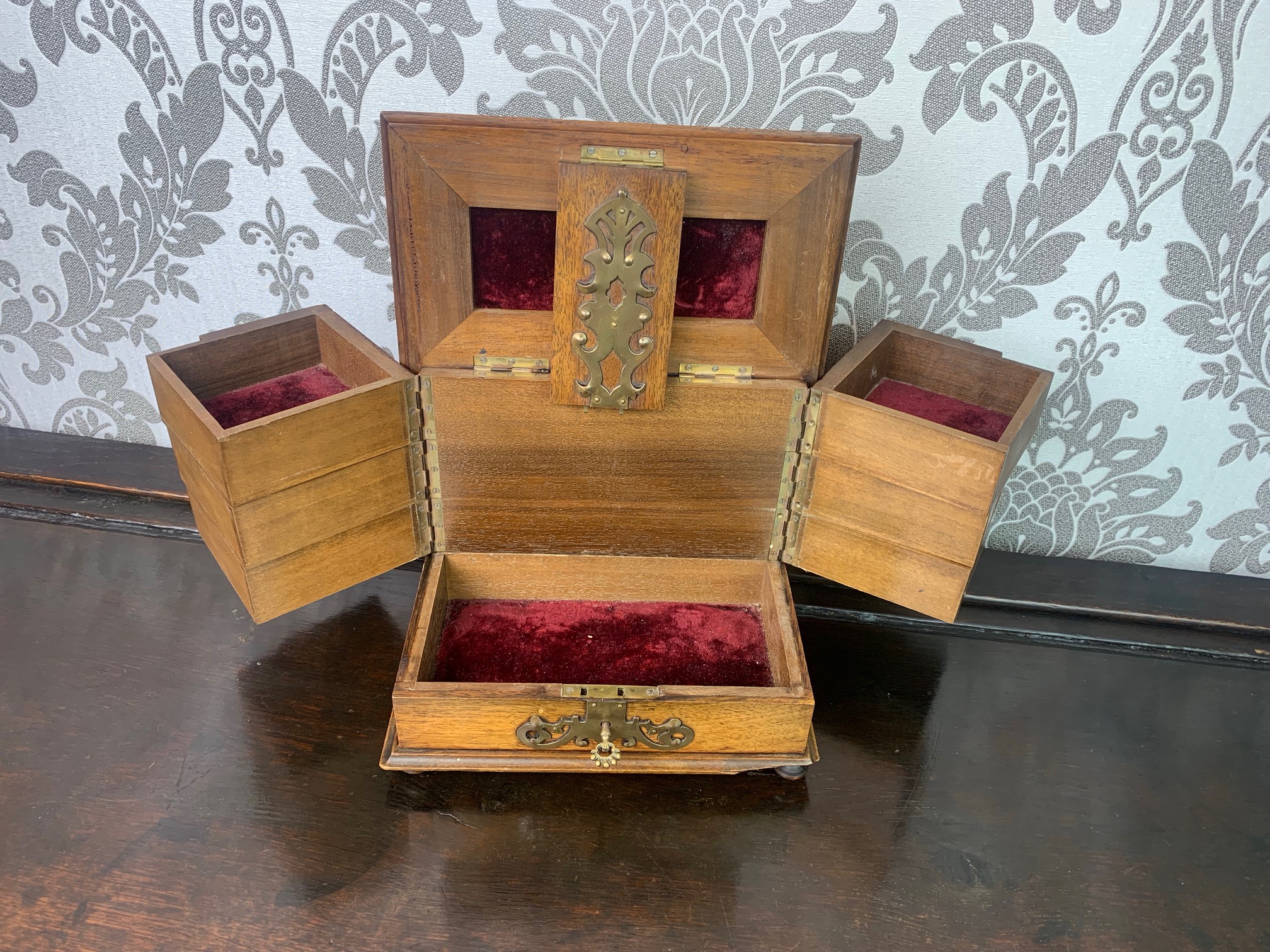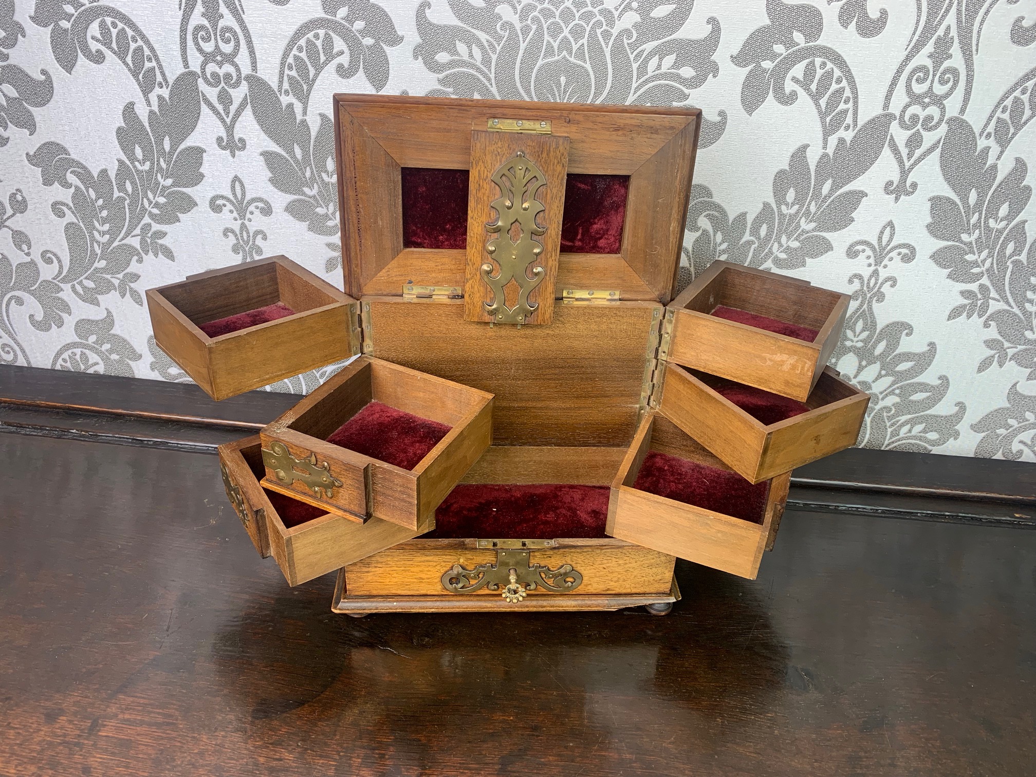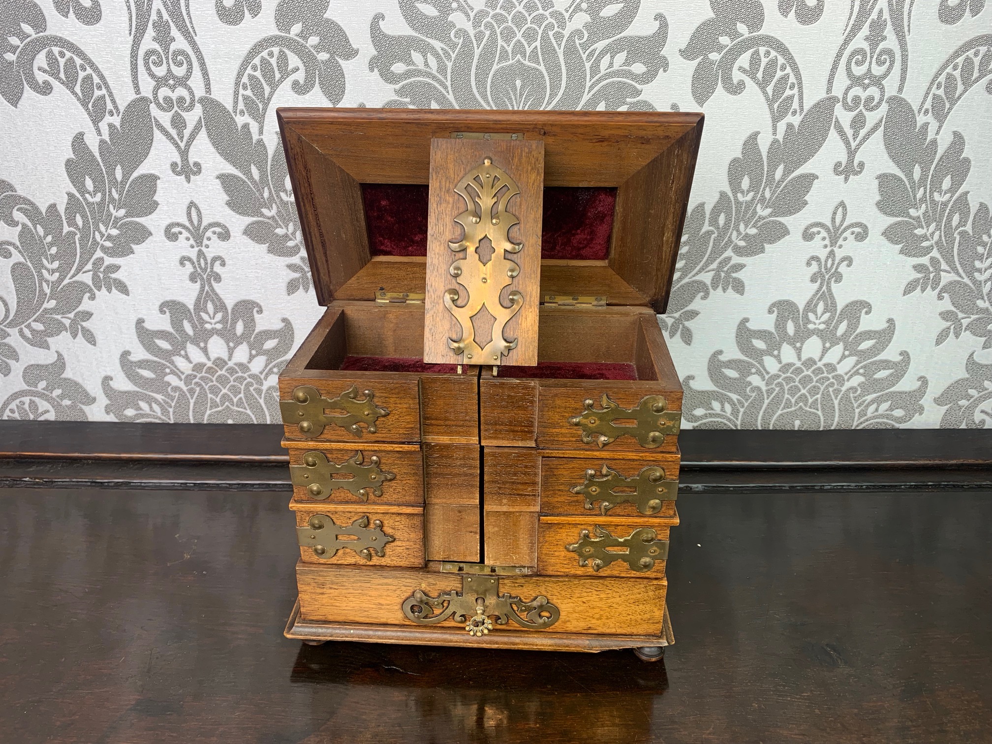 CompareA fine quality walnut and brass banded jewellery casket. Constructed throughout in the finest quality walnut, brass mounts and lock plate. The hinged top opens to reveal an arrangement of velvet lined jewellery boxes which hinge and swing out with a further section to the base. European circa 1880-1900