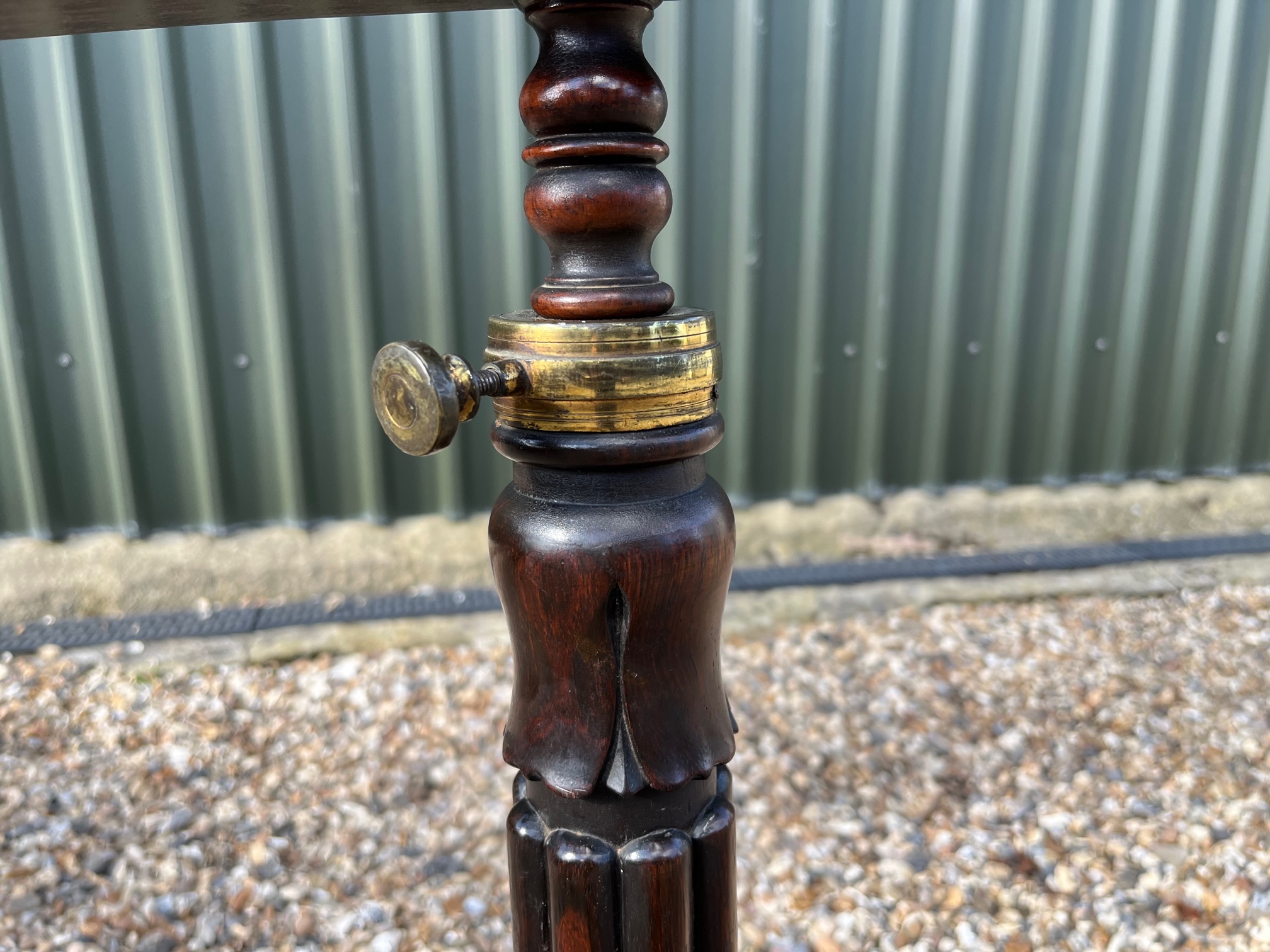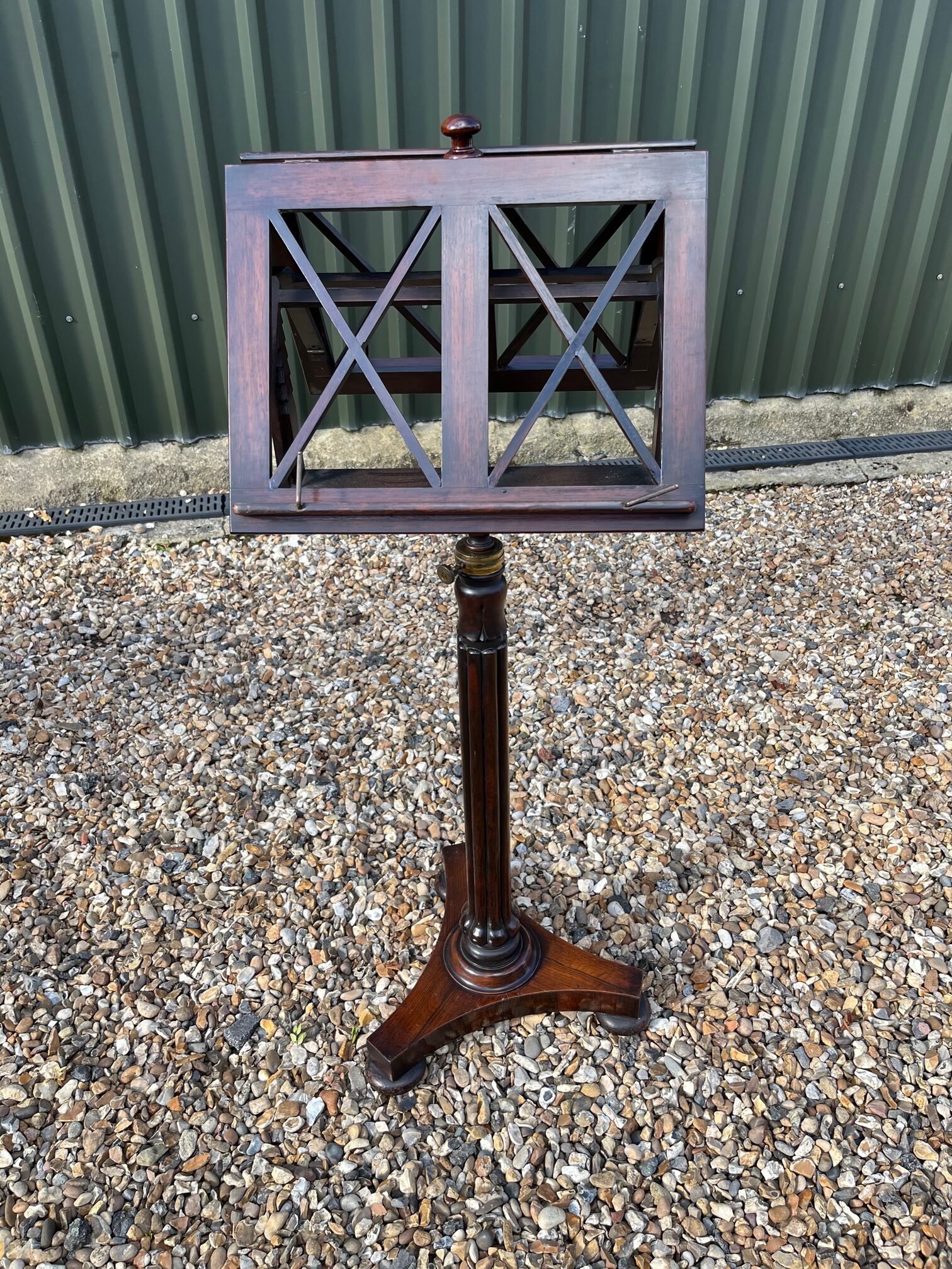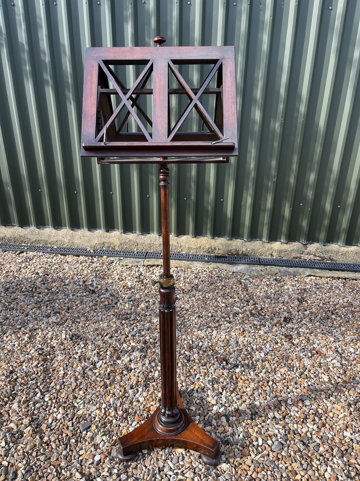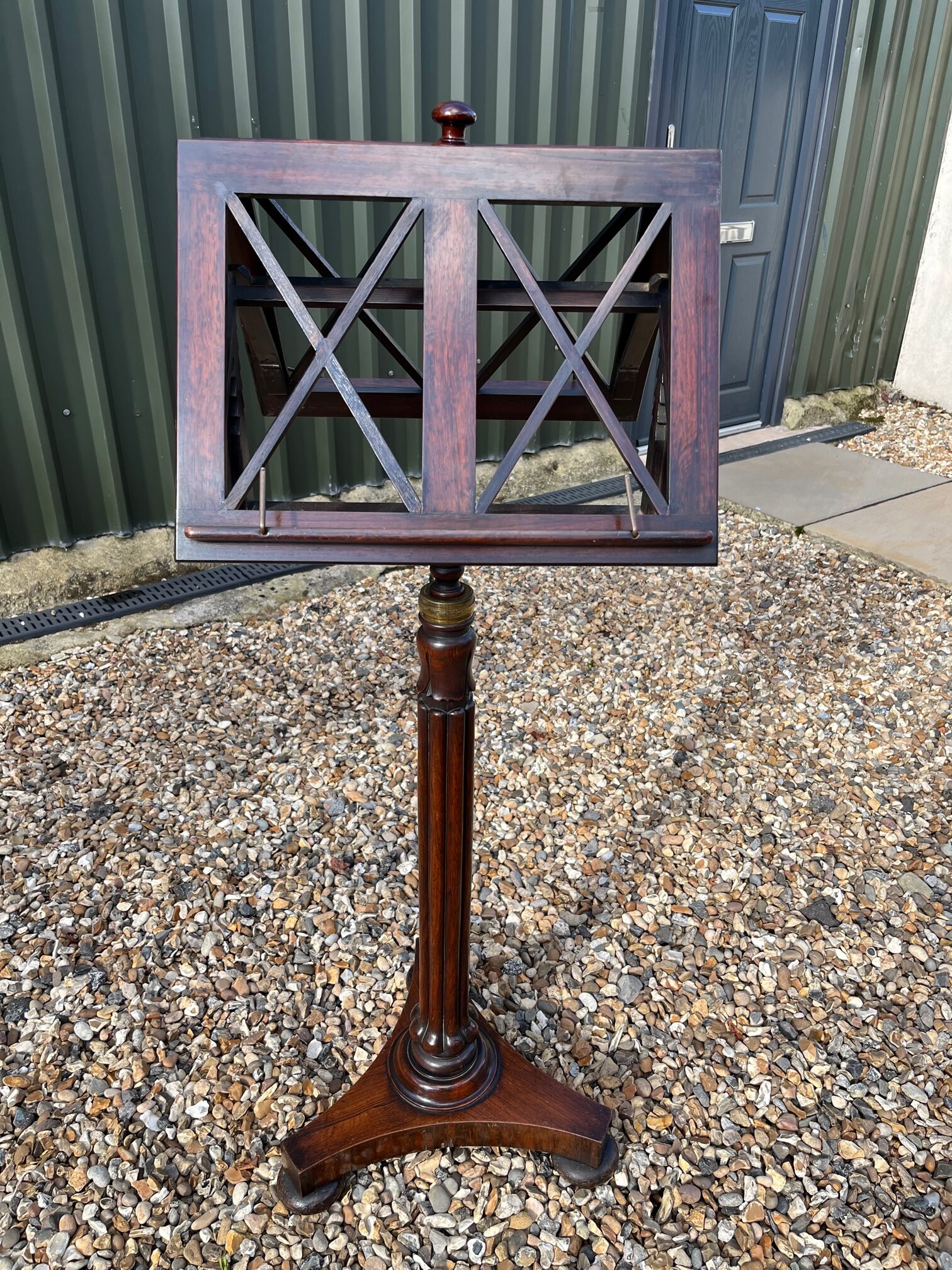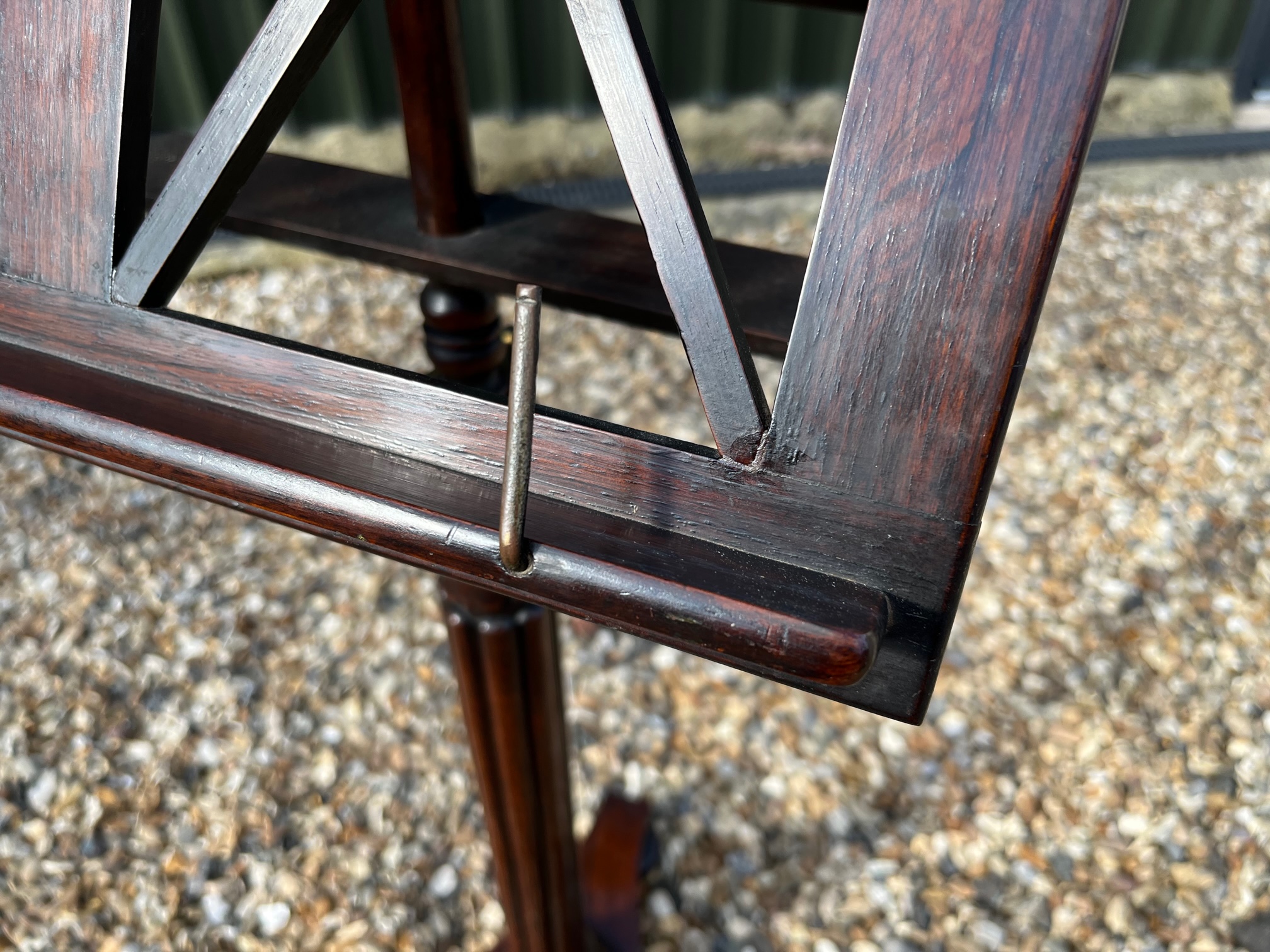 A fine quality William IV Period rosewood duet music stand. Constructed in the finest rosewood throughout and having twin adjustable ratcheted music stands which can be raised and lowered from the telescopic stem. The column support beautifully reeded and raised on a triform base with turned bun feet. English circa 1830-1840, in excellent condition.