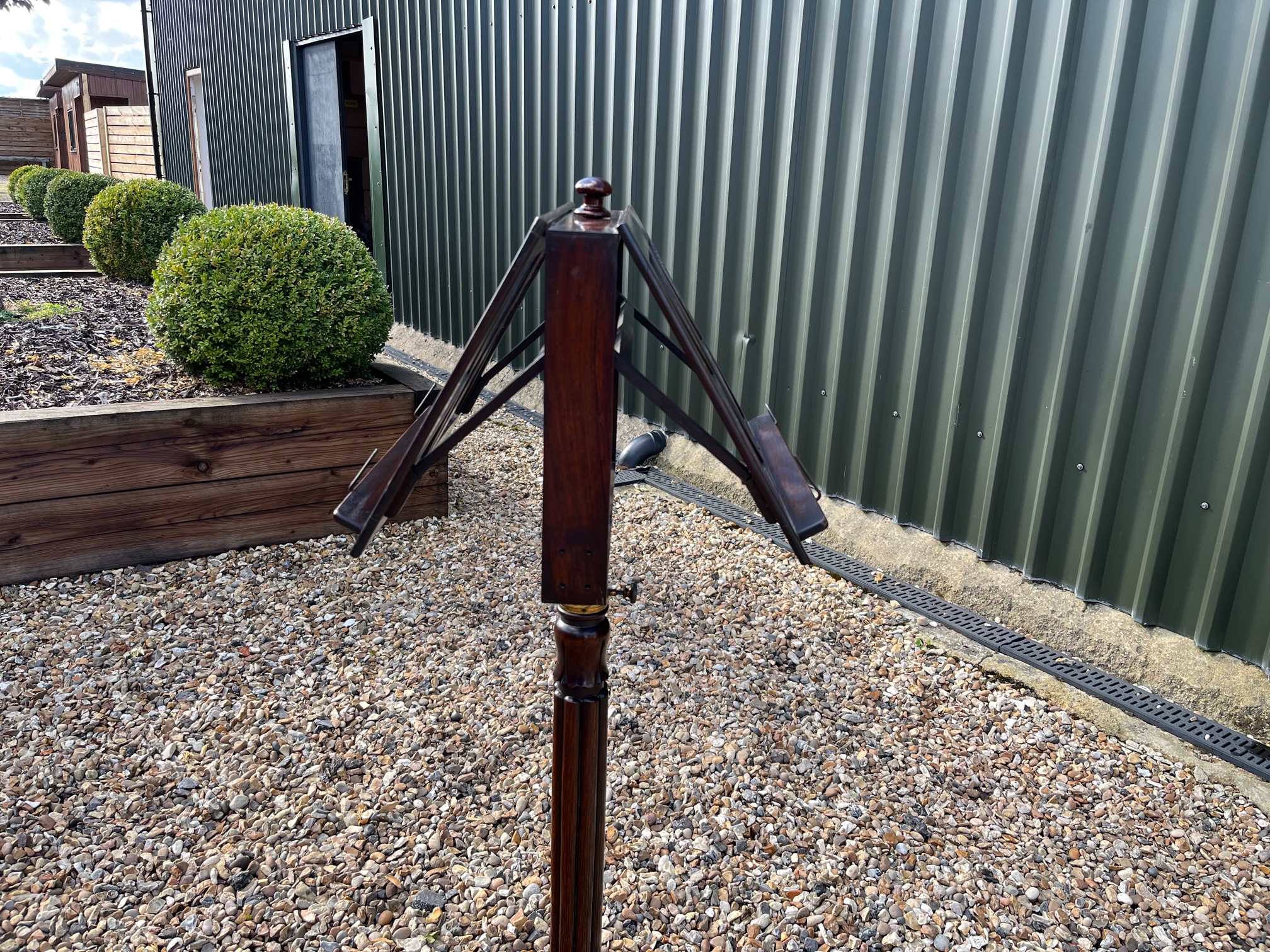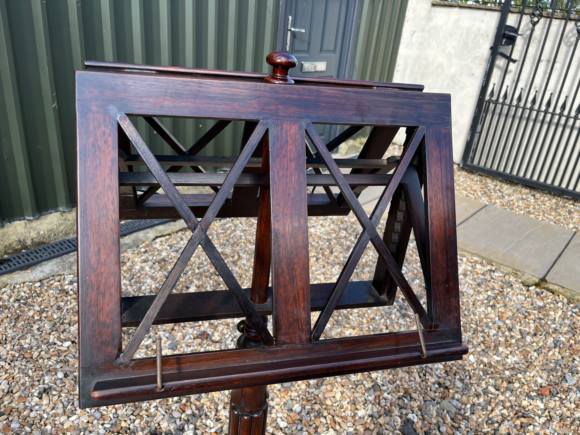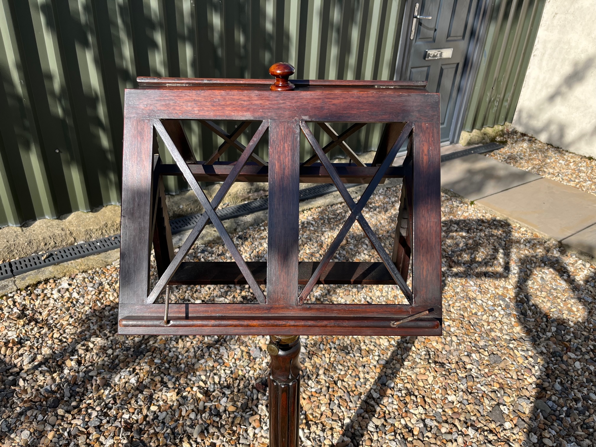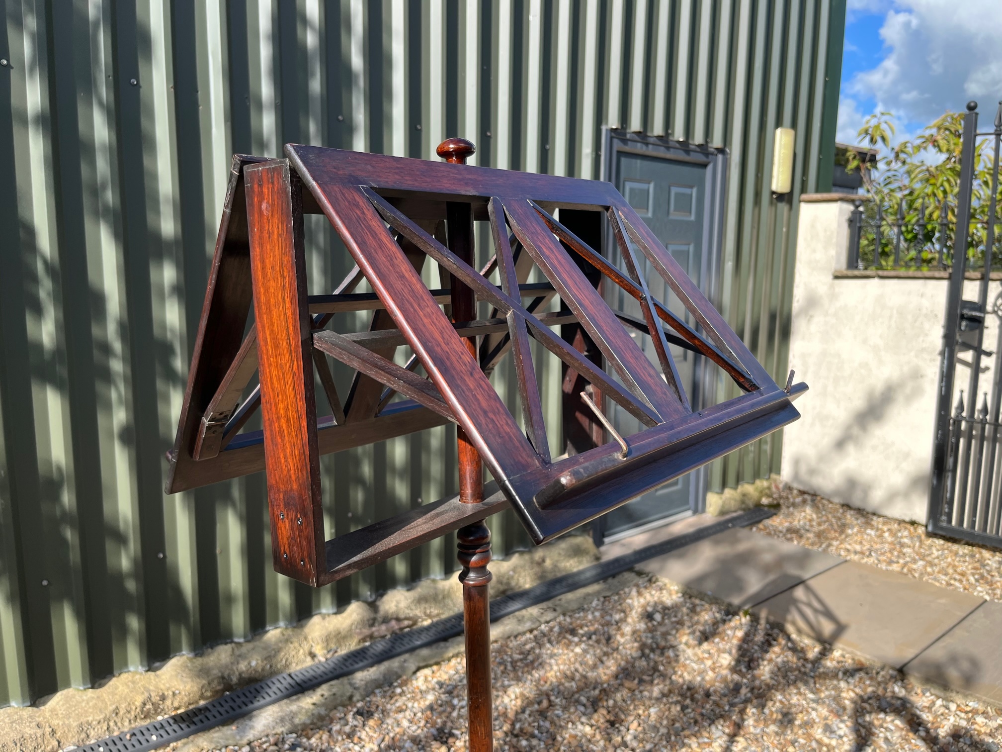 A fine quality William IV Period rosewood duet music stand. Constructed in the finest rosewood throughout and having twin adjustable ratcheted music stands which can be raised and lowered from the telescopic stem. The column support beautifully reeded and raised on a triform base with turned bun feet. English circa 1830-1840, in excellent condition.