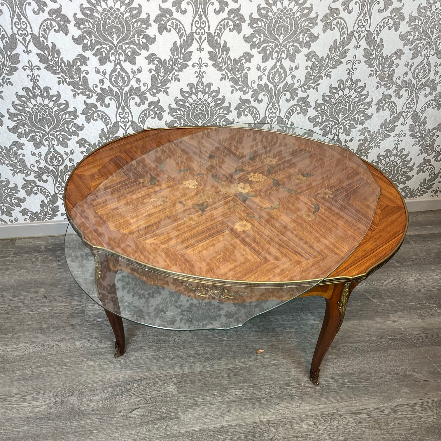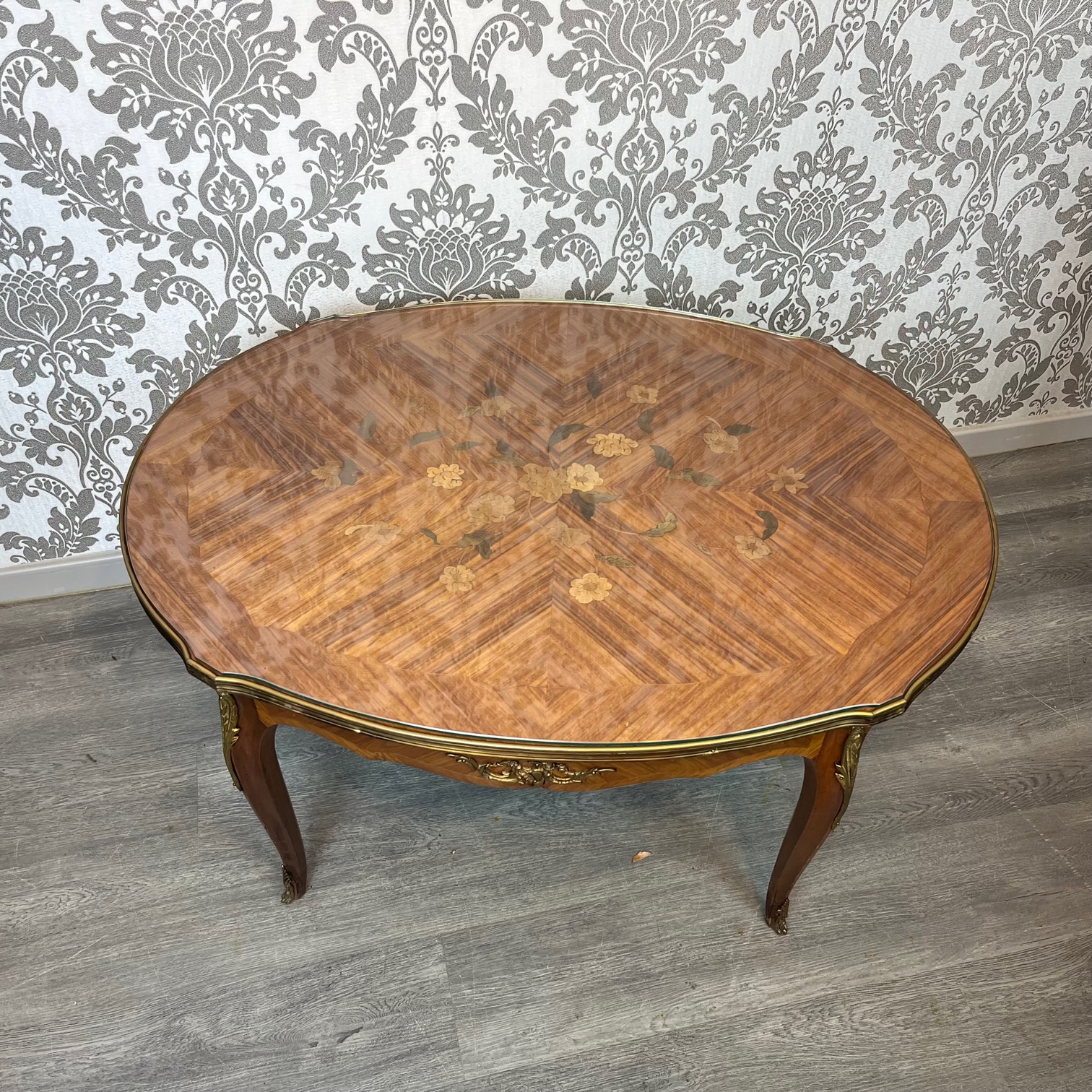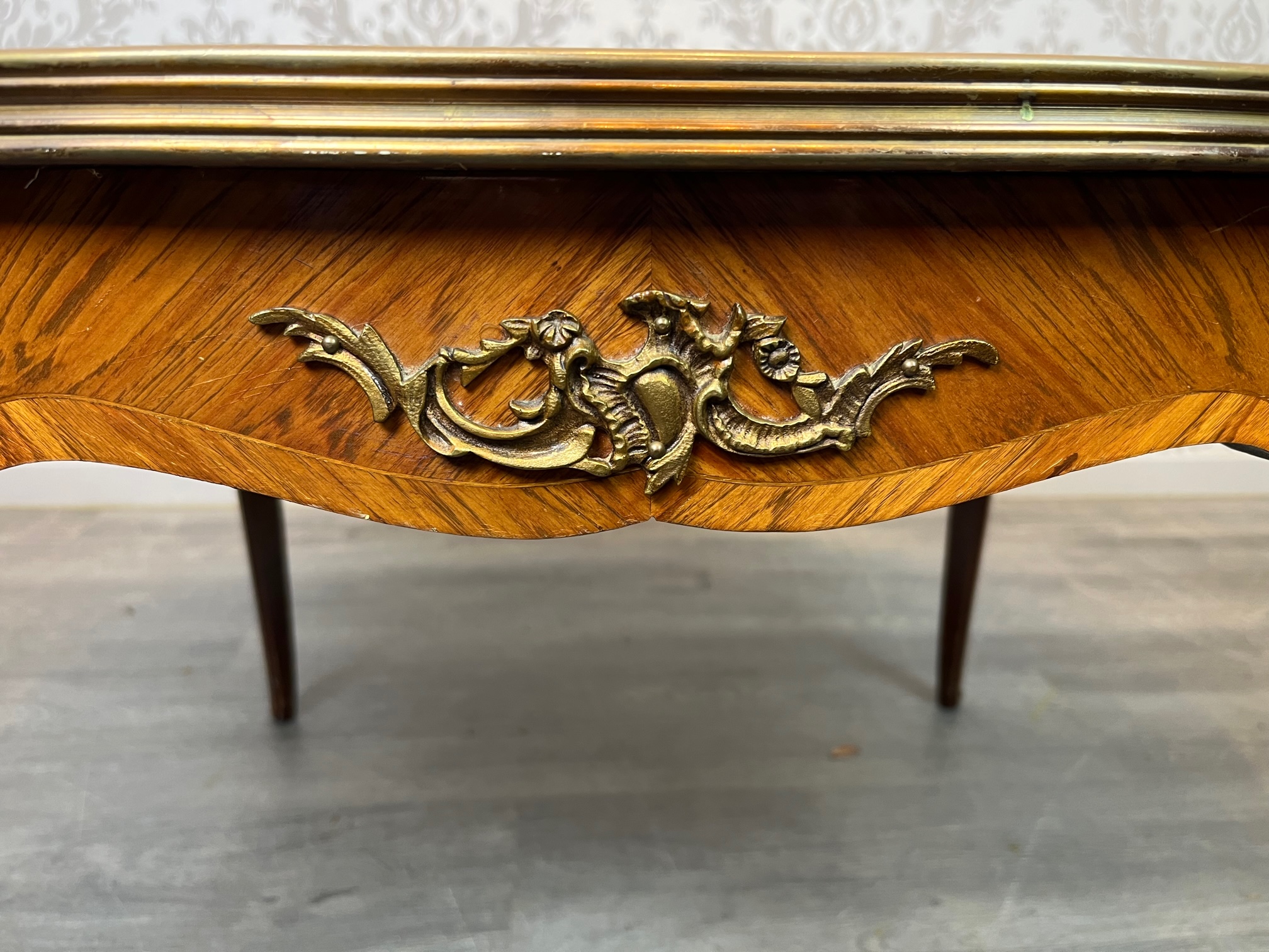 CompareA French kingwood and brass mounted coffee table. The shaped top veneered in kingwood with marquetry floral inlay with a brass moulded edge. The frieze also veneered in kingwood and banded with brass mounts. Raised on brass mounted cabriole supports with drop in glass top. French circa 1920