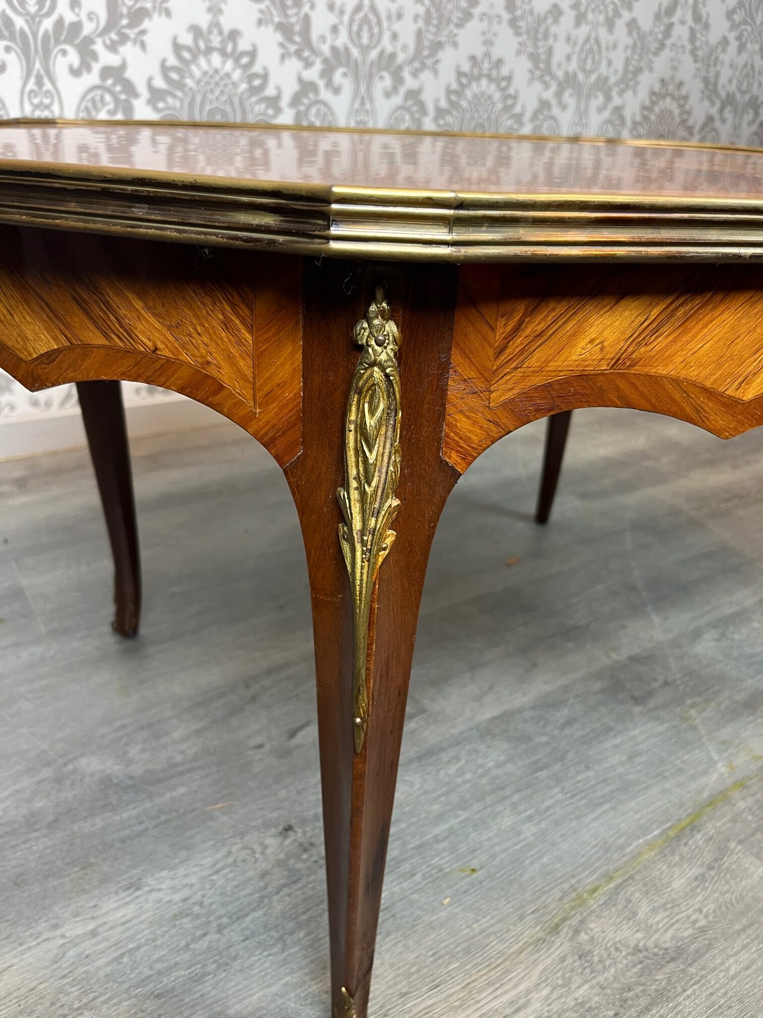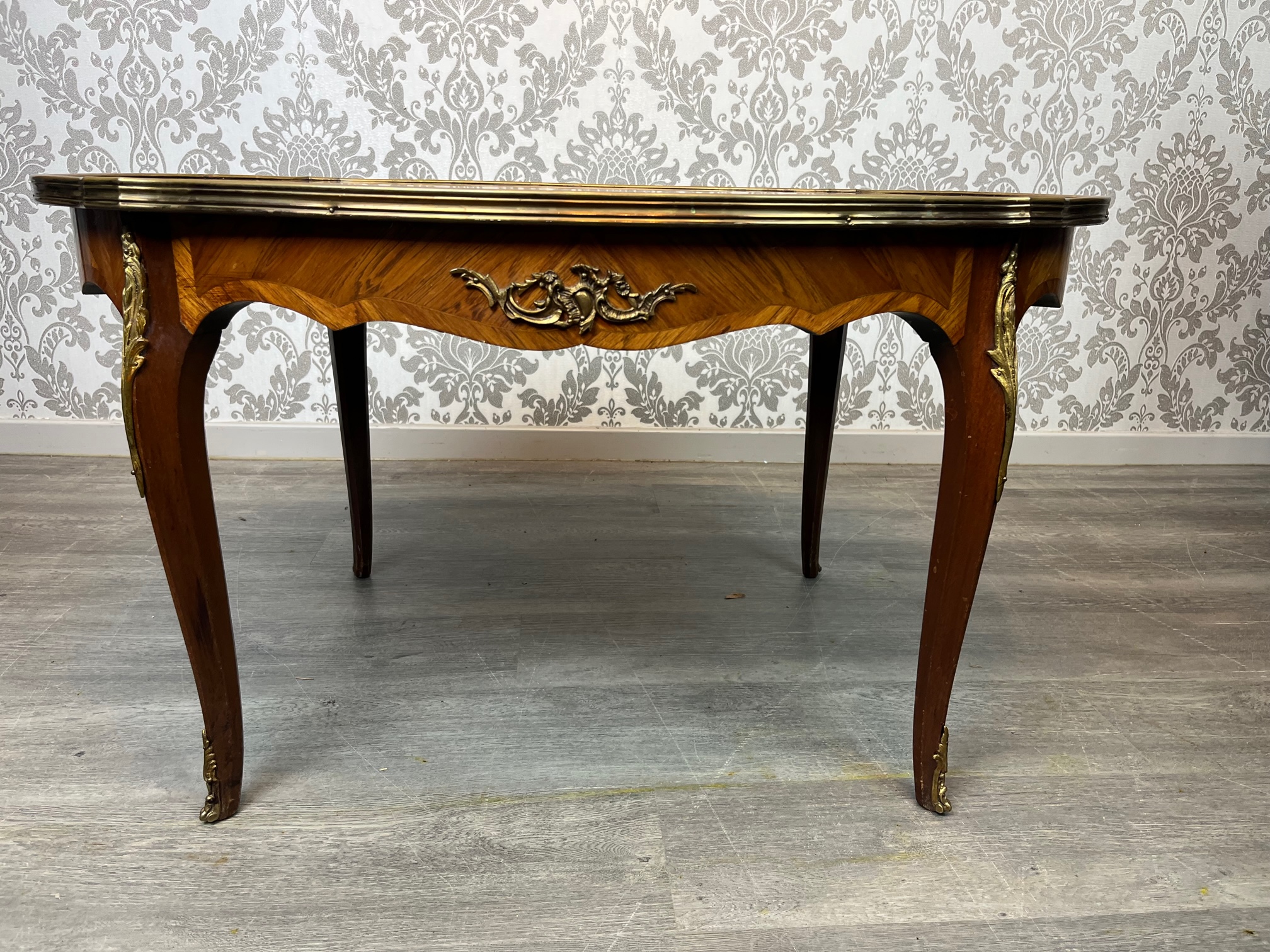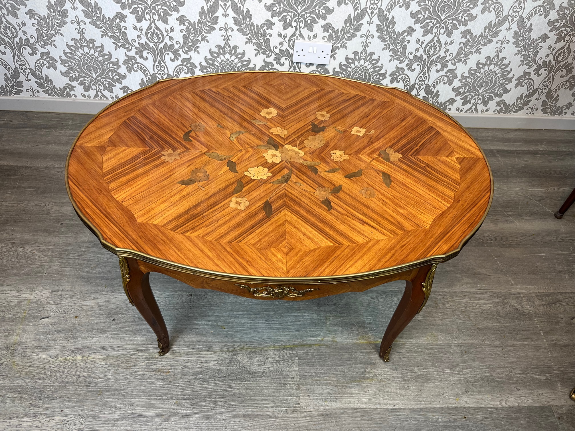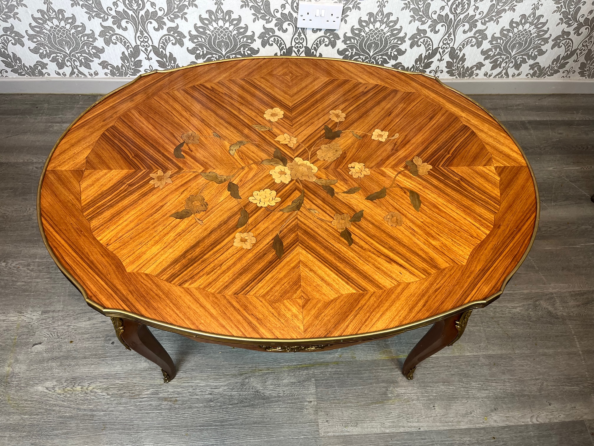 CompareA French kingwood and brass mounted coffee table. The shaped top veneered in kingwood with marquetry floral inlay with a brass moulded edge. The frieze also veneered in kingwood and banded with brass mounts. Raised on brass mounted cabriole supports with drop in glass top. French circa 1920