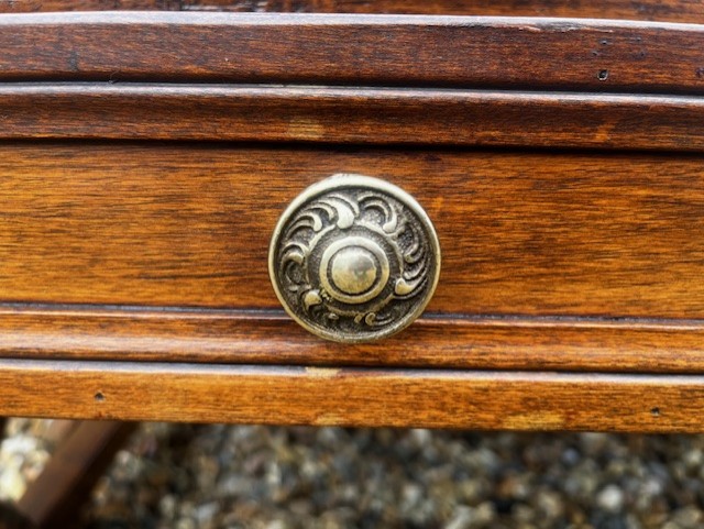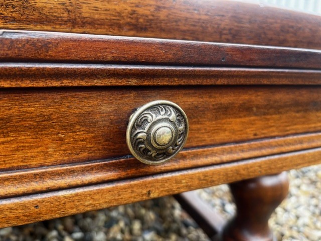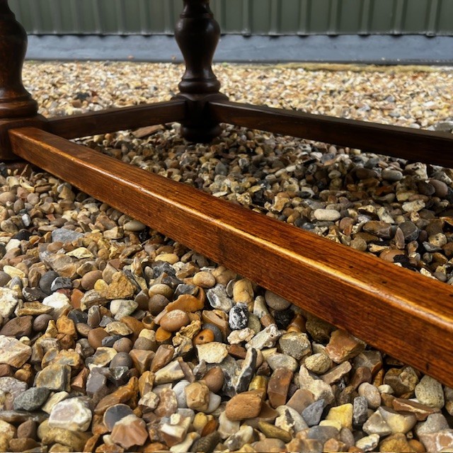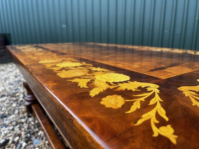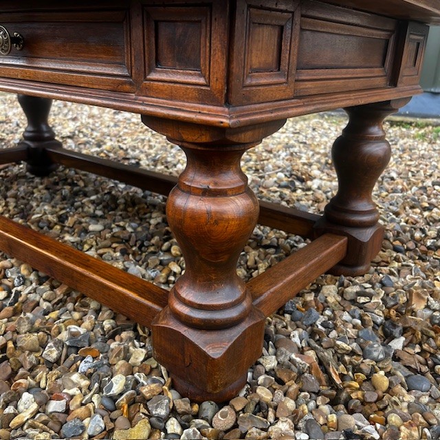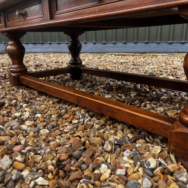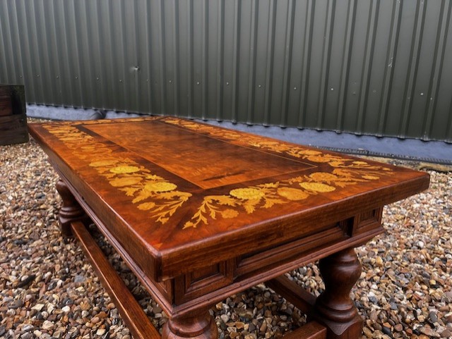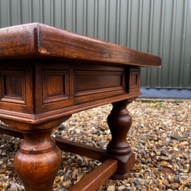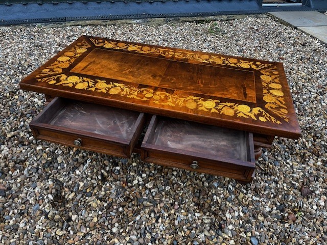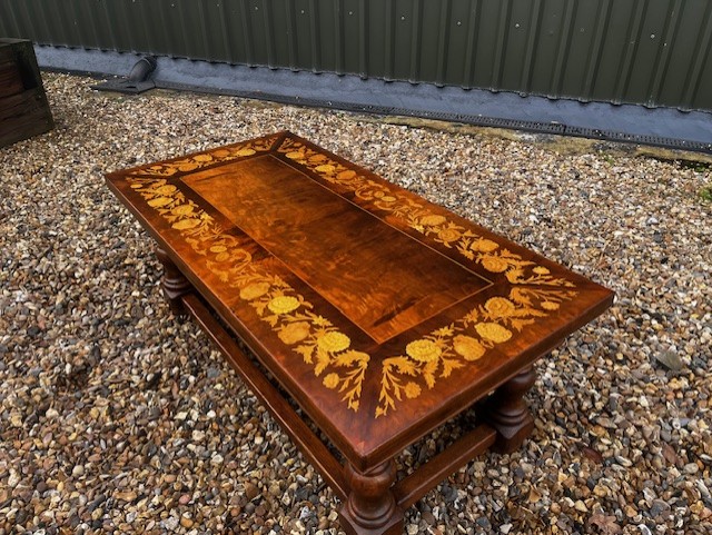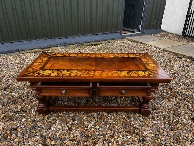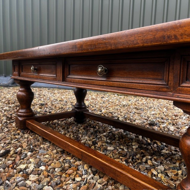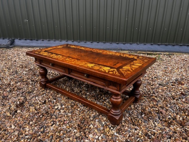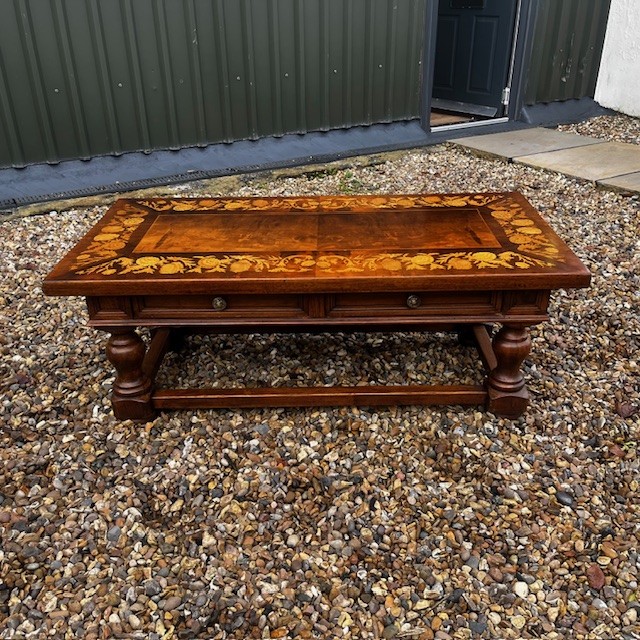 A French Oak & Walnut Coffee Table. The rectangular top having a floral marquetry border with a central walnut panel. Raised on bulbous turned supports, united by stretchers and the front having two oak lined drawers with brass drawer pulls. French circa 1900-1920