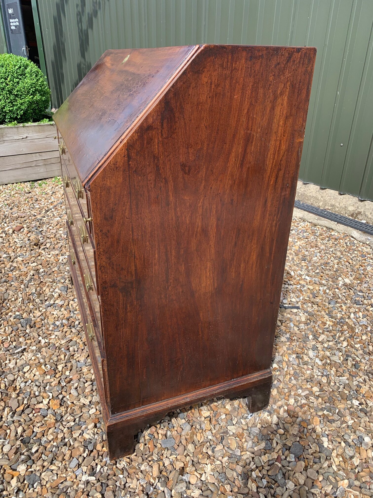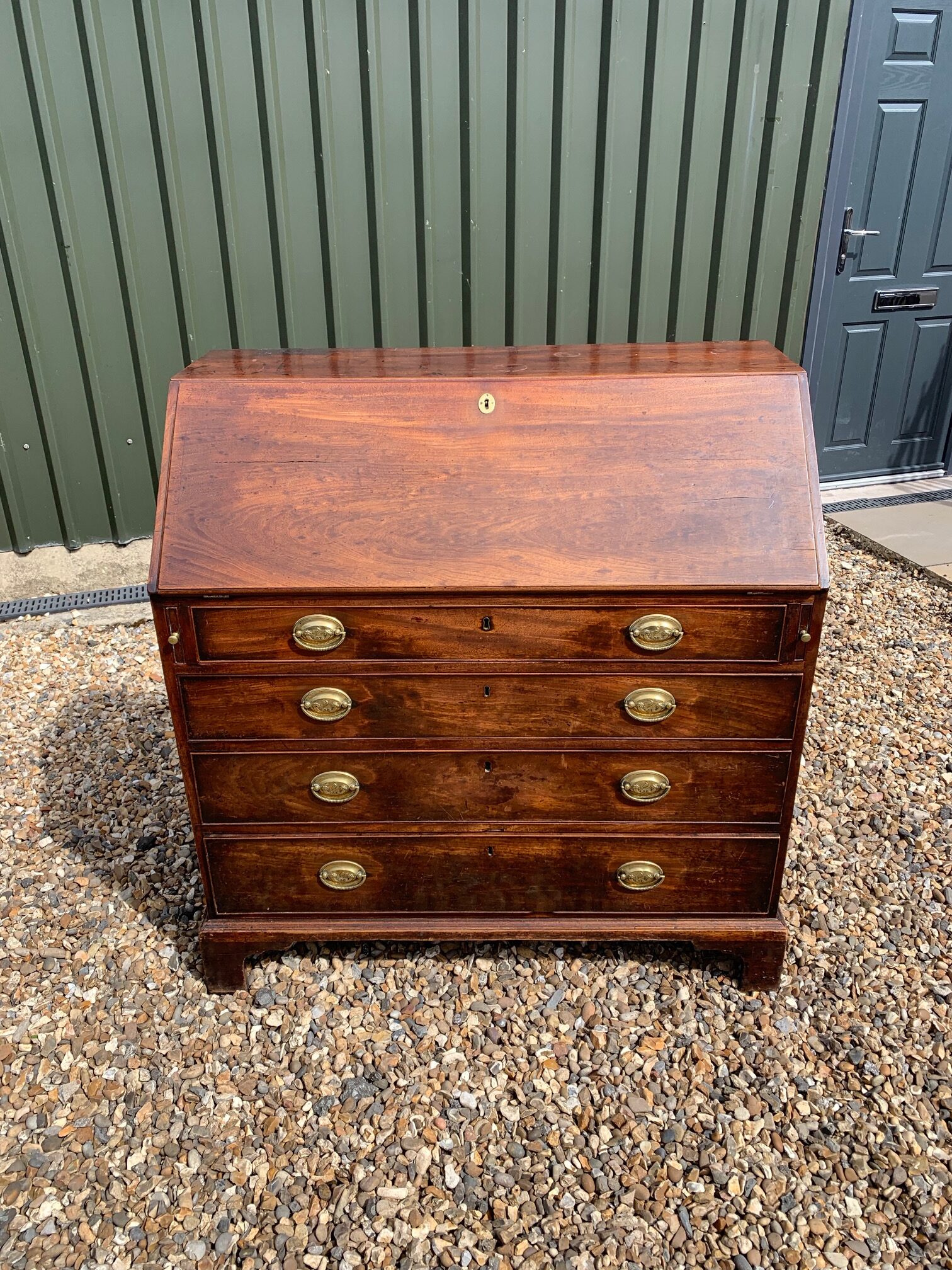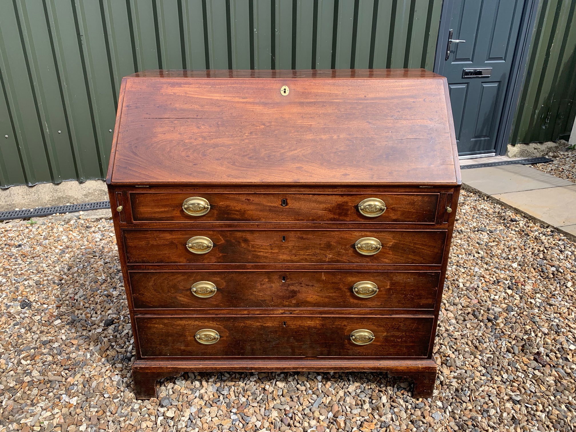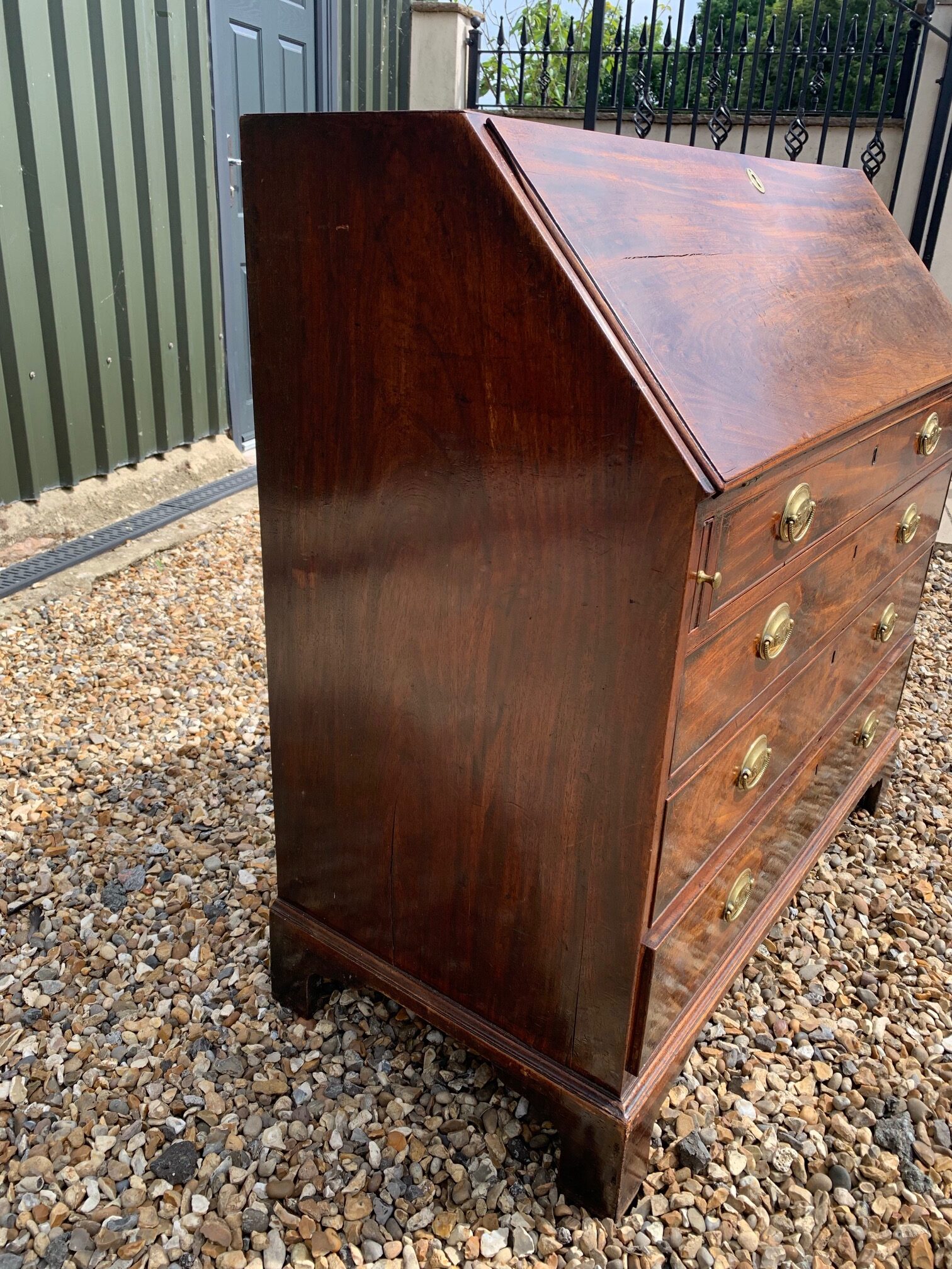 A George III Period mahogany bureau. Constructed throughout in beautifully figured Cuban mahogany and having a sloping front which opens to reveal a fitted interior with a baize lined writing surface retaining the original oval brass handles, having solid mahogany sides and raised on the original shaped bracket feet. English circa 1780-1800 in good original condition