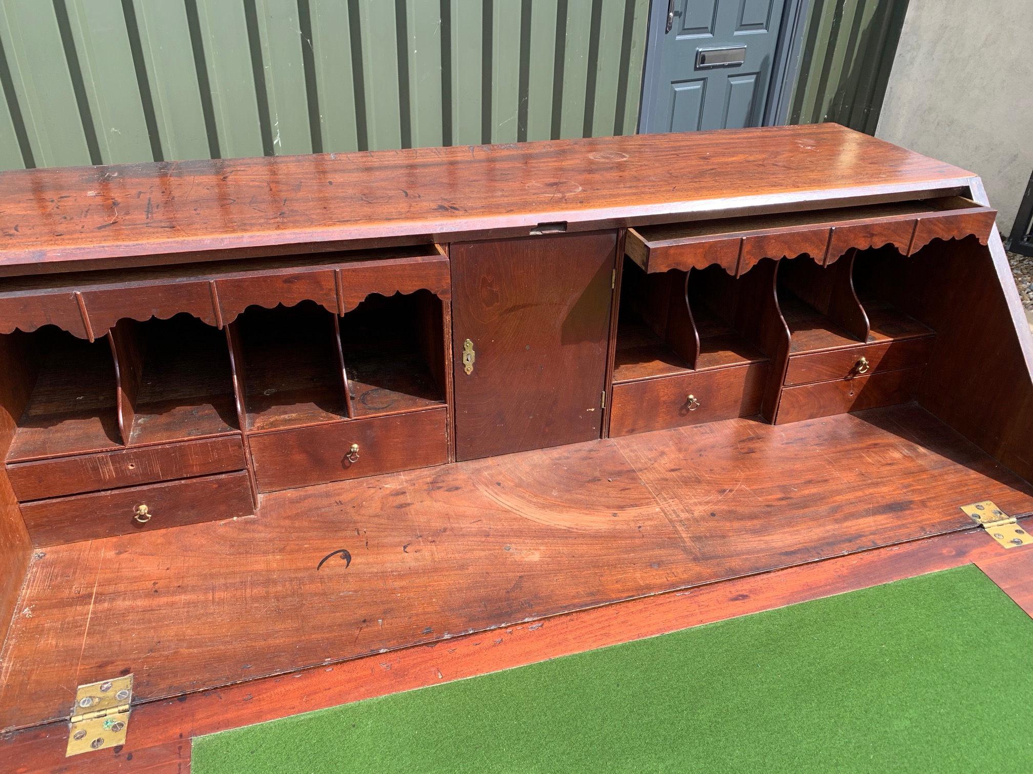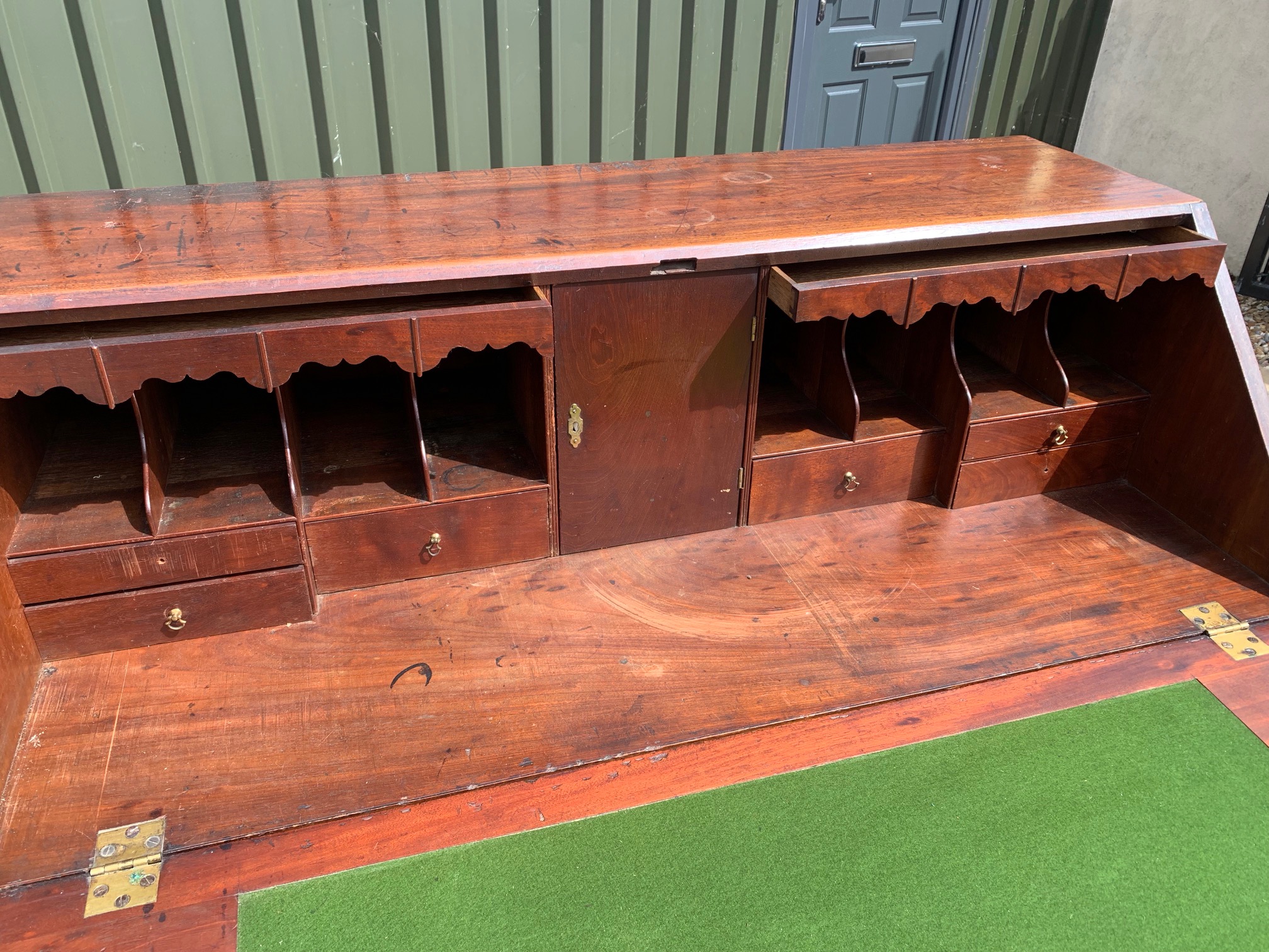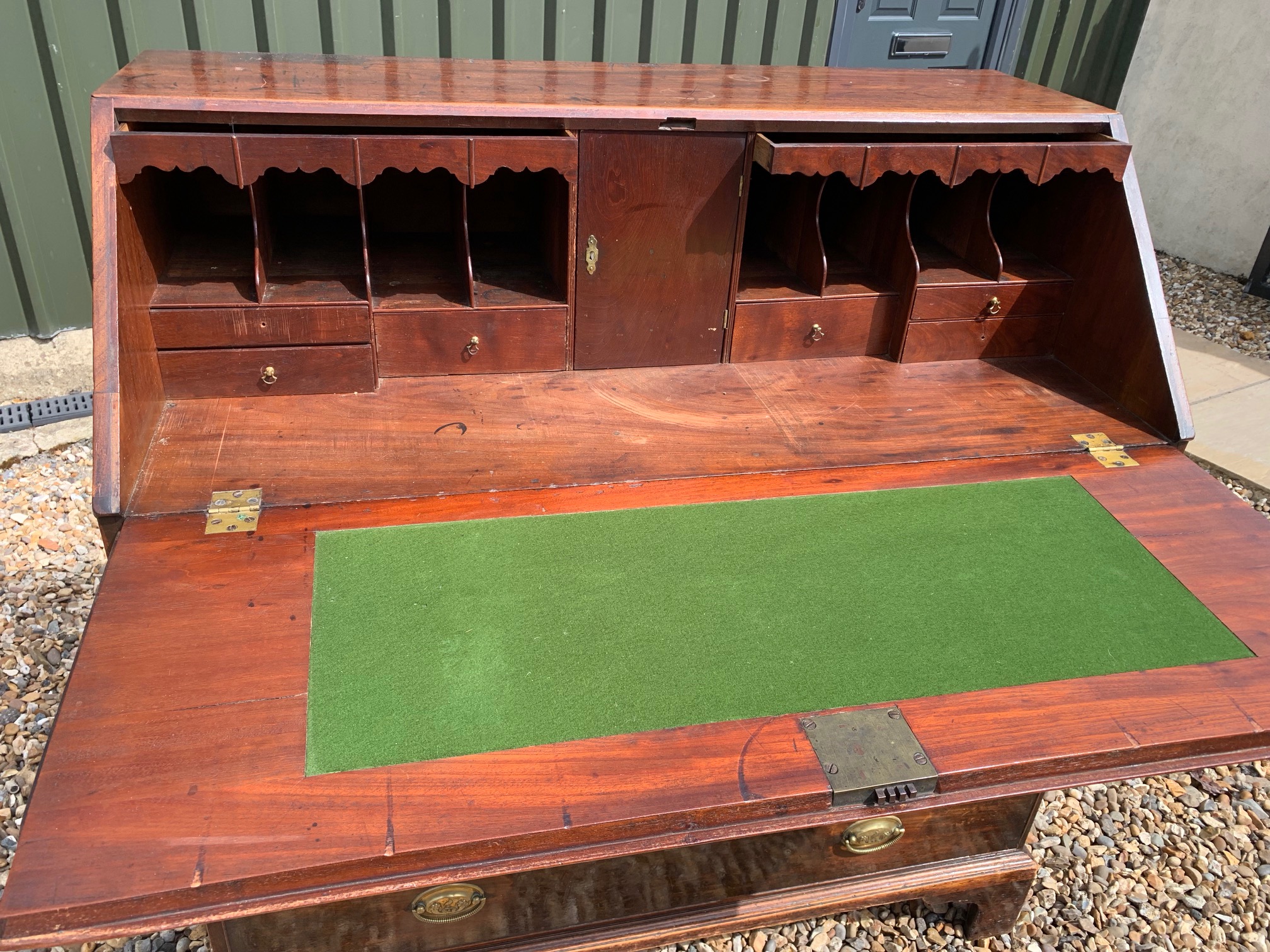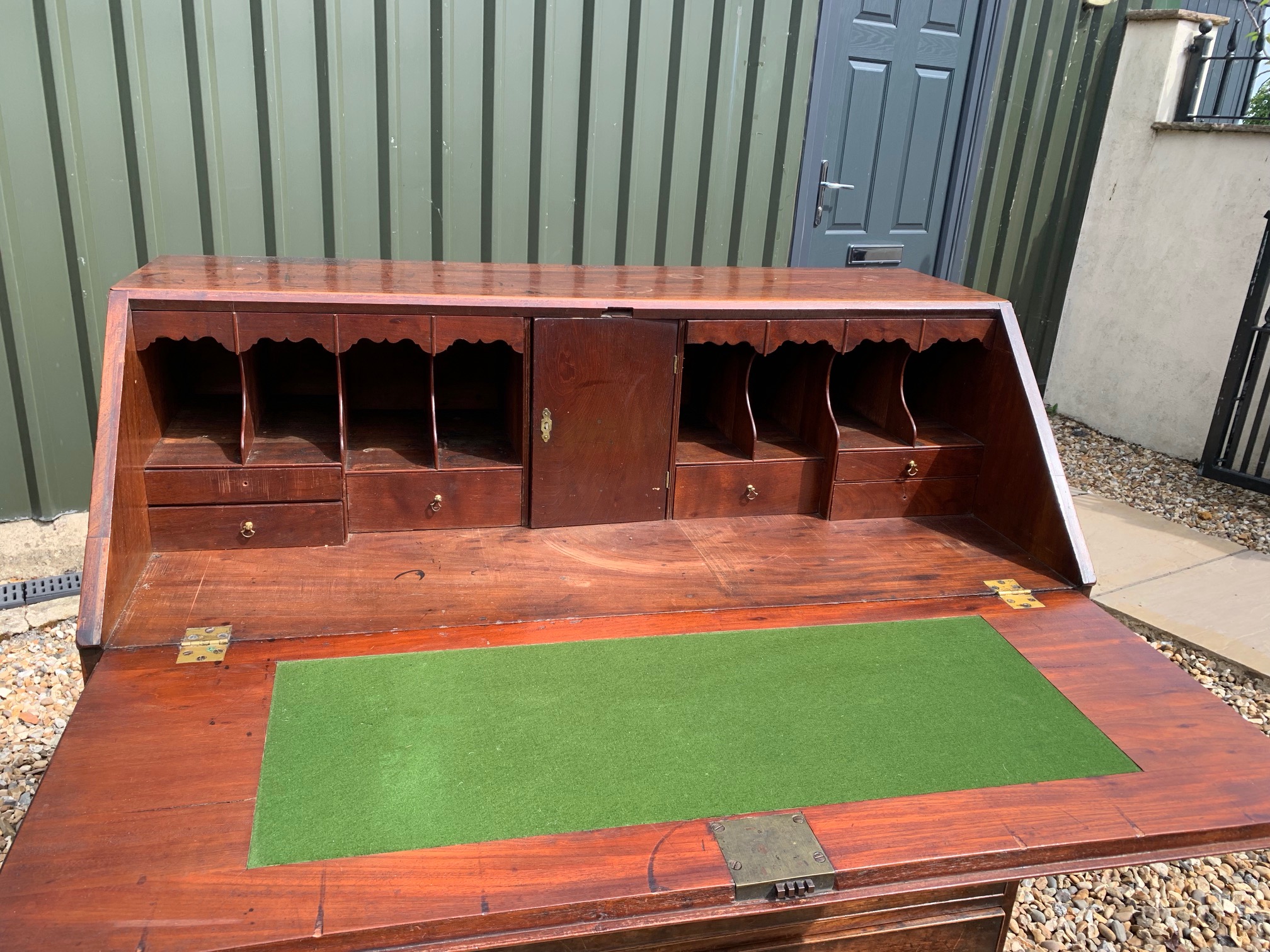 A George III Period mahogany bureau. Constructed throughout in beautifully figured Cuban mahogany and having a sloping front which opens to reveal a fitted interior with a baize lined writing surface retaining the original oval brass handles, having solid mahogany sides and raised on the original shaped bracket feet. English circa 1780-1800 in good original condition